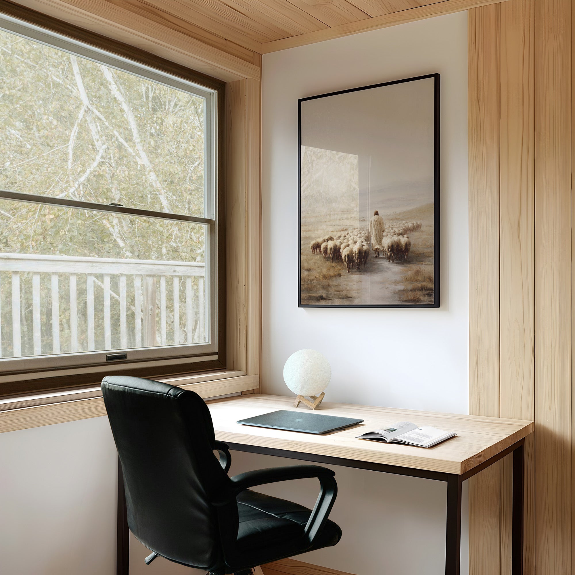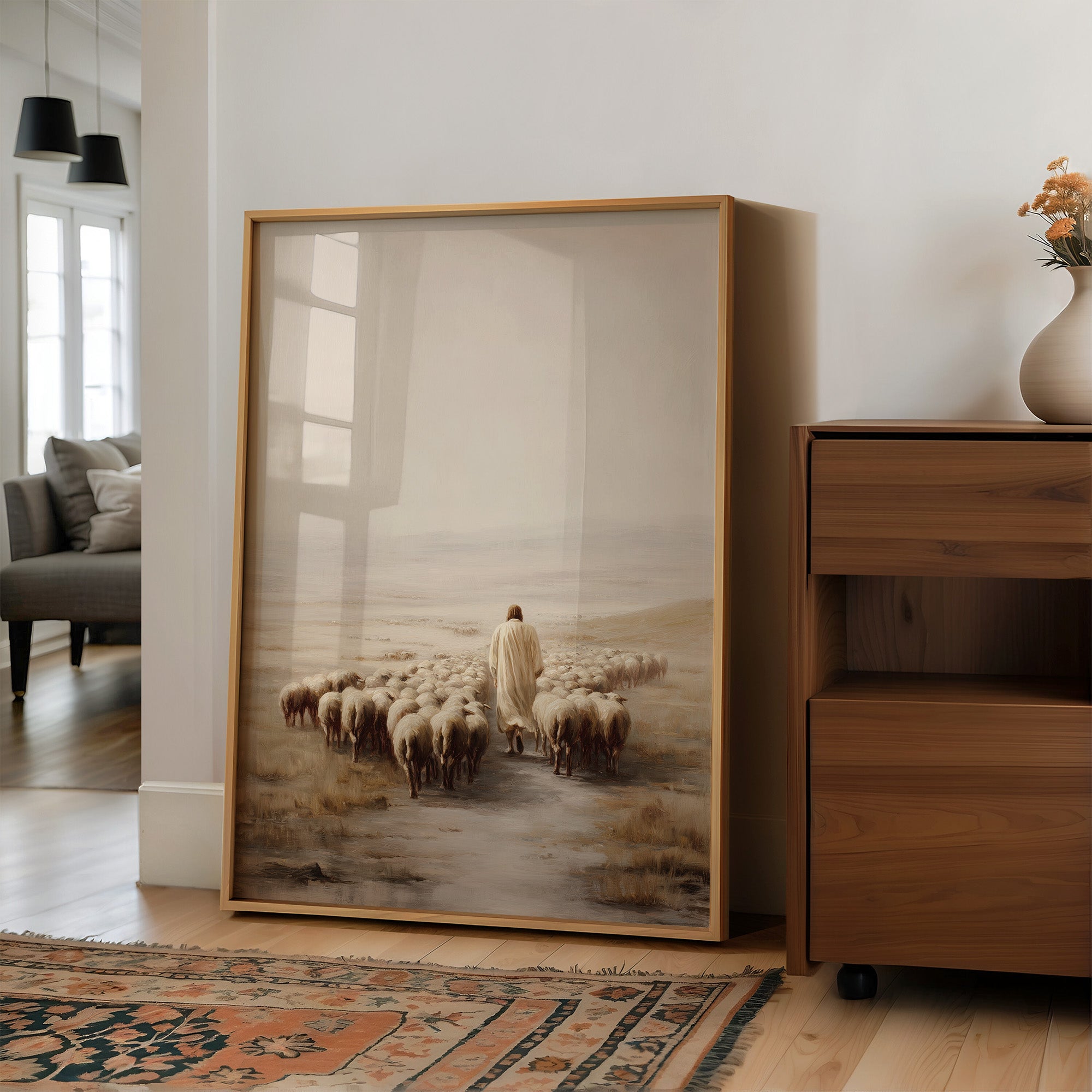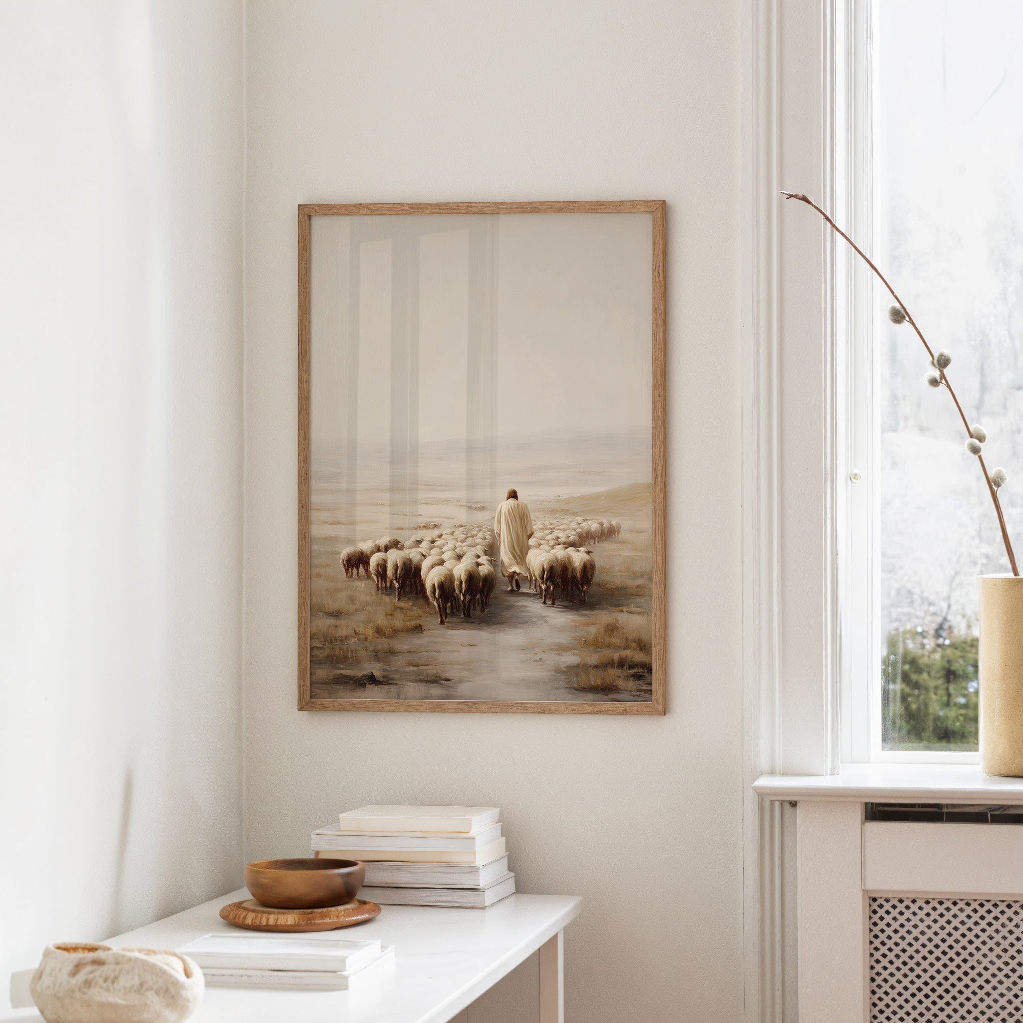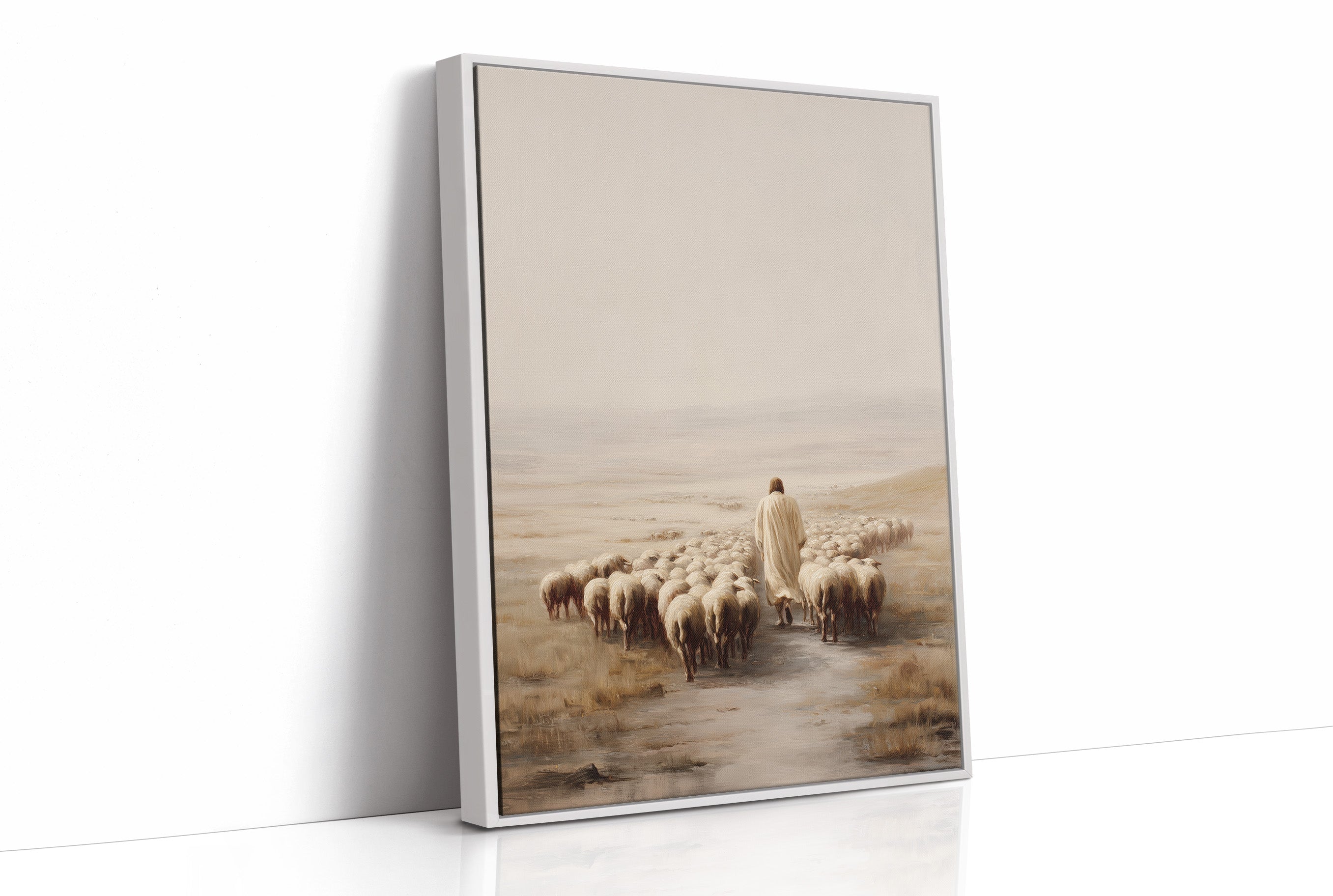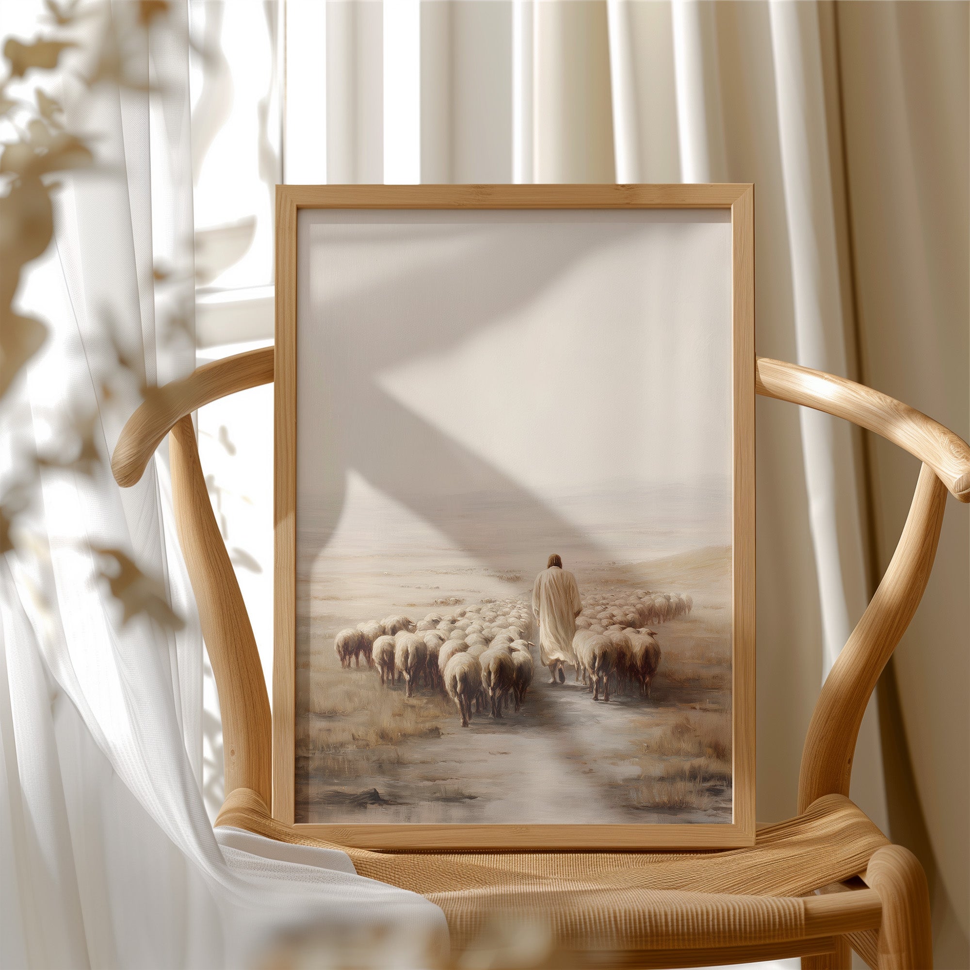 A moment suspended in time, where mist meets earth in a palette of gentle neutrals. The shepherd guides their flock across an ethereal landscape, footprints dissolving into the hazy distance as wool-laden silhouettes follow faithfully. The painting's soft brushwork creates a dreamlike quality, evoking nostalgia for simpler times and the ancient relationship between humans and the land they tend. This contemplative piece brings pastoral serenity to a reading nook, home office, or any space where you seek calm reflection.
