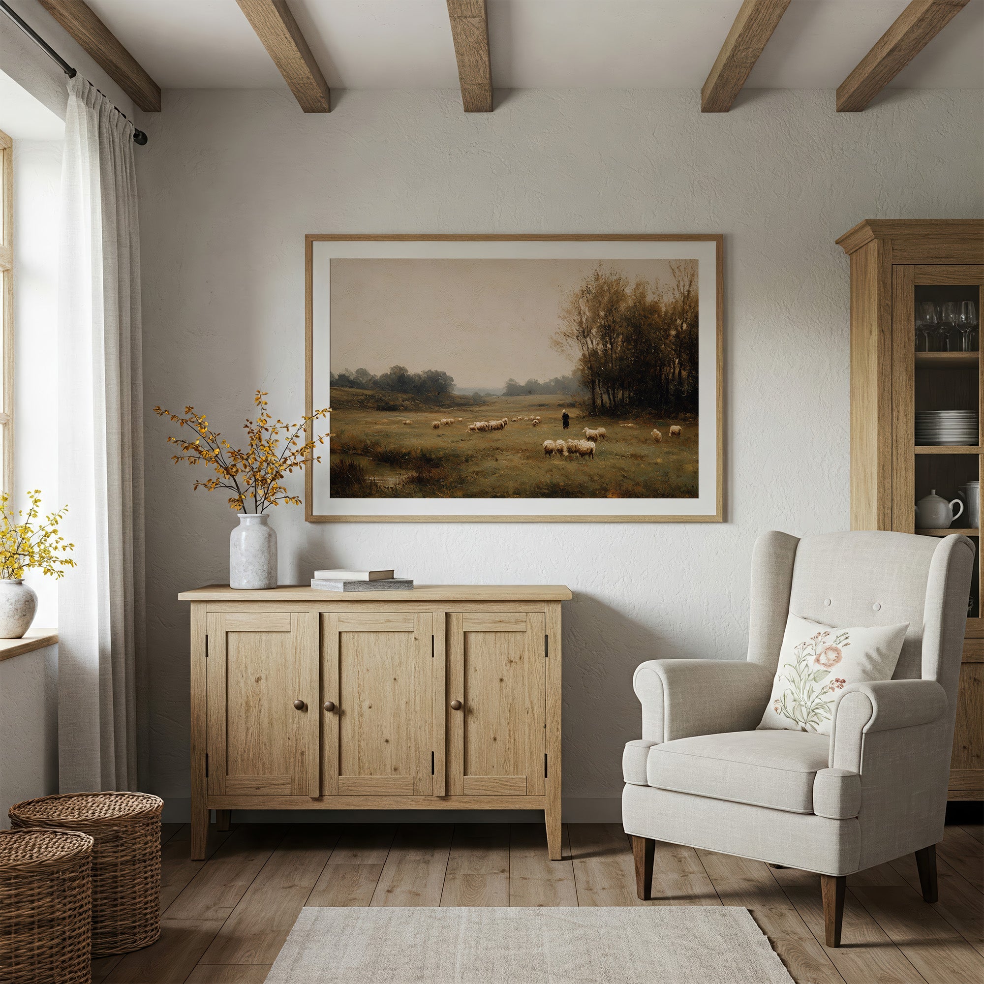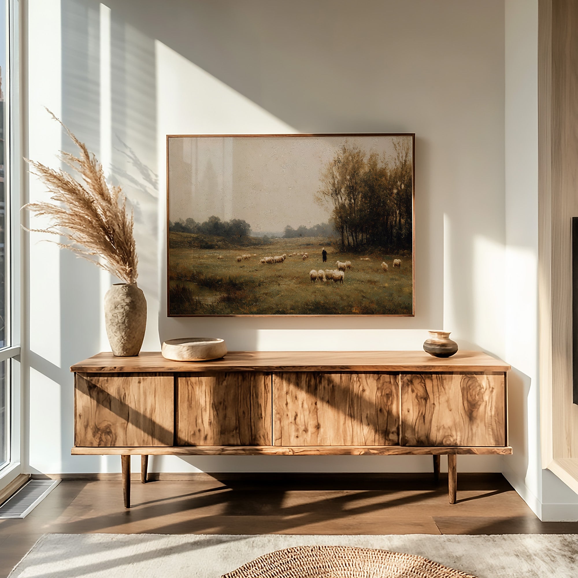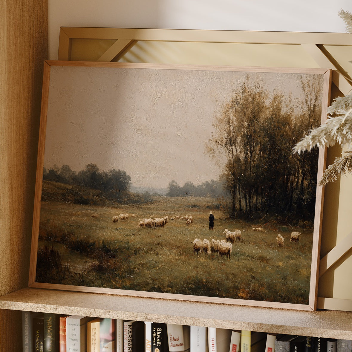 Soft morning light washes over a pastoral painting nestled among rows of beloved books. The muted tones of the landscape artworkdepicting a solitary shepherd with grazing sheep against autumn treescreate a moment of countryside serenity amid literary companions. Dried pampas grass in an earthenware vessel echoes the painting's natural palette, bridging art and life in this thoughtfully curated corner. This contemplative vignette would bring timeless charm to a home office, reading nook, or any space where stories both written and visual converge.