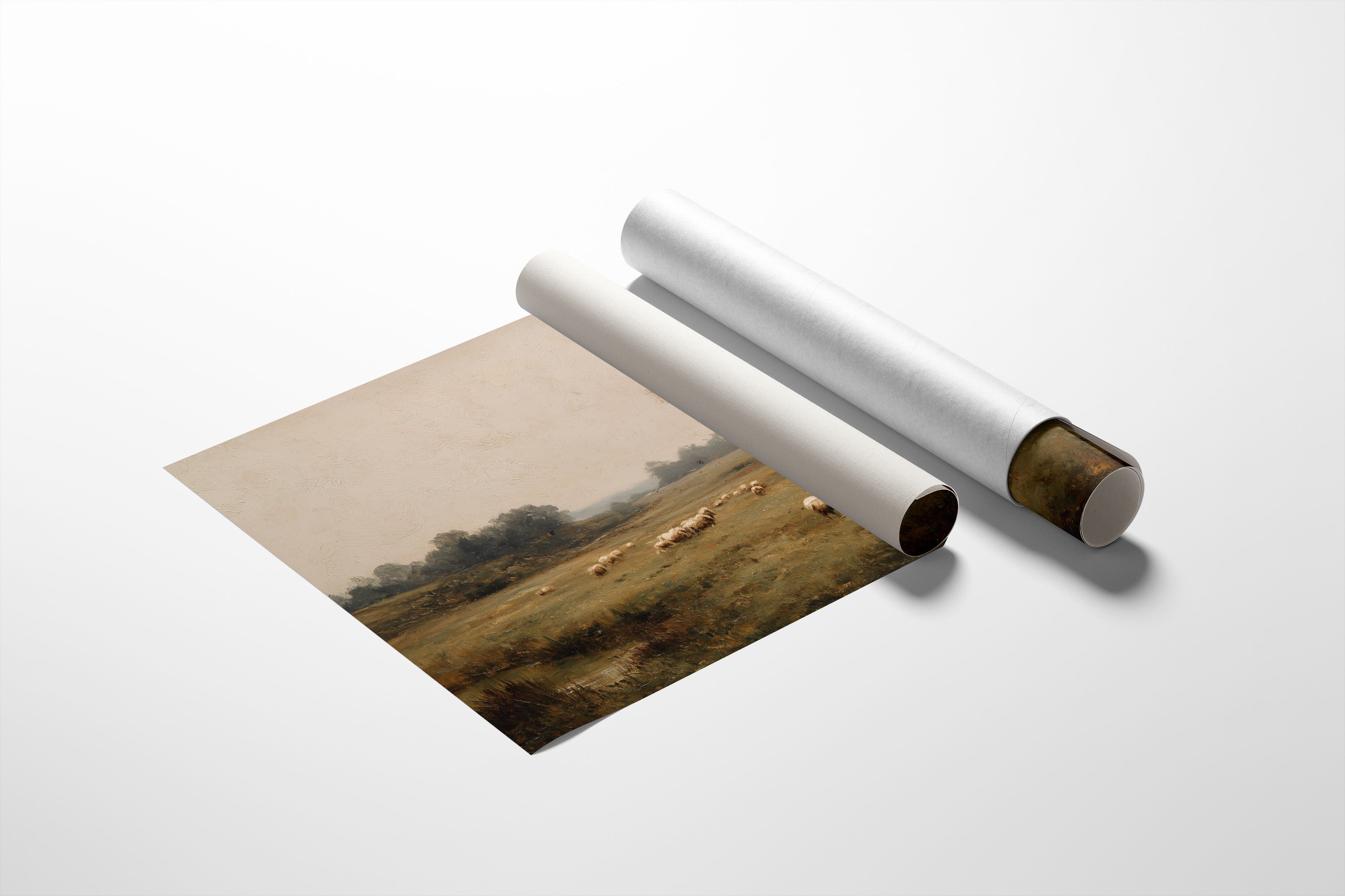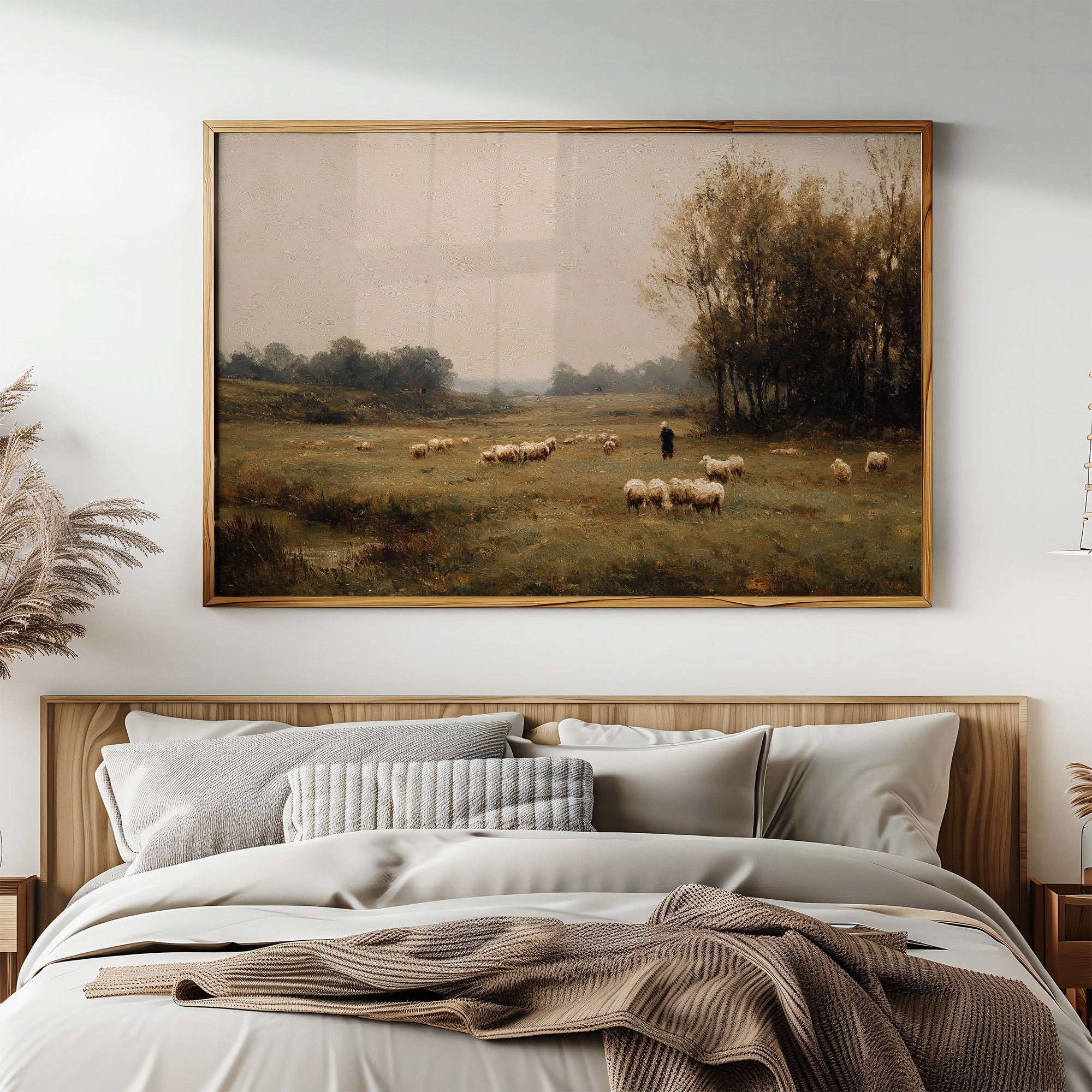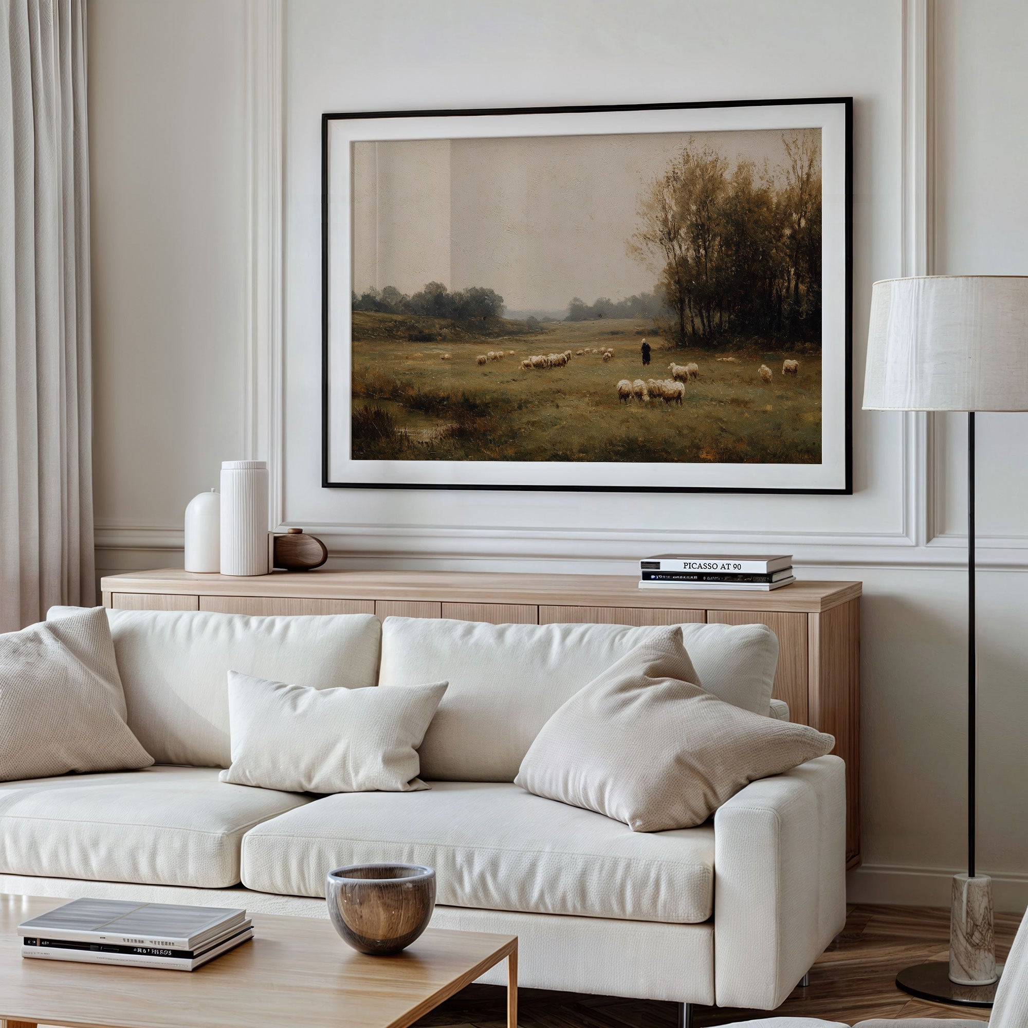 Soft morning light washes over a pastoral painting nestled among rows of beloved books. The muted tones of the landscape artworkdepicting a solitary shepherd with grazing sheep against autumn treescreate a moment of countryside serenity amid literary companions. Dried pampas grass in an earthenware vessel echoes the painting's natural palette, bridging art and life in this thoughtfully curated corner. This contemplative vignette would bring timeless charm to a home office, reading nook, or any space where stories both written and visual converge.
