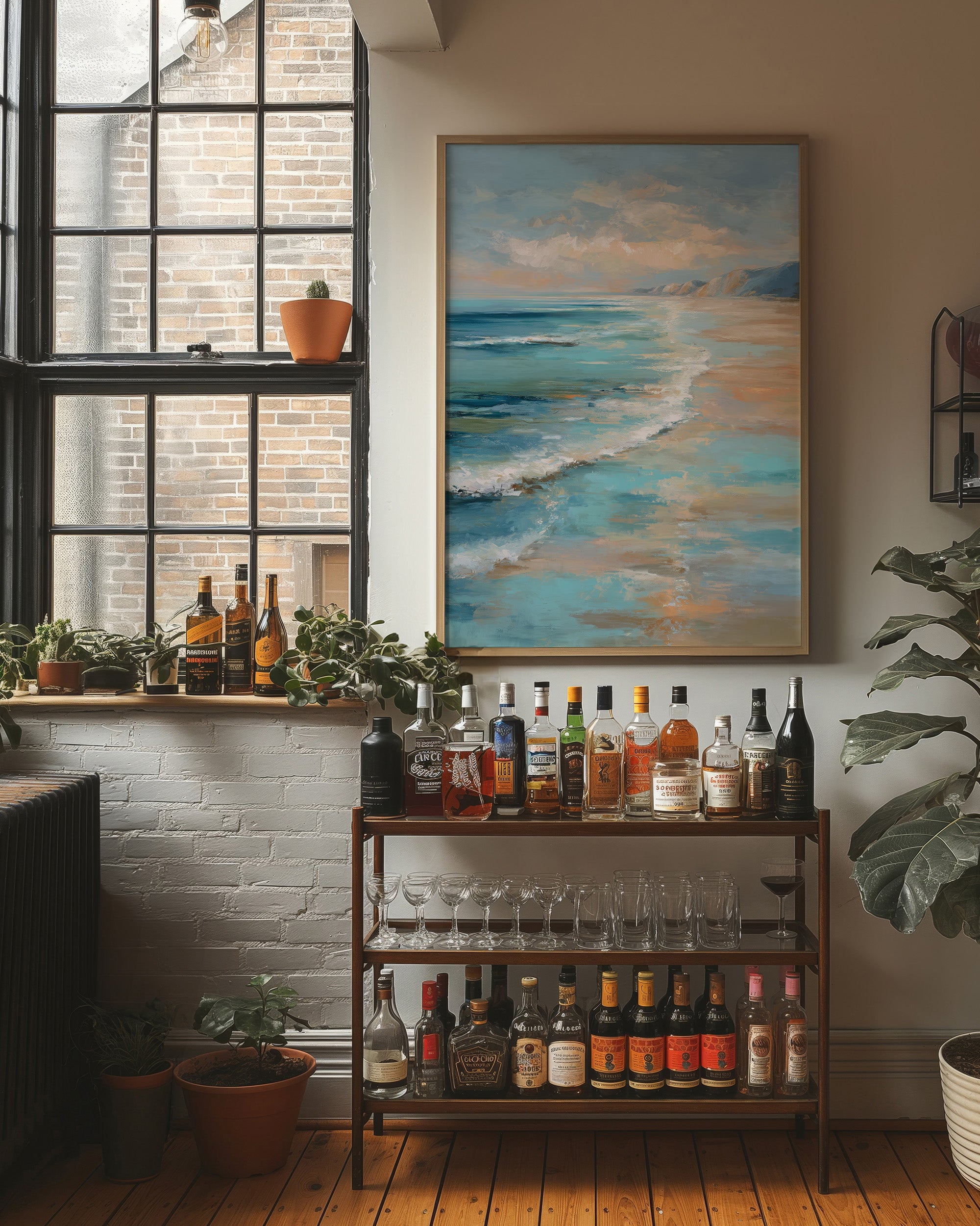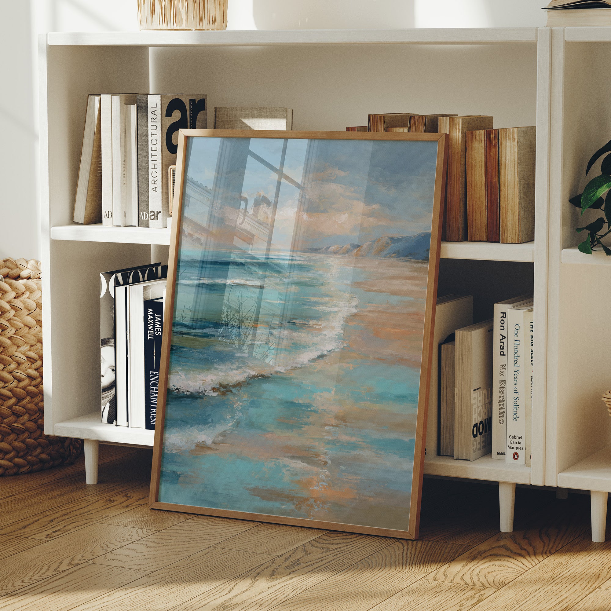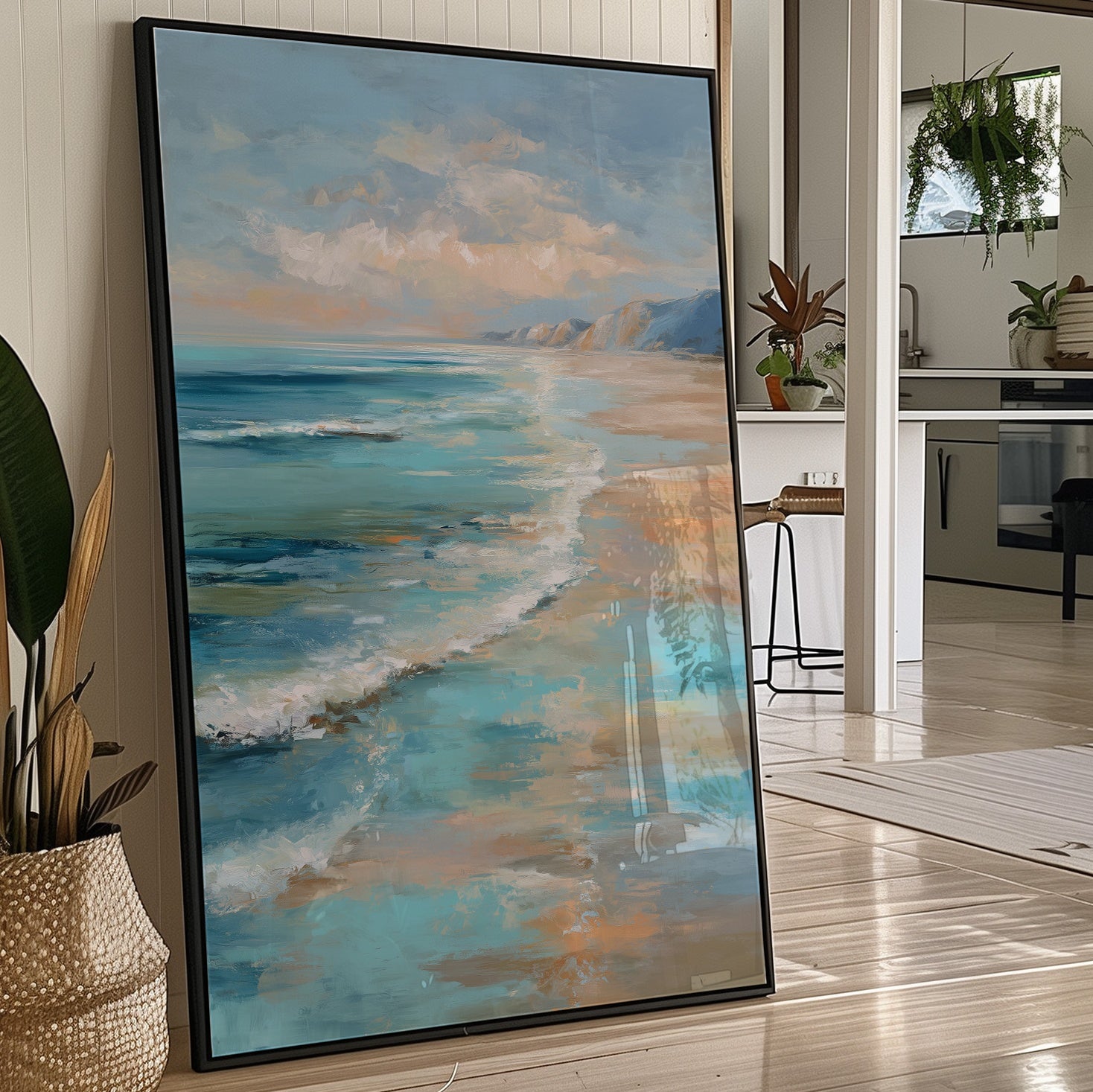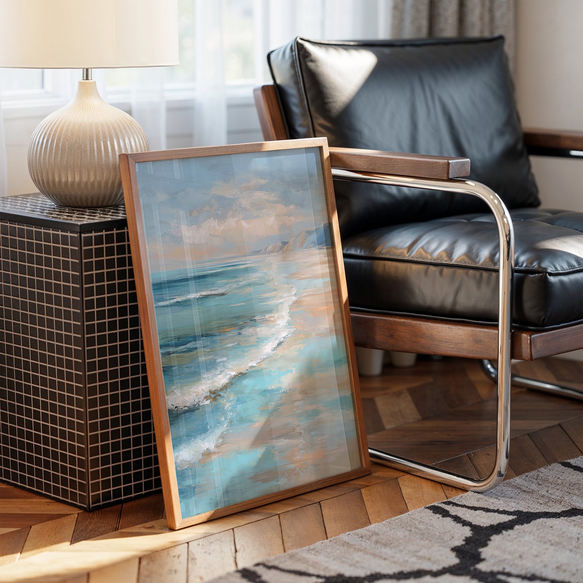 Sunlight spills across the hardwood floor, illuminating a coastal painting that leans patiently against a modern living space. The artwork captures the gentle rhythm of turquoise waves meeting sandy shores, its soft palette of blues and tans creating a portal to distant beaches. The warm wooden frame complements the sophisticated leather armchair and ribbed ceramic lamp, creating a thoughtful contrast of textures and materials. This serene piece would transform a reading nook or office space into a contemplative retreat, offering a daily escape to shoreline tranquility amid urban surroundings.