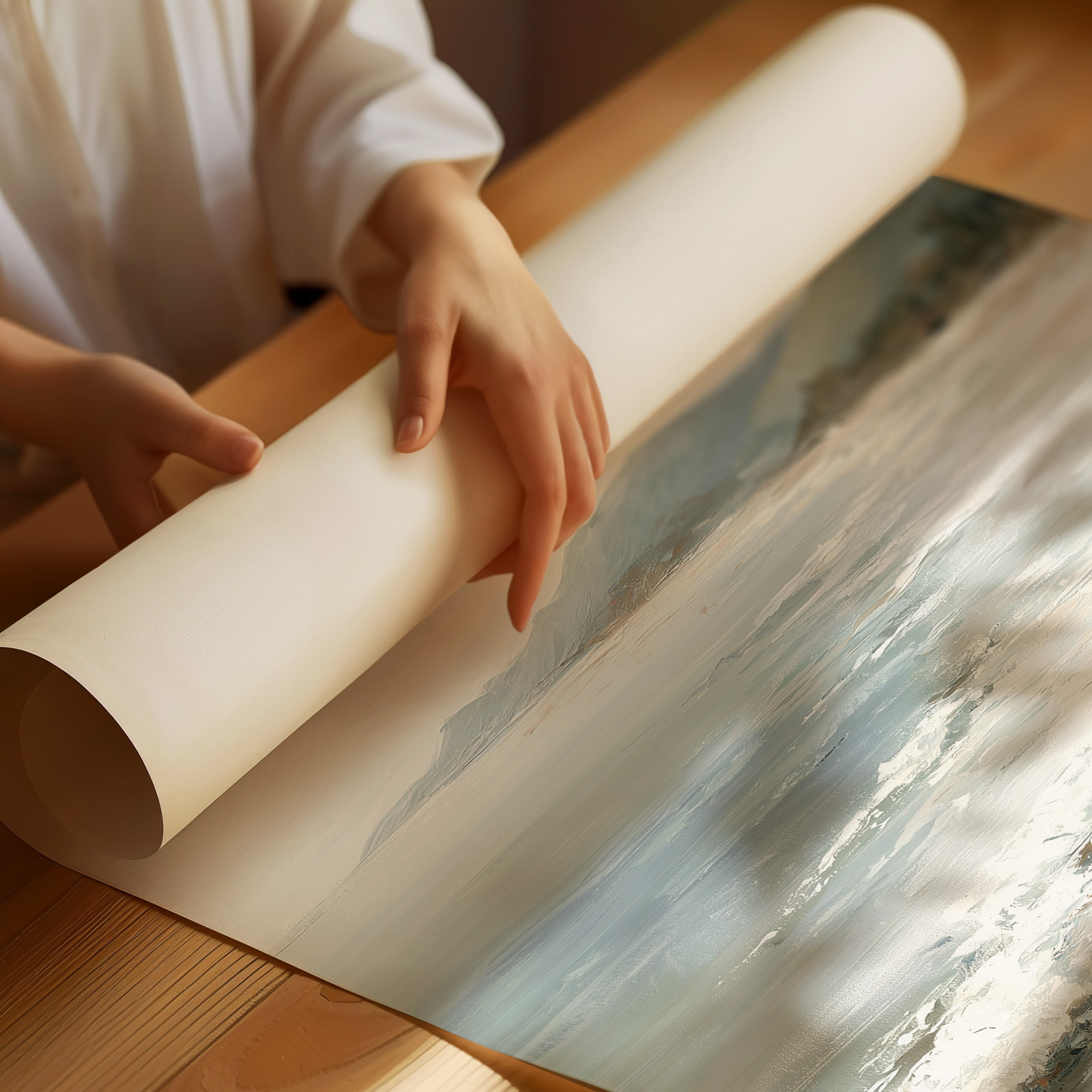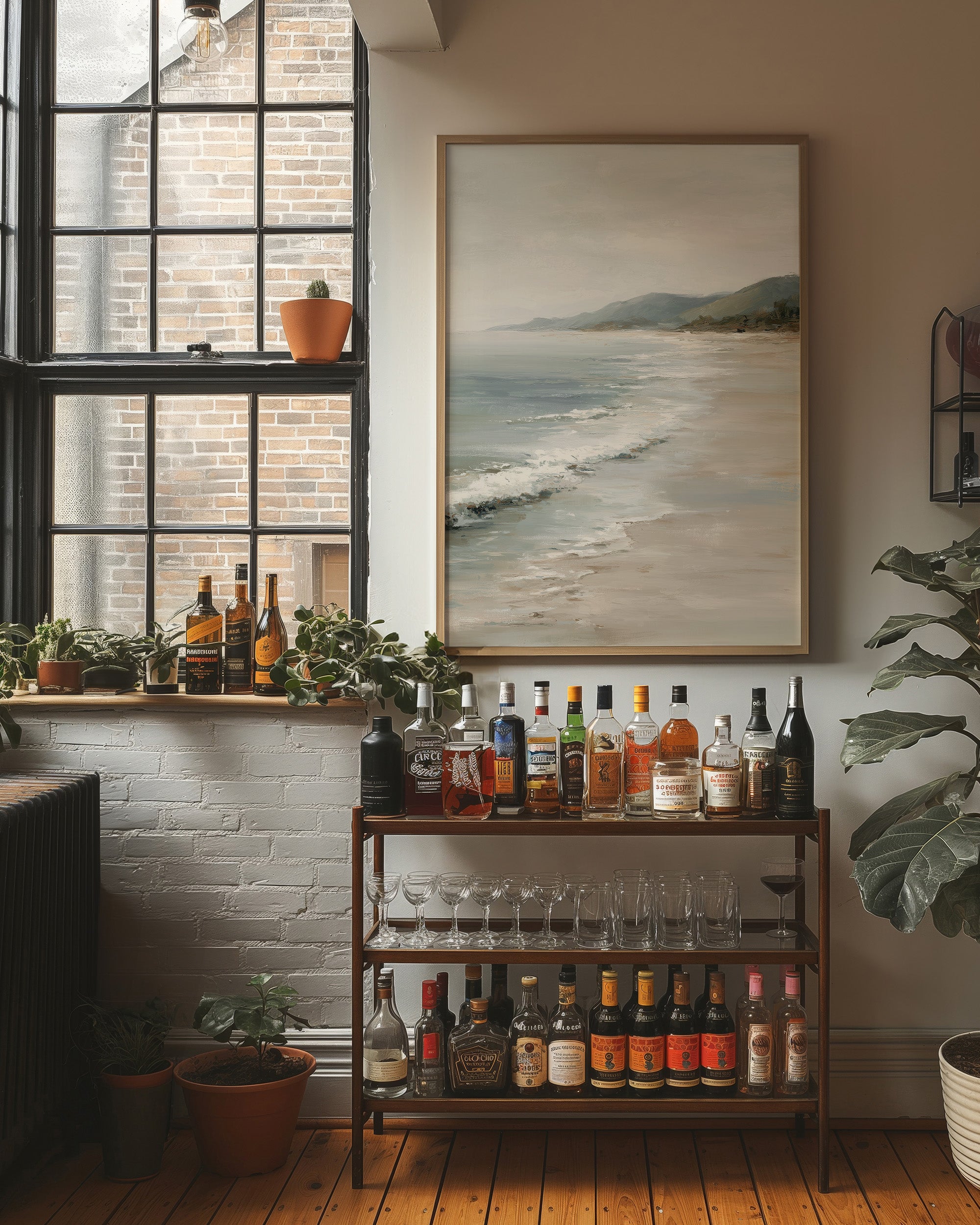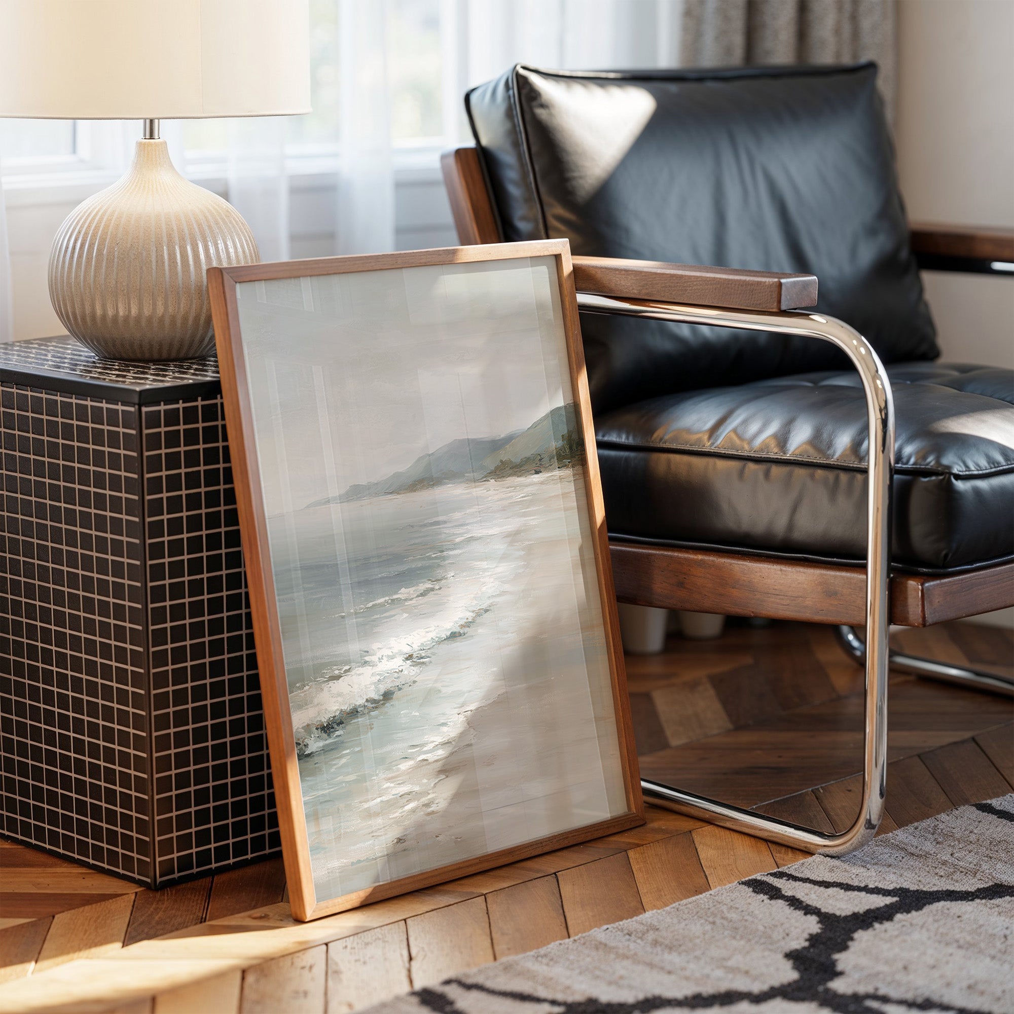 Sunlight spills across hardwood floors, illuminating a coastal painting that leans patiently against a leather chair, not yet hung but already telling its story. The muted tones of sand and sea create a peaceful dialogue with the modern furnishingssleek black leather against warm wood and the organic curves of a ribbed ceramic lamp. This contemplative seascape would bring serene sophistication to a home office or reading nook, where its subtle palette can inspire moments of calm reflection.