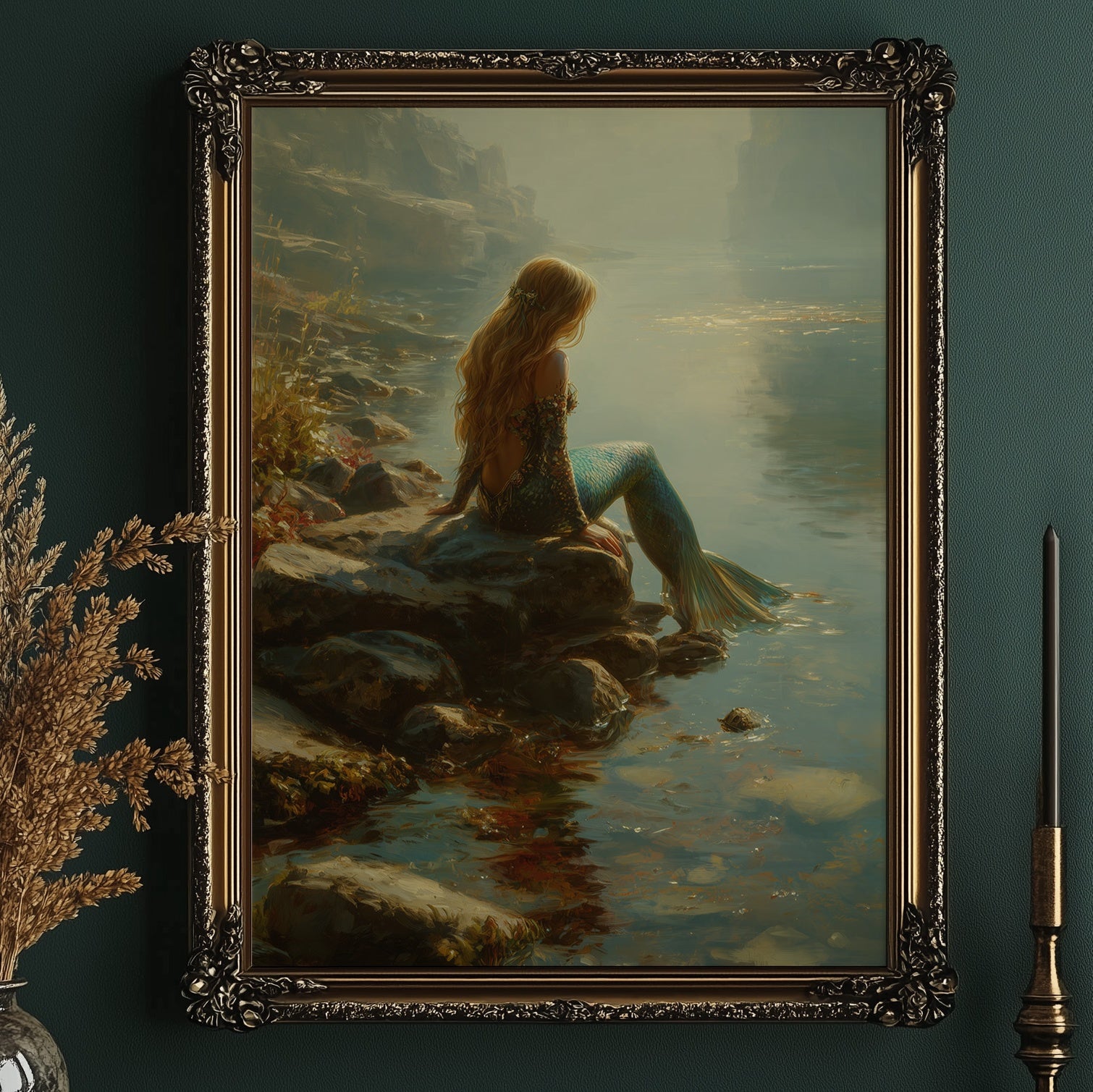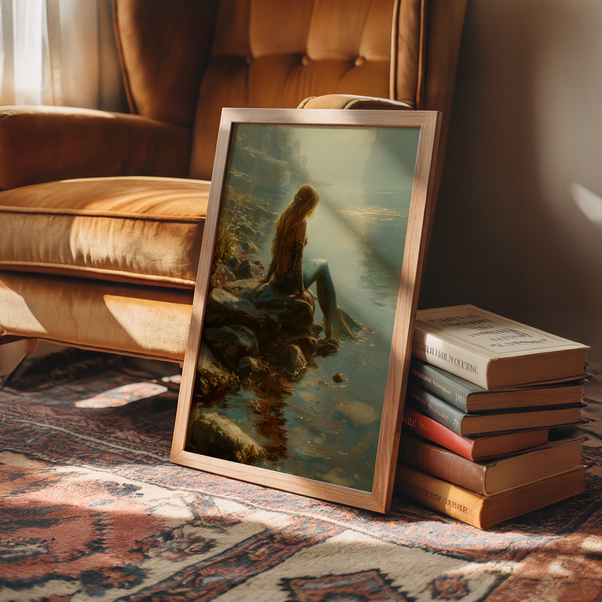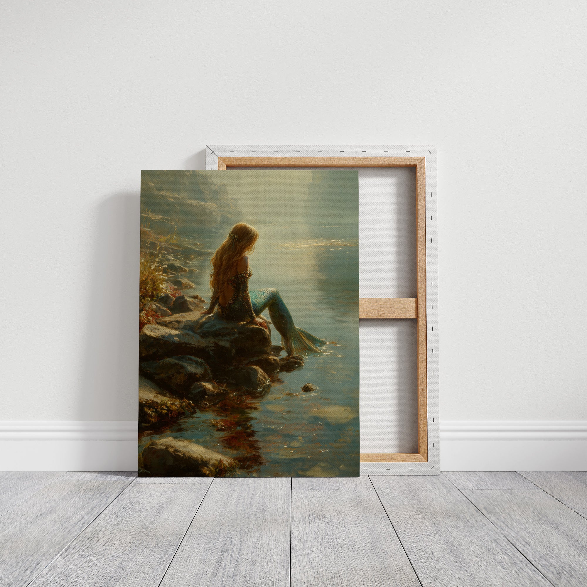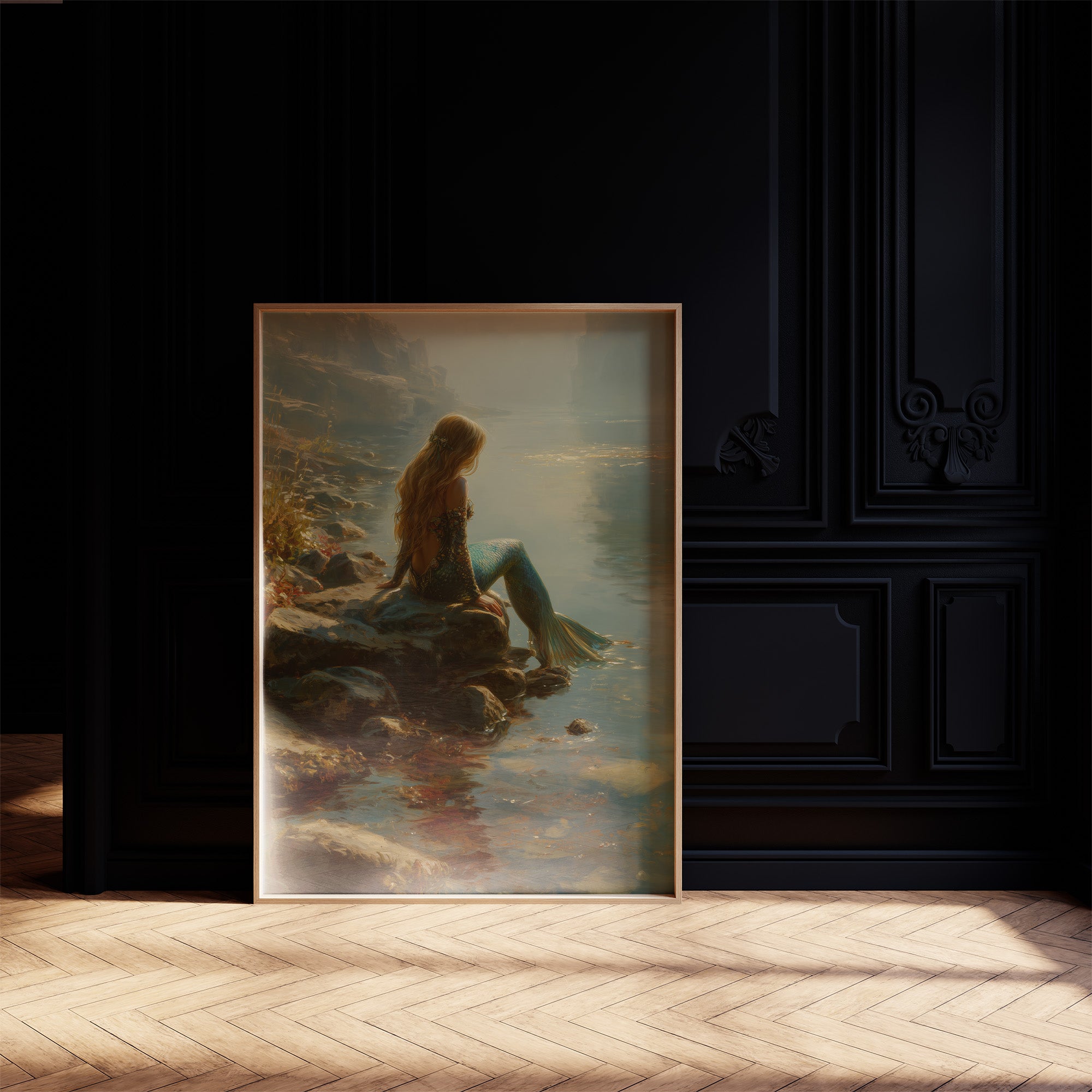 Sunlight dances across the water's edge, illuminating a moment of solitary contemplation. A mermaid with flowing golden hair rests upon rocky shores, her iridescent tail catching the last warm rays of day. The painting captures that liminal space between fantasy and reality, where the ocean meets land in a symphony of amber and turquoise hues.