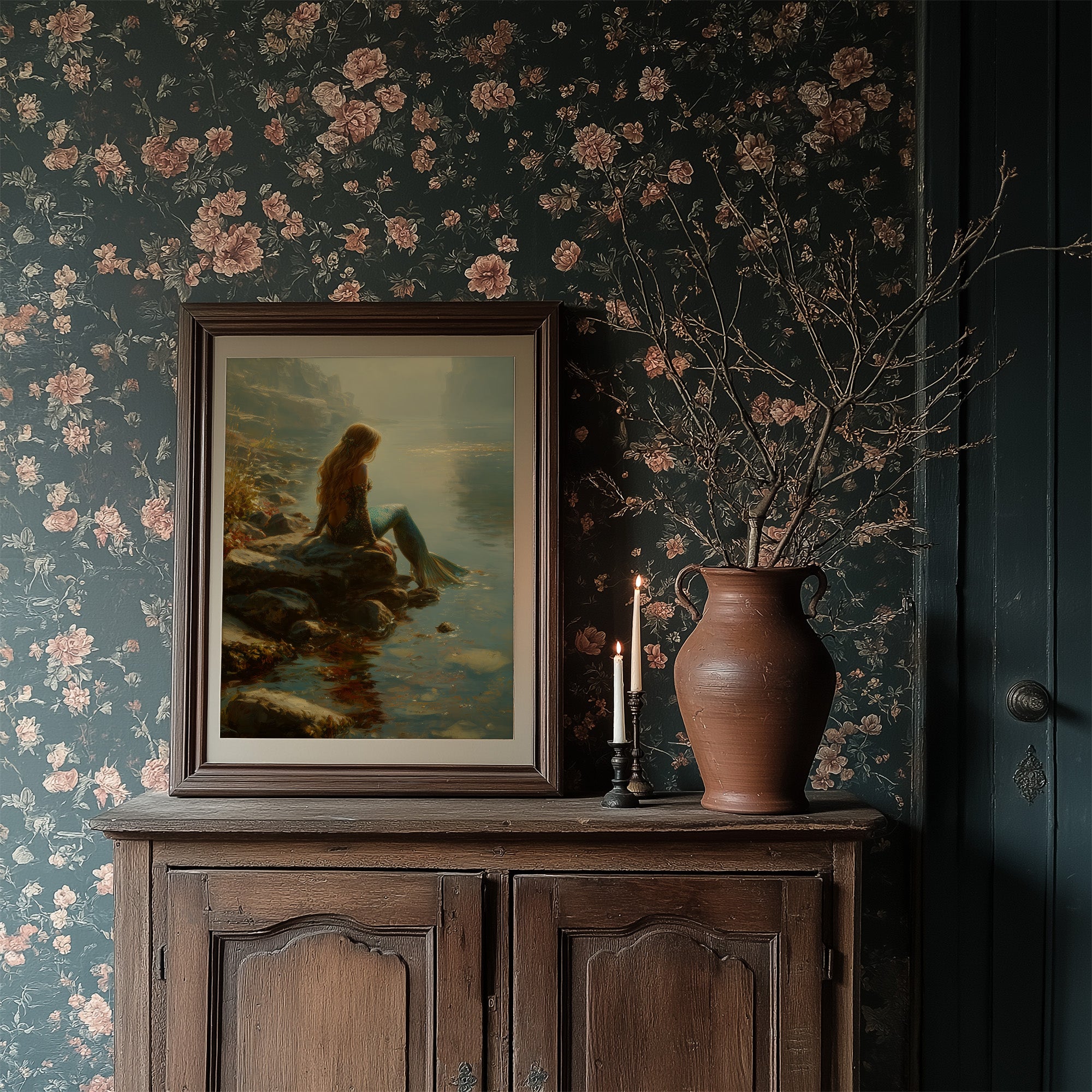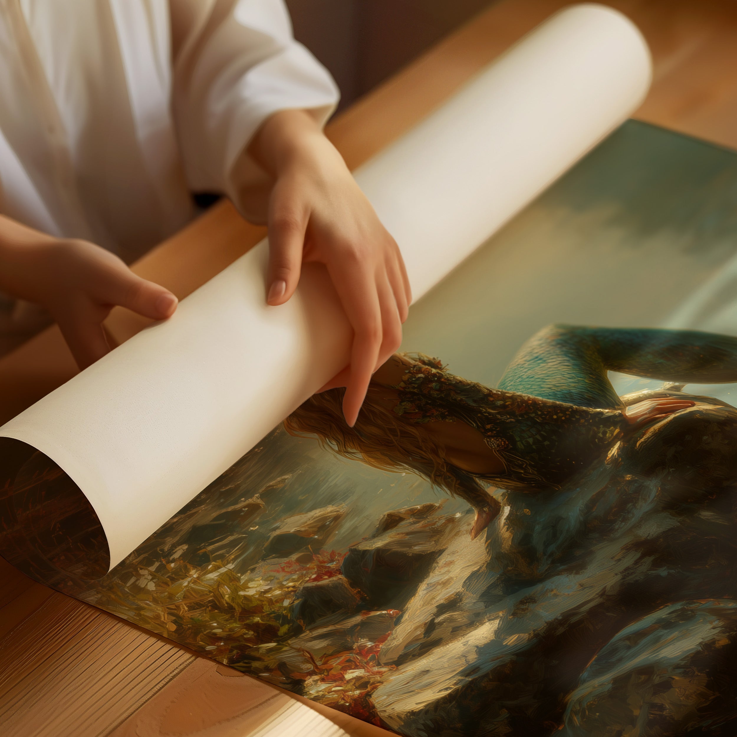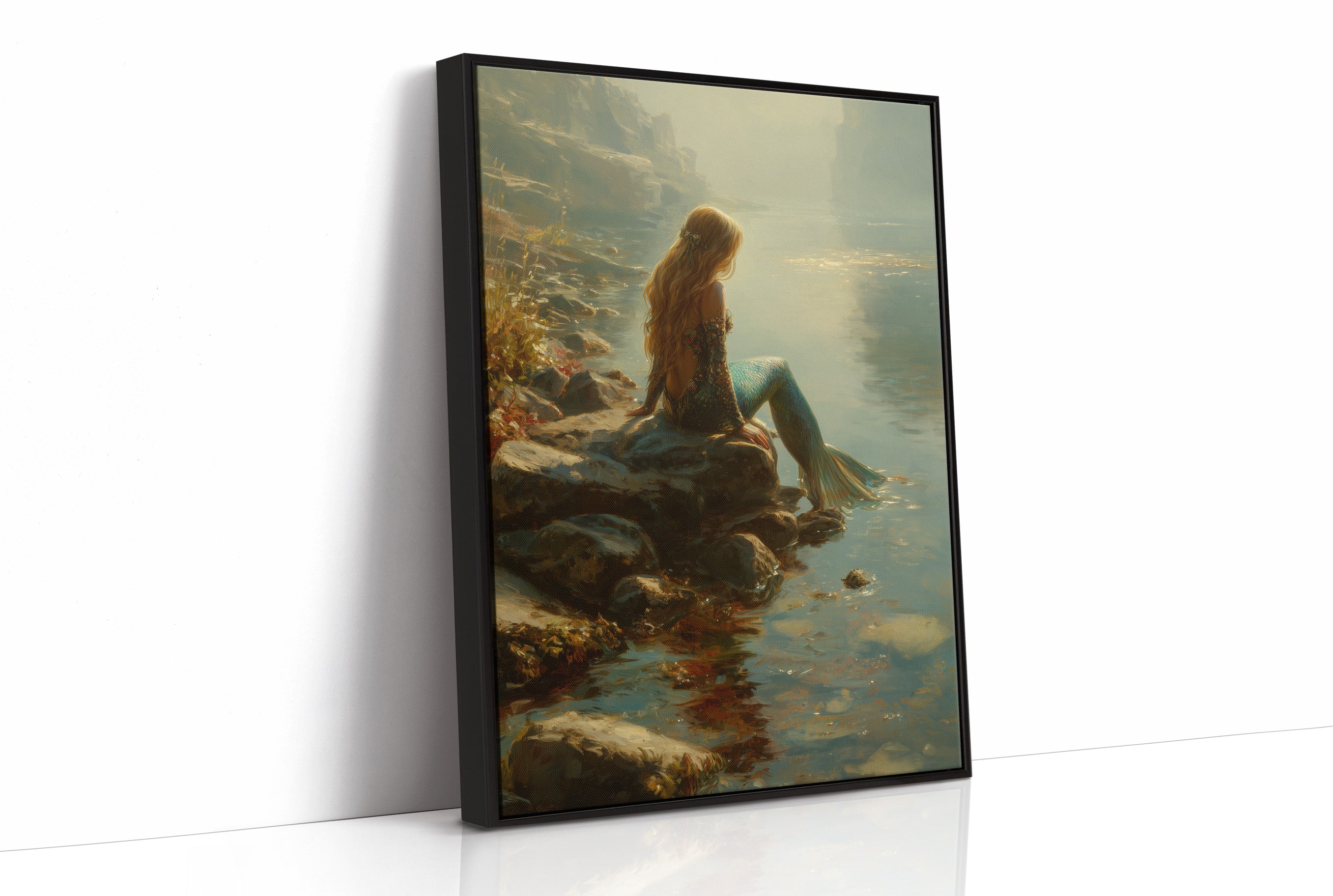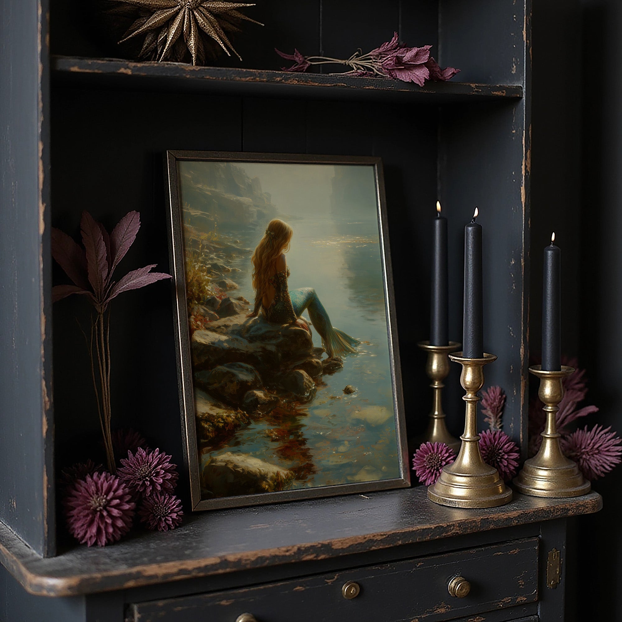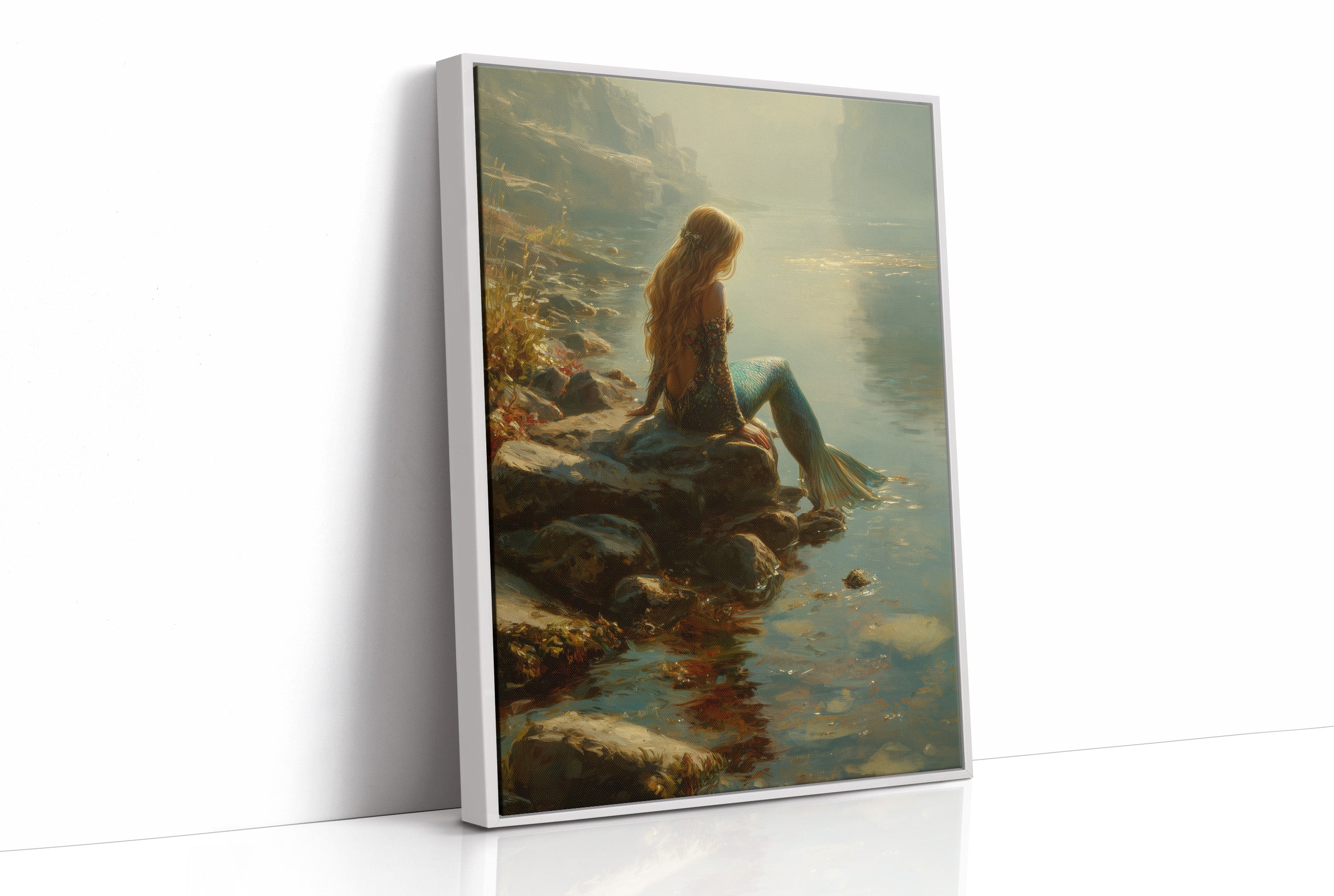 Sunlight dances across the water's edge, illuminating a moment of solitary contemplation. A mermaid with flowing golden hair rests upon rocky shores, her iridescent tail catching the last warm rays of day. The painting captures that liminal space between fantasy and reality, where the ocean meets land in a symphony of amber and turquoise hues.