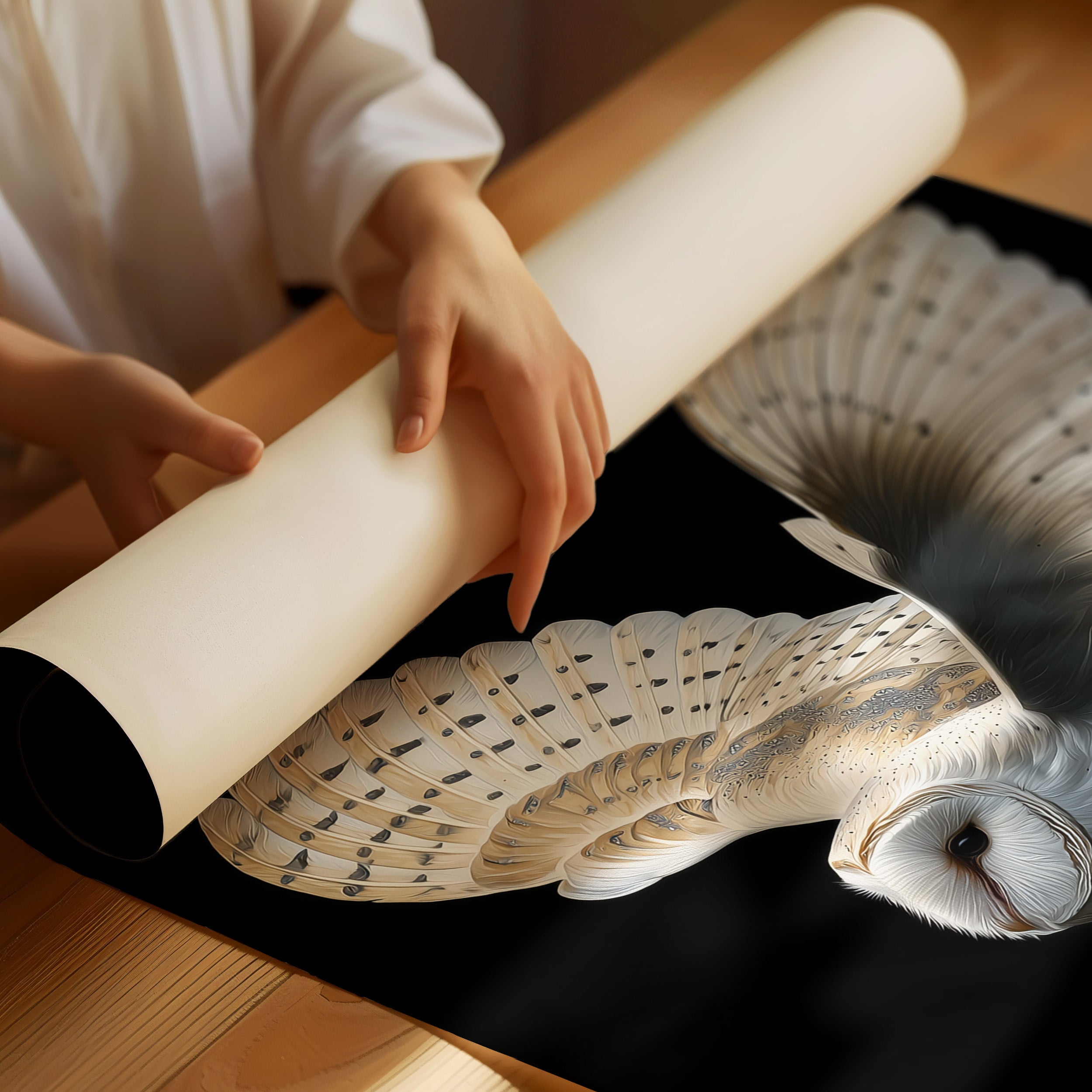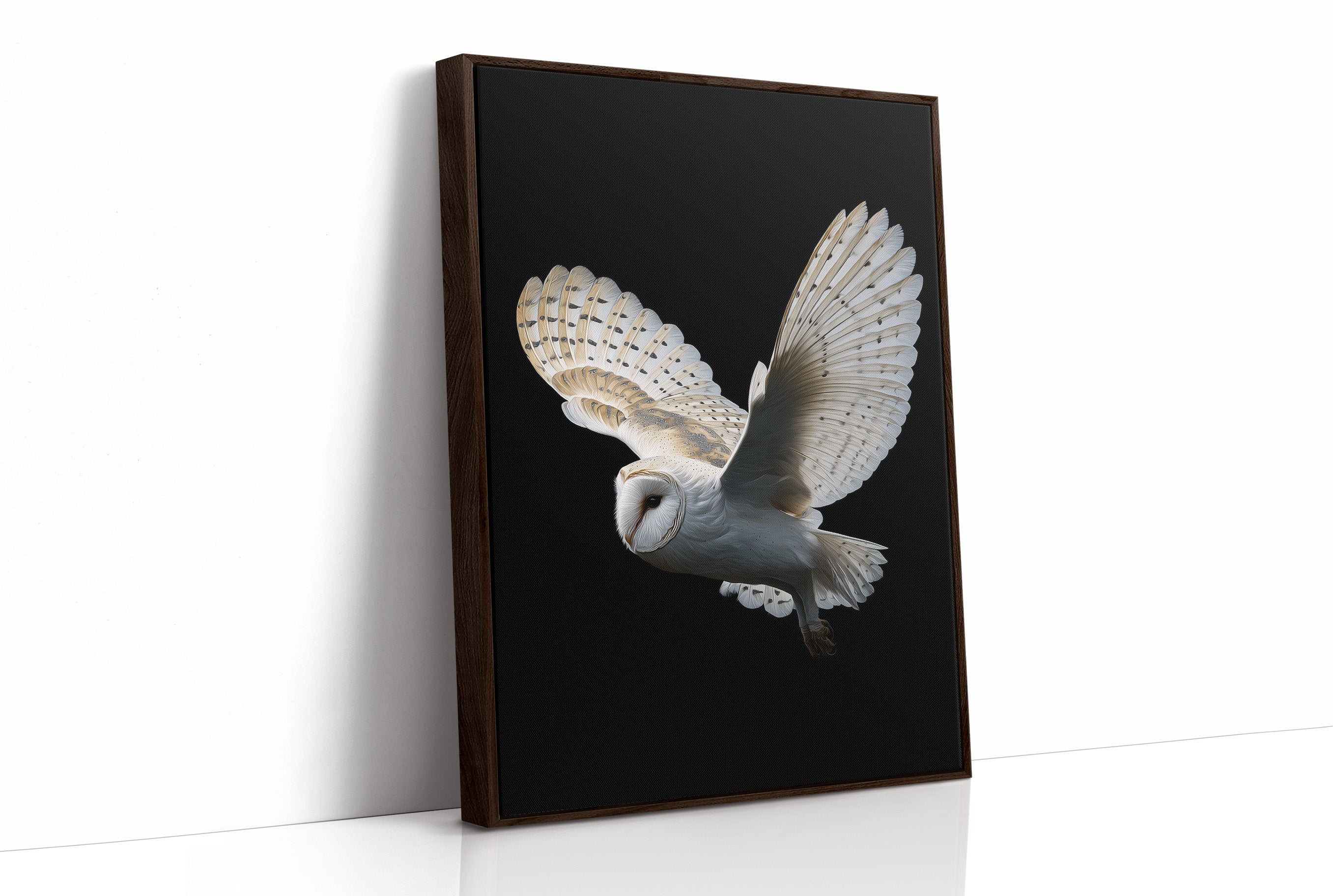 A moment suspended between worlds as a barn owl glides through the void, wings outstretched in perfect symmetry. The creature's pristine white feathers catch invisible light, revealing delicate patterns of cream and gold against the absolute black. Each detailed feather tells a story of evolutionary perfection, the spotted wing markings and heart-shaped face creating a striking contrast of ethereal beauty against the endless darkness. This dramatic portrait brings natural elegance to spaces that celebrate the mysterious beauty of nocturnal wildlife.