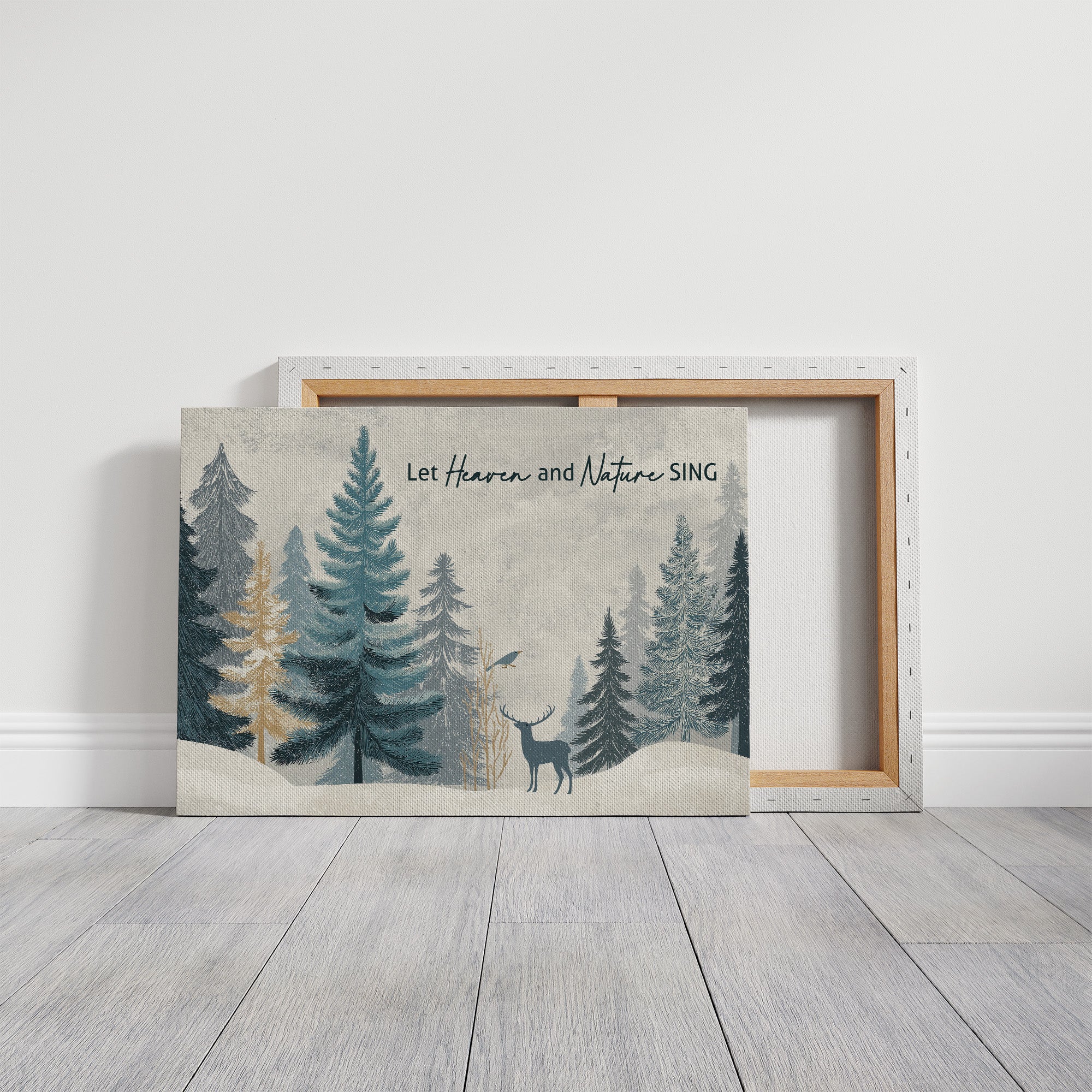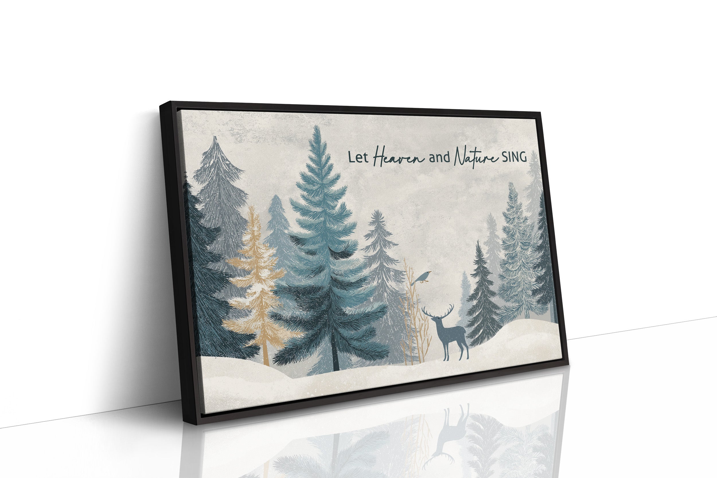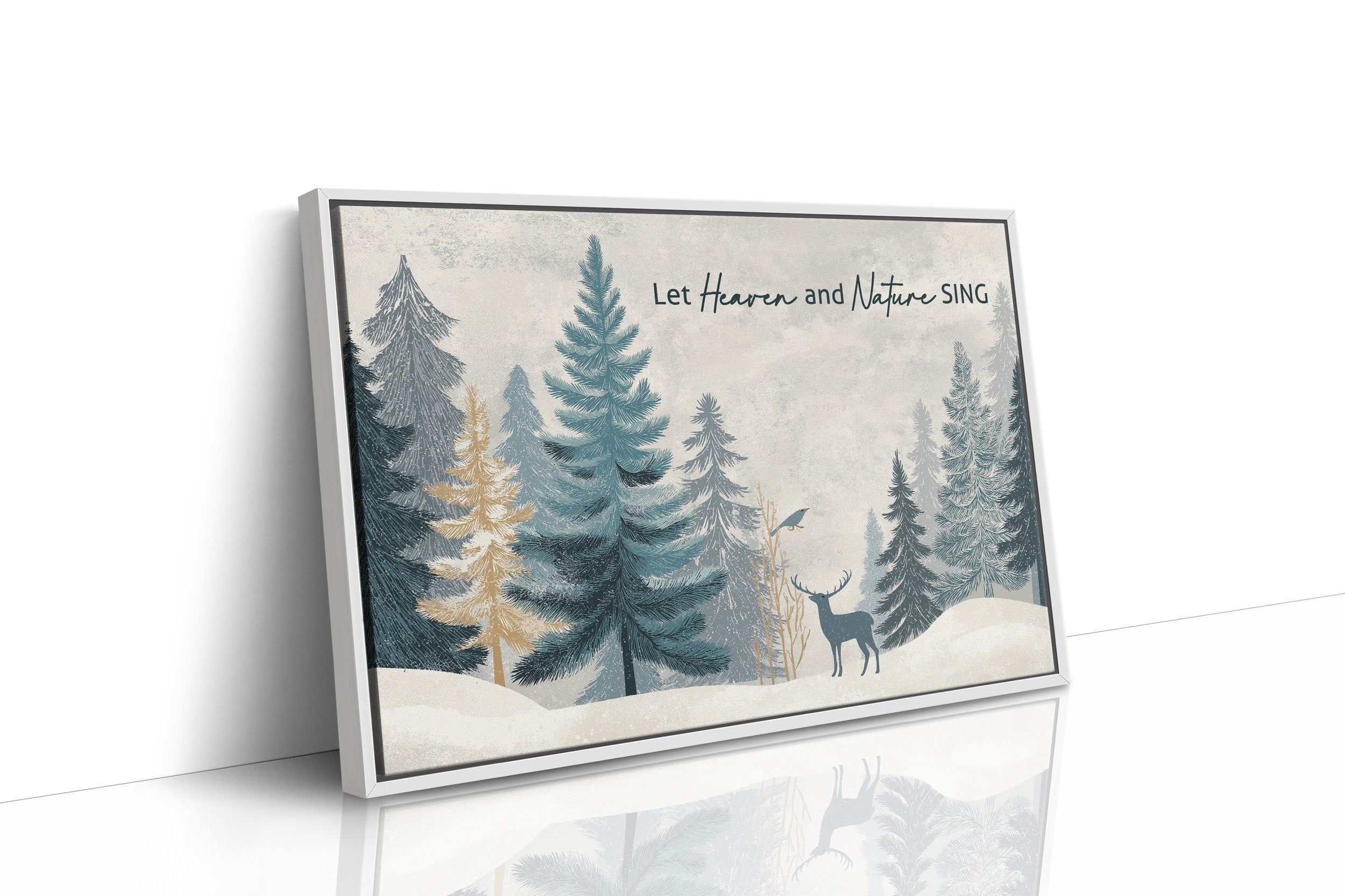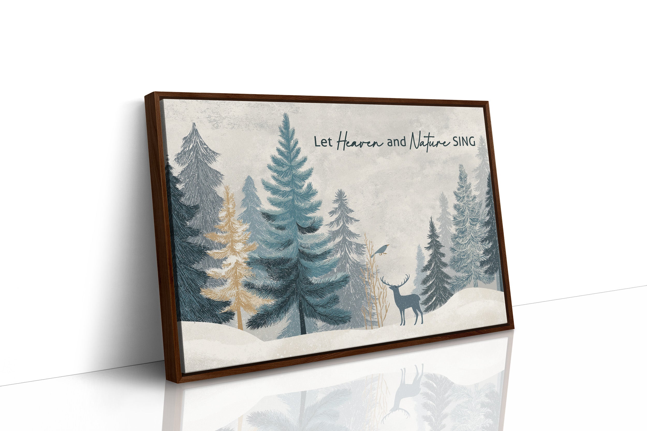 Morning light filters through evergreens where a solitary deer stands sentinel in fresh snow. Teal and golden pines rise against a misty sky, creating a peaceful woodland sanctuary where time seems suspended. The rustic wood frame complements the natural scene, bringing the tranquility of forest stillness into a cozy living space.