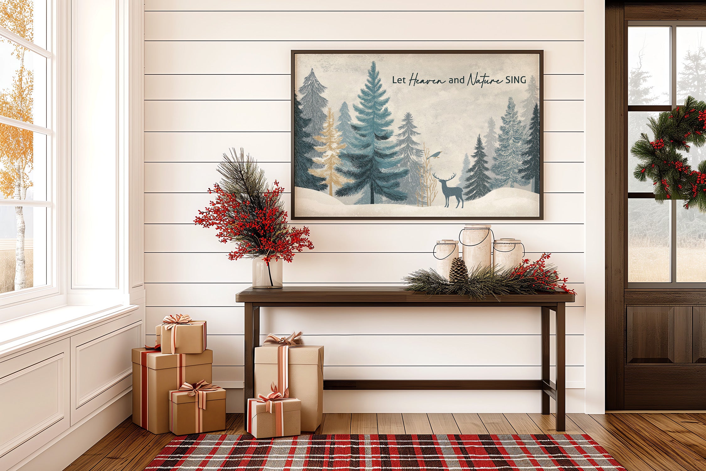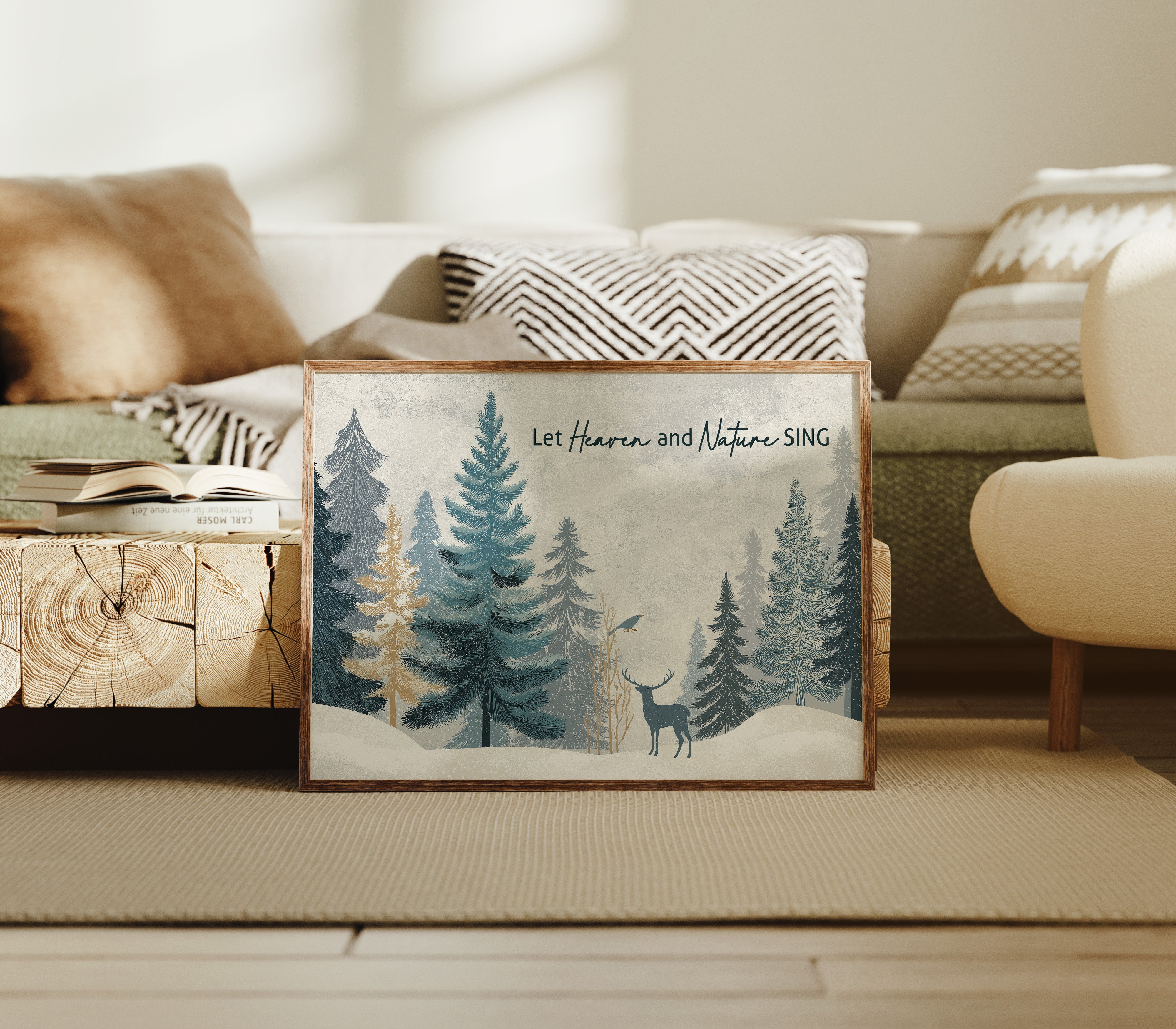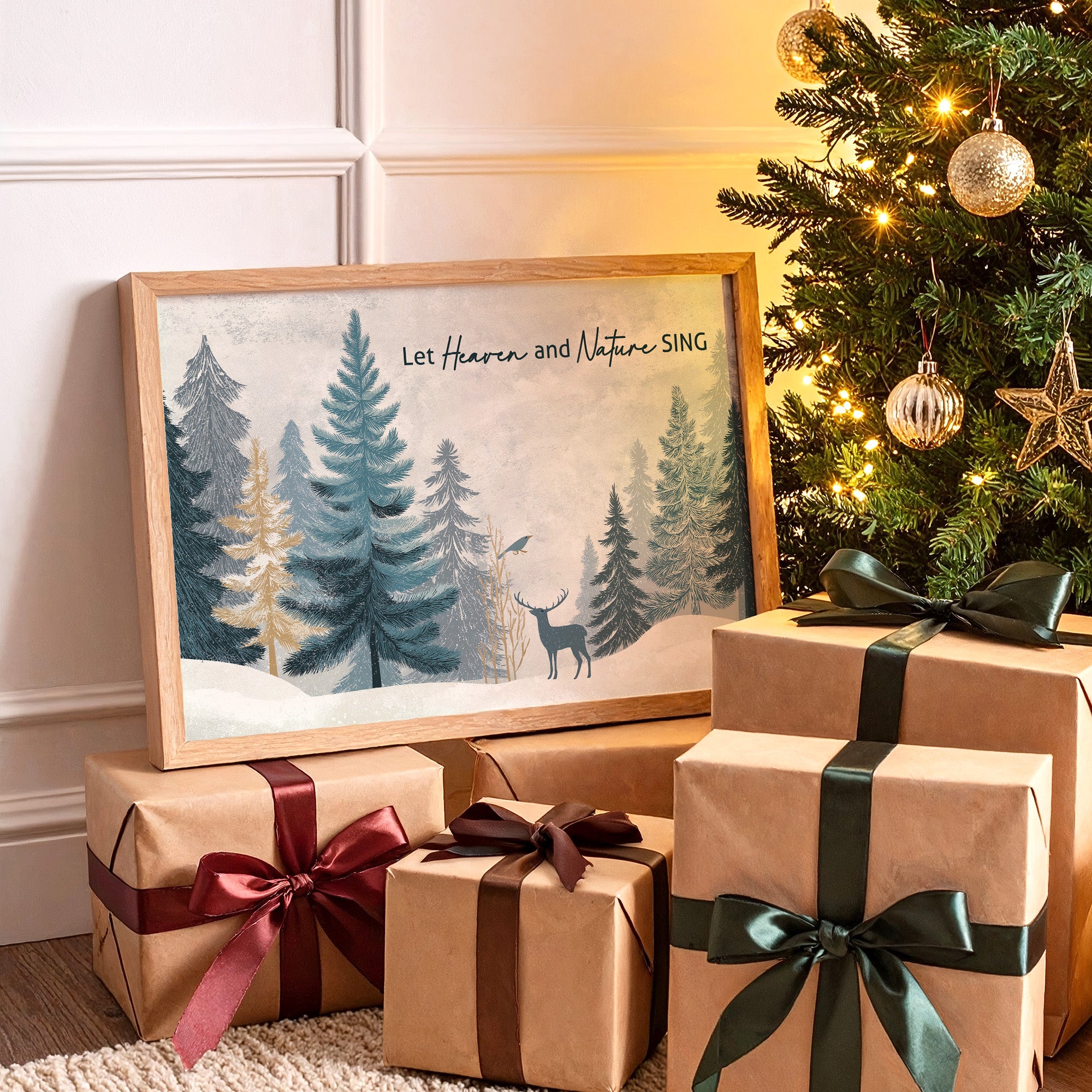 Morning light filters through evergreens where a solitary deer stands sentinel in fresh snow. Teal and golden pines rise against a misty sky, creating a peaceful woodland sanctuary where time seems suspended. The rustic wood frame complements the natural scene, bringing the tranquility of forest stillness into a cozy living space.