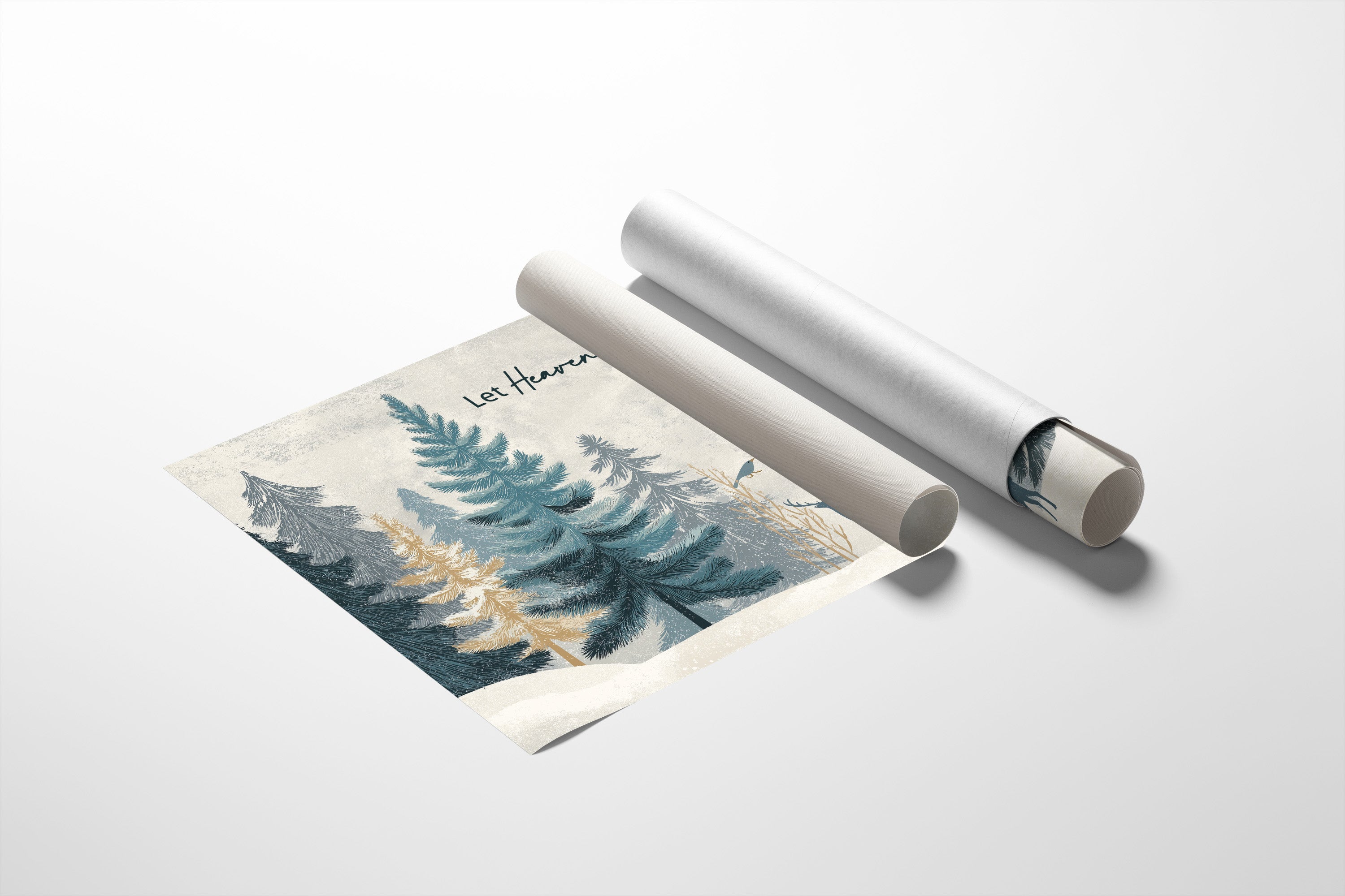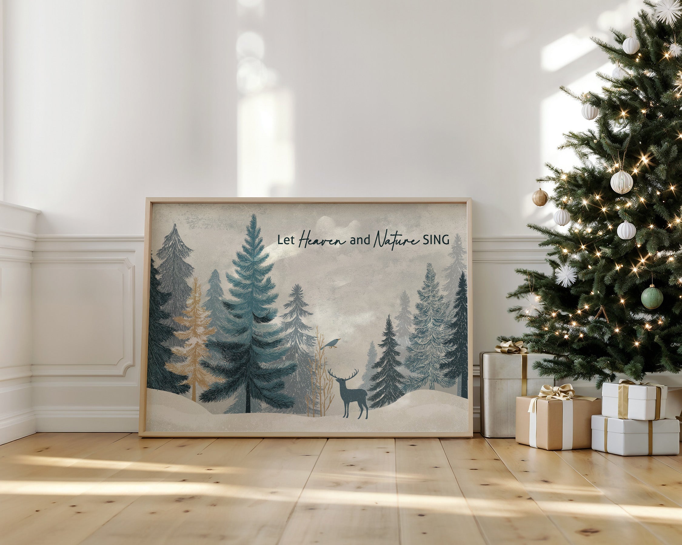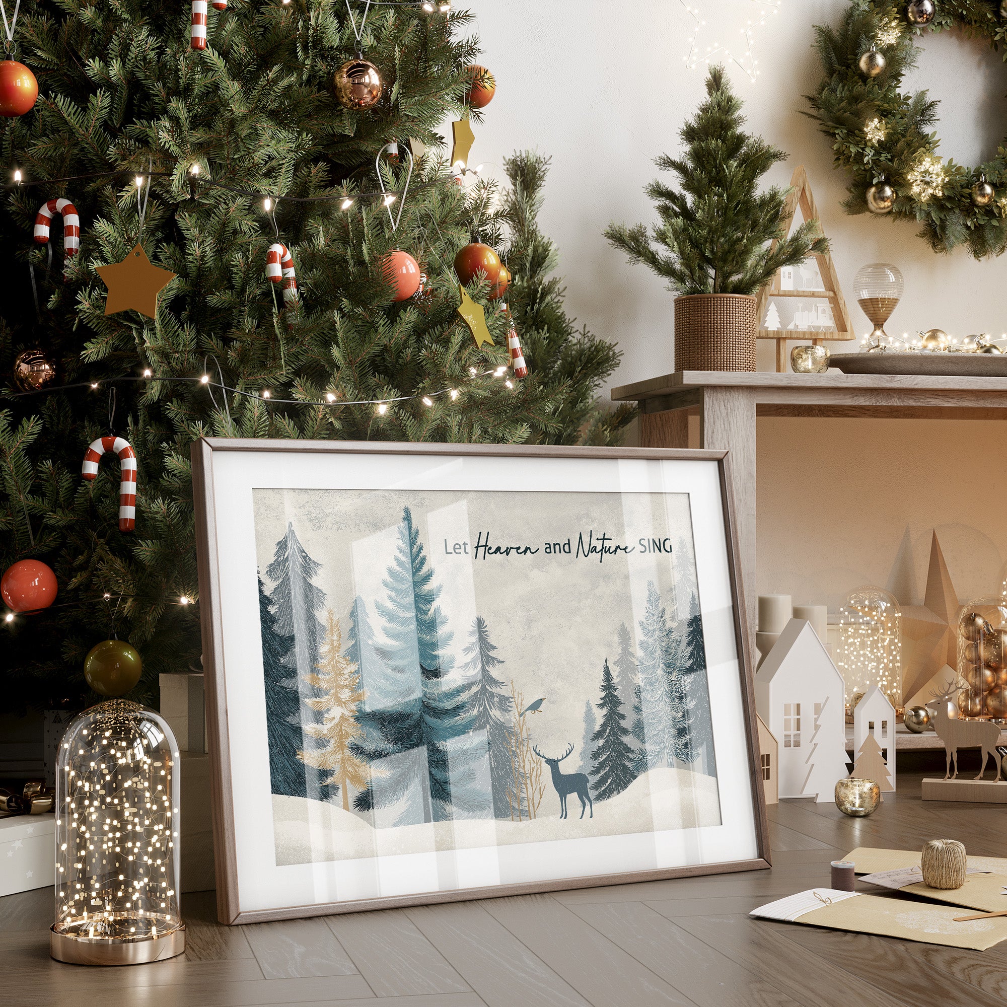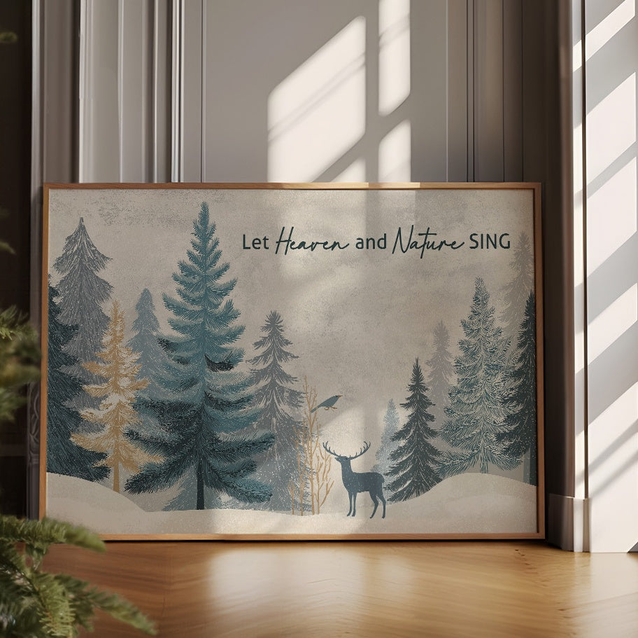 Morning light filters through evergreens where a solitary deer stands sentinel in fresh snow. Teal and golden pines rise against a misty sky, creating a peaceful woodland sanctuary where time seems suspended. The rustic wood frame complements the natural scene, bringing the tranquility of forest stillness into a cozy living space.