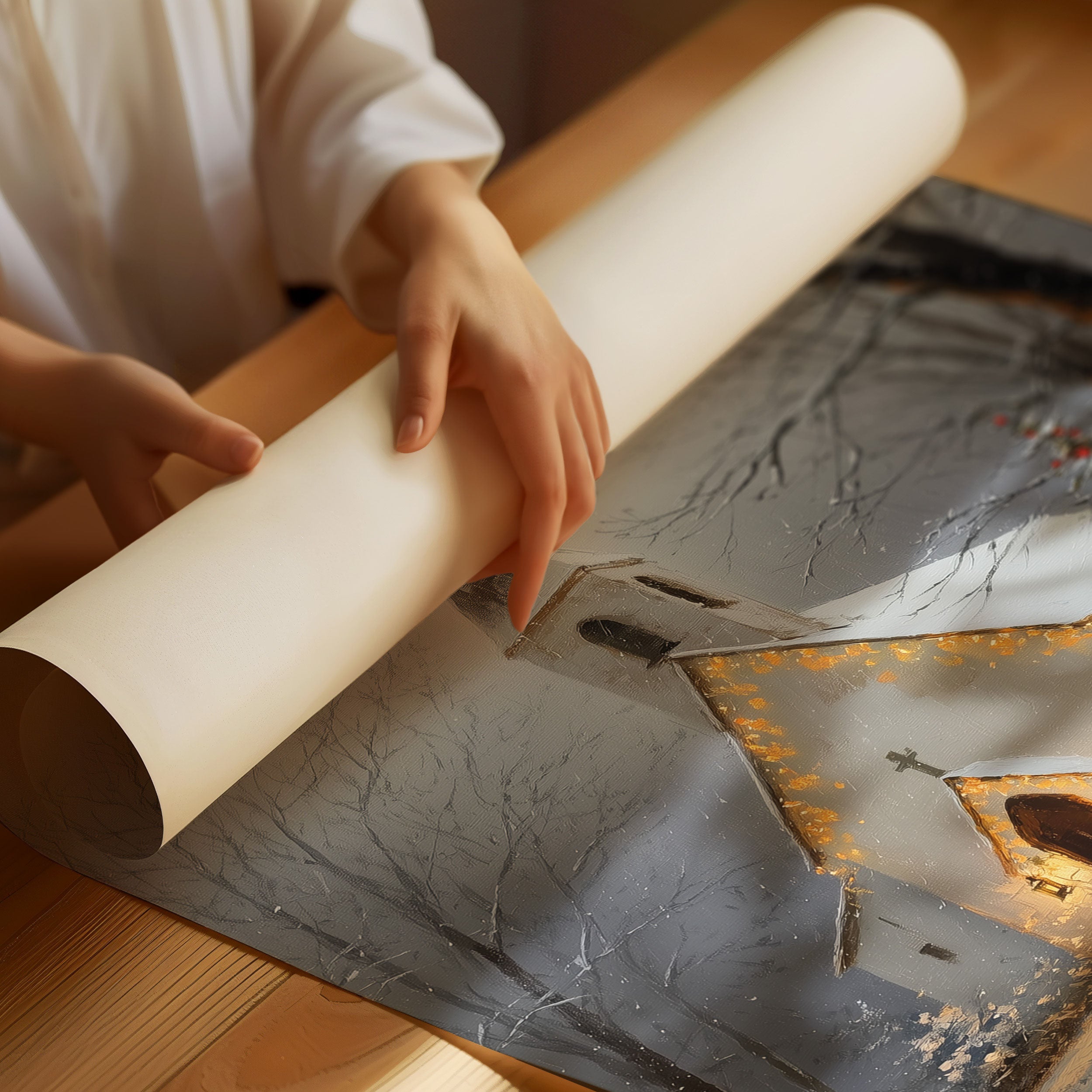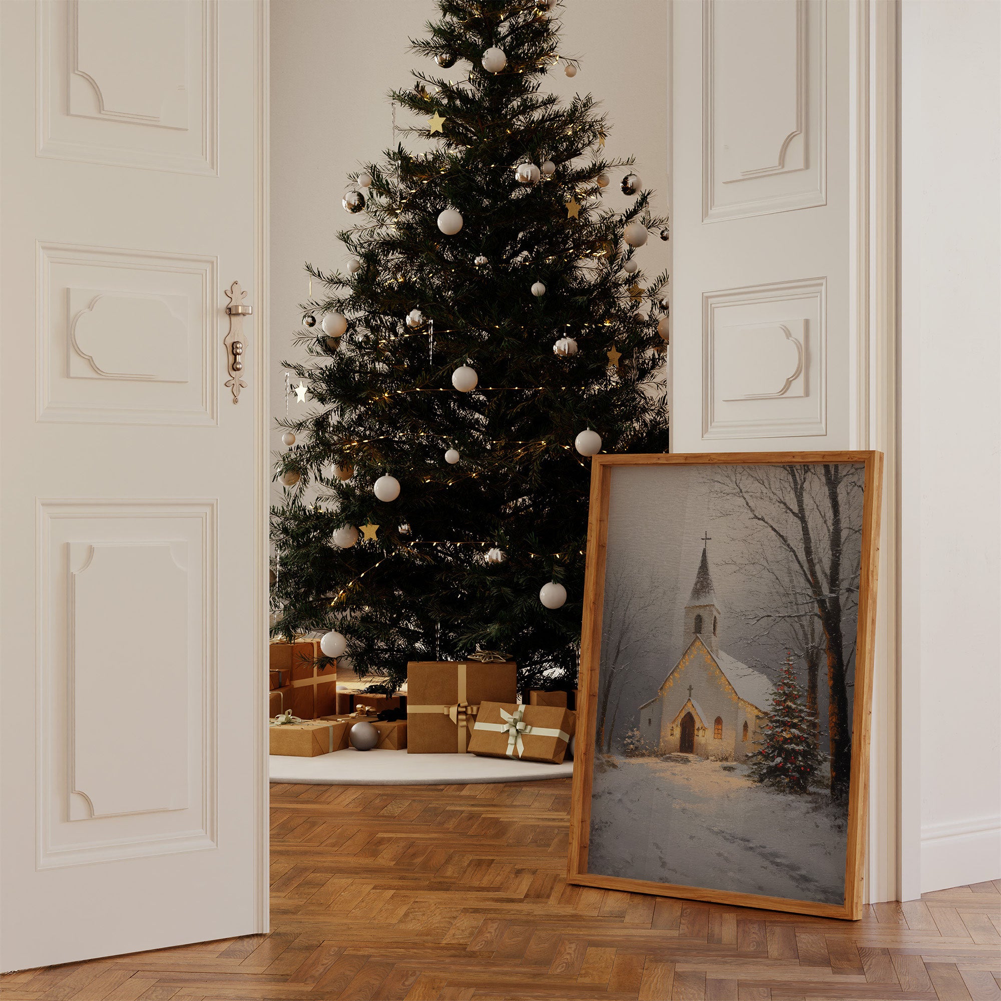 A gentle blanket of snow cradles a solitary white chapel, its windows glowing with warm golden light against the winter twilight. Bare branches reach through the misty air while an adorned evergreen stands sentinel beside the church's weathered steps. The scene captures a moment of profound peace, where faith and nature harmonize in winter's quiet embrace. This nostalgic winter scene evokes memories of traditional holiday celebrations and small-town charm, with its delicate balance of cool whites and warming amber tones. Perfect for creating a focal point in living spaces during the holiday season or year-round in spaces seeking to capture timeless serenity.