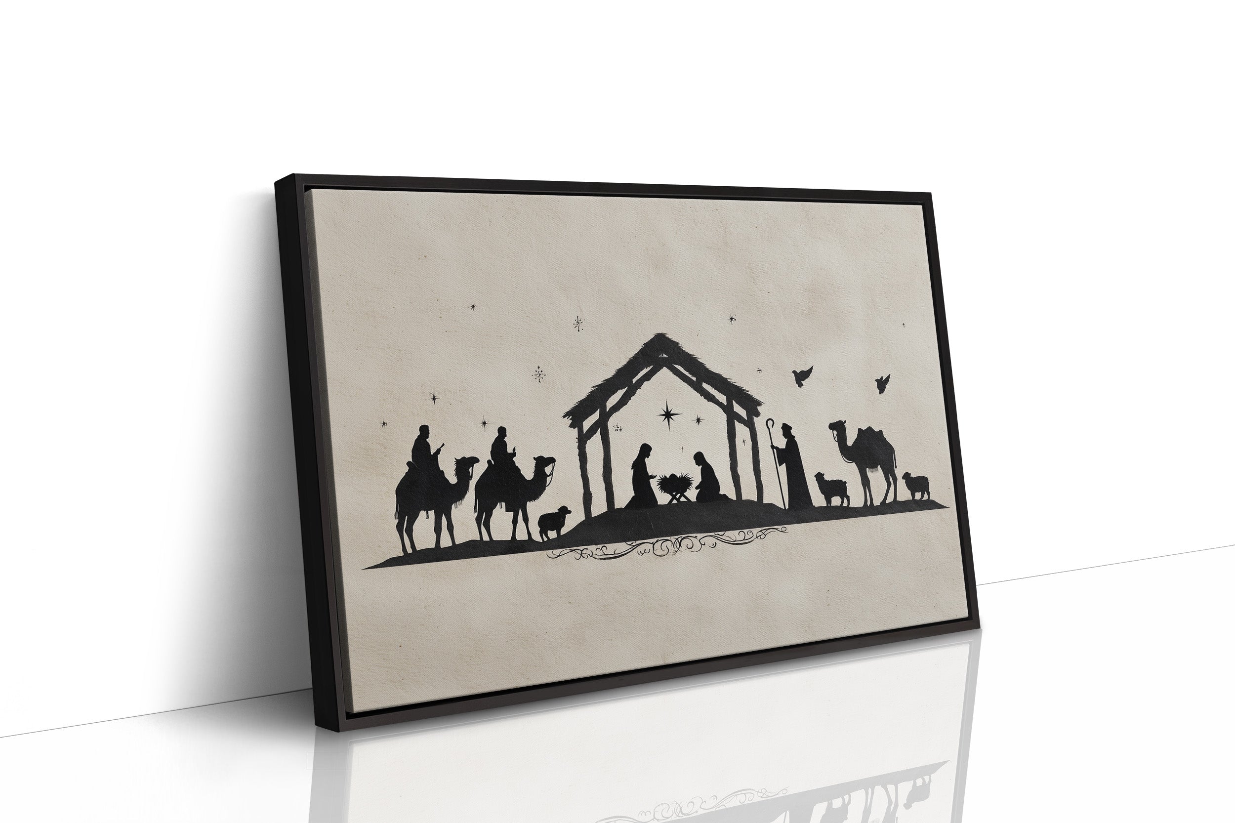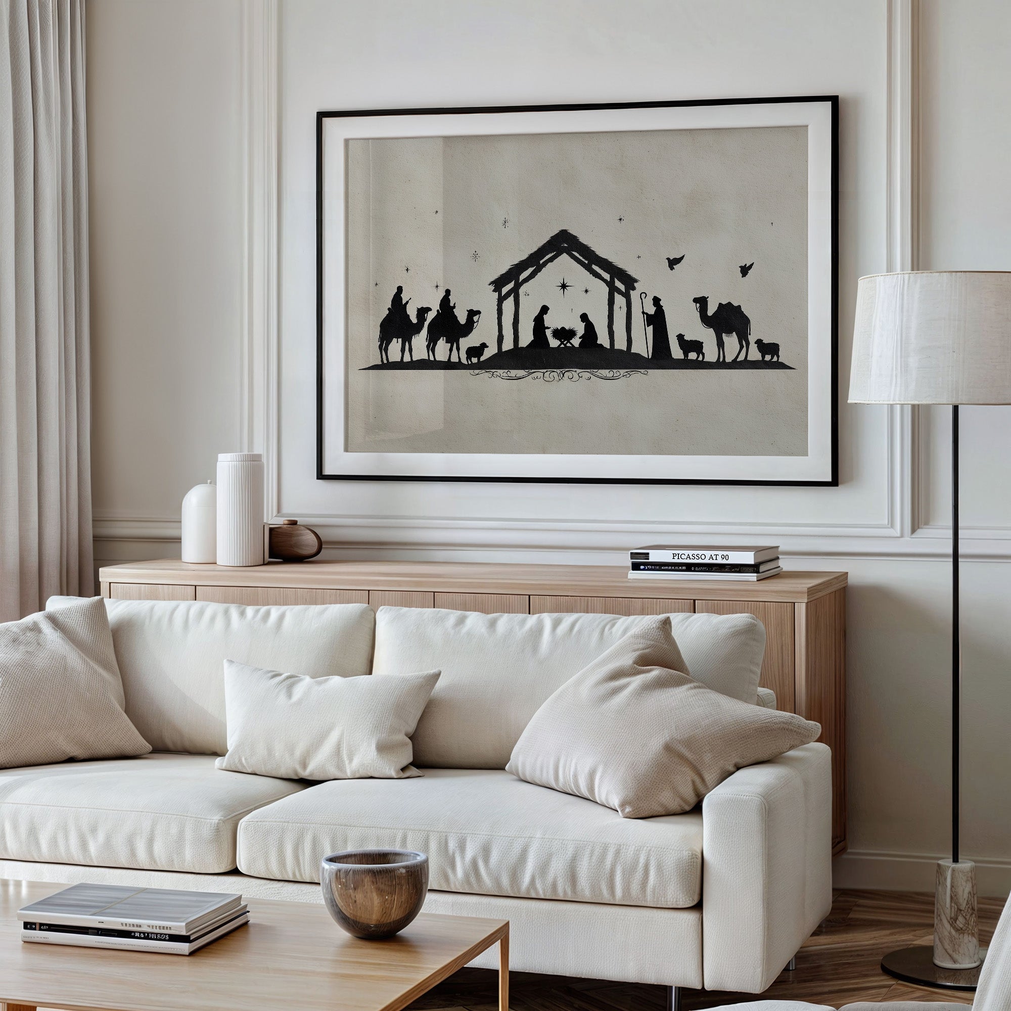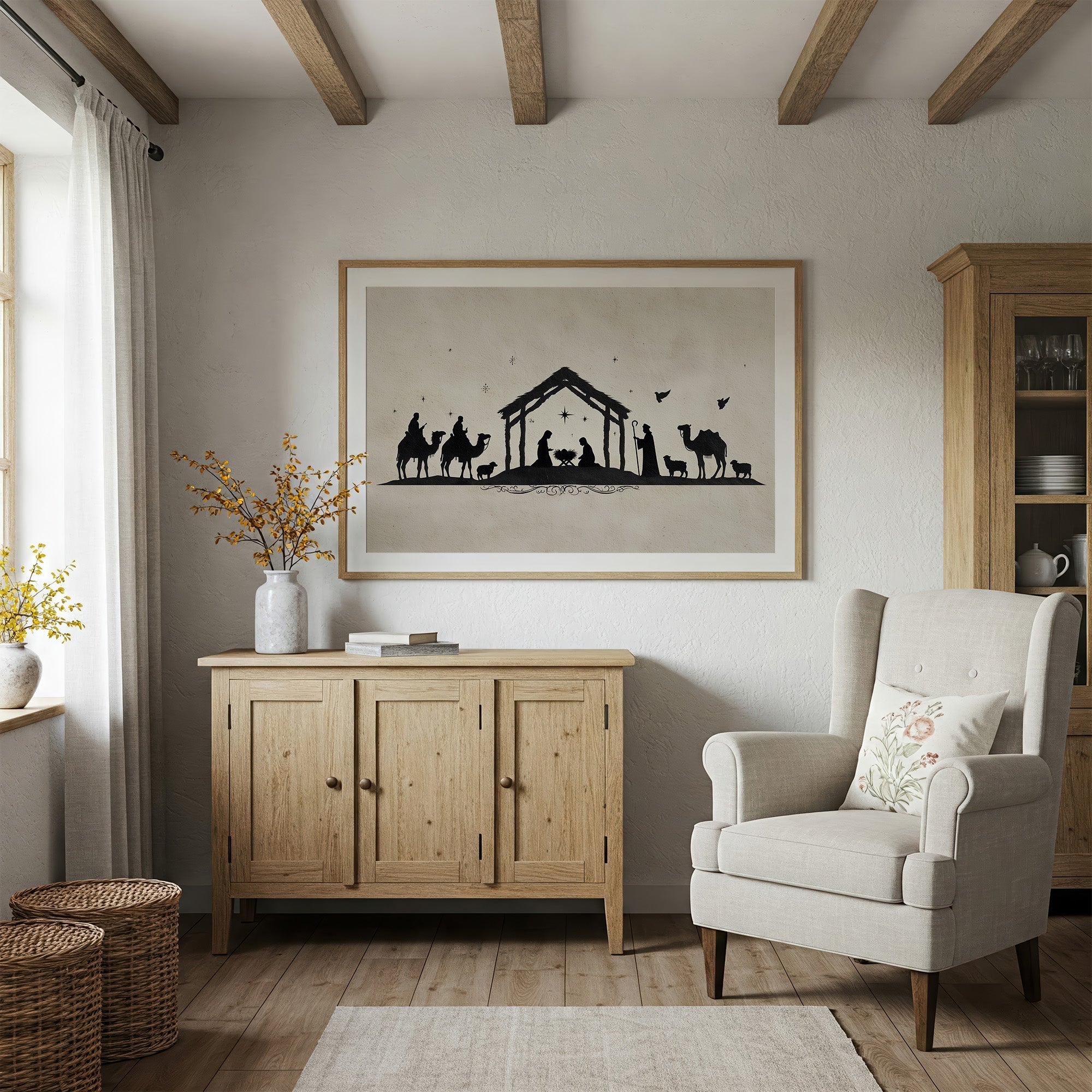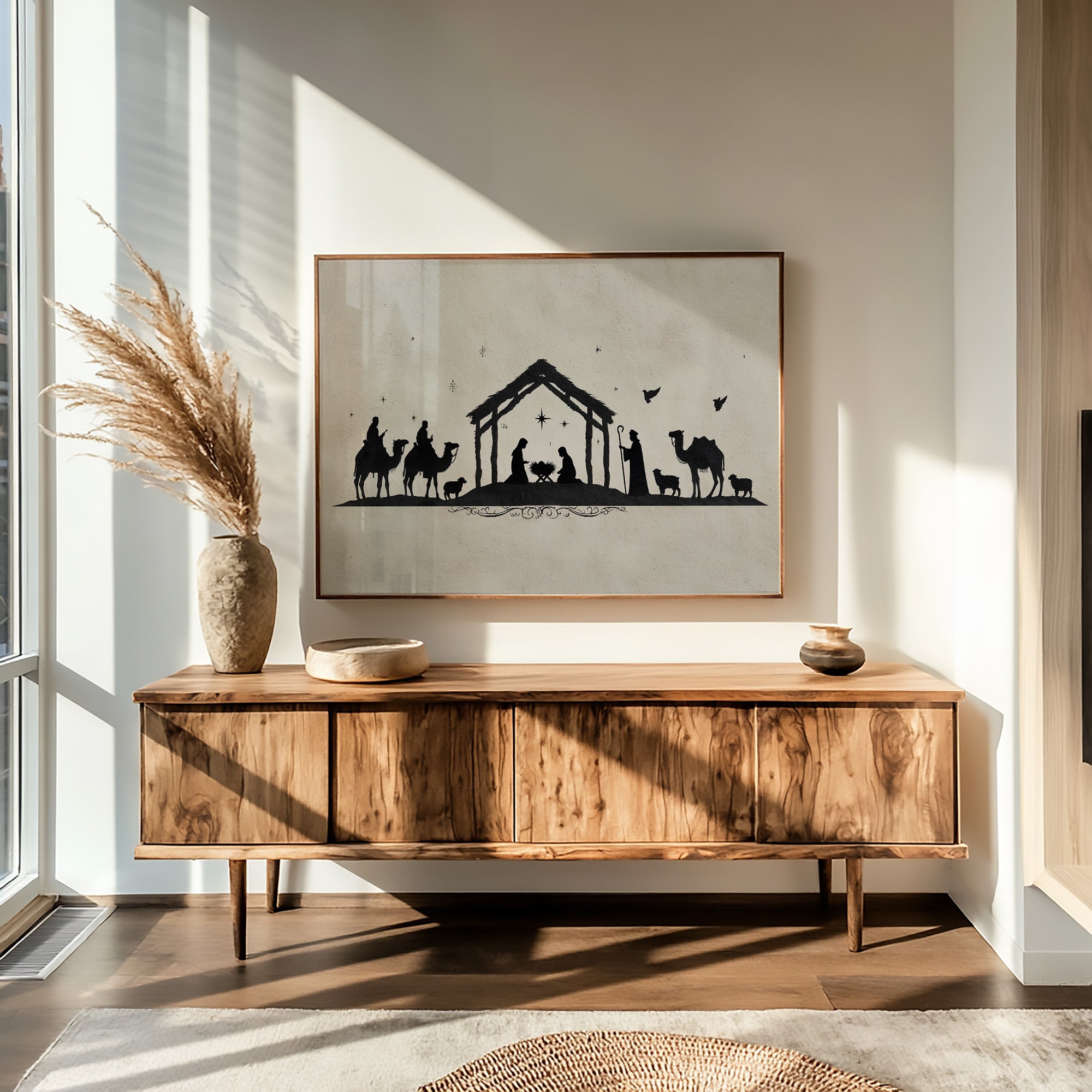 A moment of sacred stillness captured in stark black against cream-colored paper. The nativity scene unfolds in elegant silhouetteswise men on camels, shepherds with their flock, and the holy family beneath a simple stable roof. The minimalist ink illustration rests against wooden bookshelves, creating a thoughtful dialogue between ancient story and contemporary space. This piece brings contemplative warmth to a reading nook, study, or living area during holiday seasons.