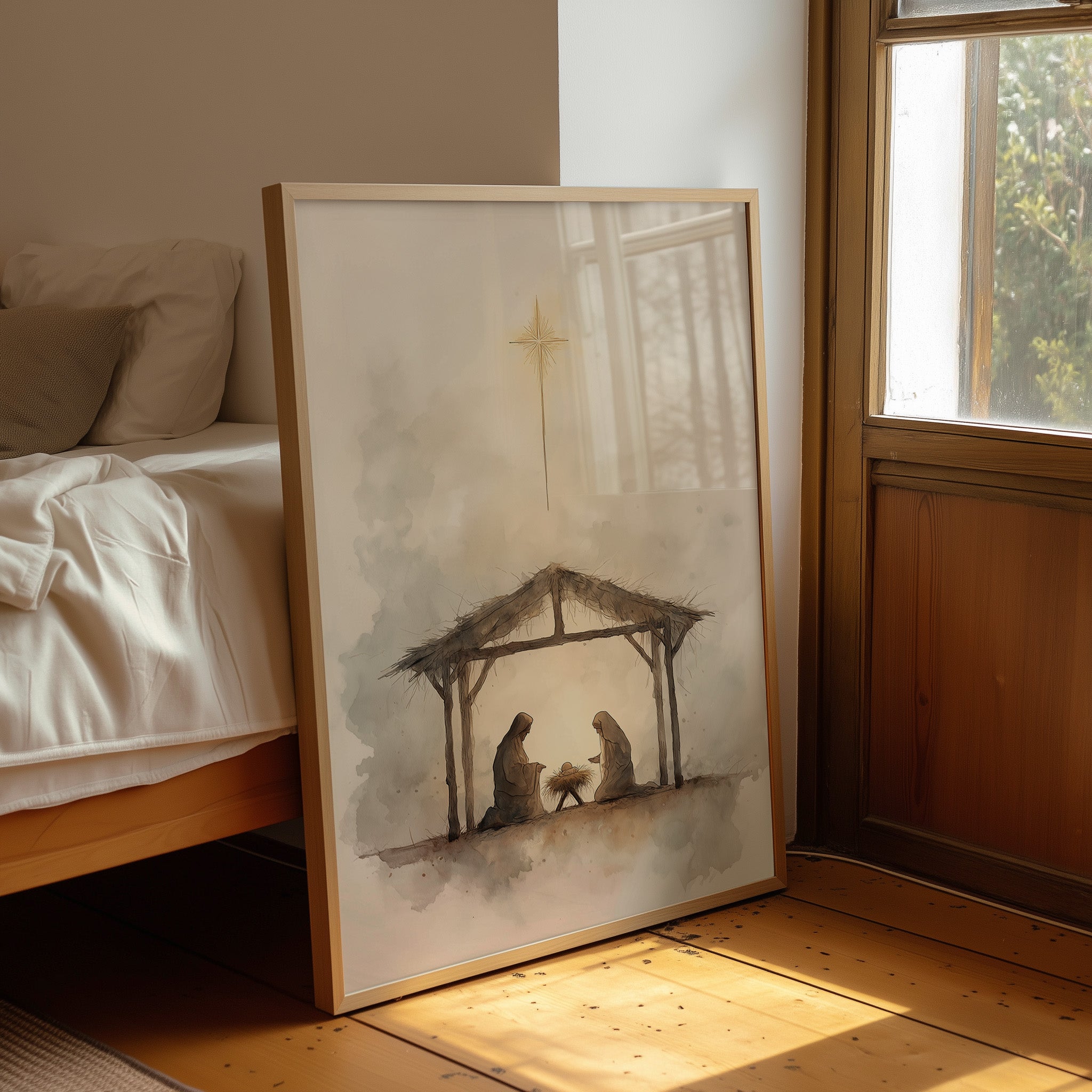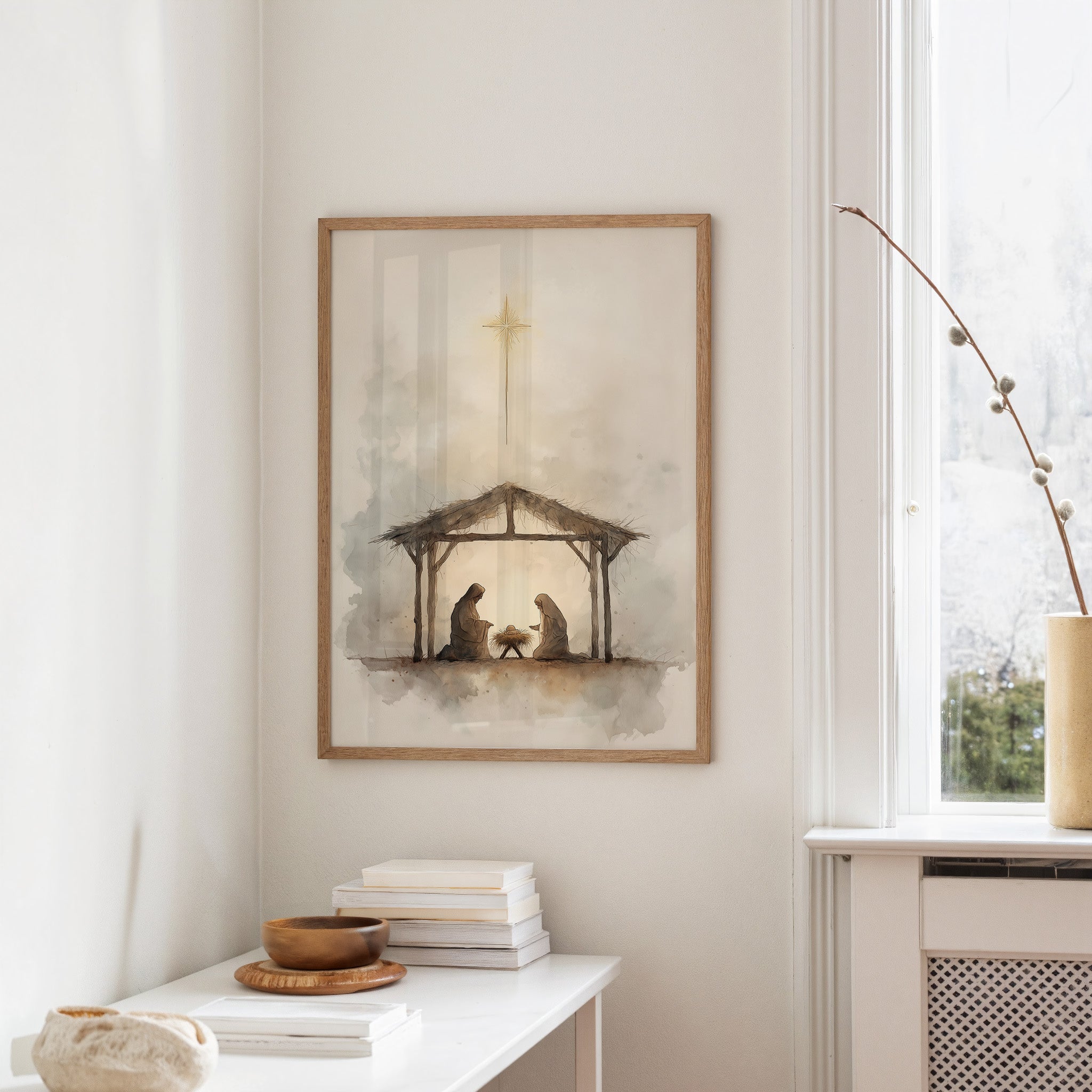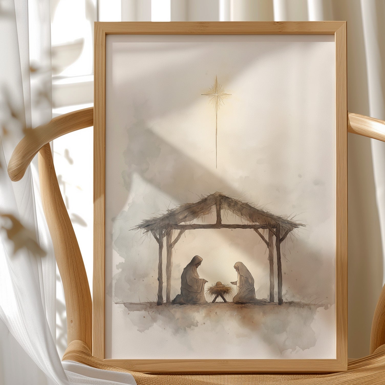 Morning light spills across a delicate watercolor nativity scene, the soft brushstrokes capturing a moment of sacred stillness. The humble manger sits beneath a radiant star, with Mary and Joseph gathered around the newborn Christ in muted earth tones that speak of both simplicity and profound significance. The artwork rests on weathered wooden planks, accompanied by the gentle presence of greenery and a steaming cup, creating a moment of contemplative peace.