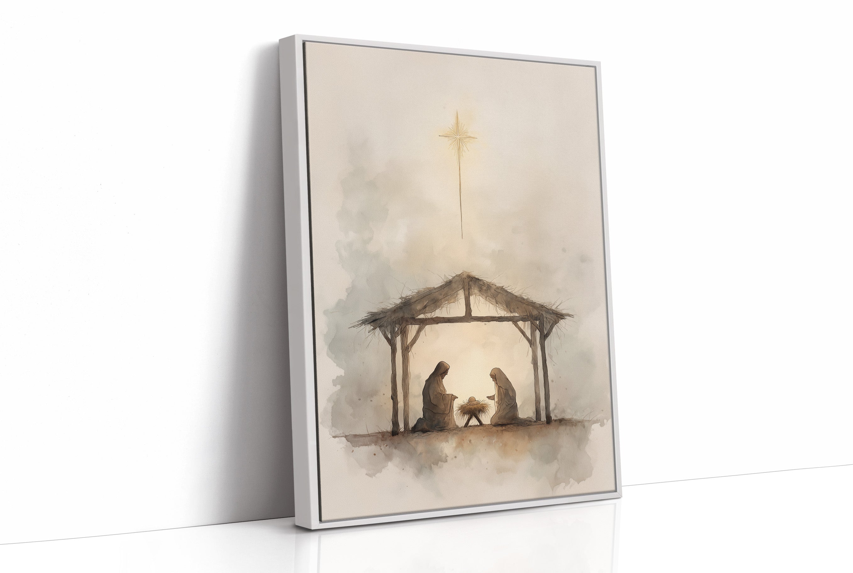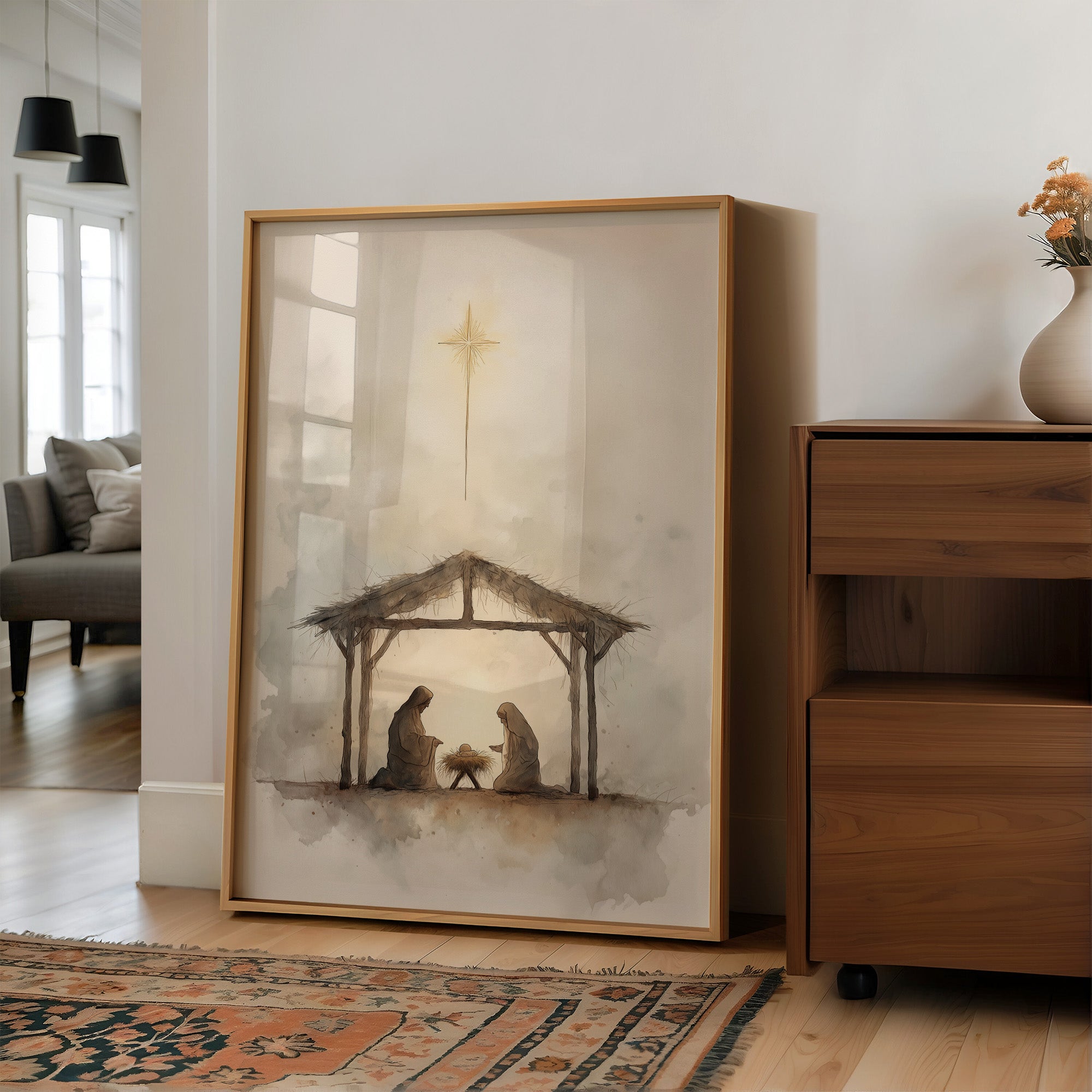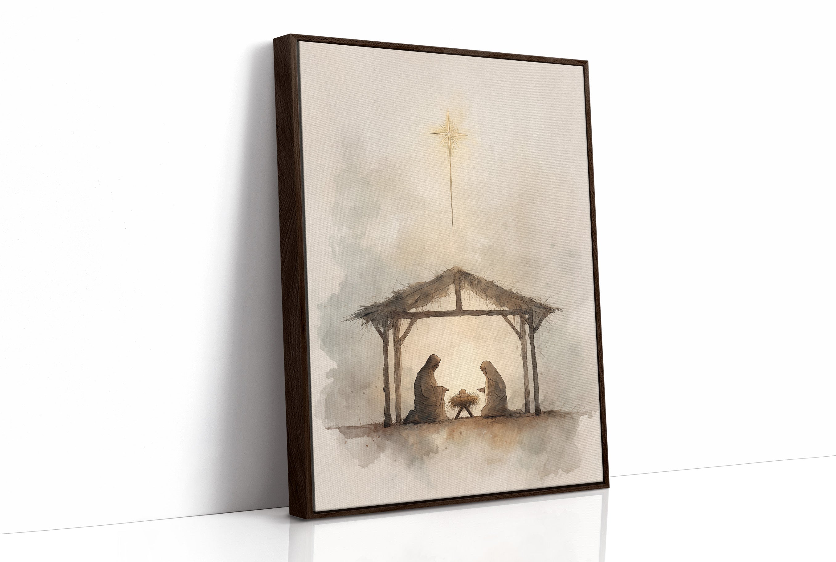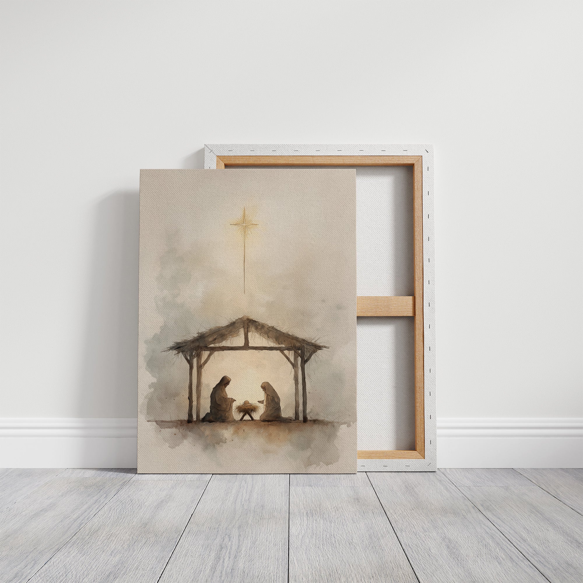 Morning light spills across a delicate watercolor nativity scene, the soft brushstrokes capturing a moment of sacred stillness. The humble manger sits beneath a radiant star, with Mary and Joseph gathered around the newborn Christ in muted earth tones that speak of both simplicity and profound significance. The artwork rests on weathered wooden planks, accompanied by the gentle presence of greenery and a steaming cup, creating a moment of contemplative peace.