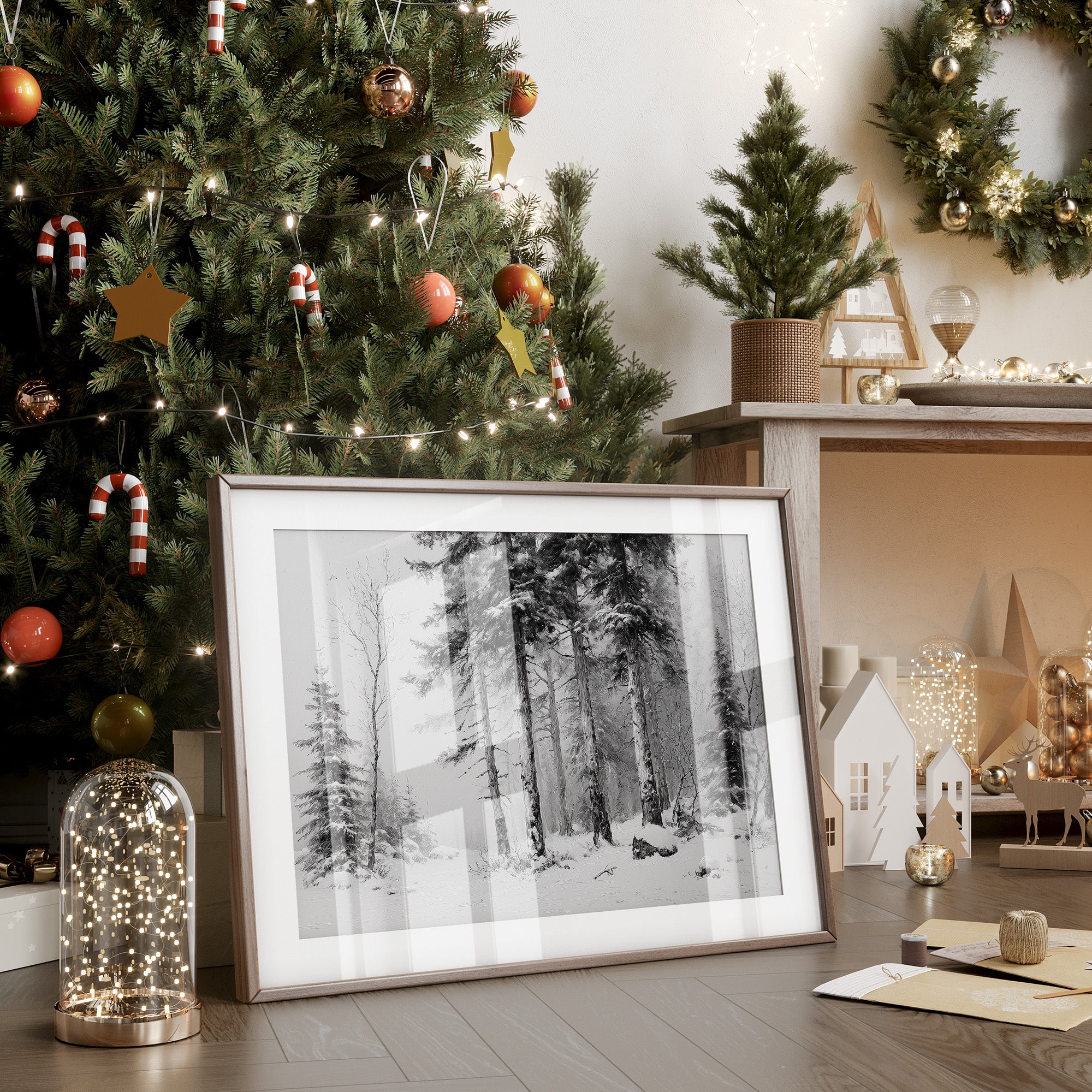 Morning light spills across wooden floors, illuminating a monochromatic forest scene where towering evergreens stand sentinel in fresh snow. The black and white composition captures the quiet dignity of winter, with delicate branches reaching through misty air and snow-laden boughs bowing to earth's gentle weight. The minimalist scene is perfectly balanced by its contemporary setting - a bright room where holiday warmth meets Scandinavian simplicity. This piece brings contemplative winter serenity to modern living spaces, ideal for a minimalist living room or sophisticated home office where its quiet drama can be fully appreciated.