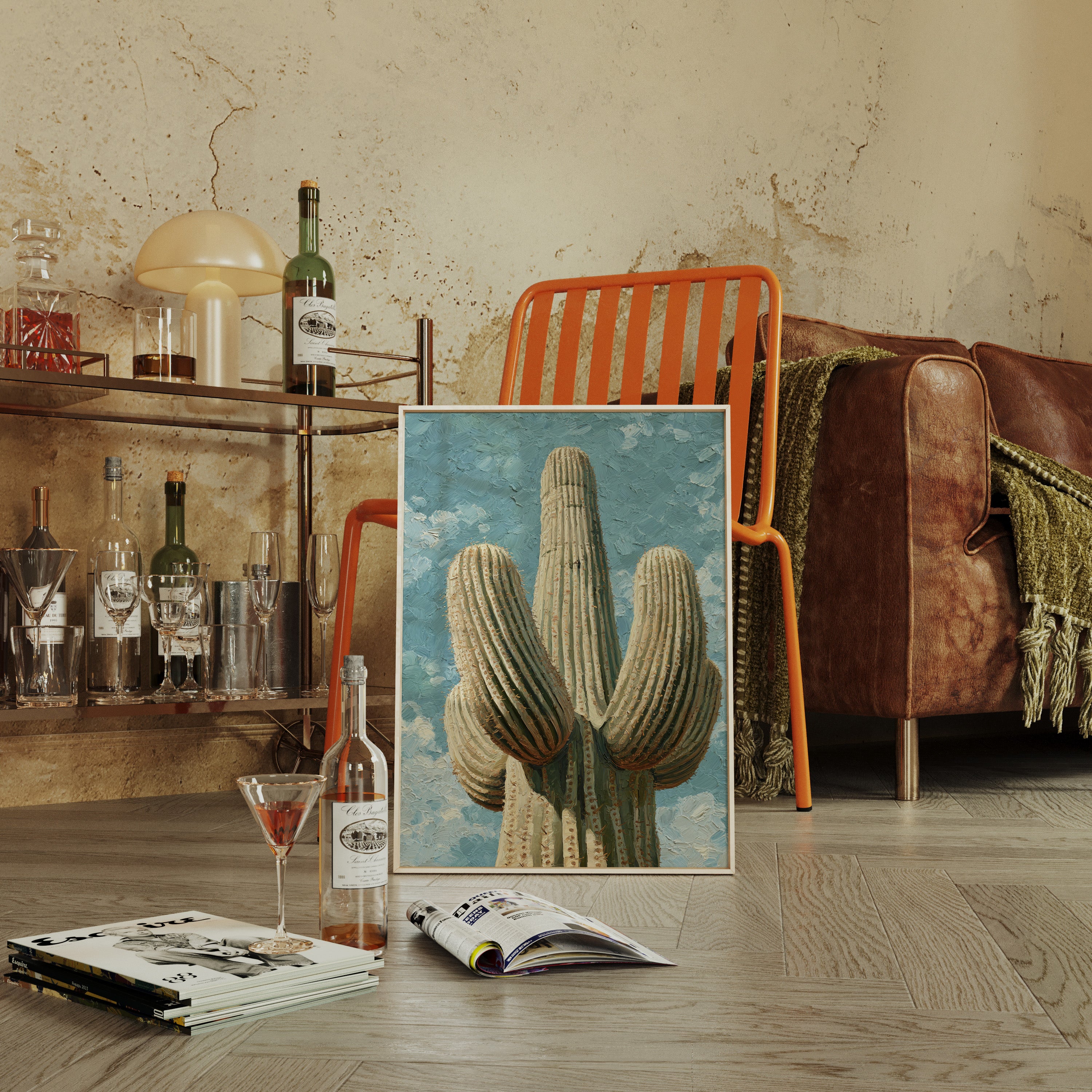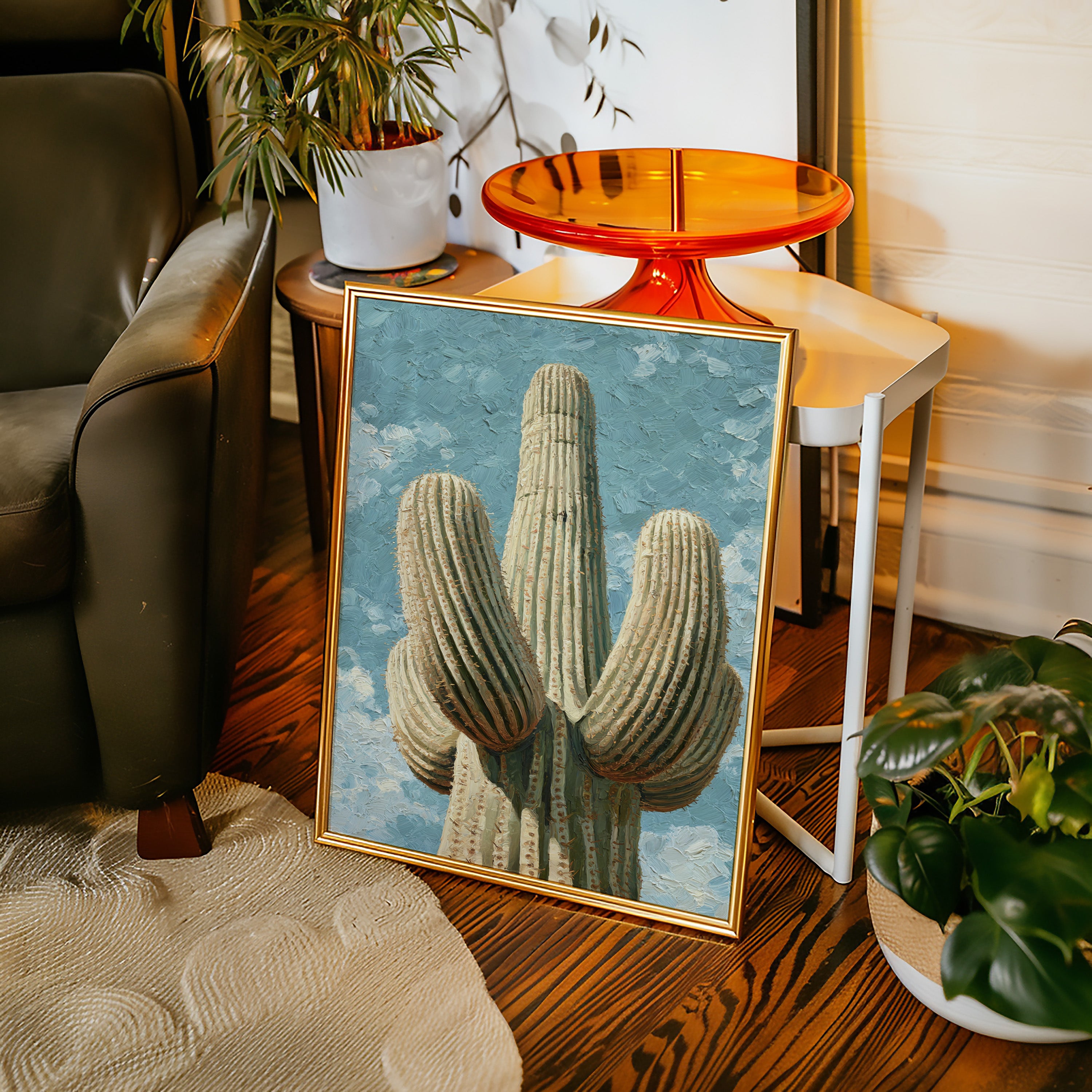 In the vast, tranquil expanse of the desert, a solitary cactus stands as a testament to resilience and beauty. This piece captures the serene majesty of nature's quiet strength.