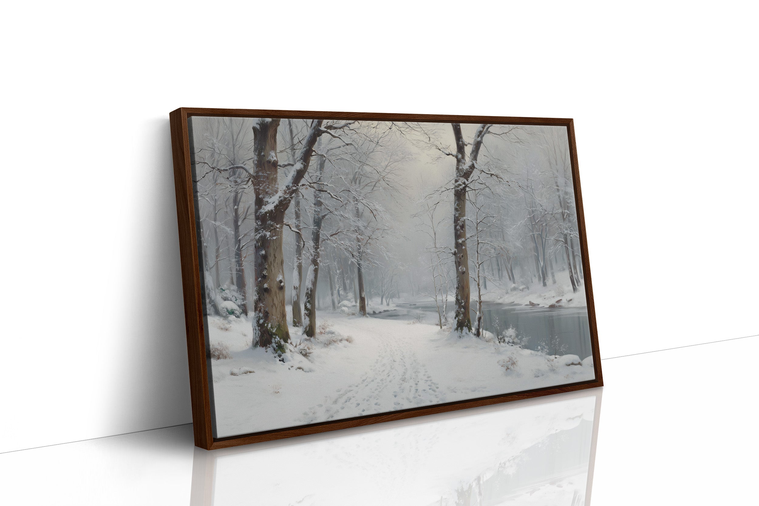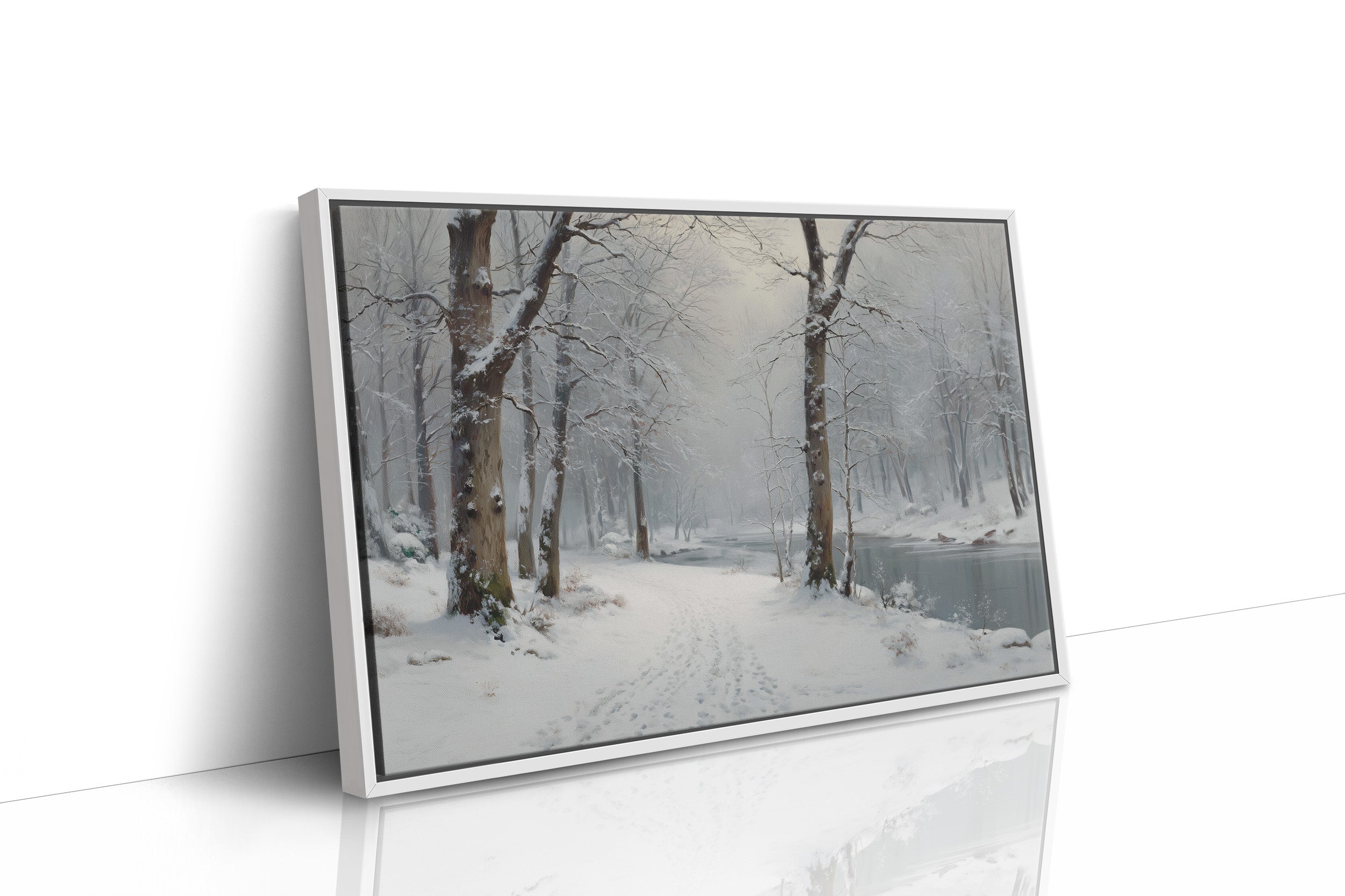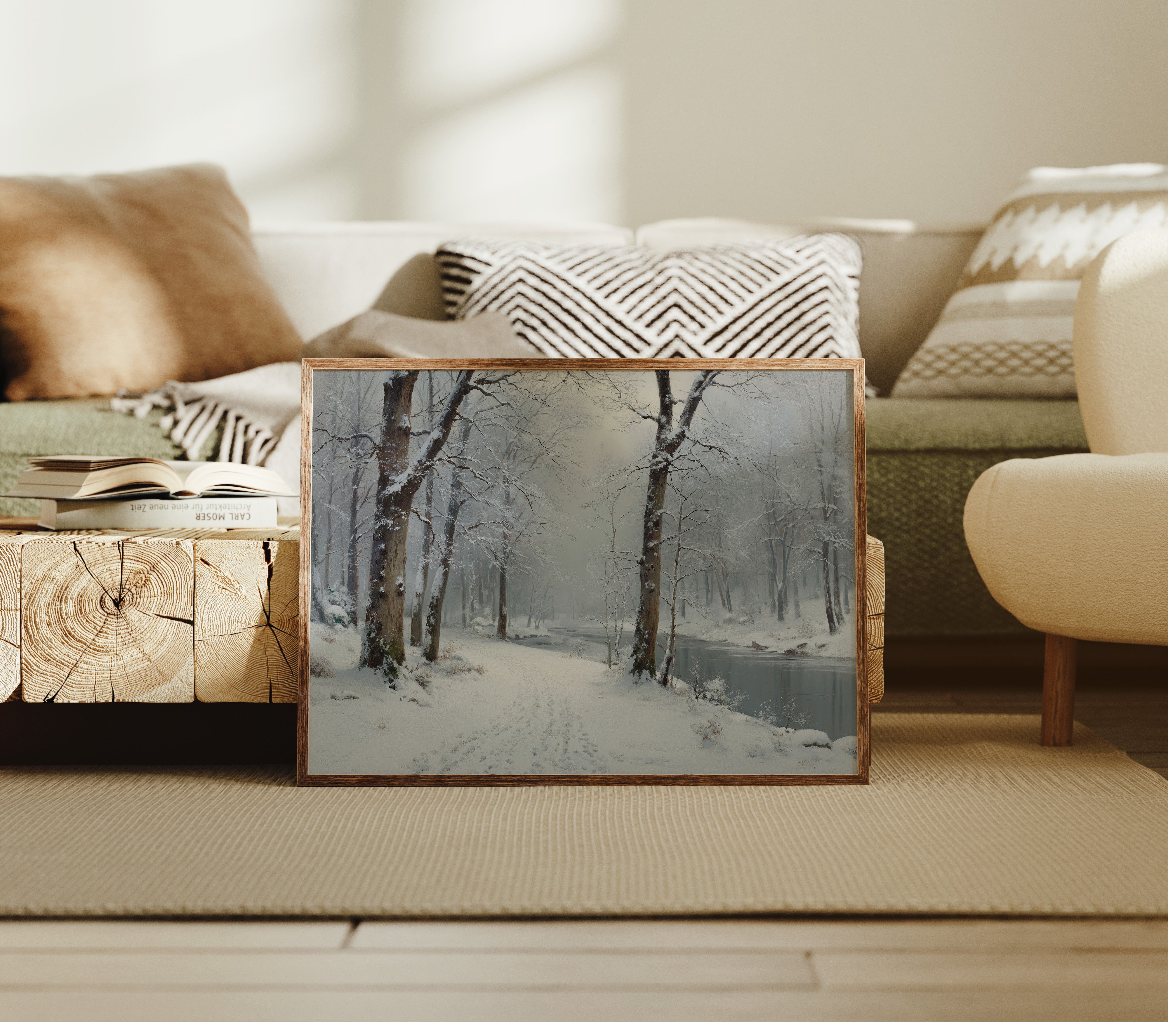 A hushed stillness descends over a winter woodland, where fresh snow carpets the ground like scattered diamonds. Bare trees stand as silent sentinels along a meandering path, their dark trunks creating stark contrast against the ethereal white landscape. The frozen river winds quietly alongside, reflecting the misty gray sky above, while delicate snow crystals cling to every branch and twig. This serene winter scene captures the peaceful solitude of a forest in winter's embrace. Perfect for creating a sense of tranquil contemplation in a reading nook, home office, or any space where you seek to bring the quiet beauty of nature indoors.