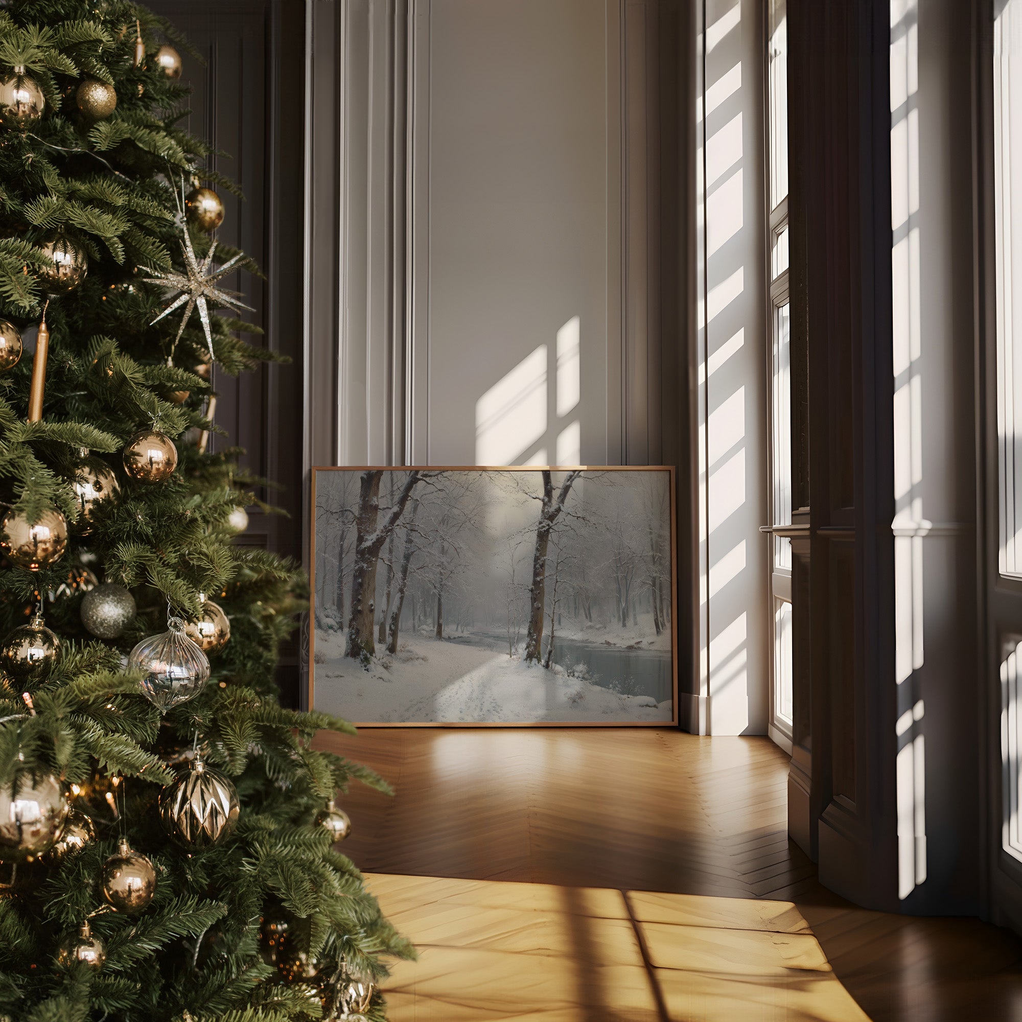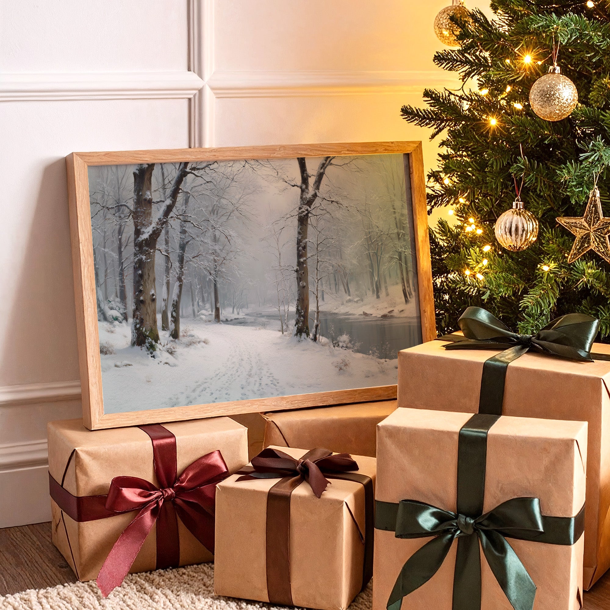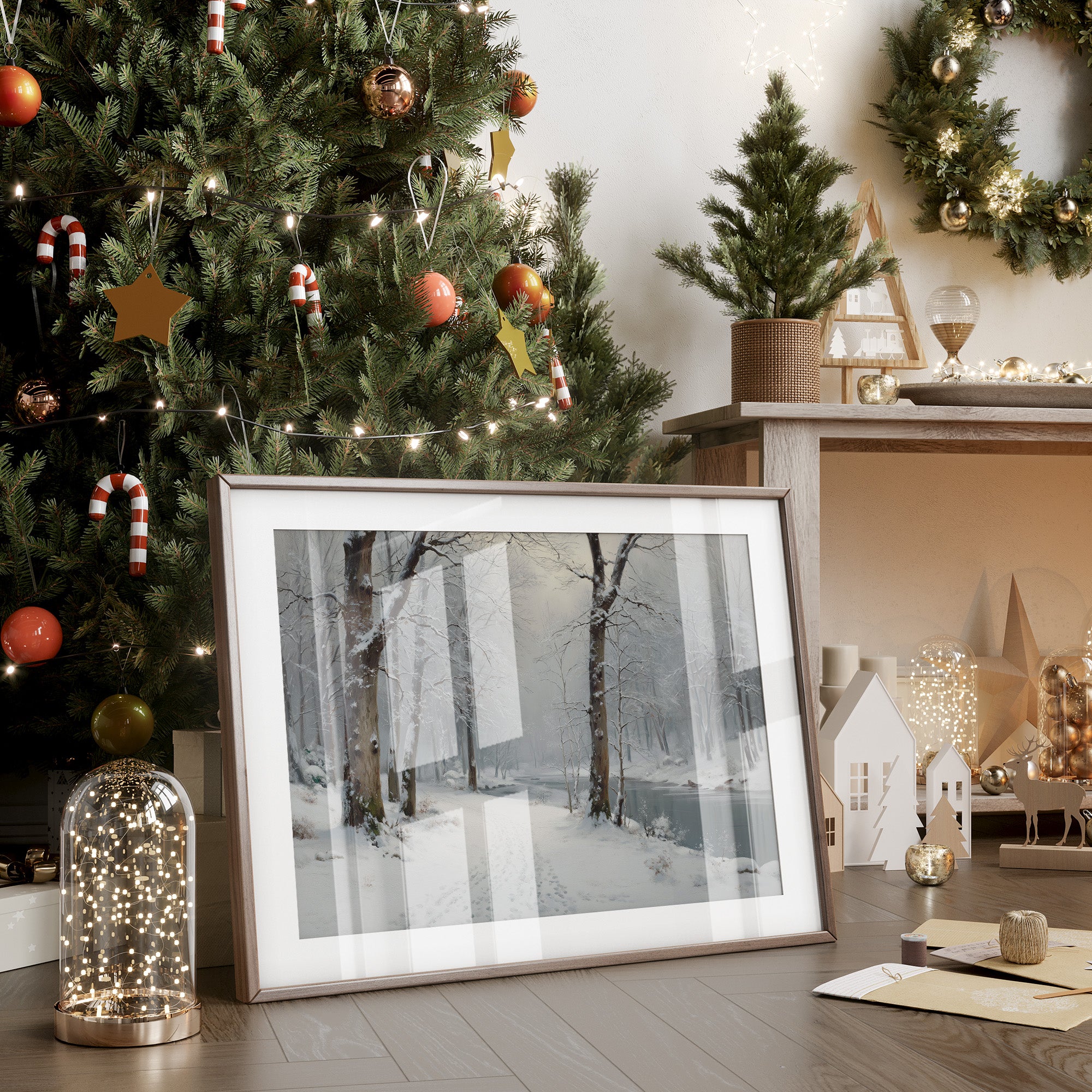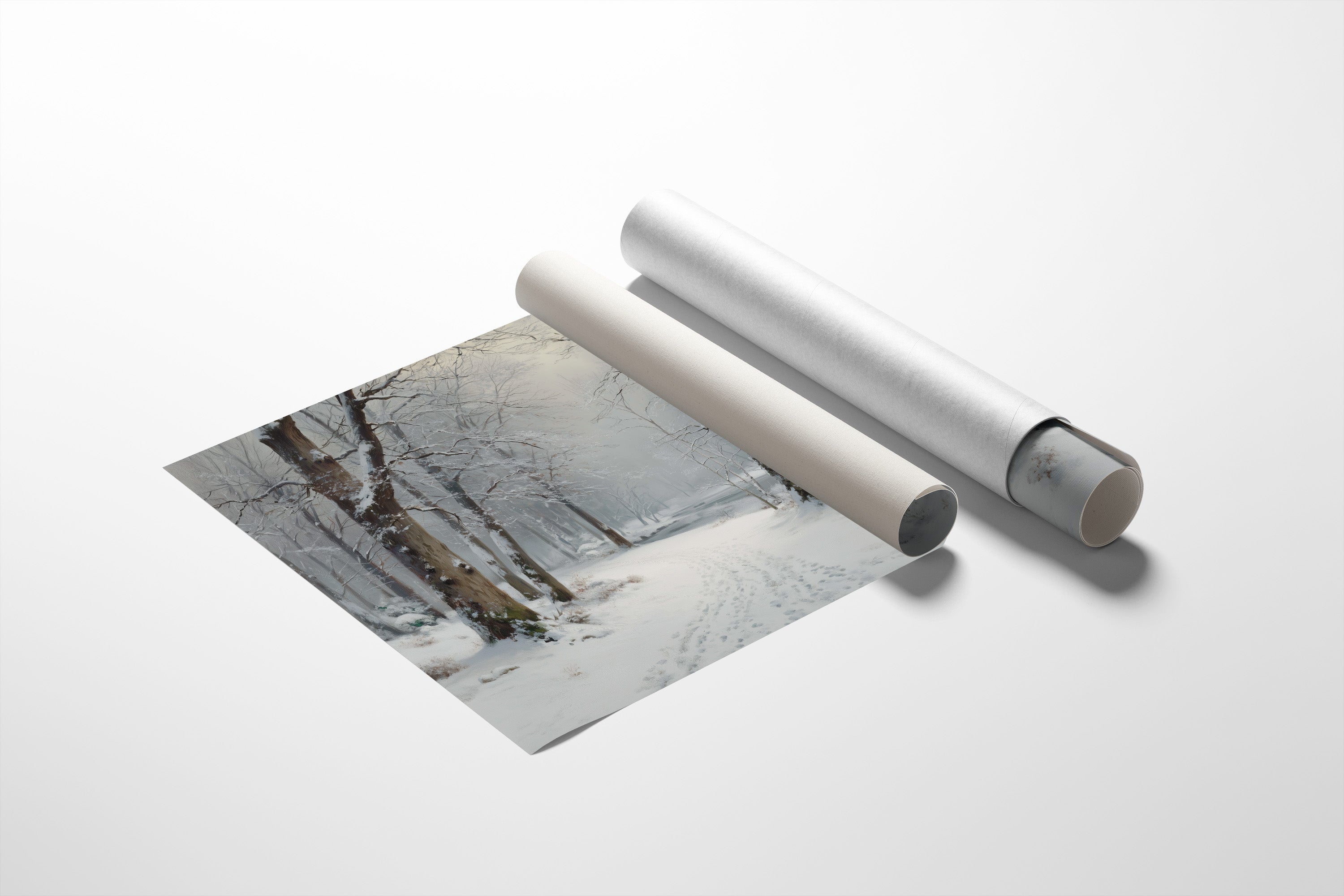 A hushed stillness descends over a winter woodland, where fresh snow carpets the ground like scattered diamonds. Bare trees stand as silent sentinels along a meandering path, their dark trunks creating stark contrast against the ethereal white landscape. The frozen river winds quietly alongside, reflecting the misty gray sky above, while delicate snow crystals cling to every branch and twig. This serene winter scene captures the peaceful solitude of a forest in winter's embrace. Perfect for creating a sense of tranquil contemplation in a reading nook, home office, or any space where you seek to bring the quiet beauty of nature indoors.