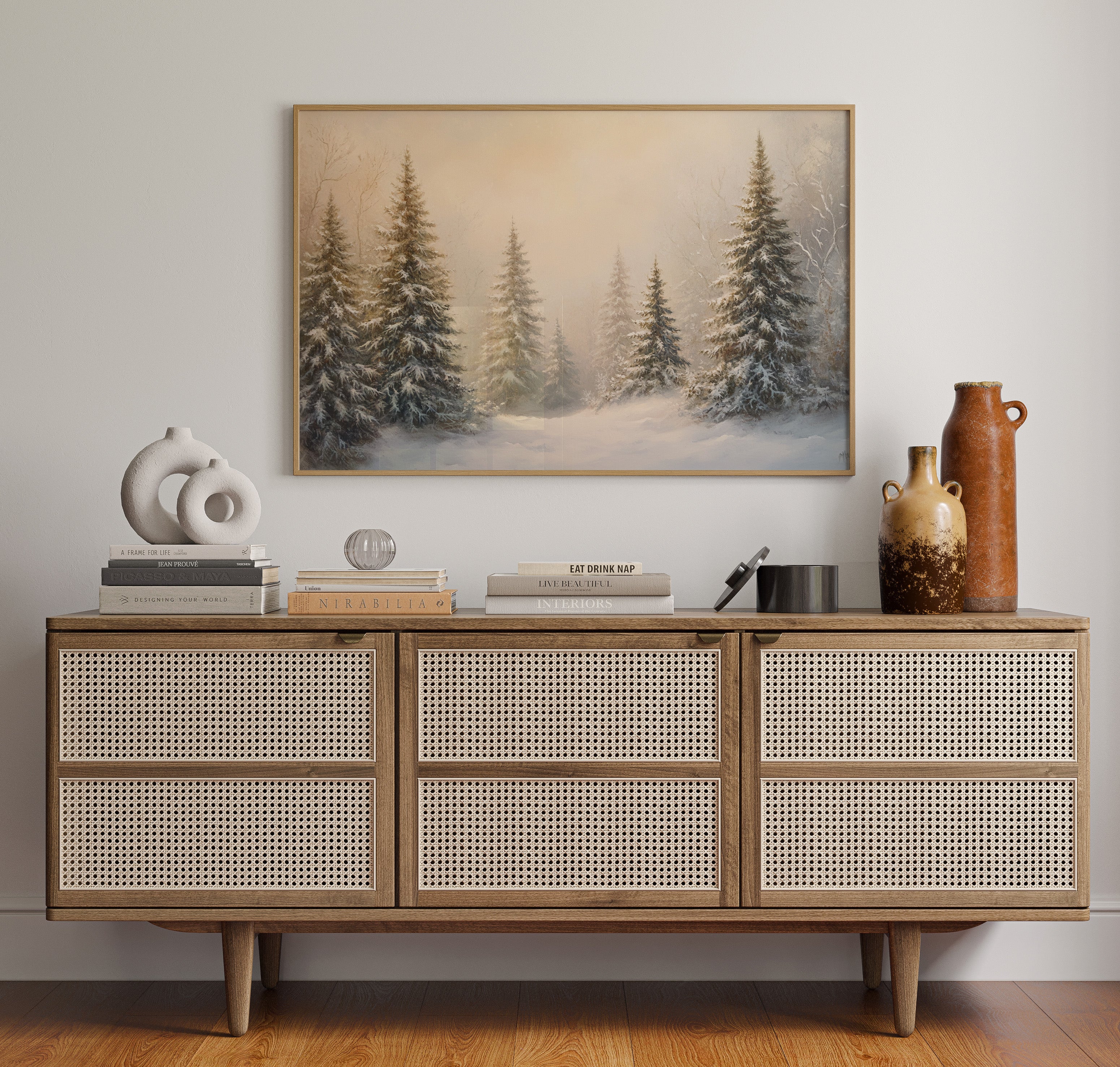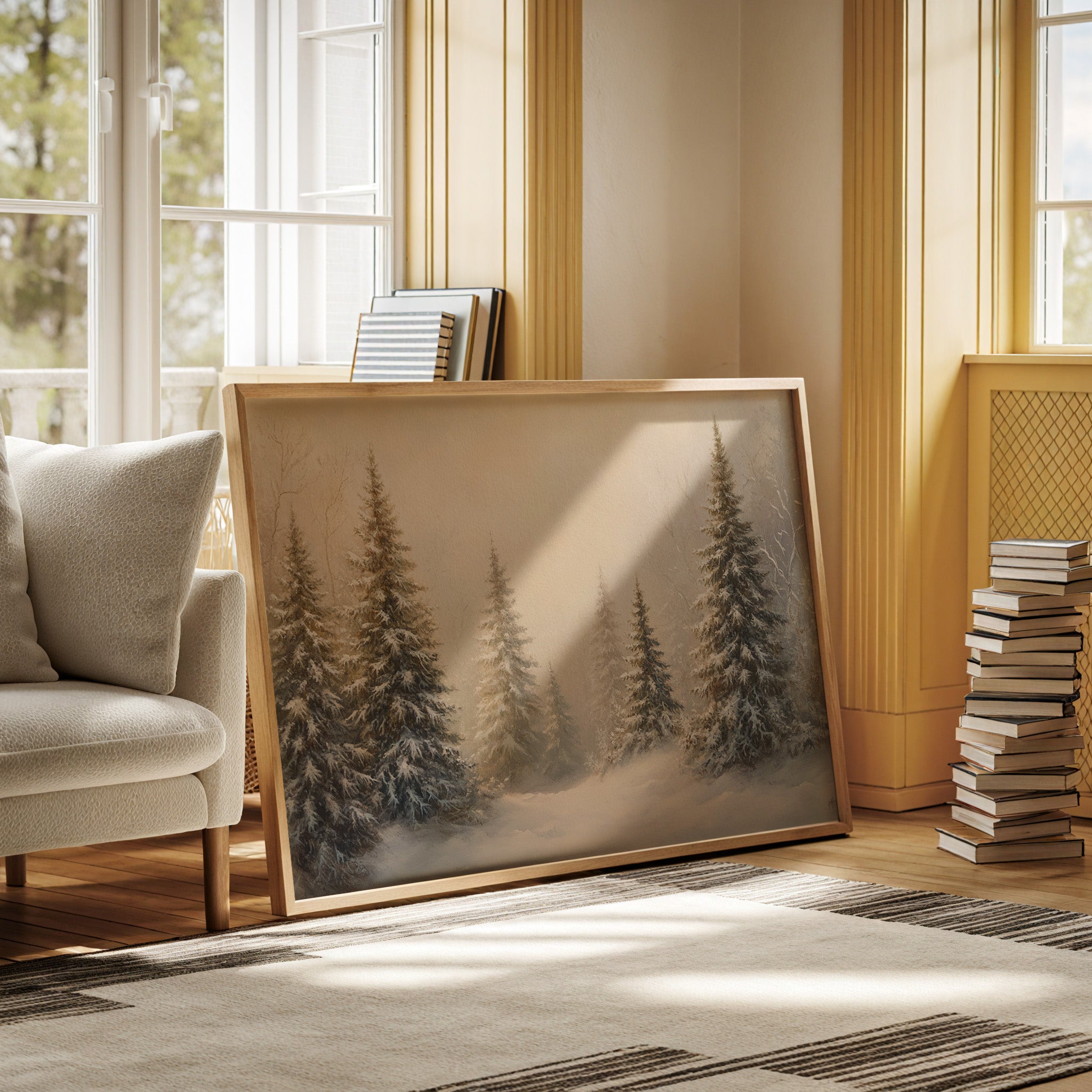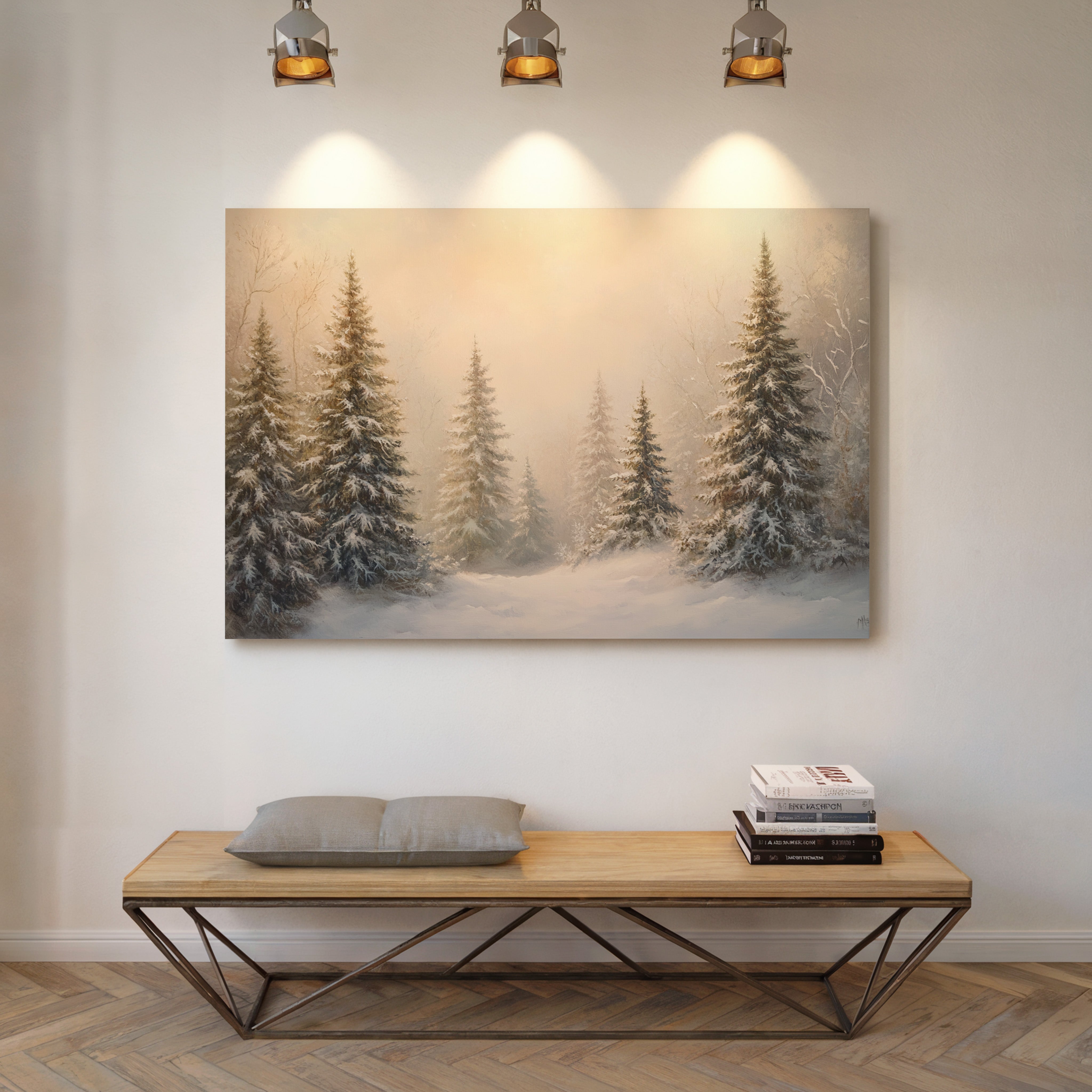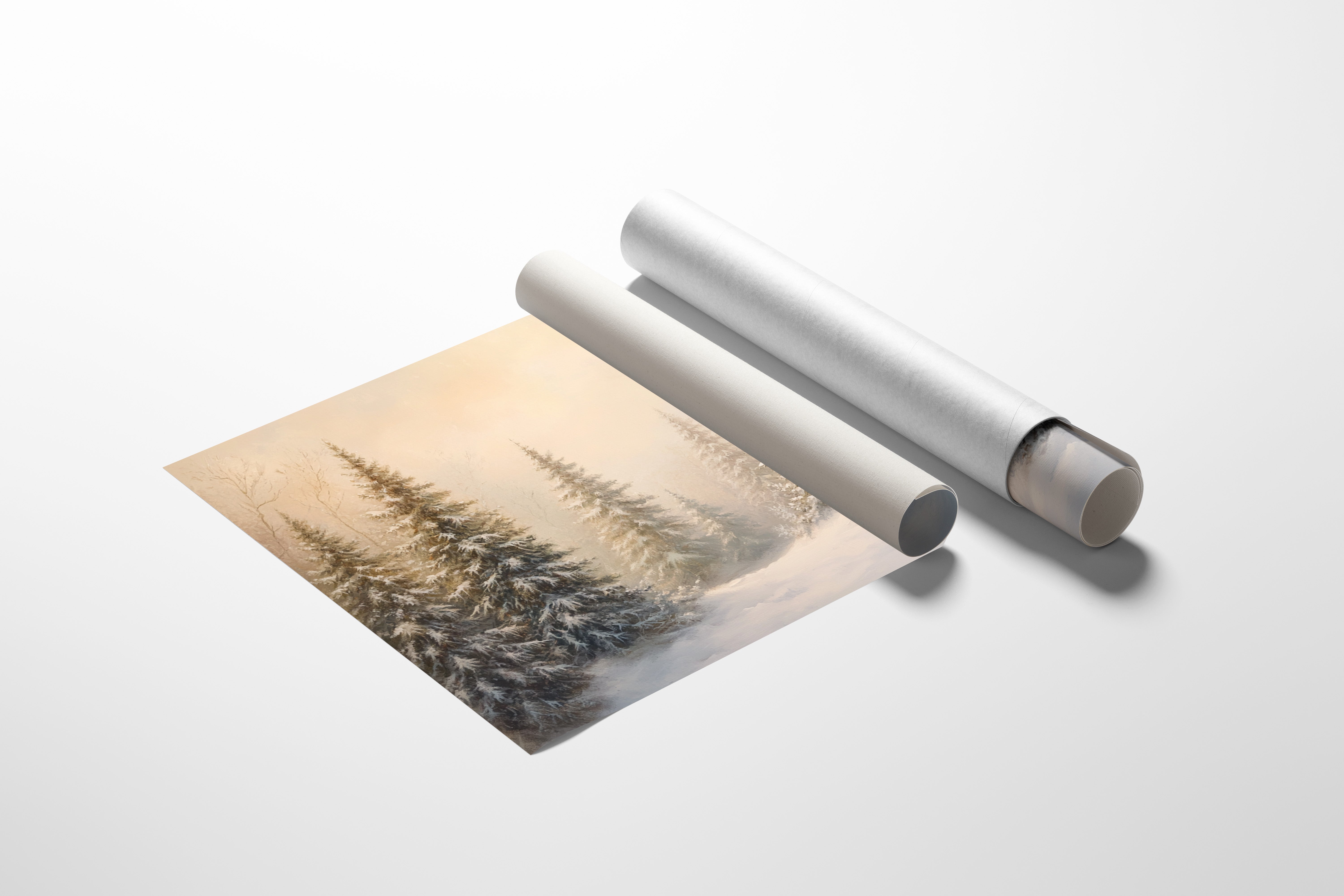 Dawn breaks through a crystalline veil, casting warm golden light across a snow-laden forest. Majestic evergreens stand sentinel, their branches heavy with fresh powder that transforms them into nature's ice sculptures. The scene captures that magical moment when winter sunlight filters through morning mist, creating an ethereal glow that softens the harsh winter landscape. Each pine needle and snow crystal seems to hold its own story, while drifts of untouched snow create gentle waves across the forest floor. This peaceful winter scene would bring serene natural beauty to a living room or bedroom, creating a window into a tranquil winter wonderland.