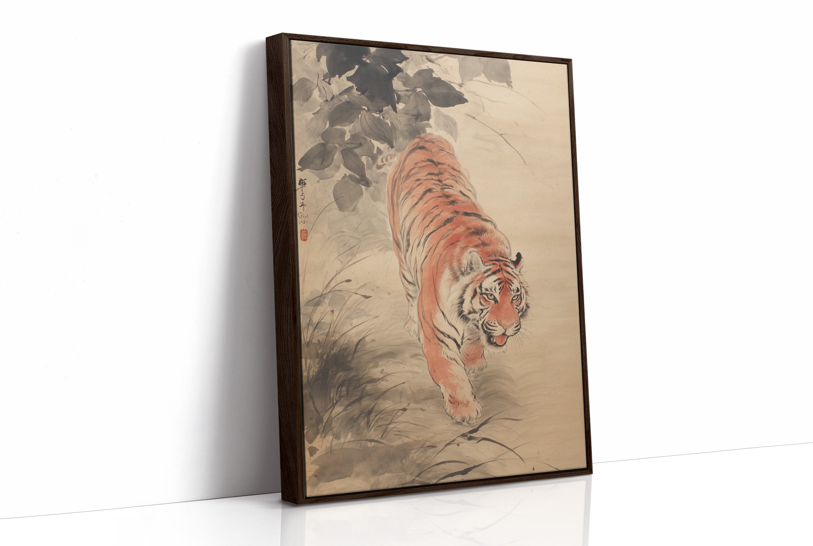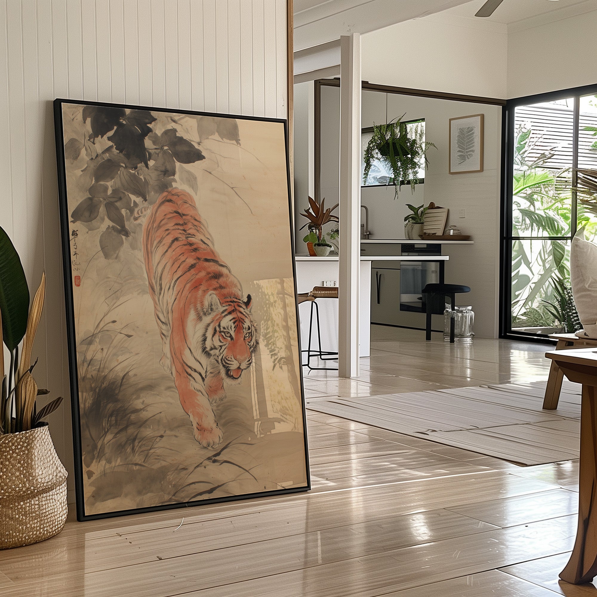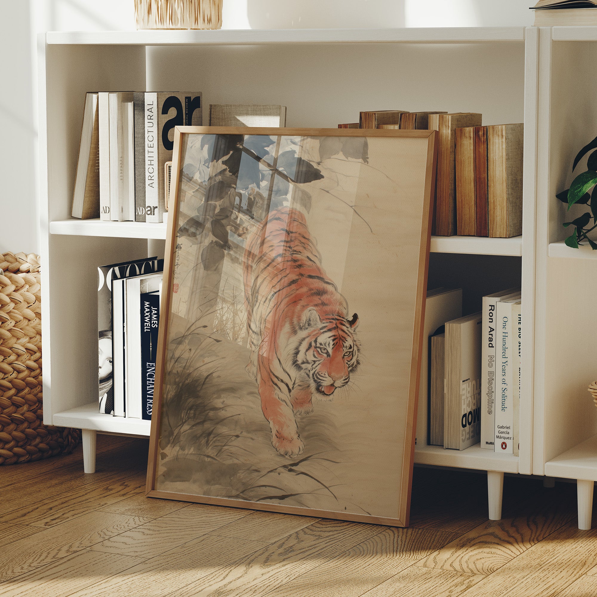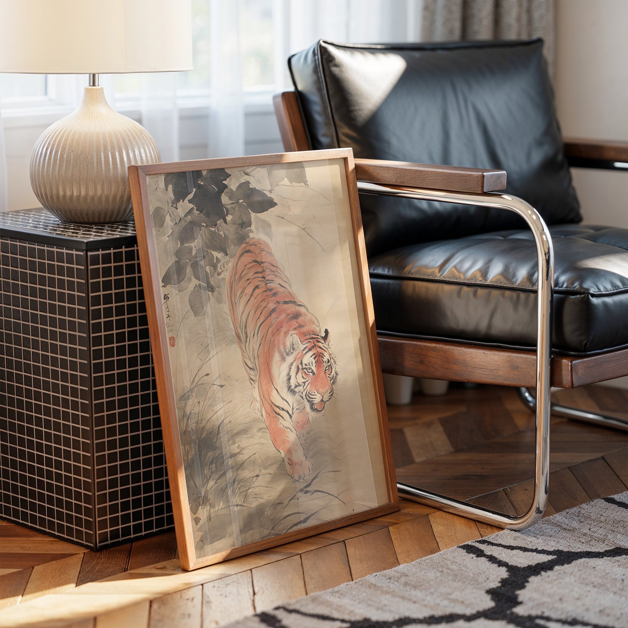 A traditional Asian watercolor captures the powerful grace of a tiger moving through tall grass. The orange and black stripes of the magnificent creature contrast beautifully against the soft, muted background, creating a striking balance between strength and serenity. The delicate brushstrokes bring life to every detail - from the tiger's muscular form to the gentle sway of bamboo leaves in an unseen breeze. This piece would create a sophisticated focal point in a study or living room, bringing both cultural richness and natural majesty to the space.