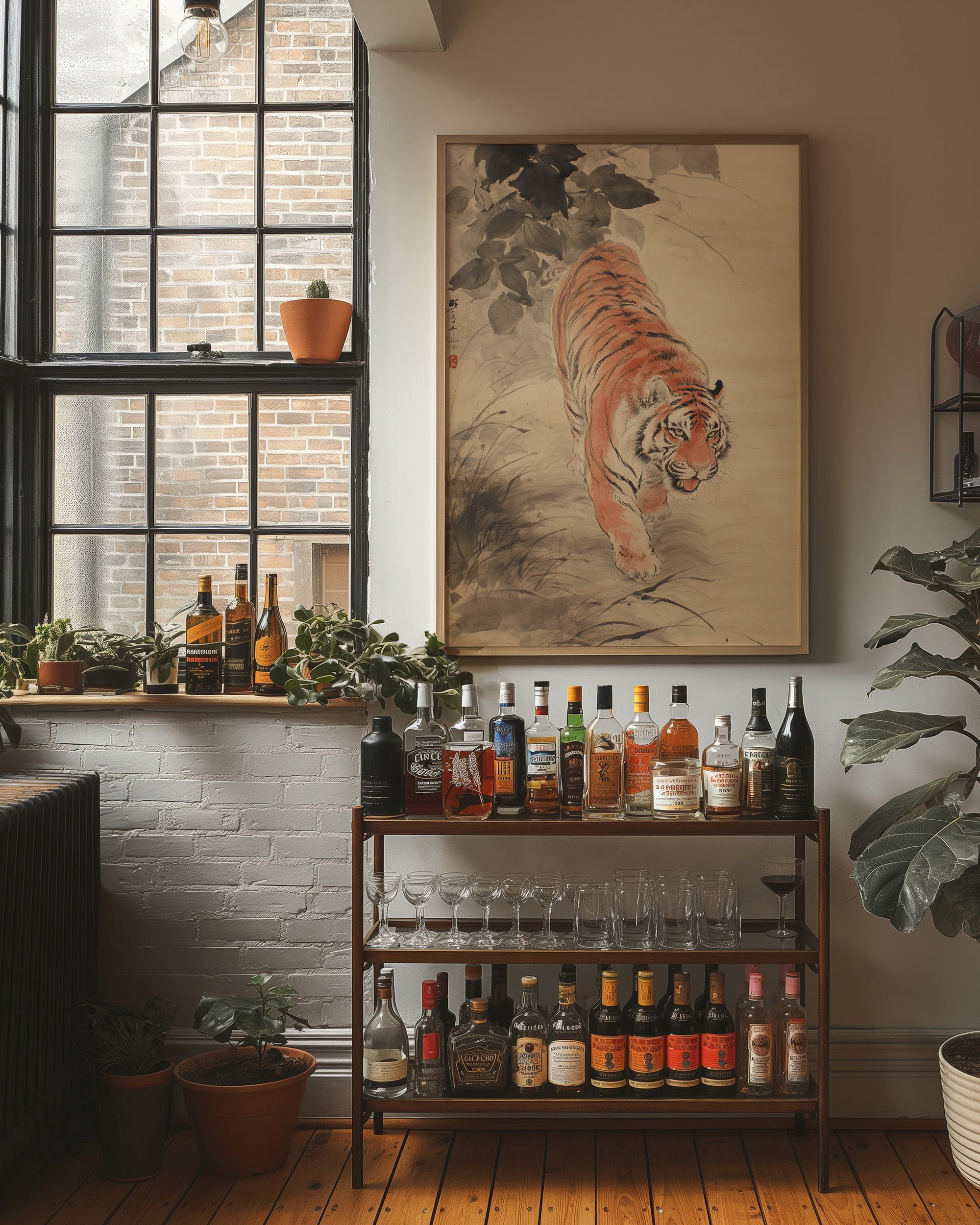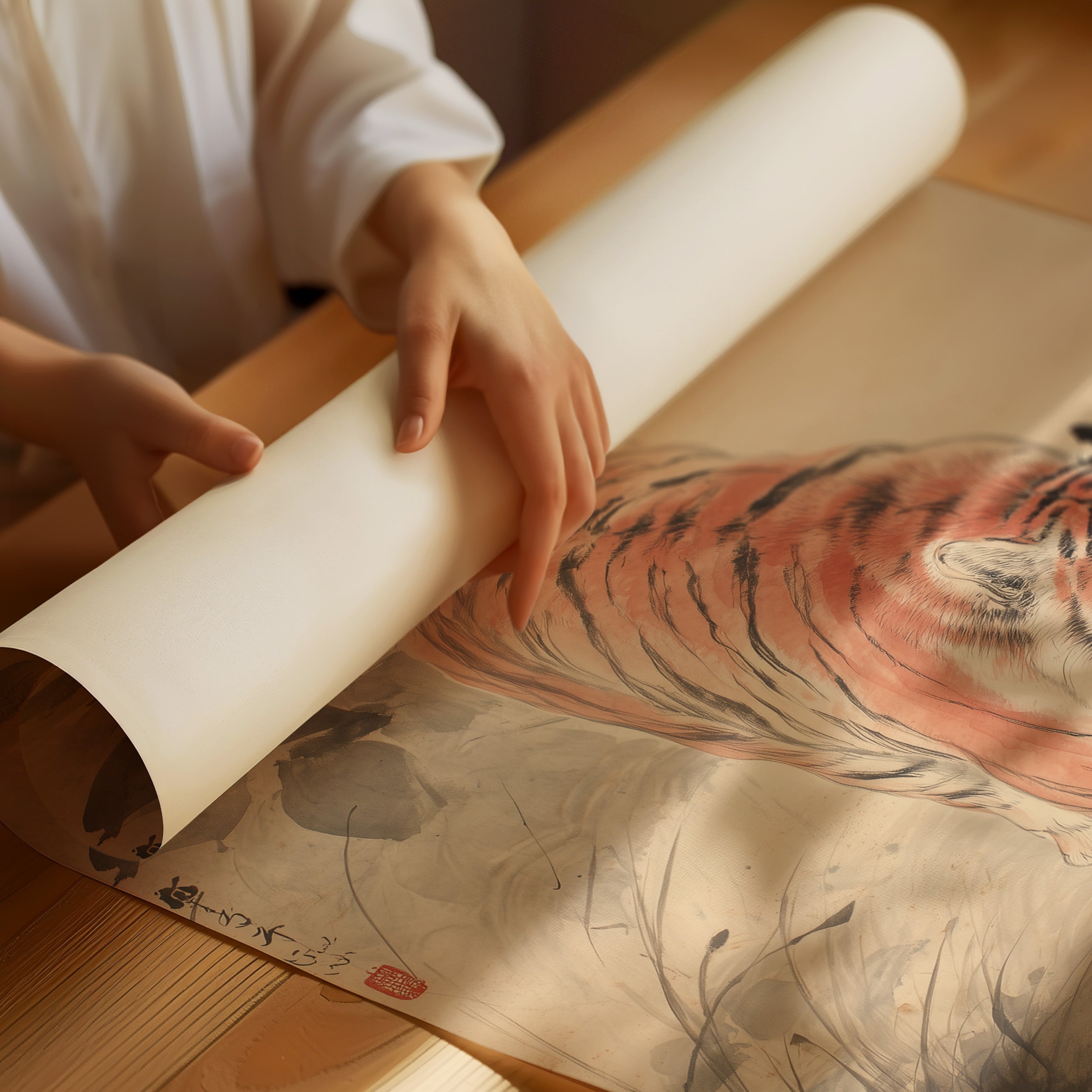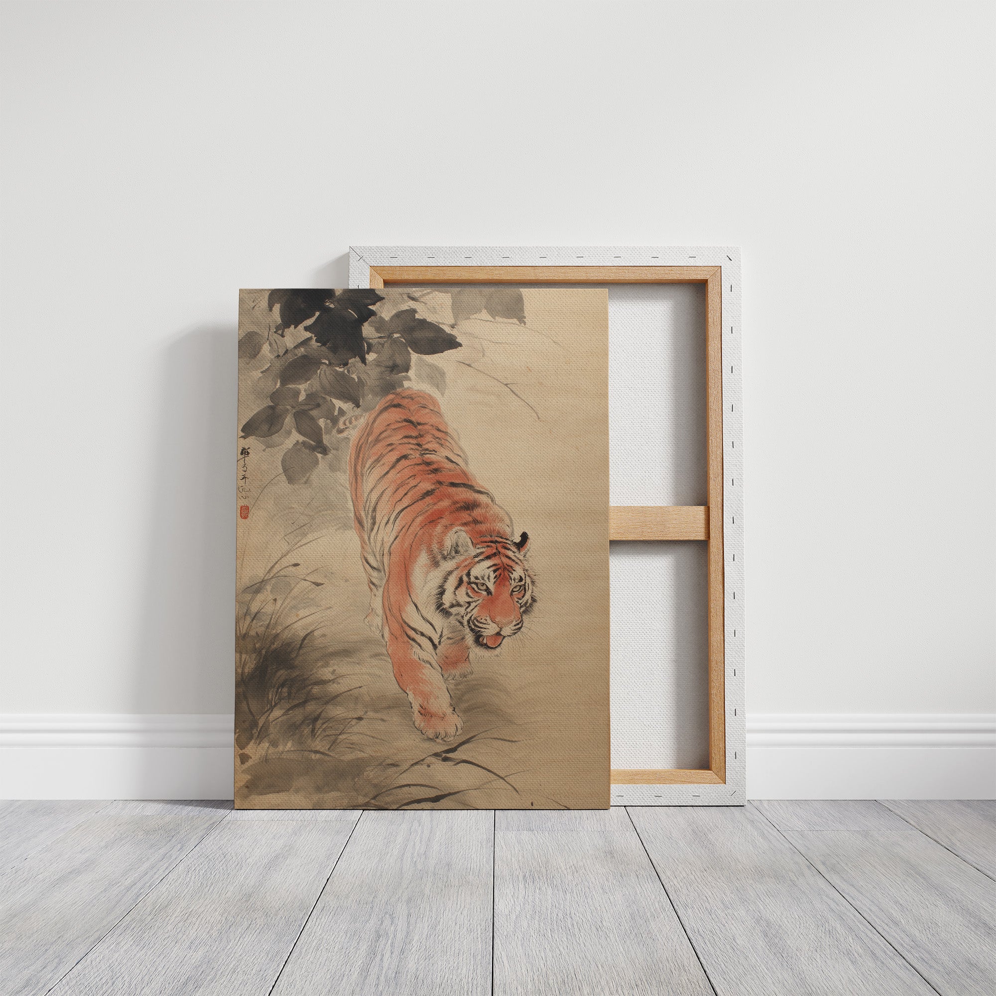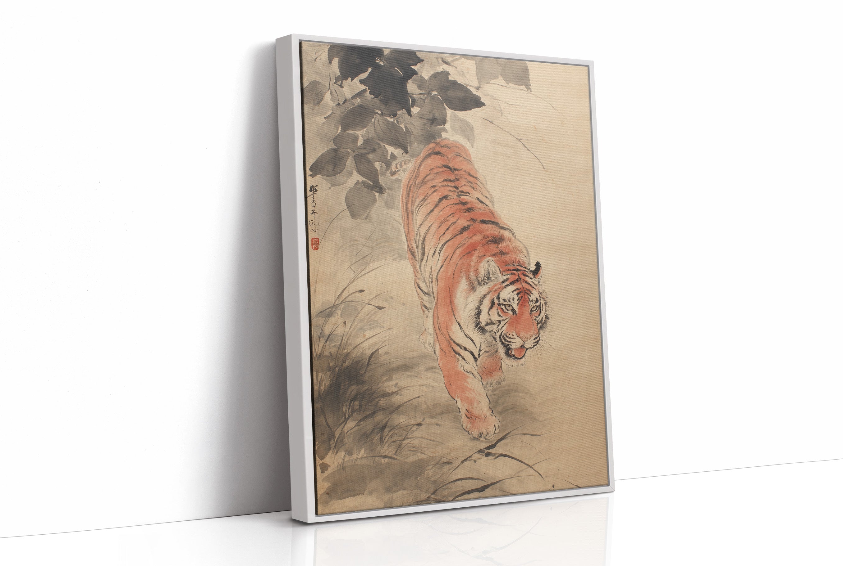 A traditional Asian watercolor captures the powerful grace of a tiger moving through tall grass. The orange and black stripes of the magnificent creature contrast beautifully against the soft, muted background, creating a striking balance between strength and serenity. The delicate brushstrokes bring life to every detail - from the tiger's muscular form to the gentle sway of bamboo leaves in an unseen breeze. This piece would create a sophisticated focal point in a study or living room, bringing both cultural richness and natural majesty to the space.