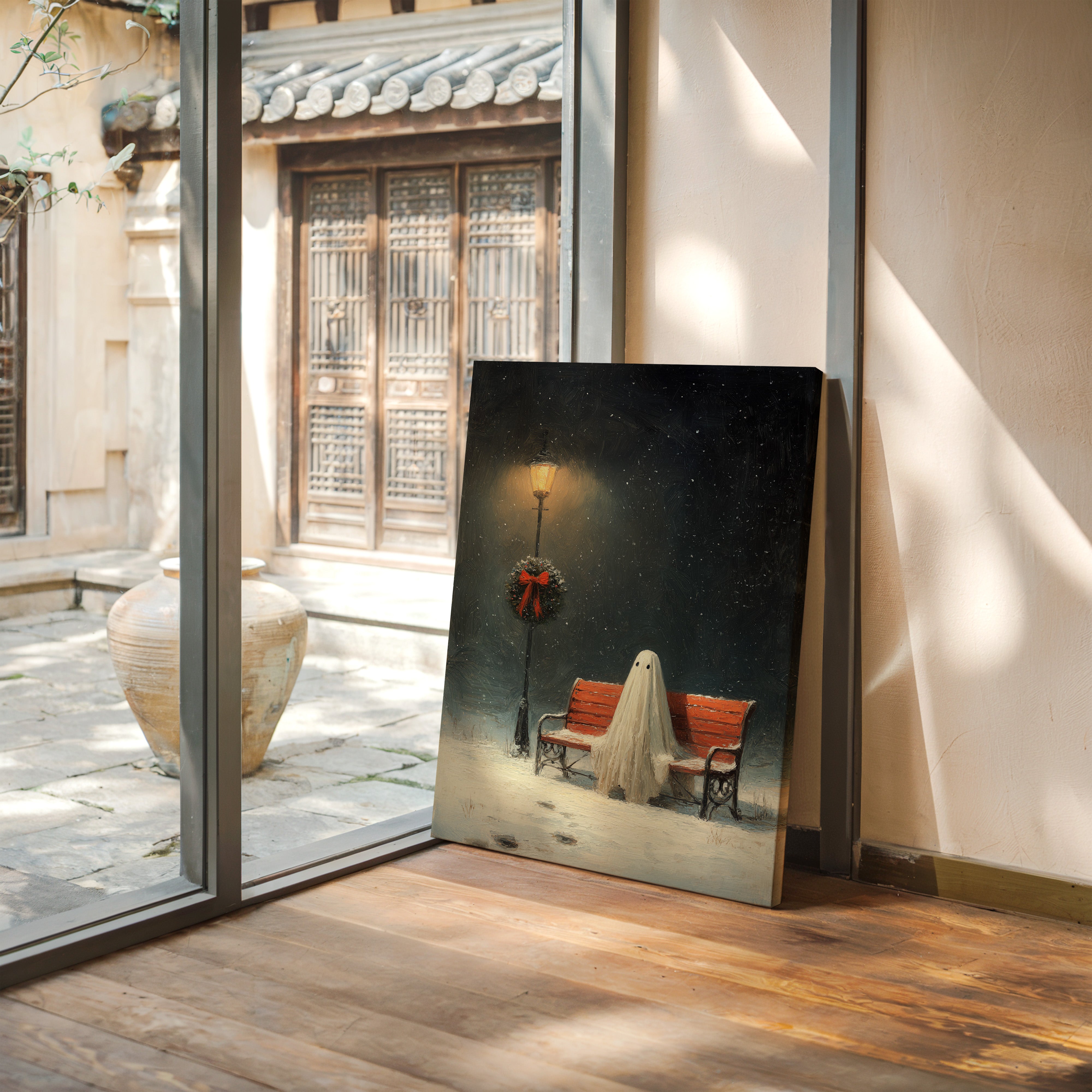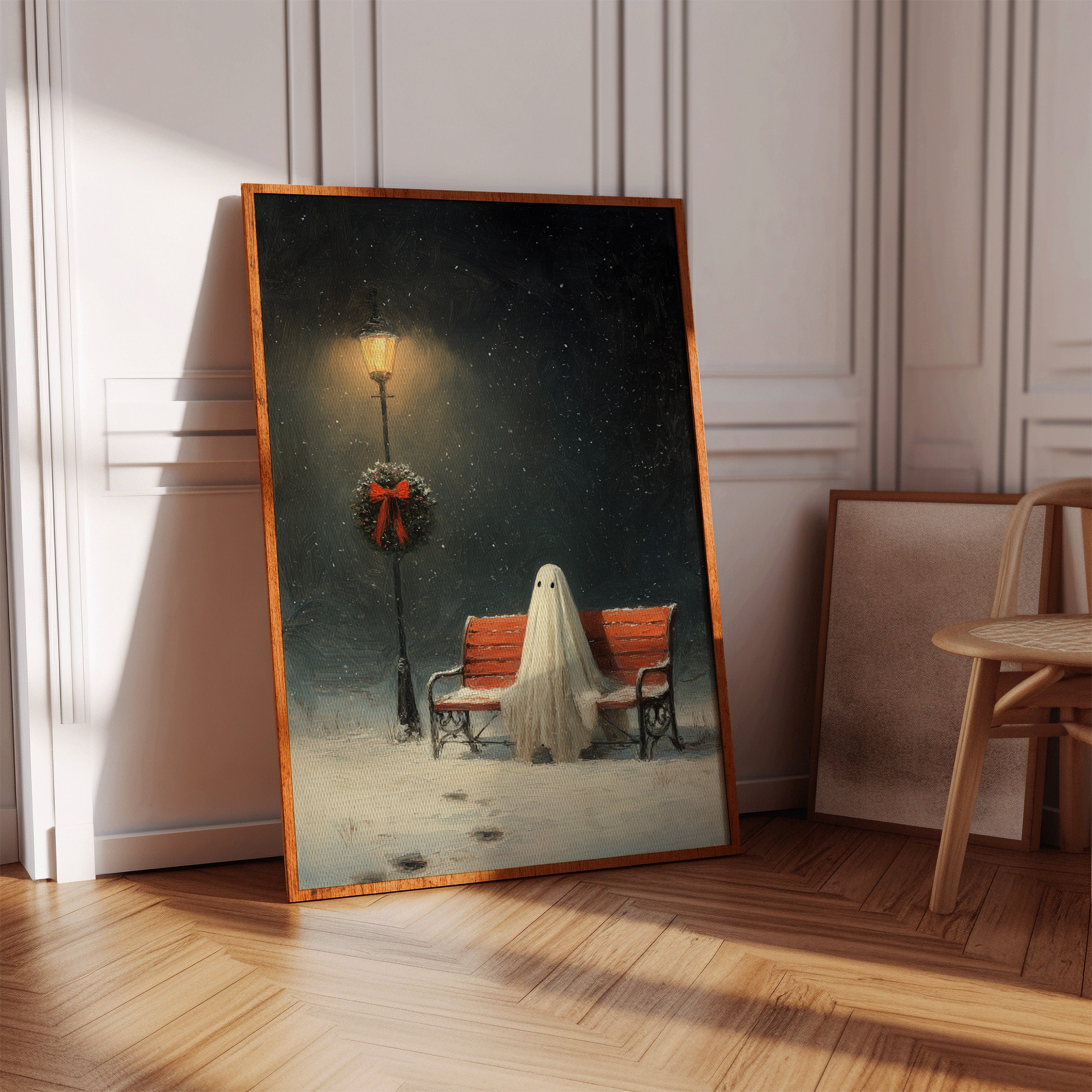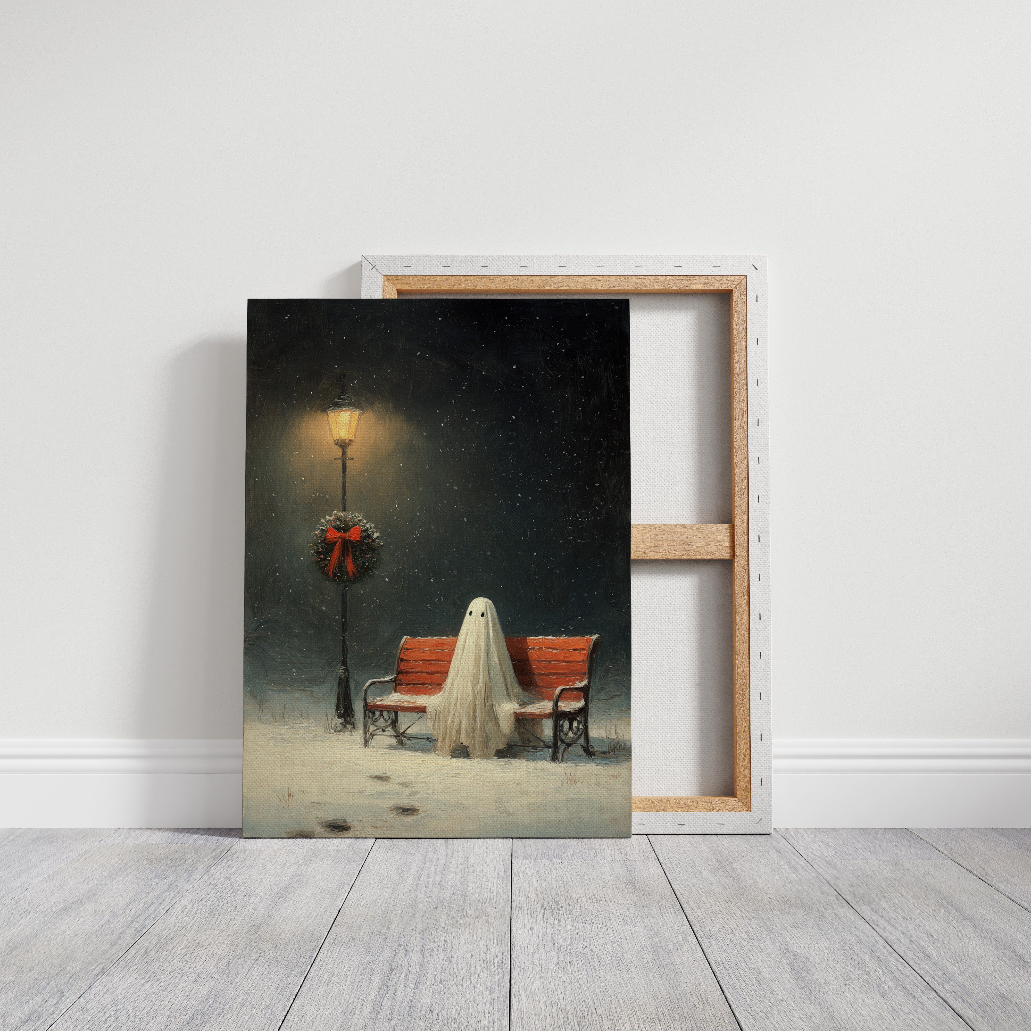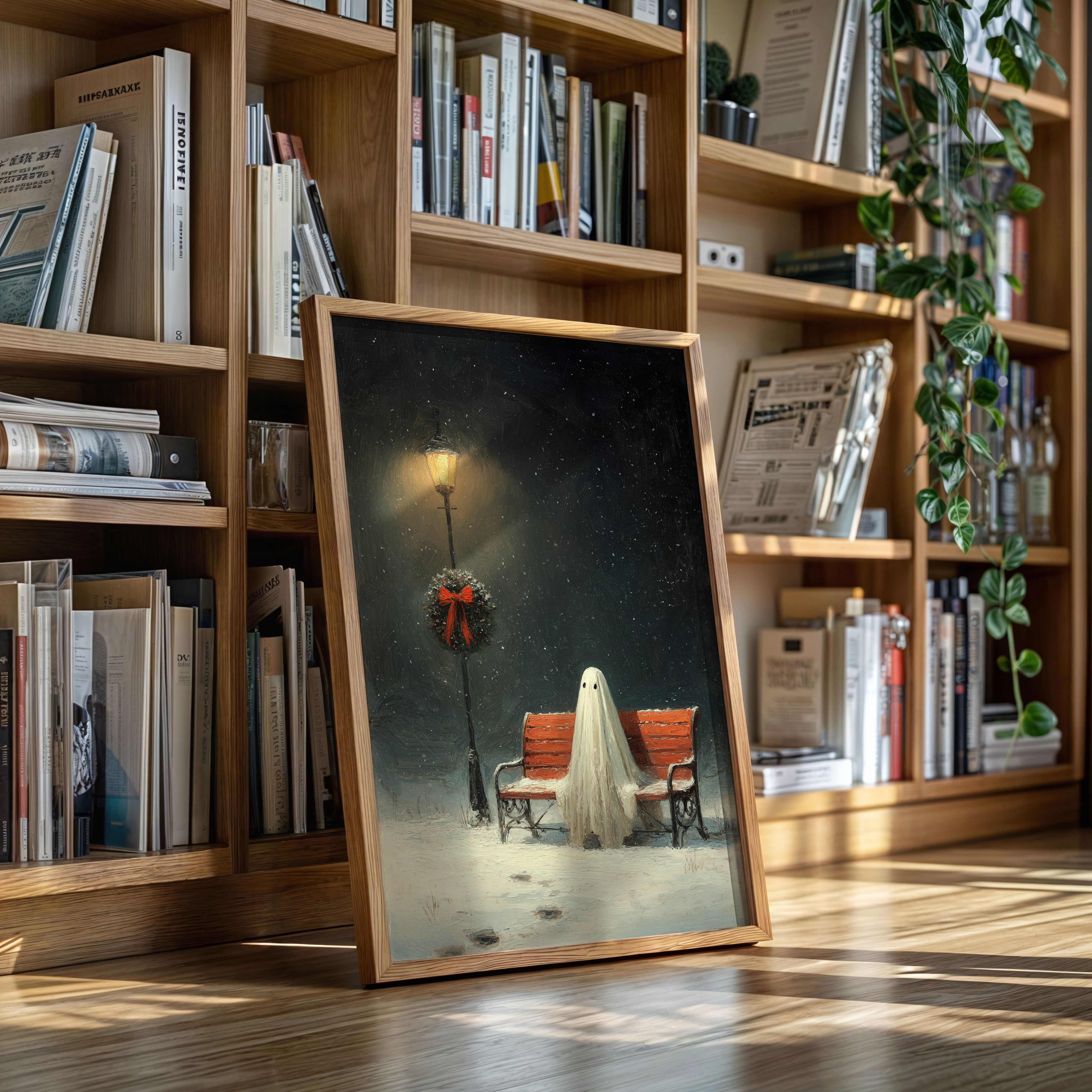 In the stillness of a snowy evening, a ghostly figure sits patiently on a weathered bench, enveloped in the soft glow of a flickering streetlamp. This piece captures the heart of the Artisanal collection, marrying whimsy with a touch of nostalgia. The delicate textures of the ghost's draping form contrast with the vibrant red of the wreath, while snowflakes dance in the twilight, creating a world where the past and present intertwine. Ideal for a cozy reading nook or a whimsical living space, this artwork invites contemplation and warmth.