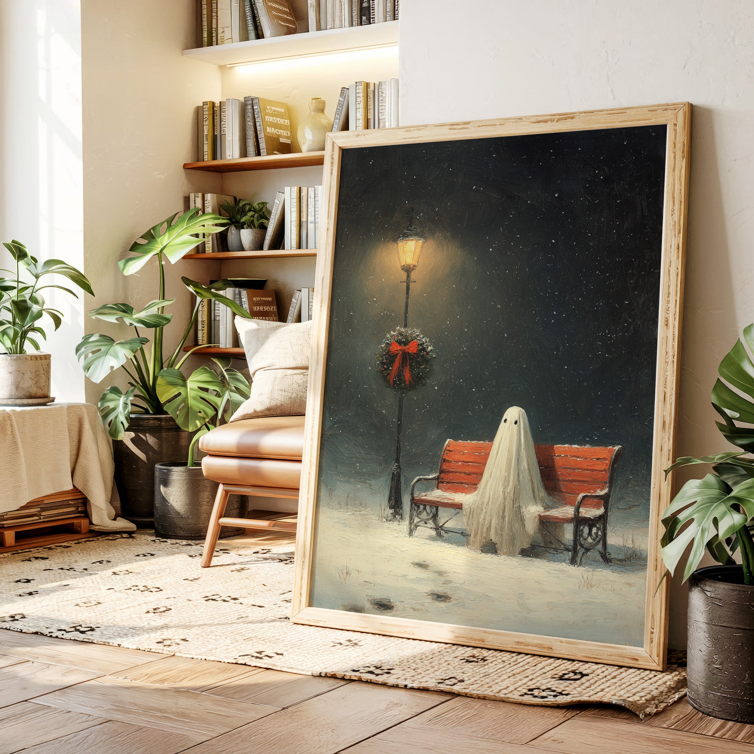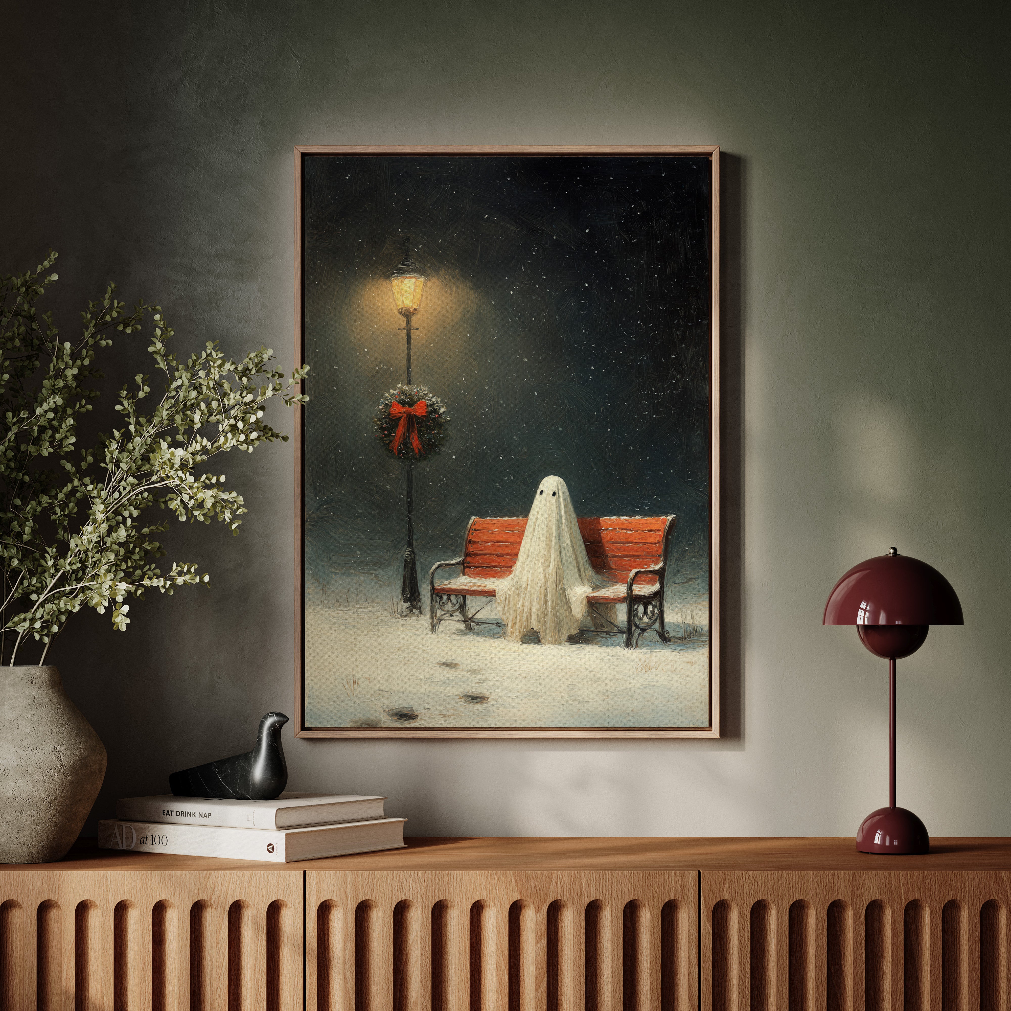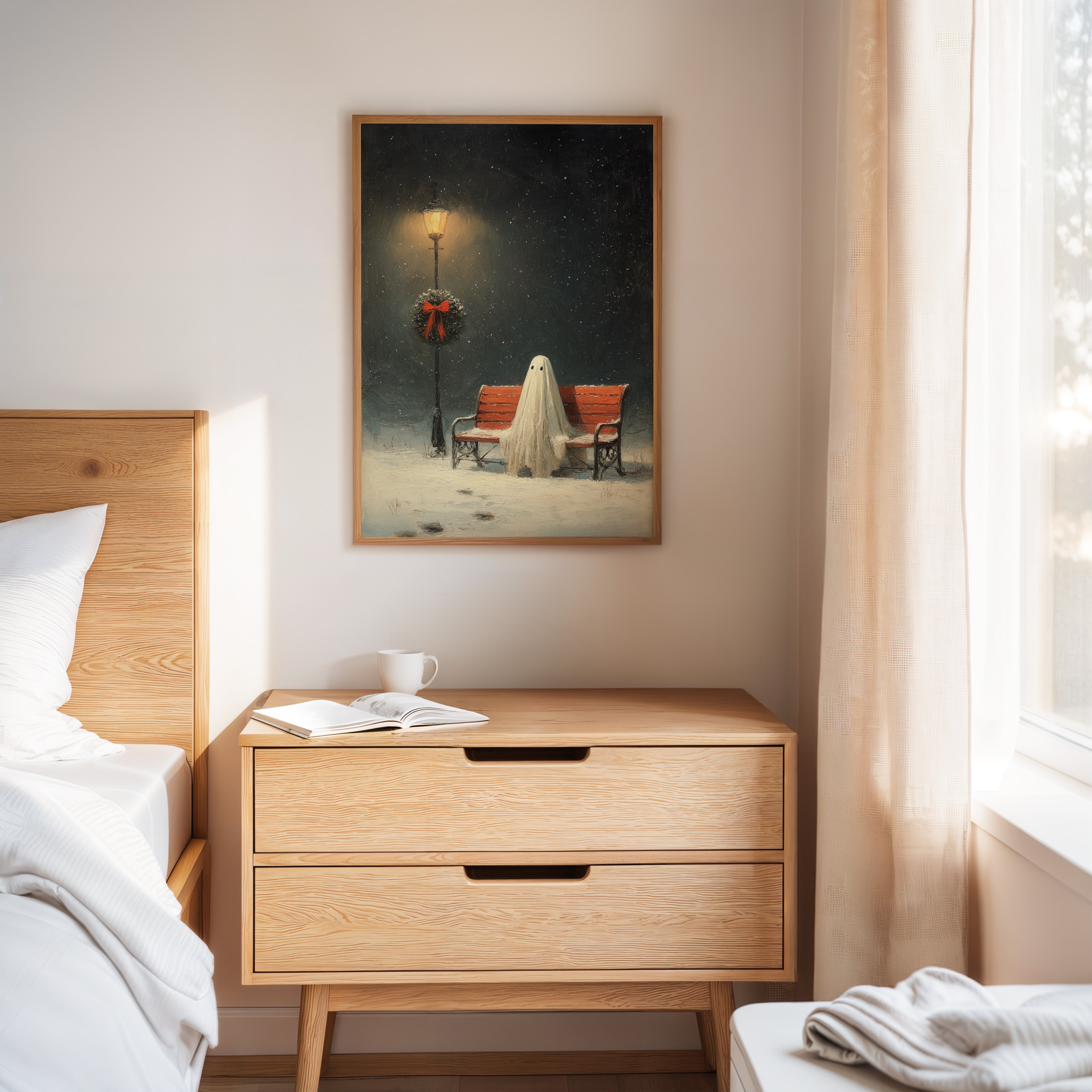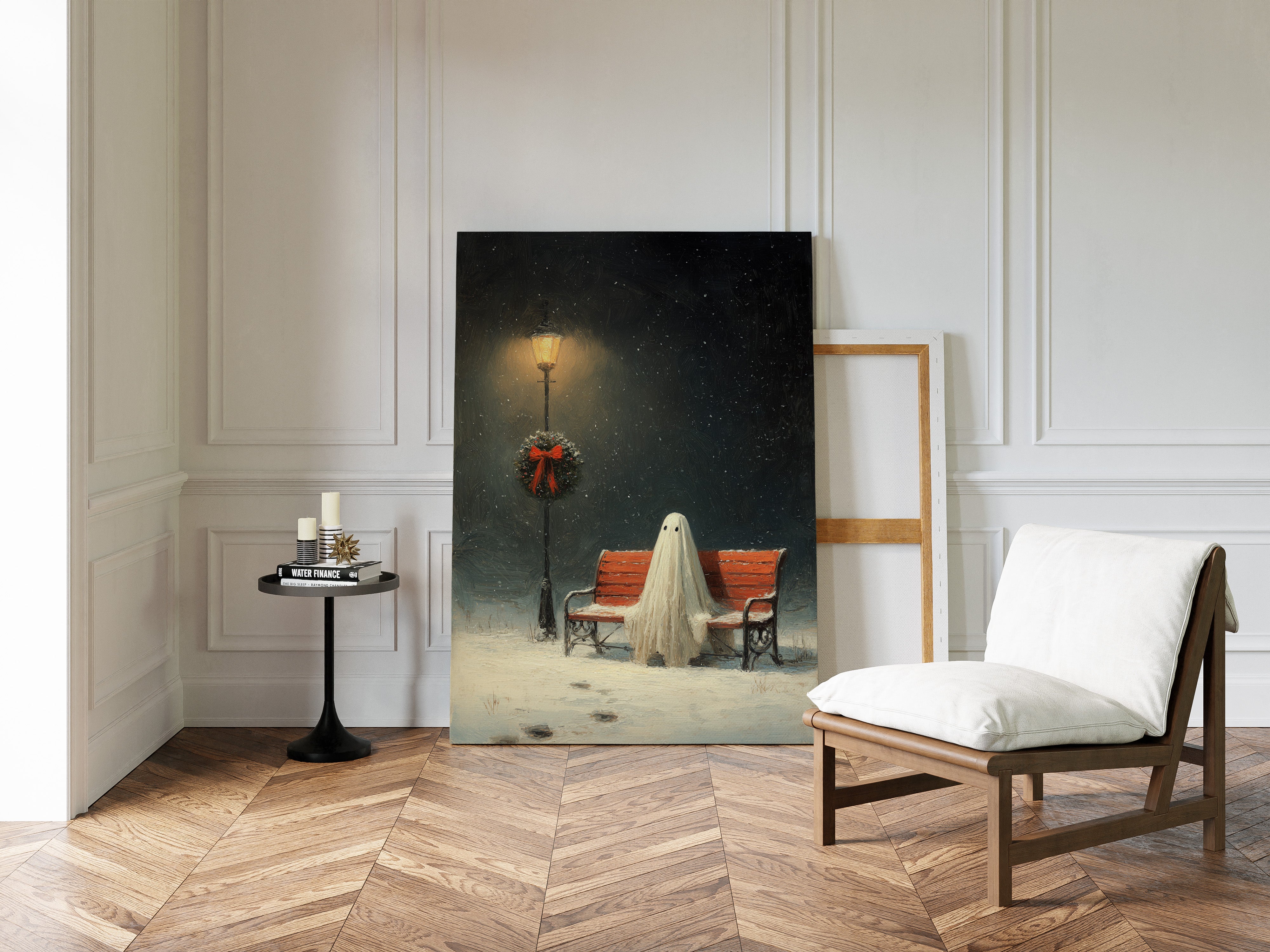 In the stillness of a snowy evening, a ghostly figure sits patiently on a weathered bench, enveloped in the soft glow of a flickering streetlamp. This piece captures the heart of the Artisanal collection, marrying whimsy with a touch of nostalgia. The delicate textures of the ghost's draping form contrast with the vibrant red of the wreath, while snowflakes dance in the twilight, creating a world where the past and present intertwine. Ideal for a cozy reading nook or a whimsical living space, this artwork invites contemplation and warmth.