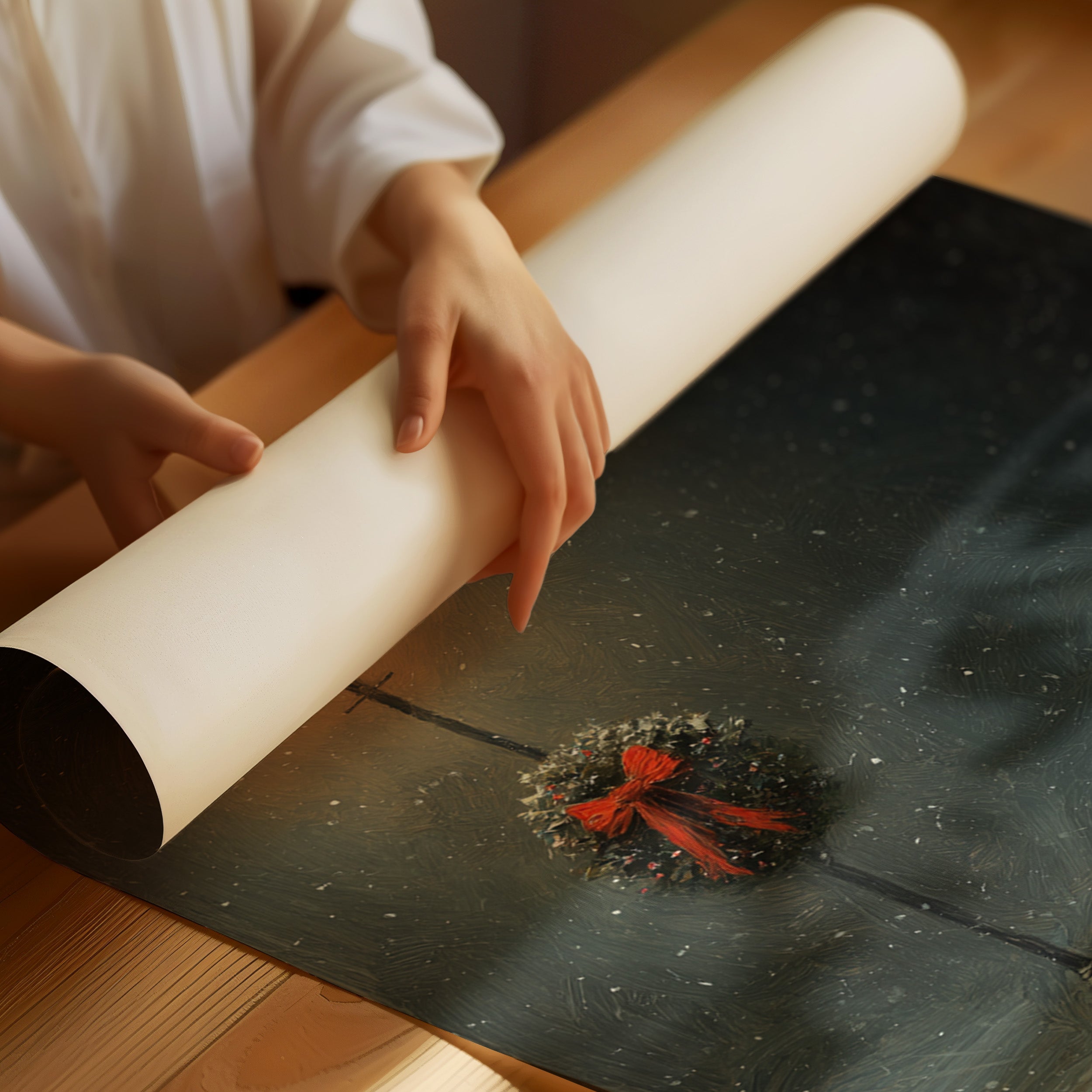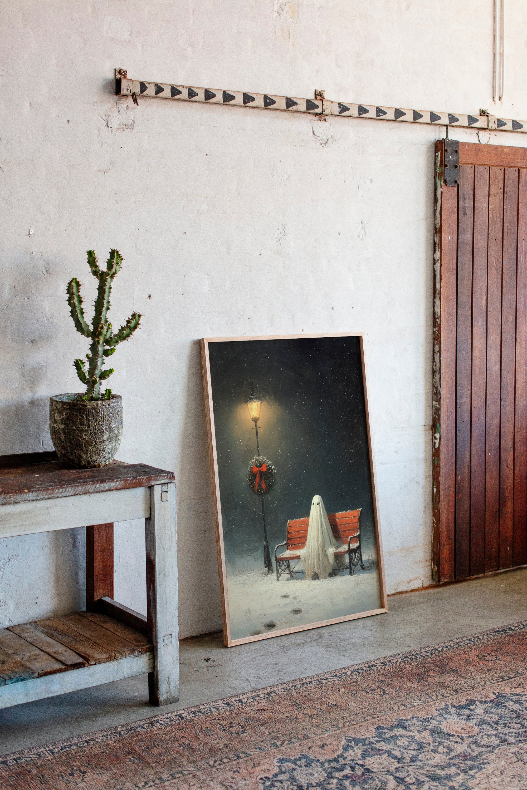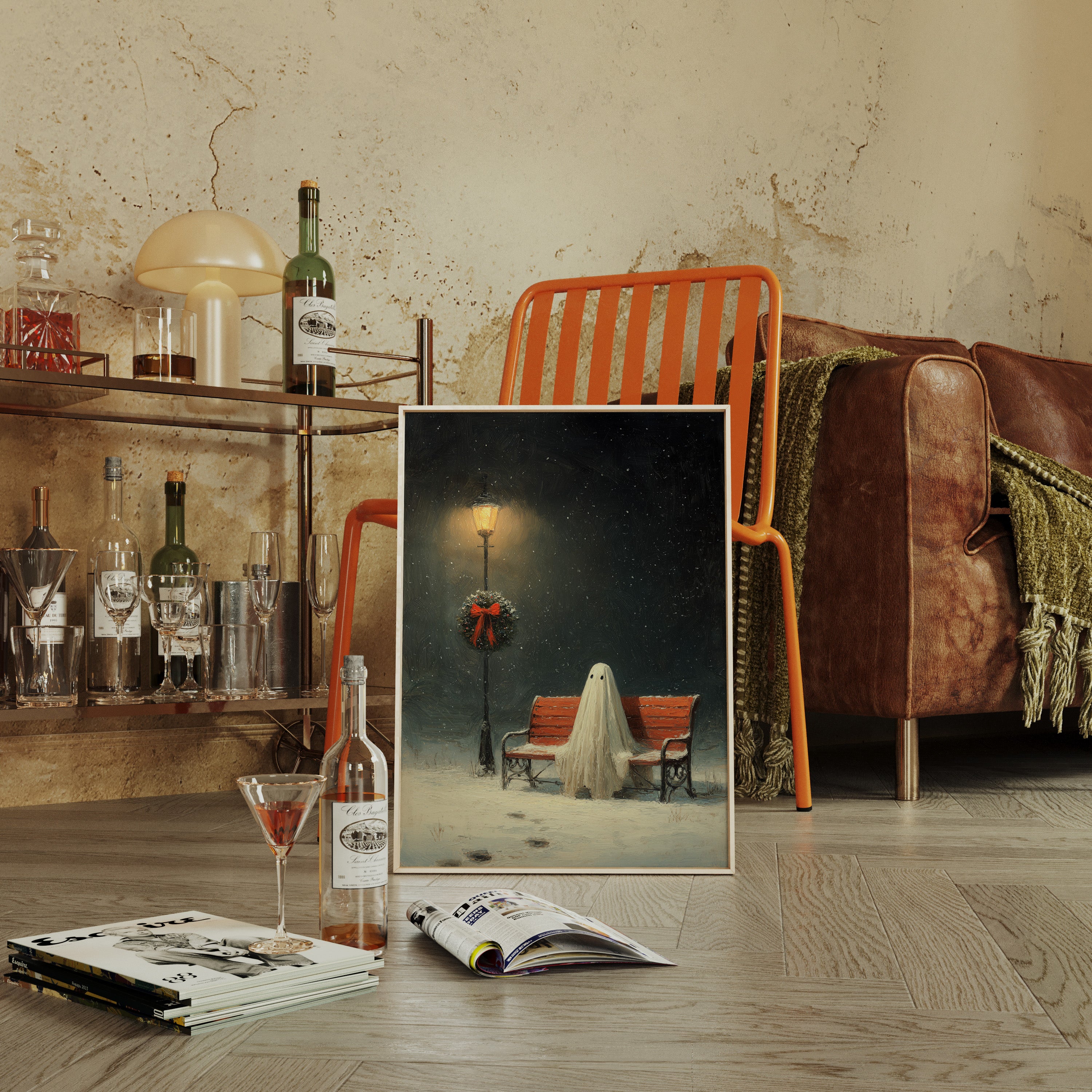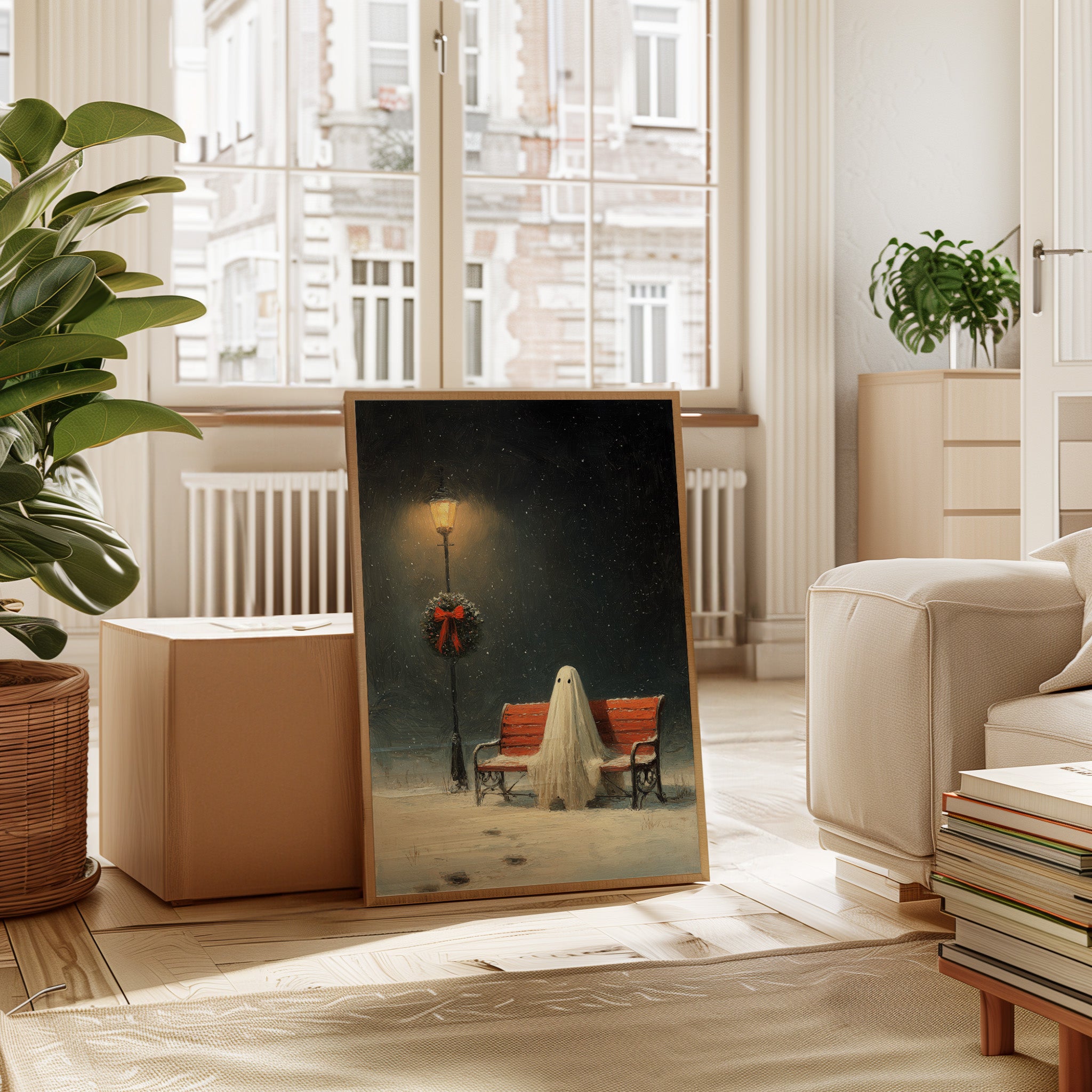 In the stillness of a snowy evening, a ghostly figure sits patiently on a weathered bench, enveloped in the soft glow of a flickering streetlamp. This piece captures the heart of the Artisanal collection, marrying whimsy with a touch of nostalgia. The delicate textures of the ghost's draping form contrast with the vibrant red of the wreath, while snowflakes dance in the twilight, creating a world where the past and present intertwine. Ideal for a cozy reading nook or a whimsical living space, this artwork invites contemplation and warmth.