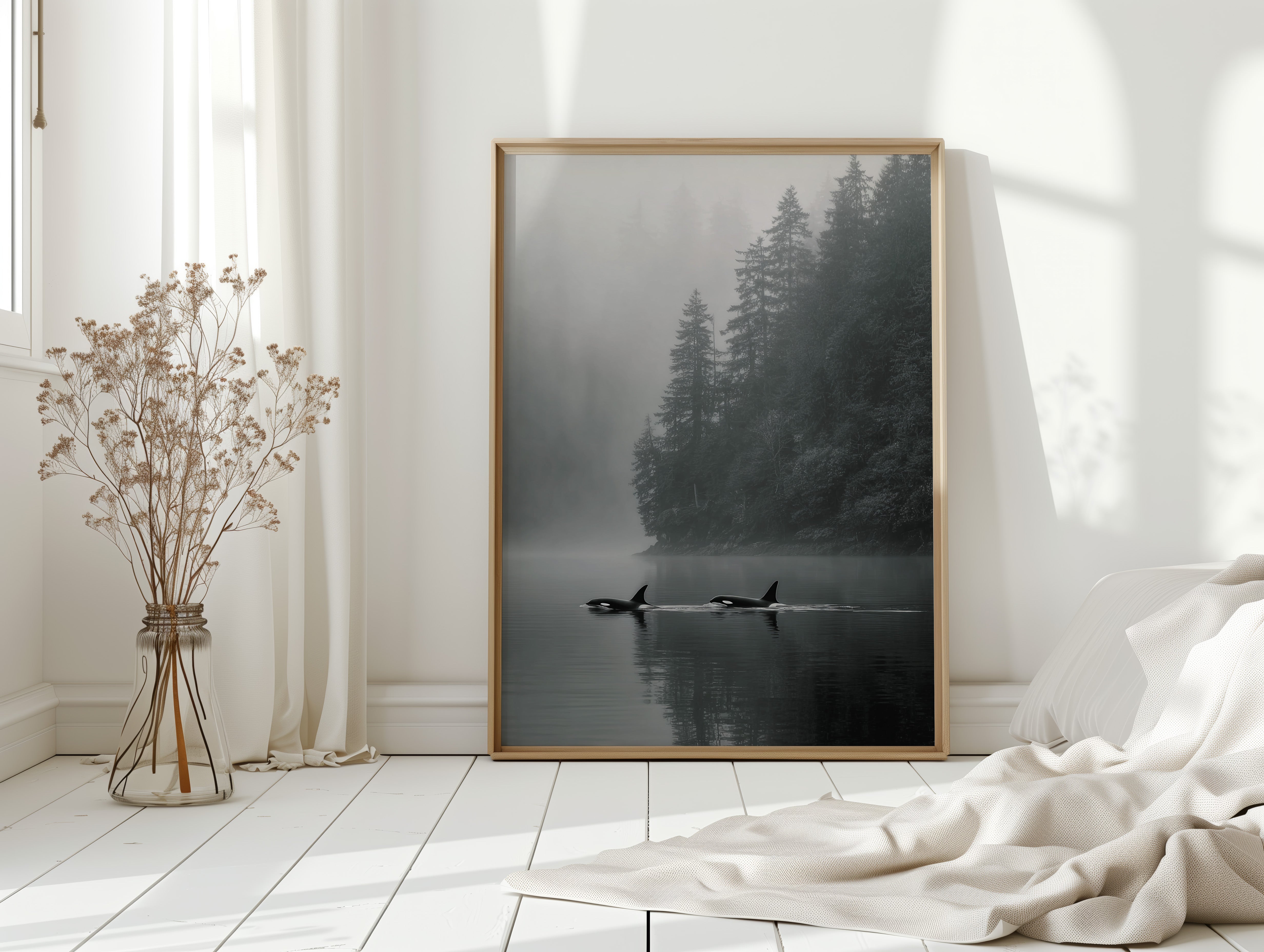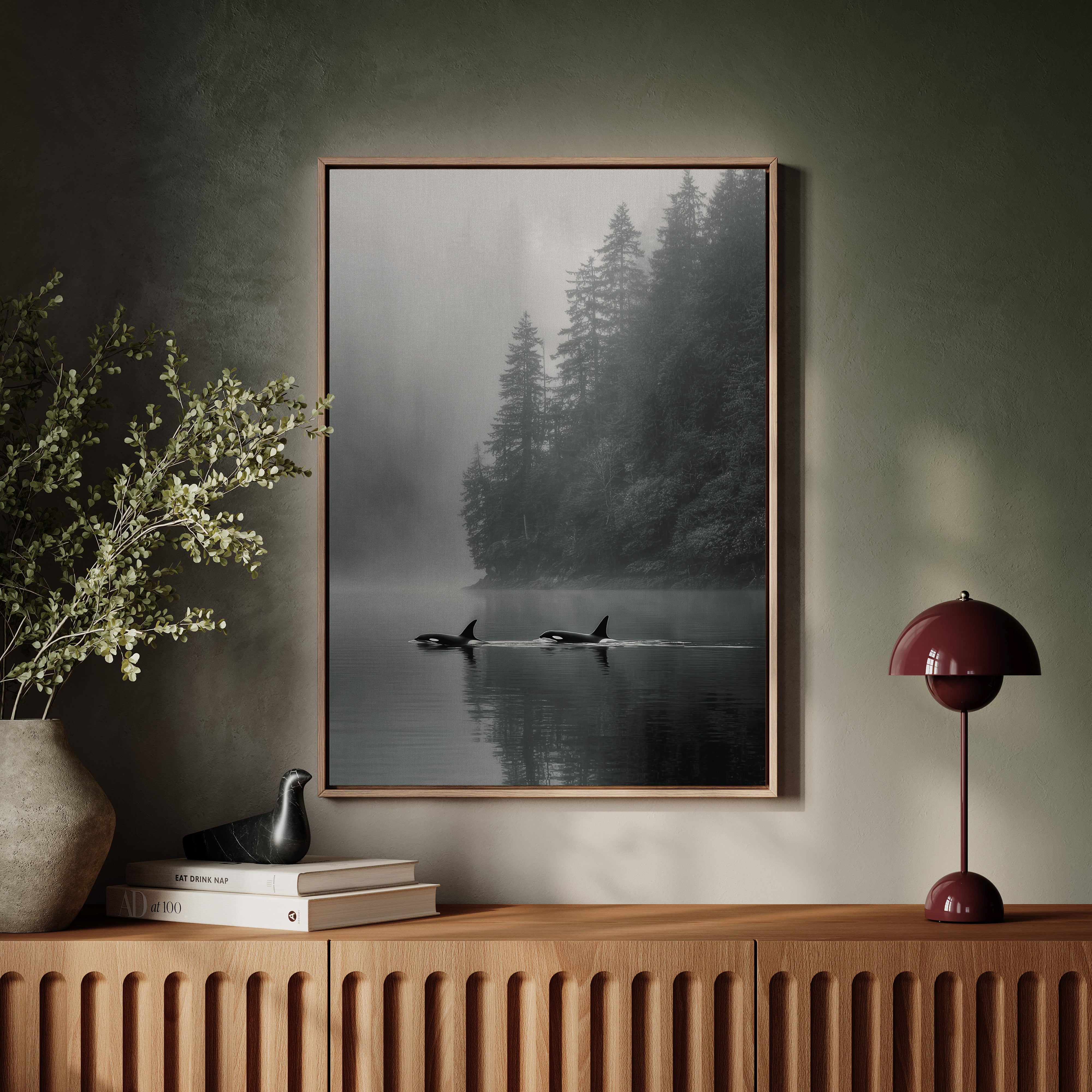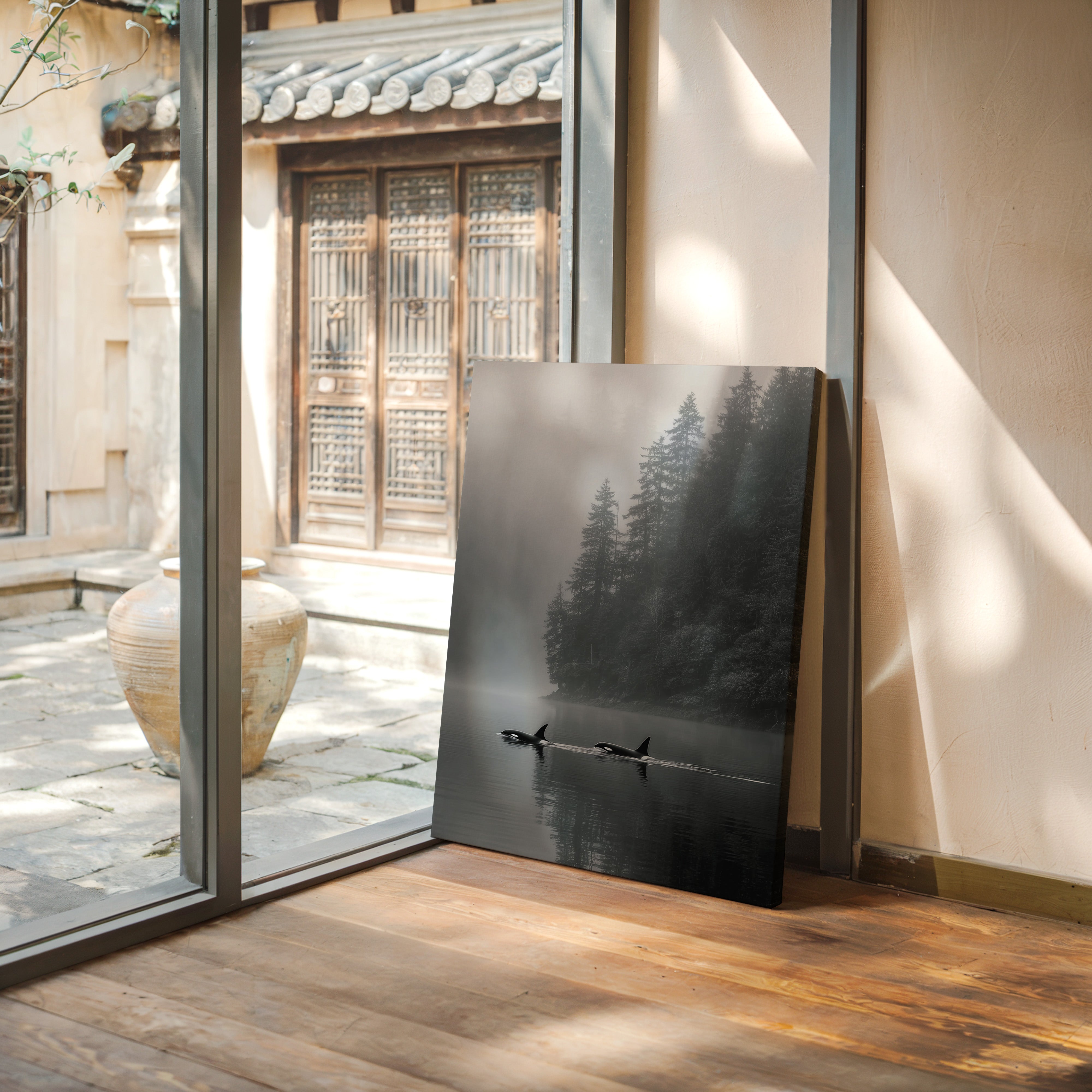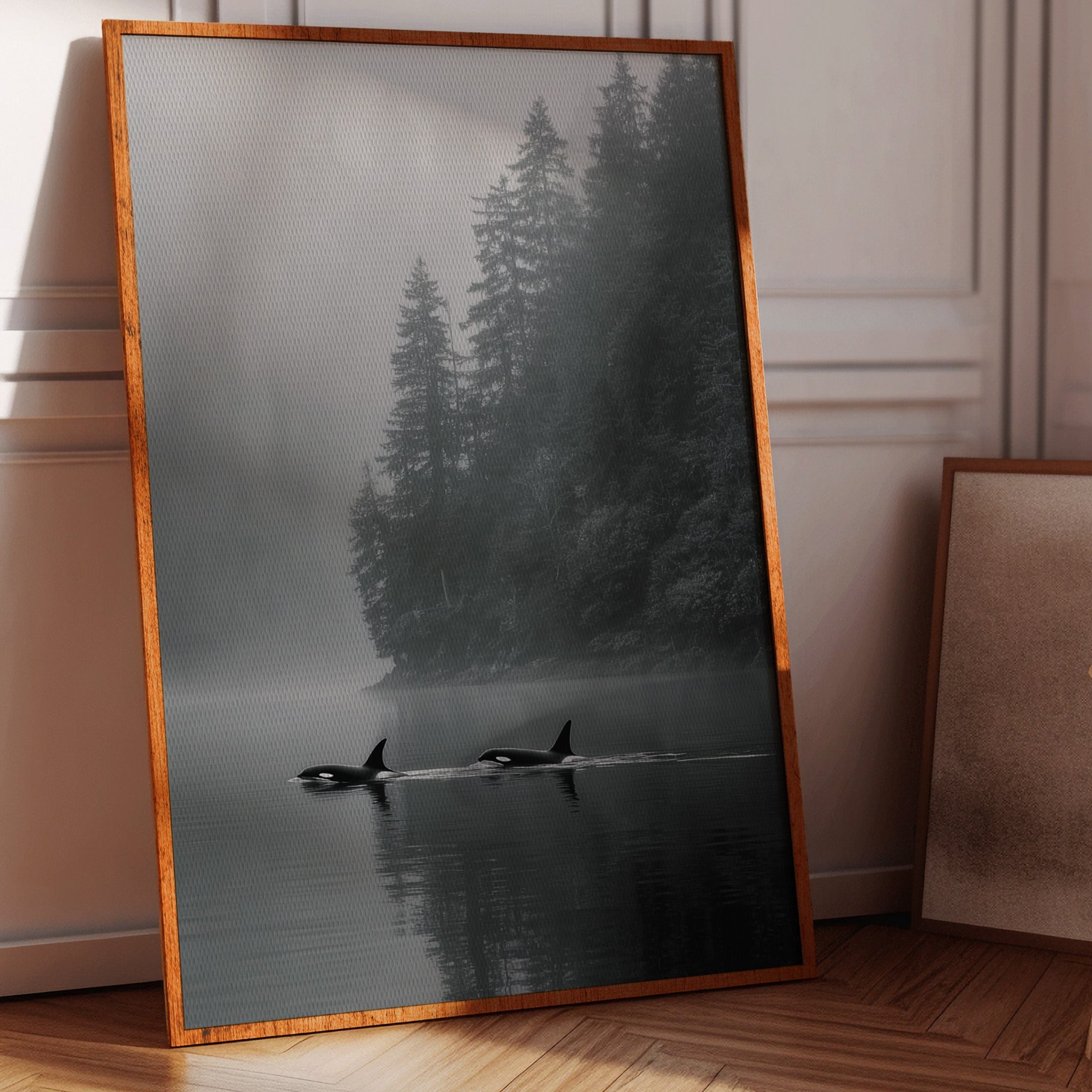 In the stillness of dawn, two orcas glide through a curtain of fog, their graceful movements weaving stories into the cool, reflective waters. This piece draws inspiration from the beauty of nature's quiet moments, capturing the essence of the artisanal spirit. The monochrome palette enhances the mystery, with soft greys and deep blacks that evoke a sense of serene isolation, inviting viewers to reflect on their own journeys through the mist of life. Ideal for a tranquil space, this piece complements serene bedrooms or calming reading nooks, where reflection and peace reign.