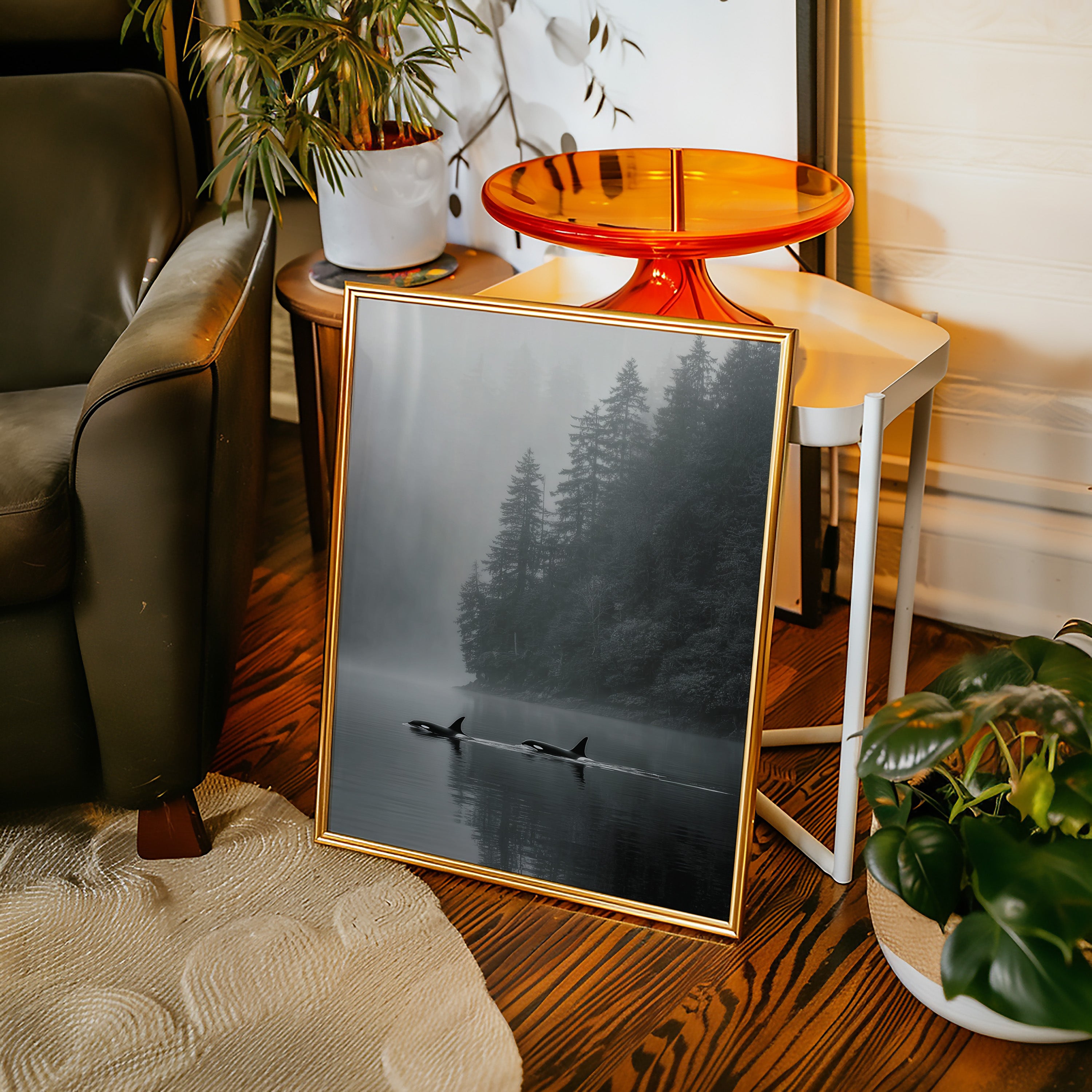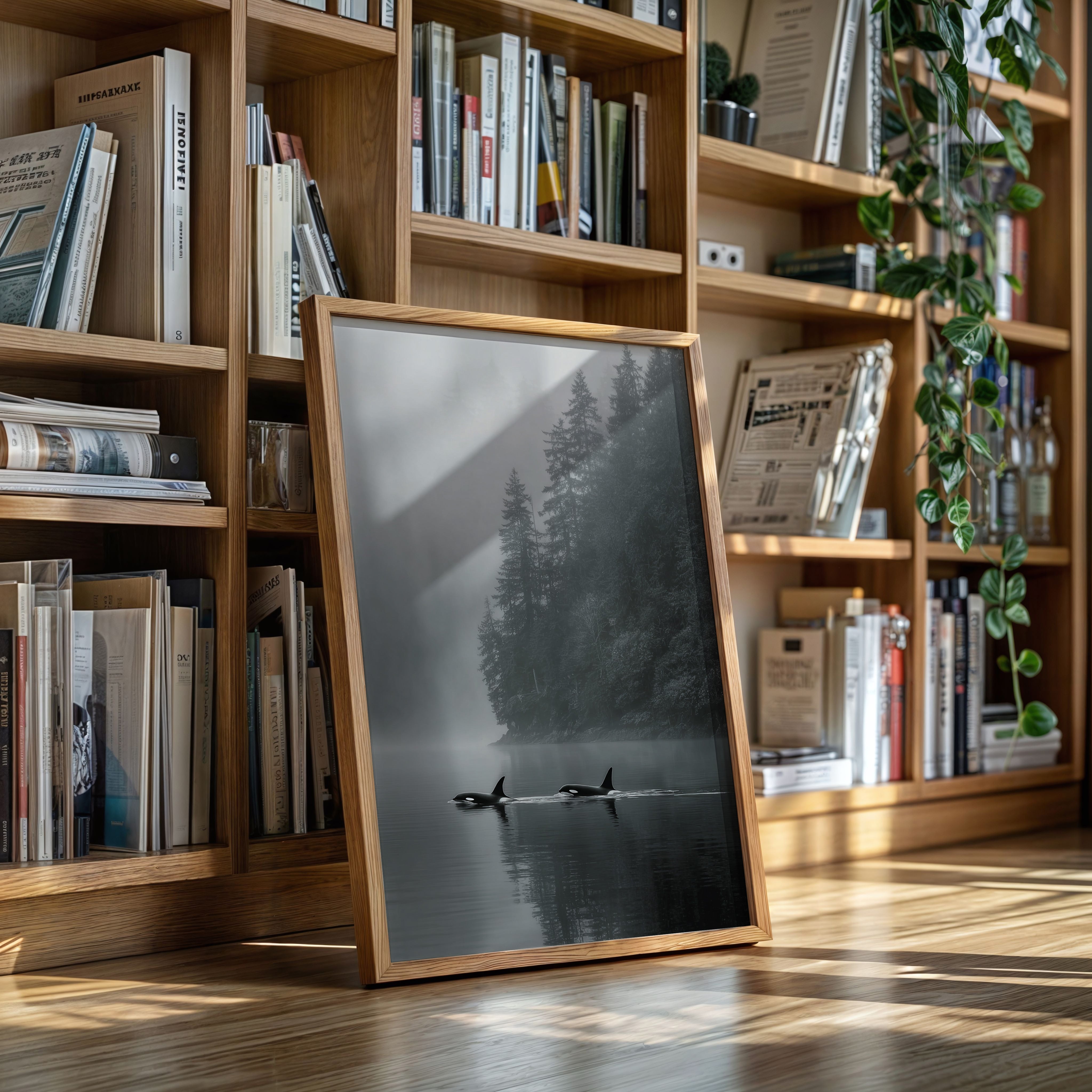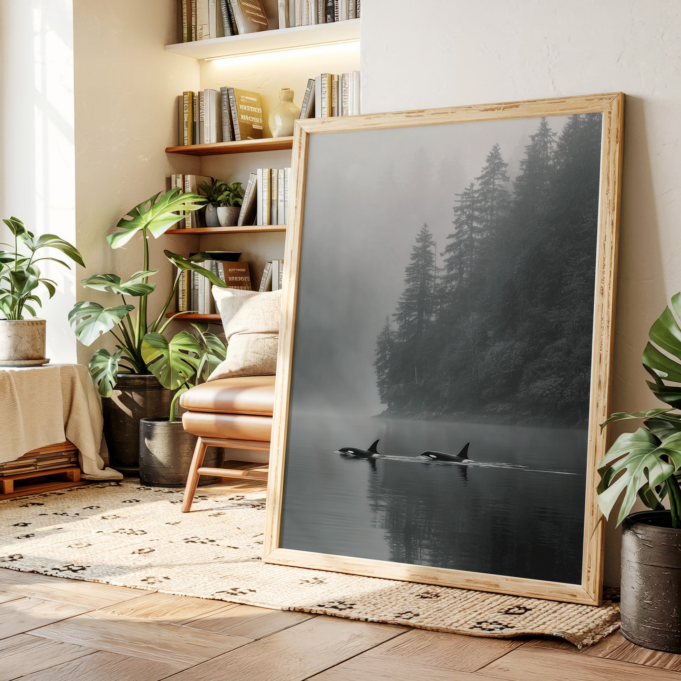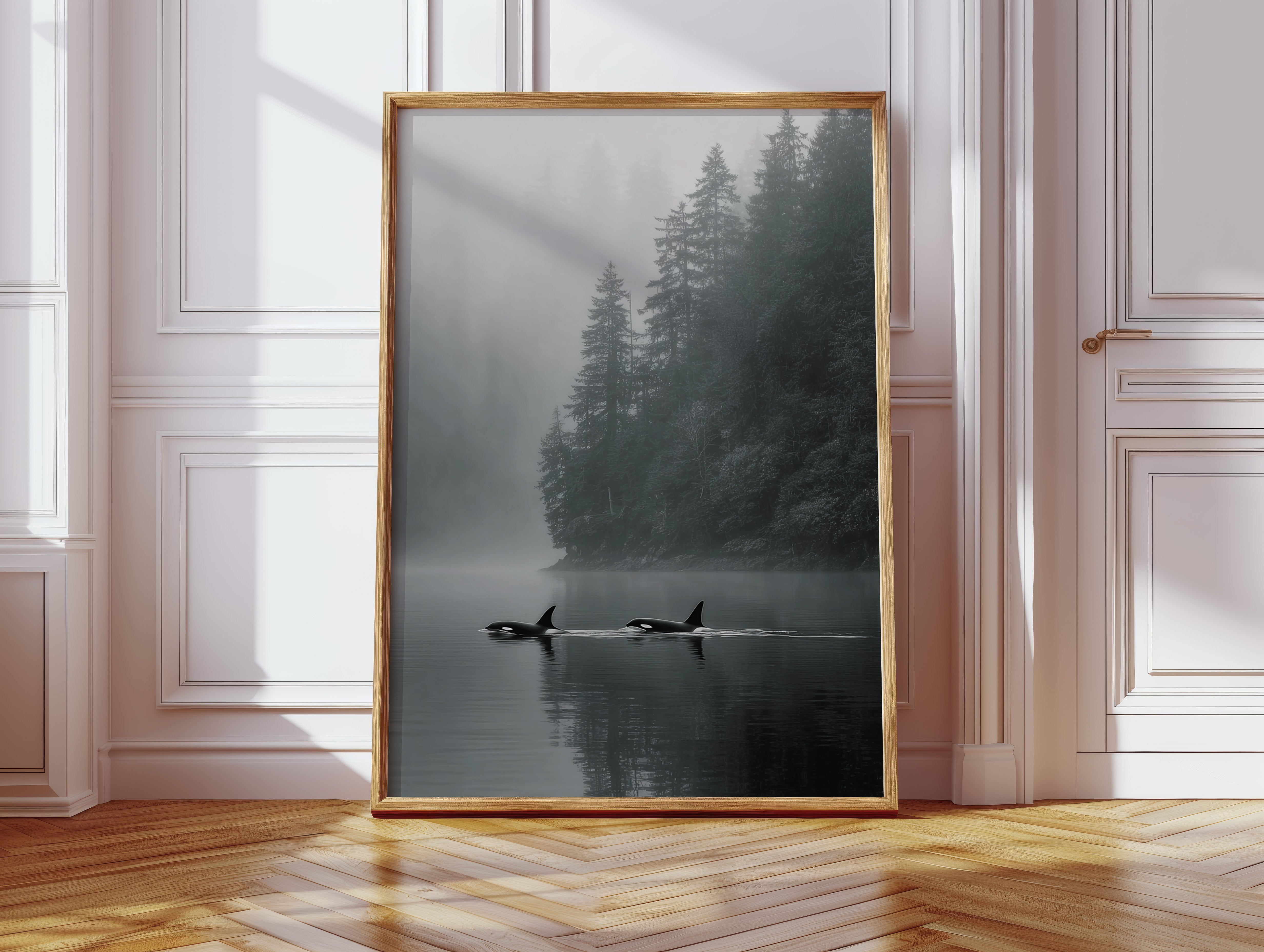 In the stillness of dawn, two orcas glide through a curtain of fog, their graceful movements weaving stories into the cool, reflective waters. This piece draws inspiration from the beauty of nature's quiet moments, capturing the essence of the artisanal spirit. The monochrome palette enhances the mystery, with soft greys and deep blacks that evoke a sense of serene isolation, inviting viewers to reflect on their own journeys through the mist of life. Ideal for a tranquil space, this piece complements serene bedrooms or calming reading nooks, where reflection and peace reign.