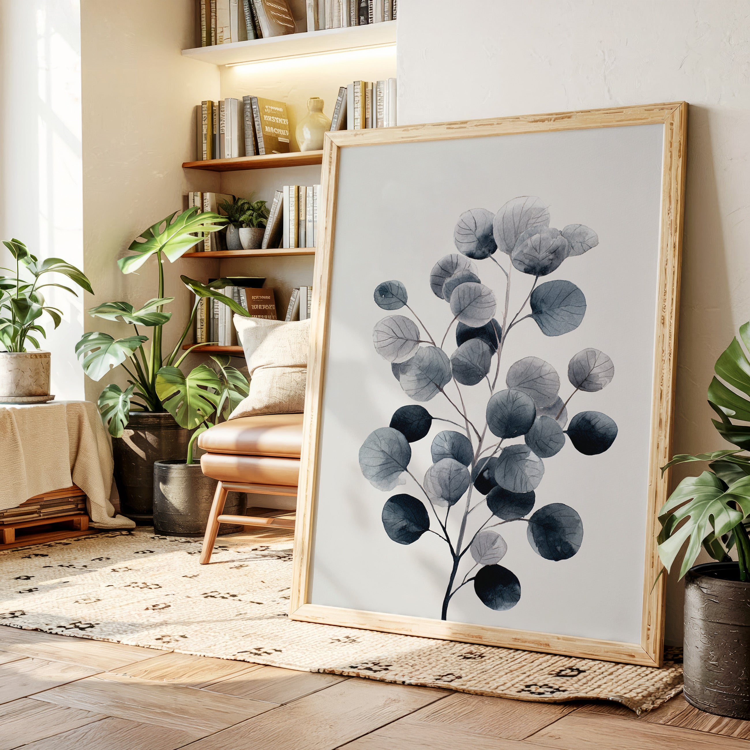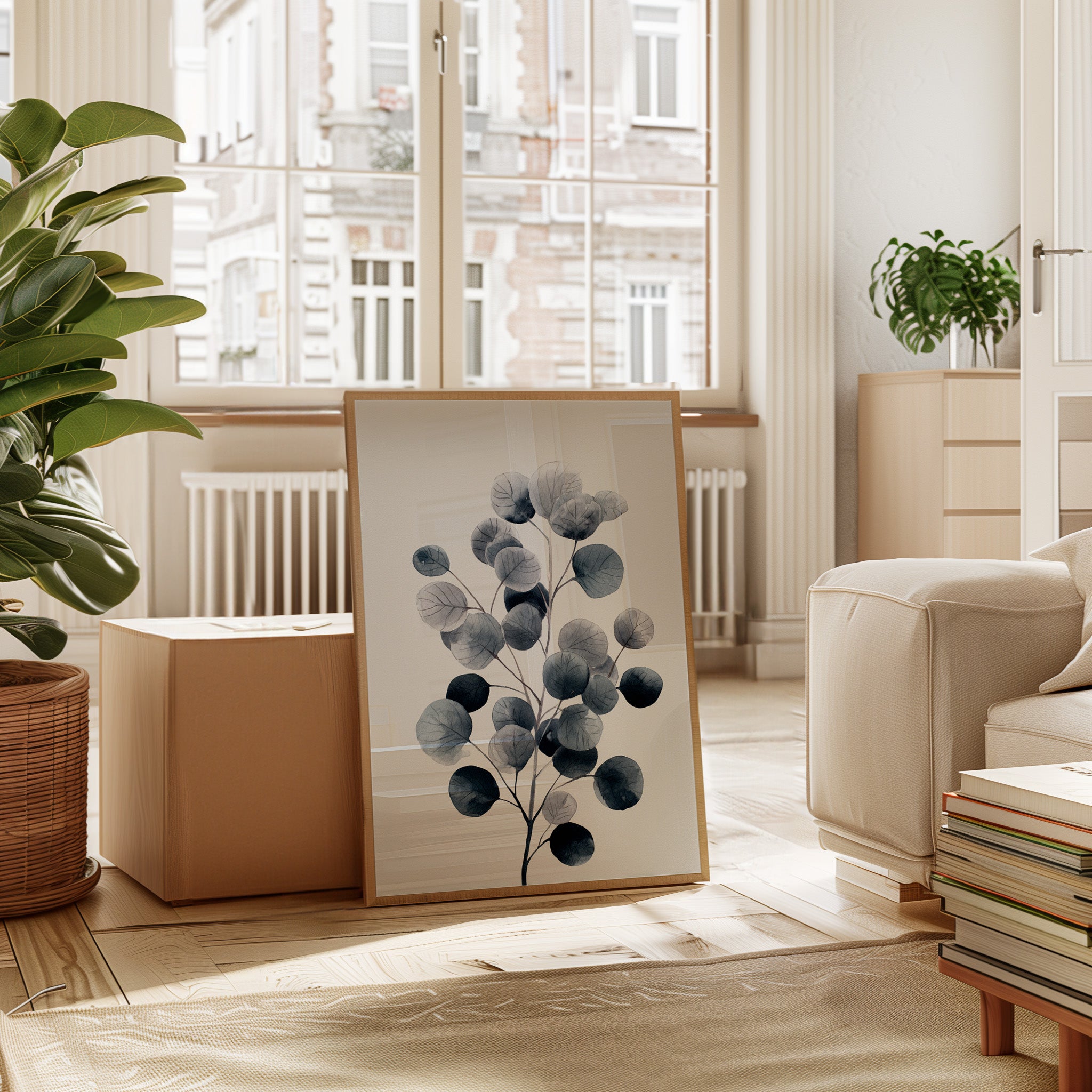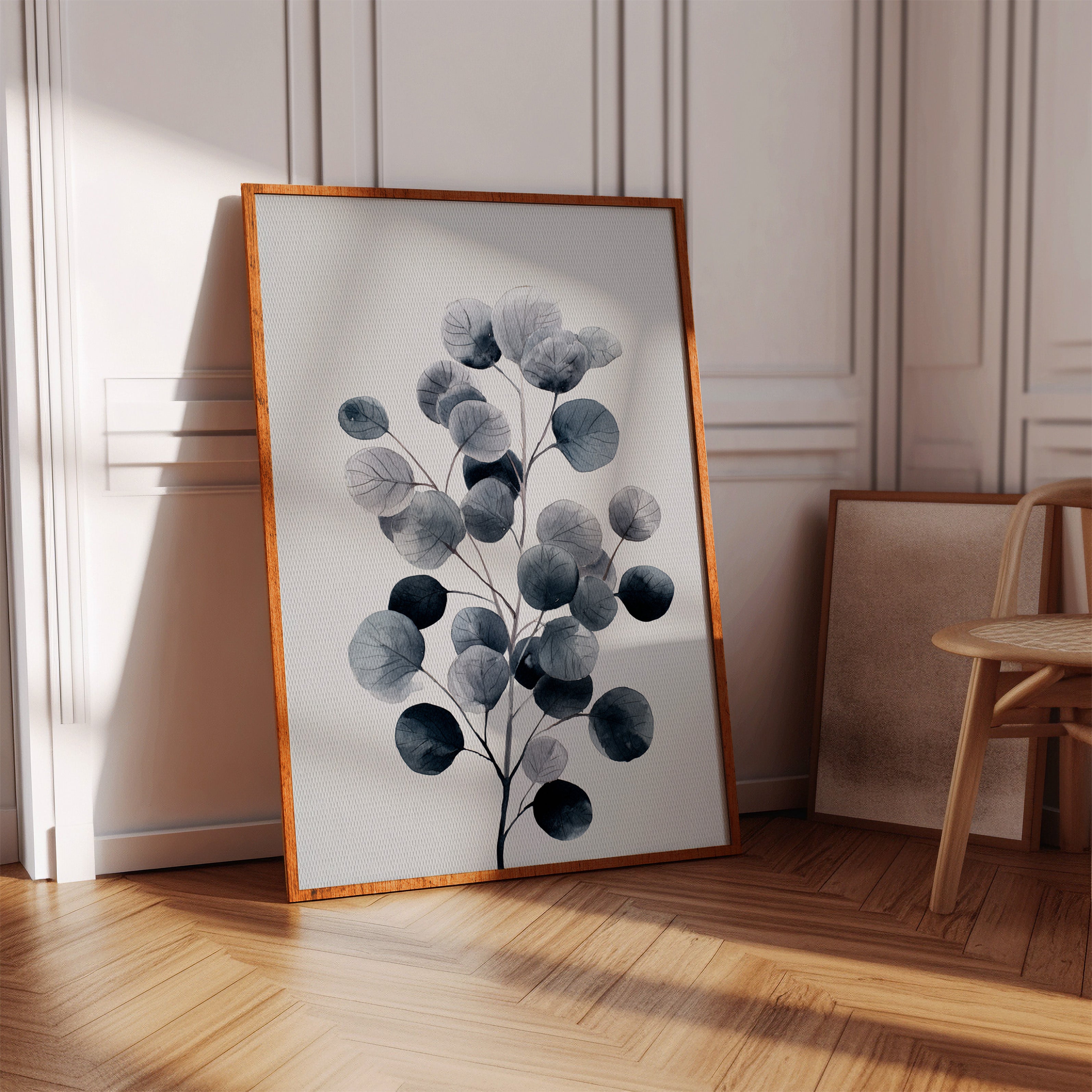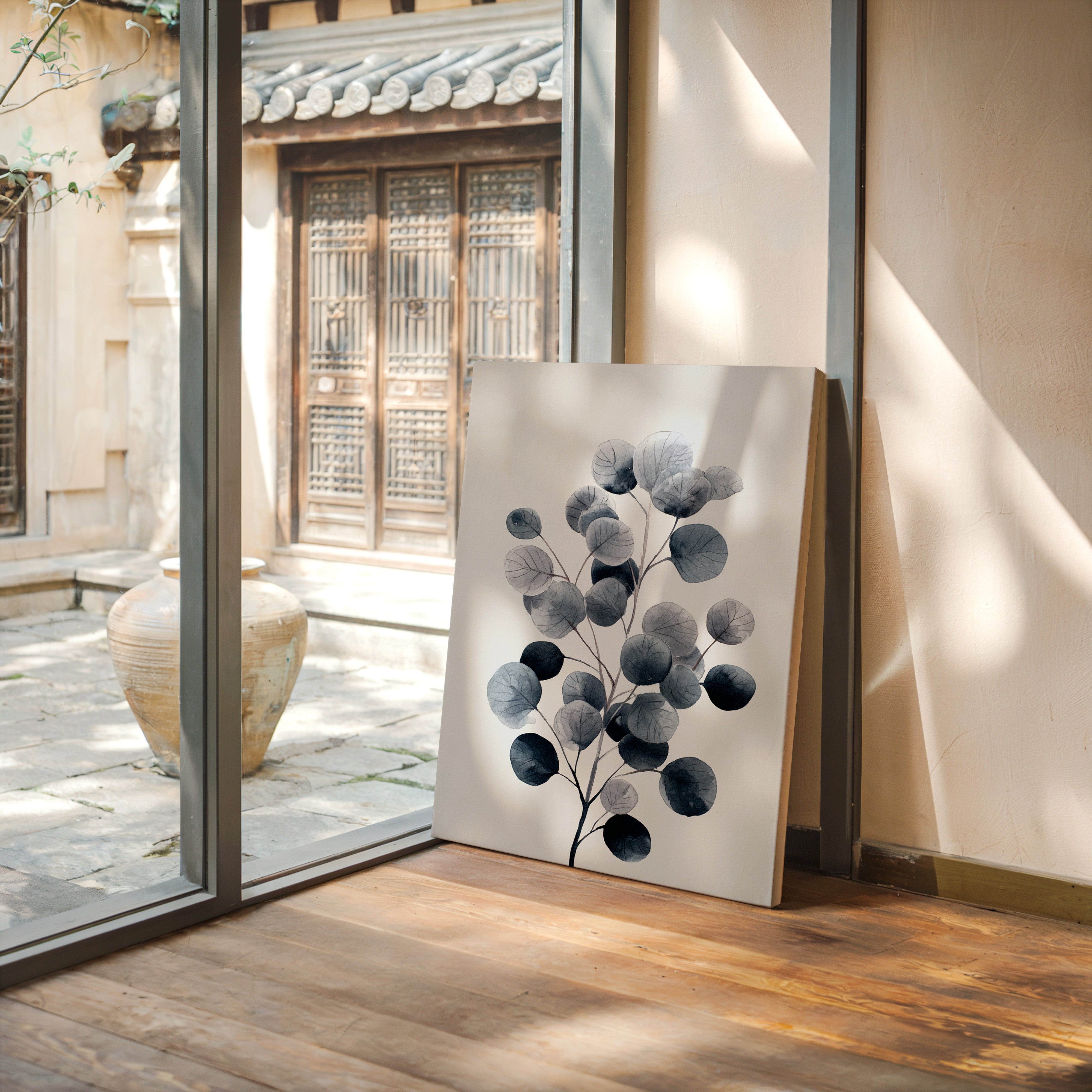 Delicate rounds of silvery foliage float like lunar phases against pristine white space. Each leaf catches light differently, creating a symphony of grays from pewter to charcoal, their translucent layers overlapping in gentle harmony. The botanical form appears to sway with an invisible breeze, its branches reaching upward with graceful determination. This ethereal watercolor captures the essence of mindful simplicity, where each brush stroke celebrates the beauty of natural forms. Perfect for creating a sense of serenity in a reading nook, meditation space, or as a calming focal point in a minimalist bedroom.