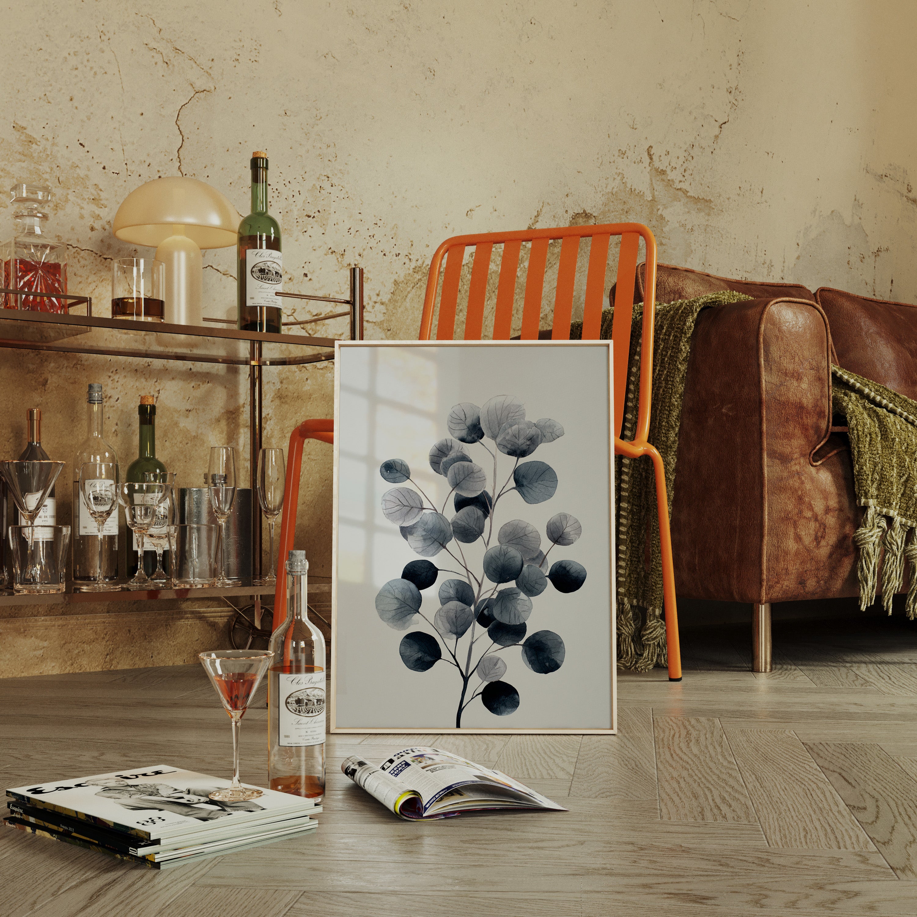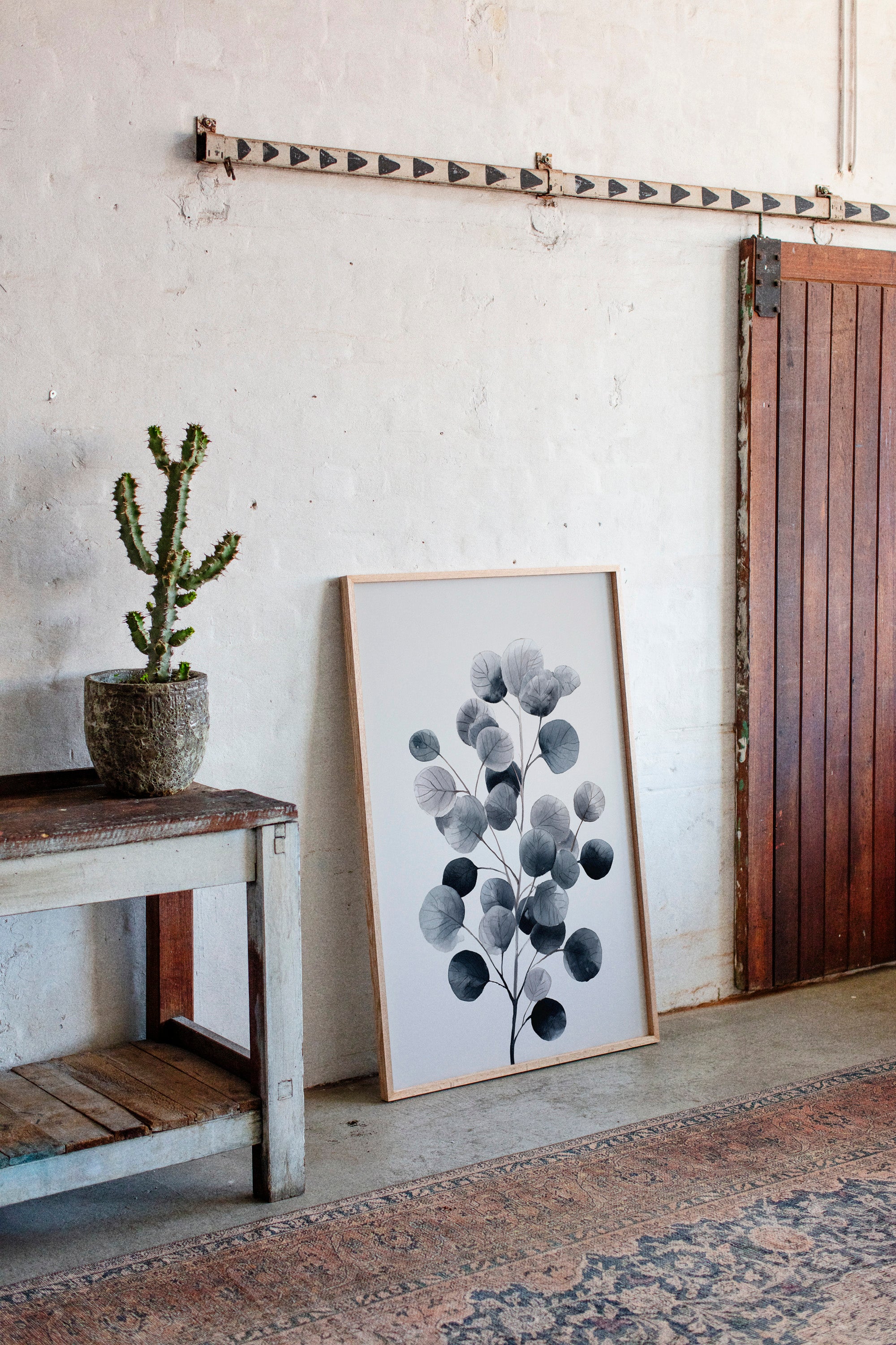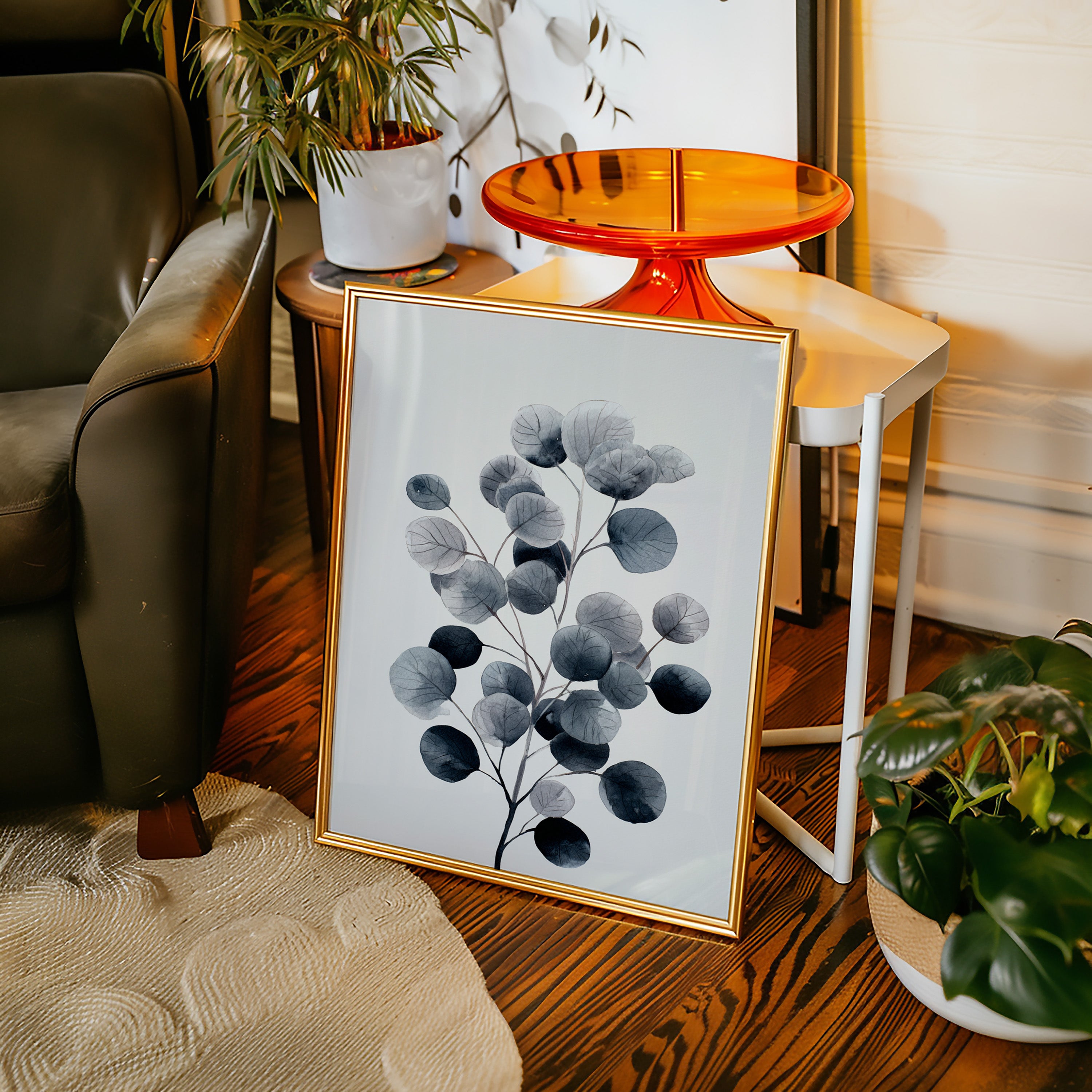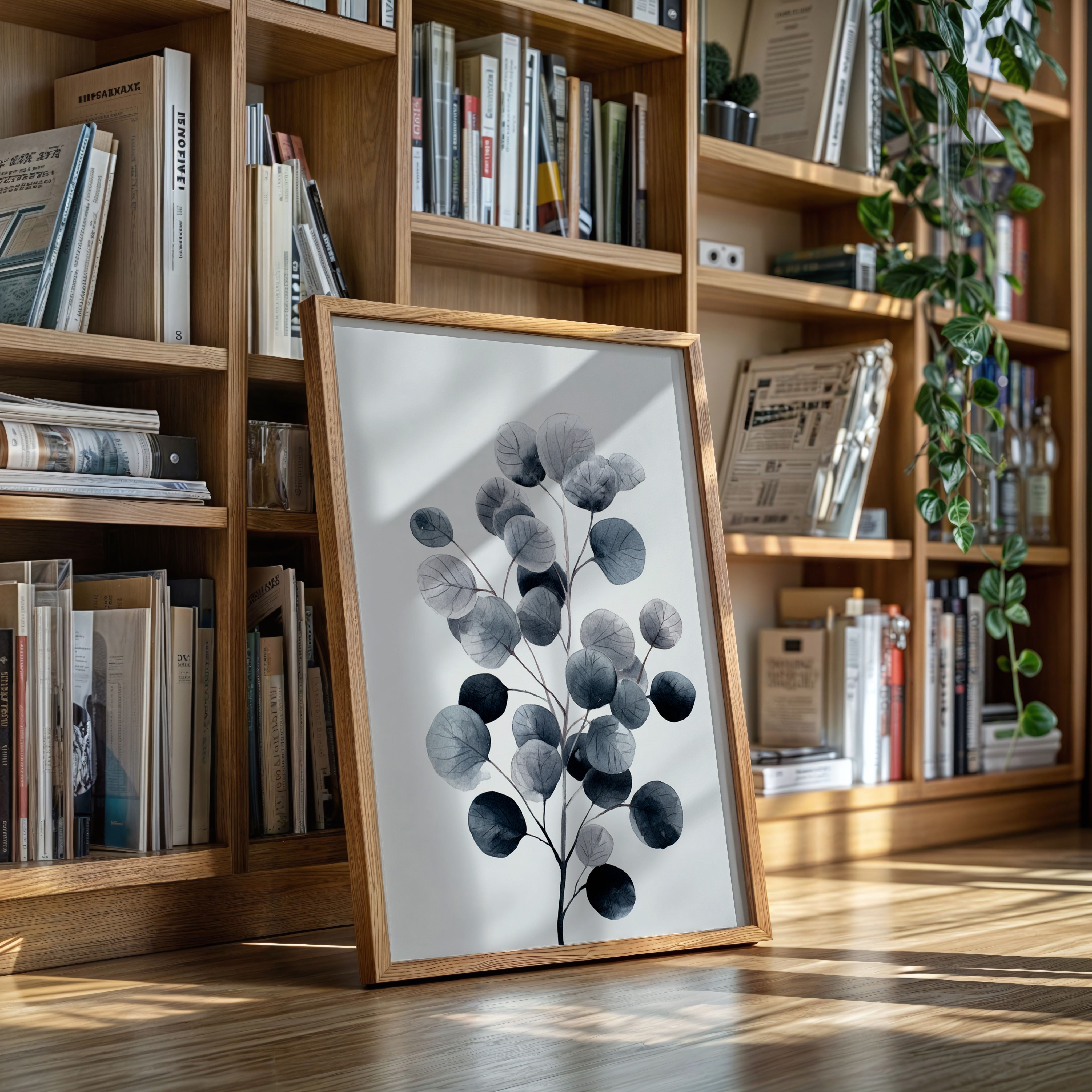 Delicate rounds of silvery foliage float like lunar phases against pristine white space. Each leaf catches light differently, creating a symphony of grays from pewter to charcoal, their translucent layers overlapping in gentle harmony. The botanical form appears to sway with an invisible breeze, its branches reaching upward with graceful determination. This ethereal watercolor captures the essence of mindful simplicity, where each brush stroke celebrates the beauty of natural forms. Perfect for creating a sense of serenity in a reading nook, meditation space, or as a calming focal point in a minimalist bedroom.