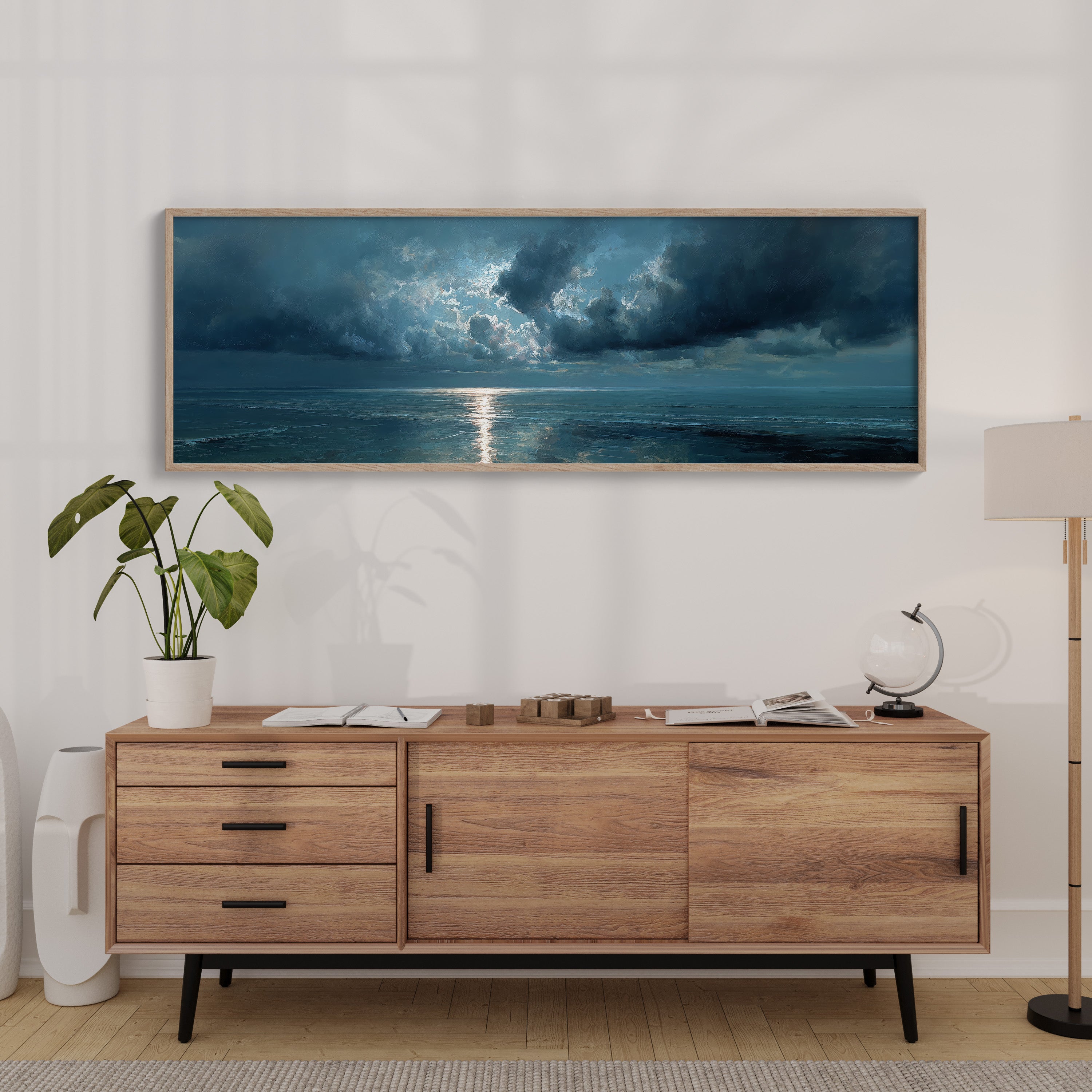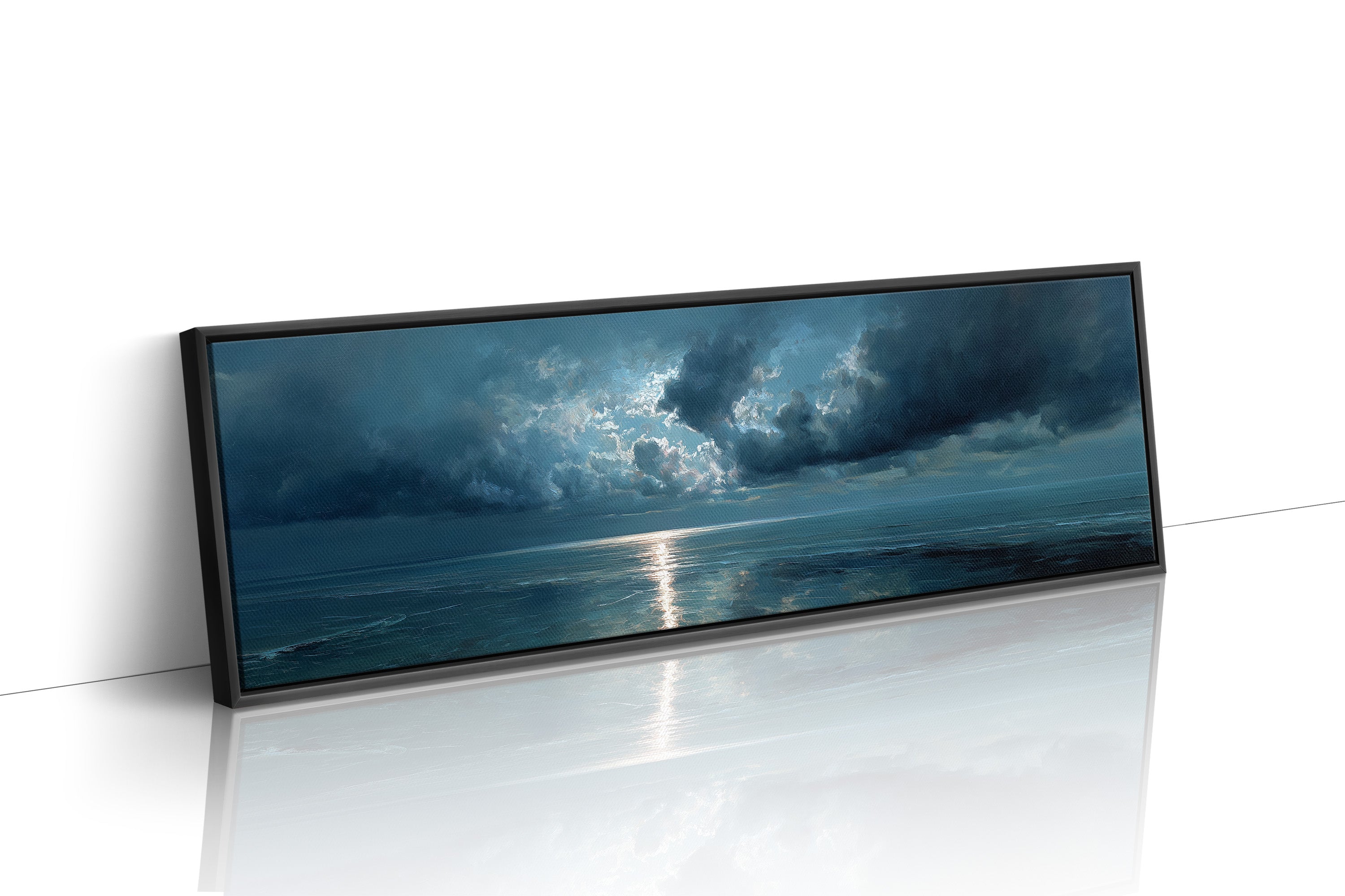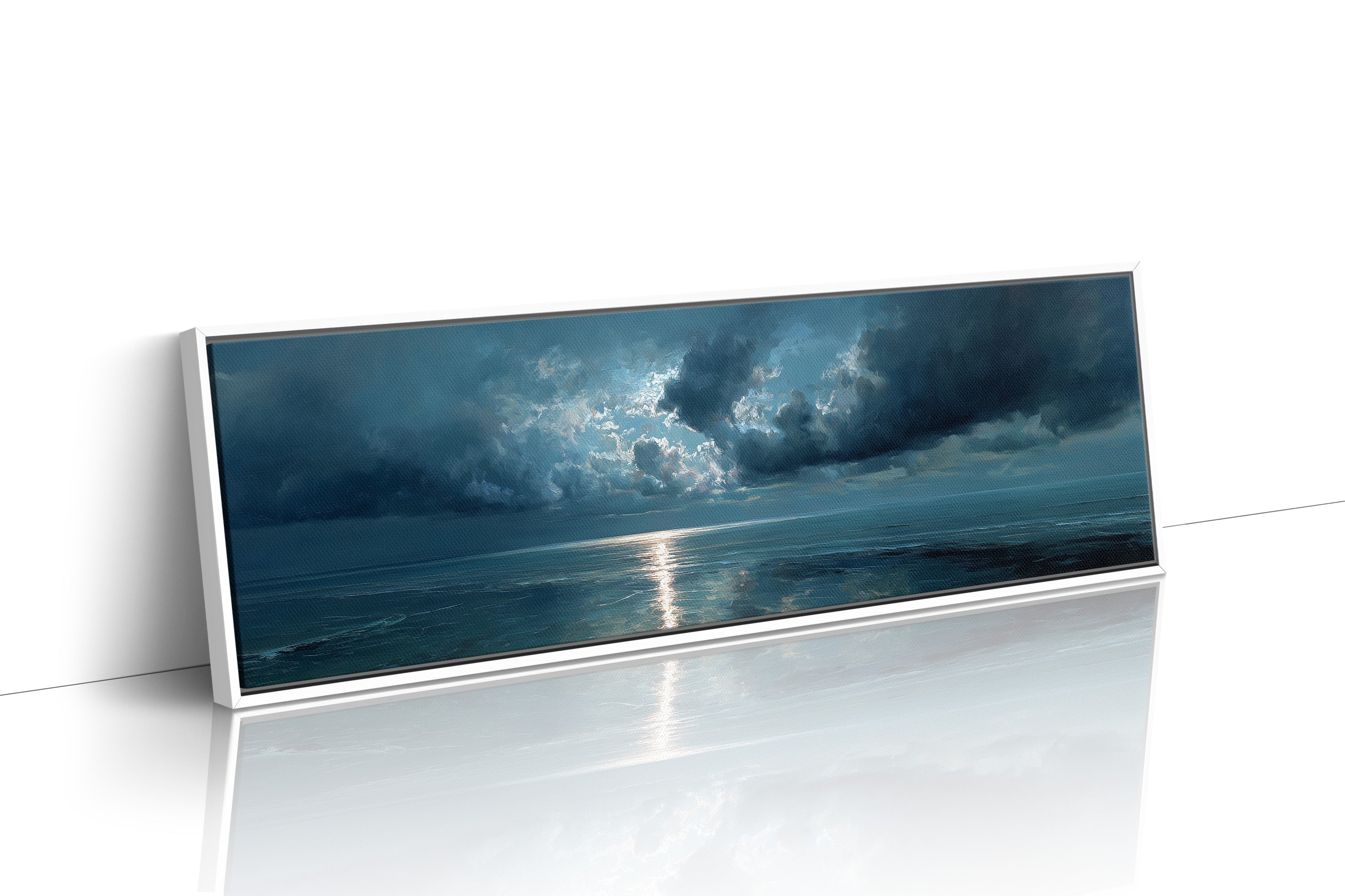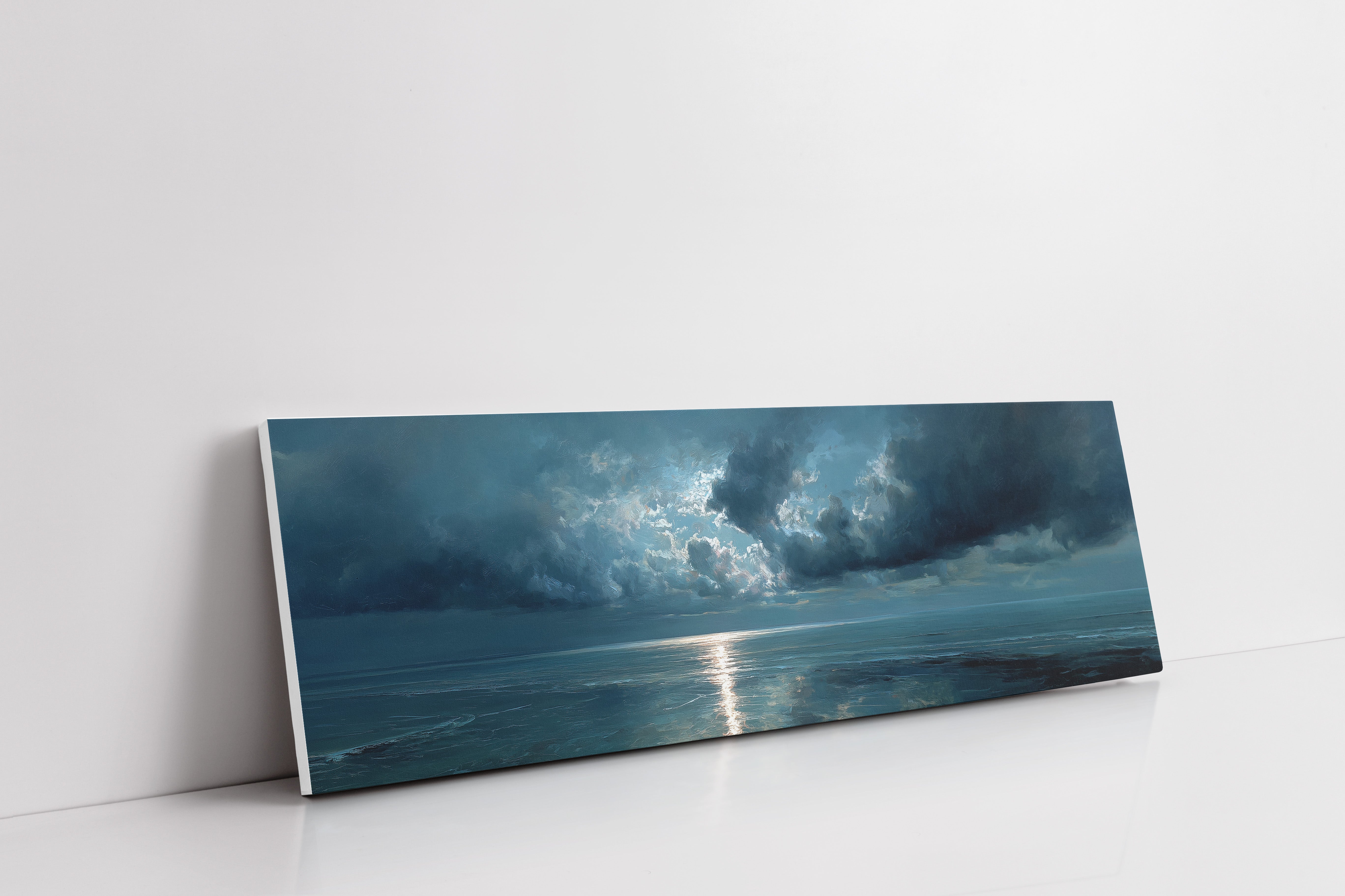 A break in the heavy clouds reveals a soft beam of silver light stretching across calm ocean waters, illuminating the horizon with a quiet, reflective glow. The moody palette of deep blues and drifting clouds creates a serene seascape that brings a sense of stillness and contemplation to bedrooms, living rooms, or peaceful coastal-inspired spaces.