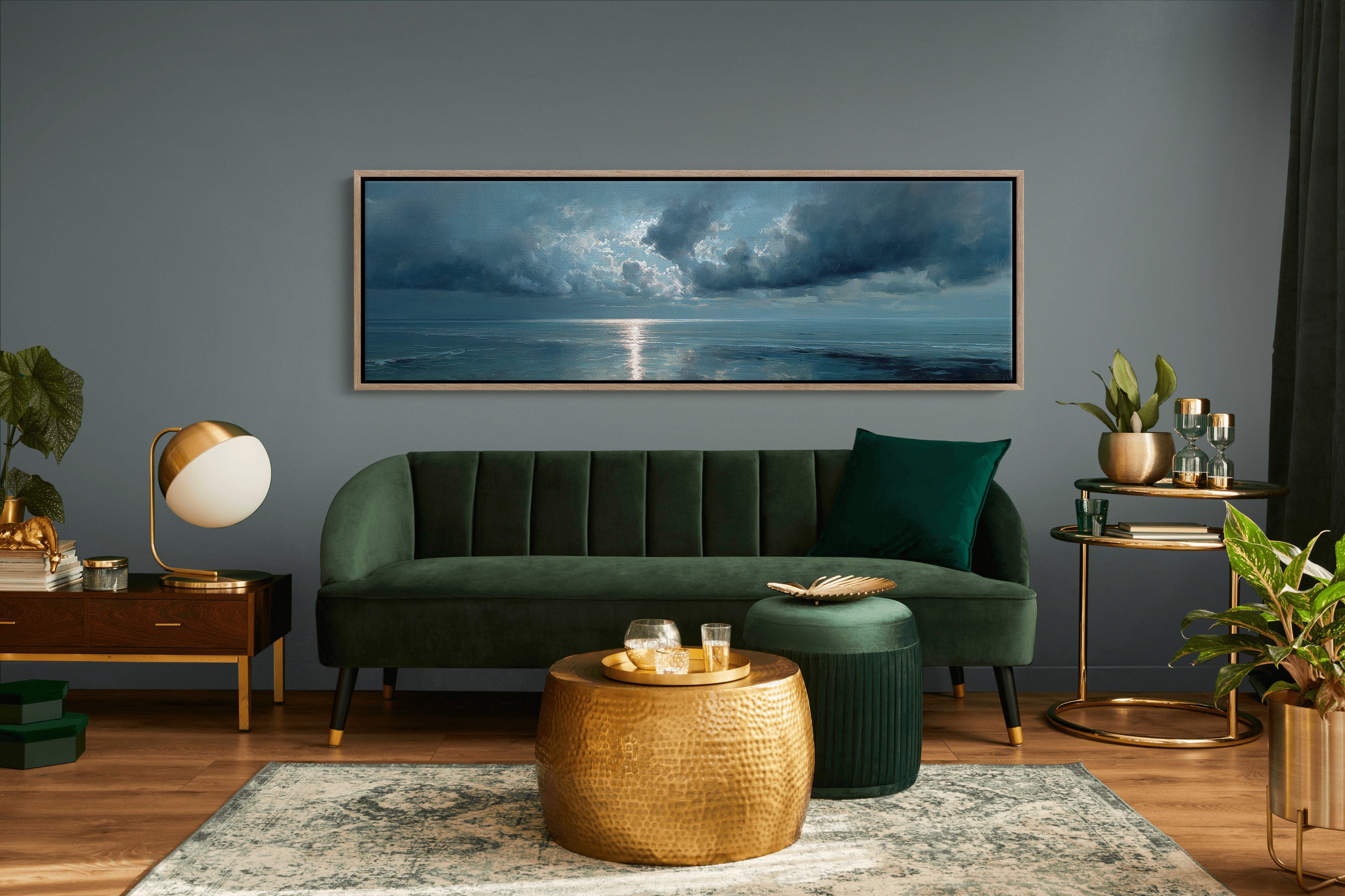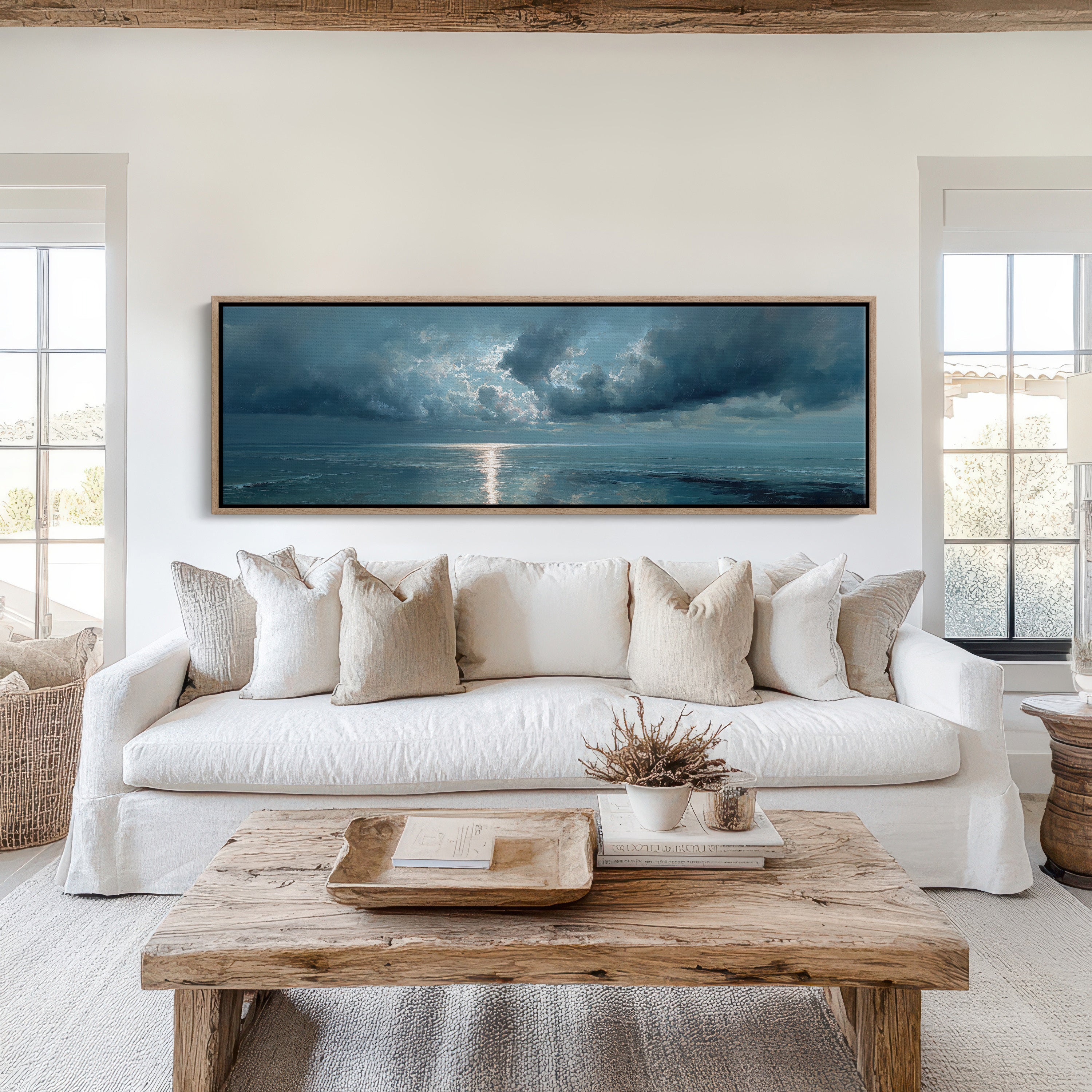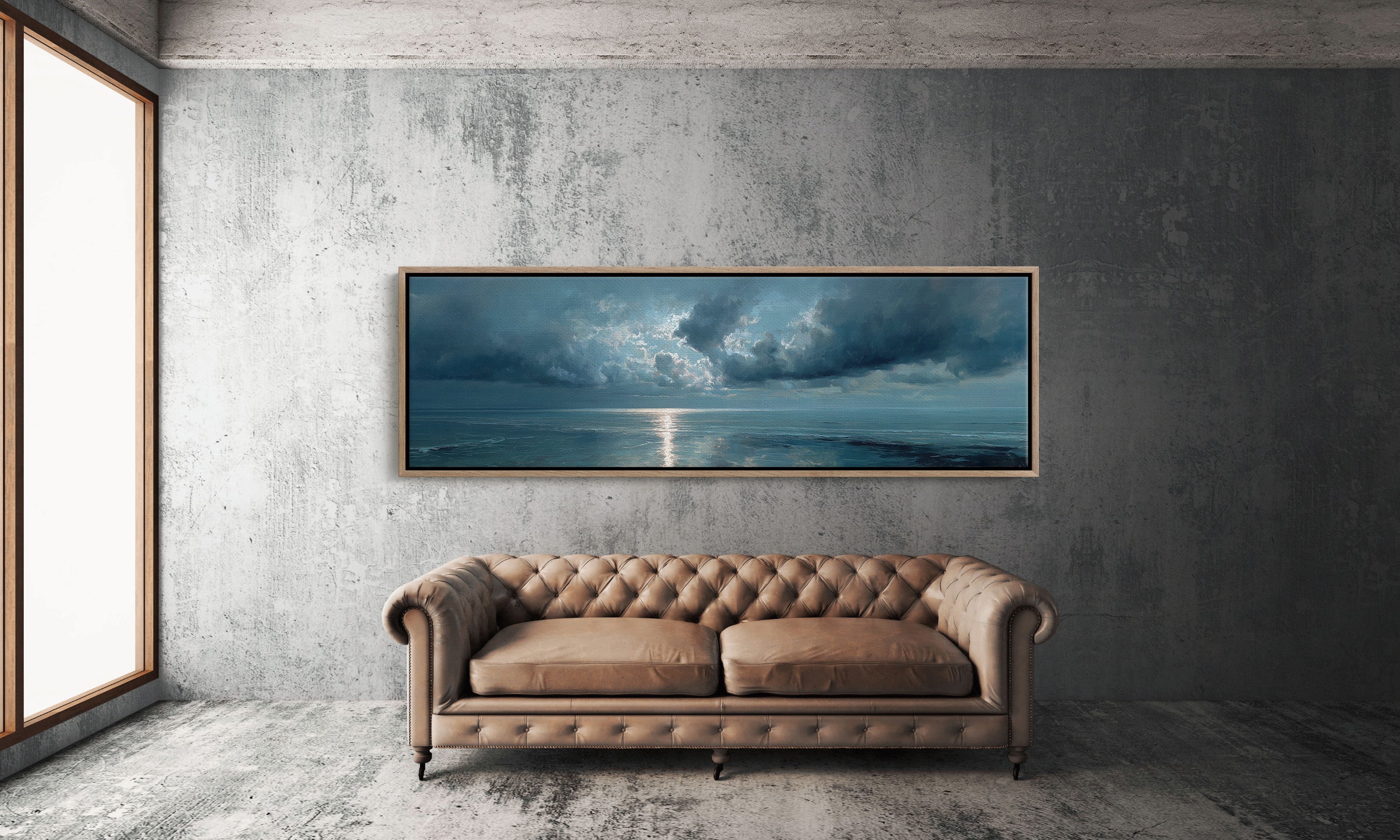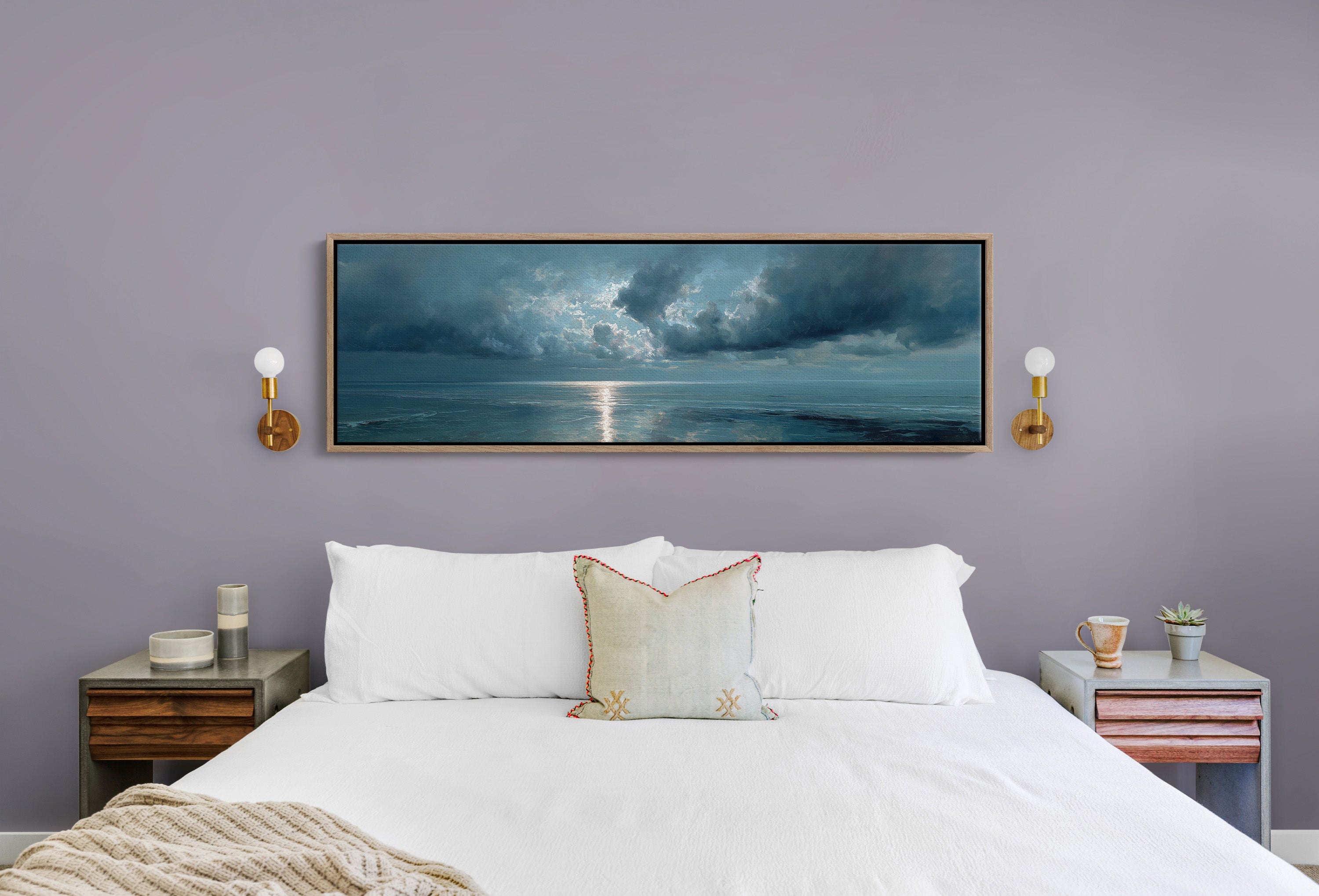 A break in the heavy clouds reveals a soft beam of silver light stretching across calm ocean waters, illuminating the horizon with a quiet, reflective glow. The moody palette of deep blues and drifting clouds creates a serene seascape that brings a sense of stillness and contemplation to bedrooms, living rooms, or peaceful coastal-inspired spaces.