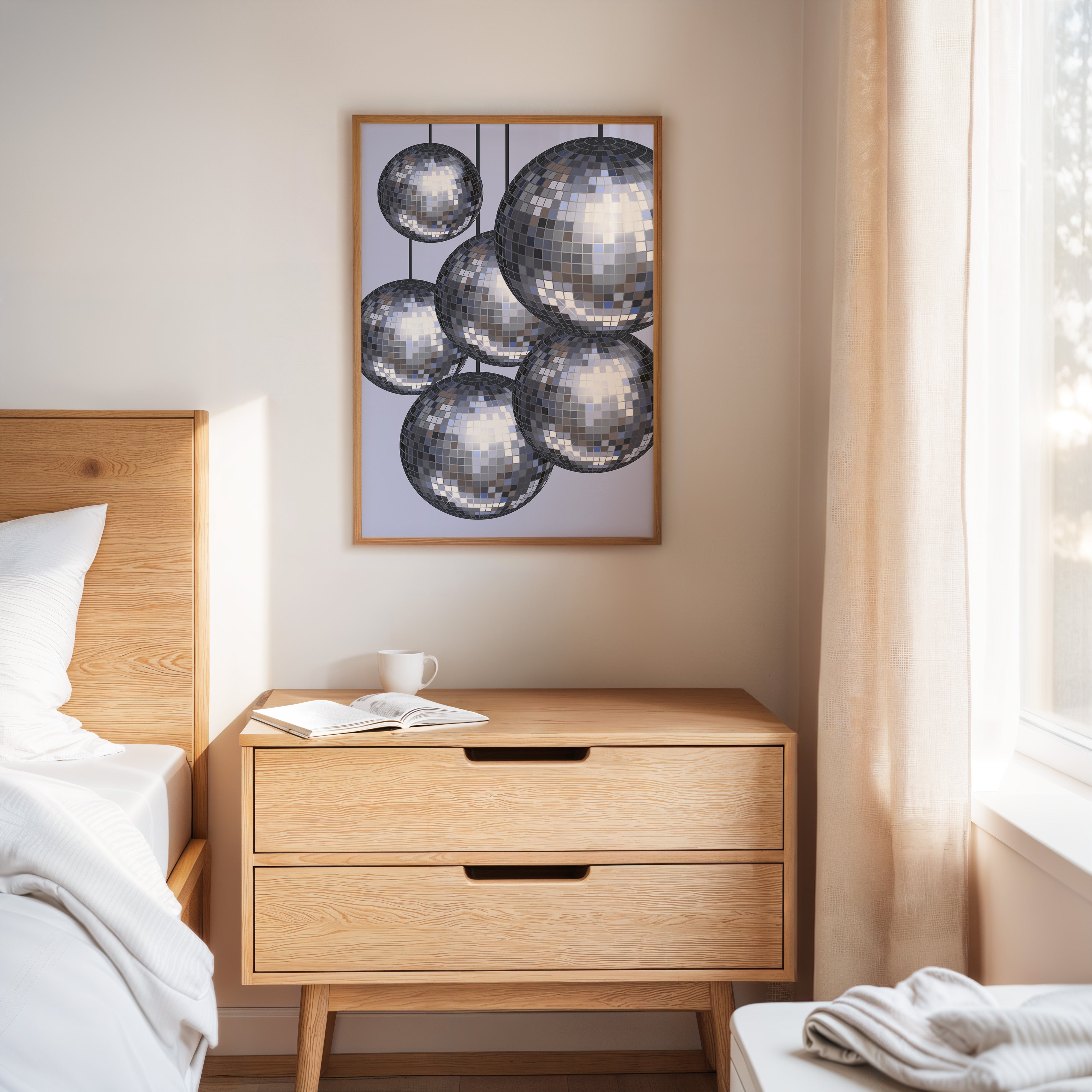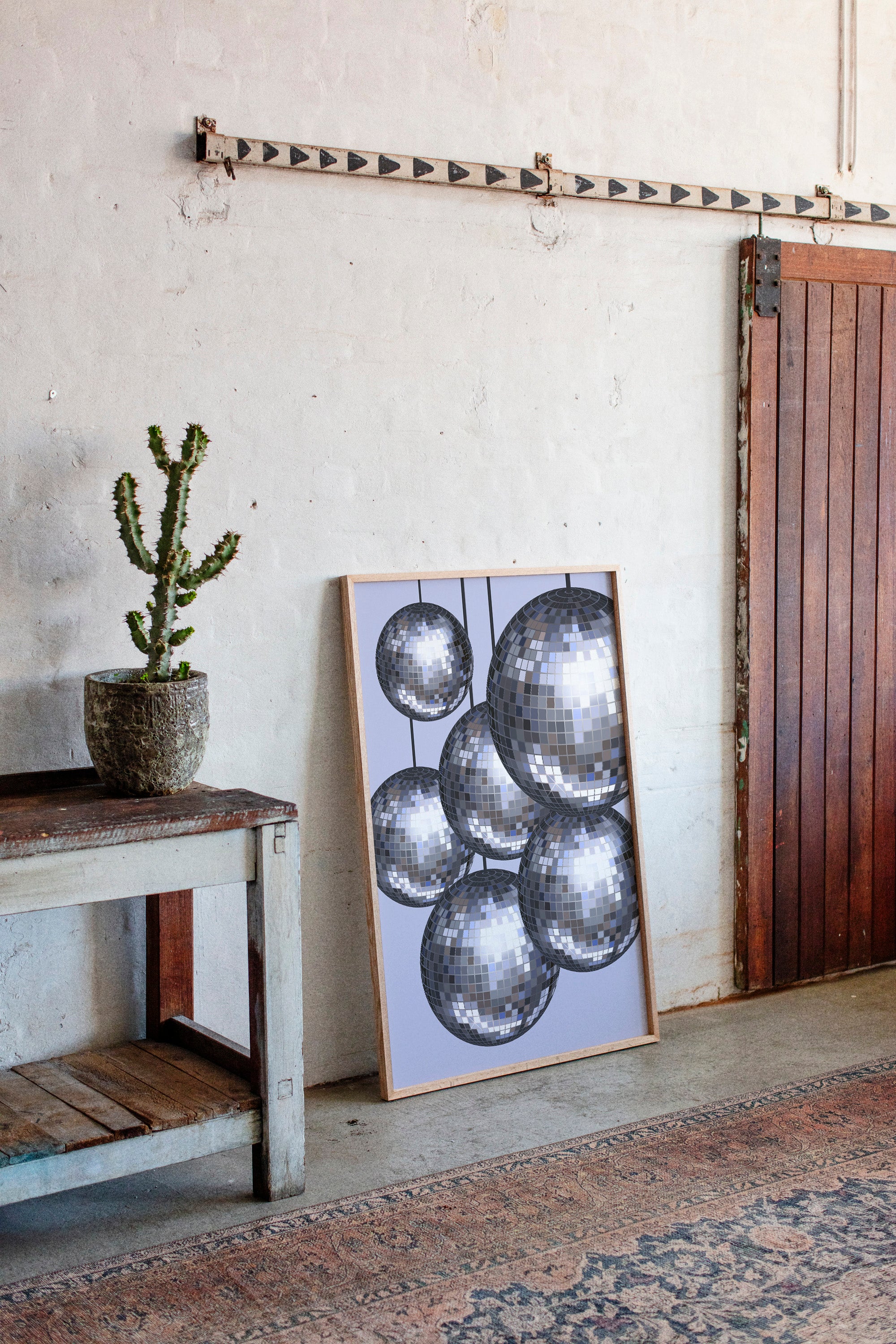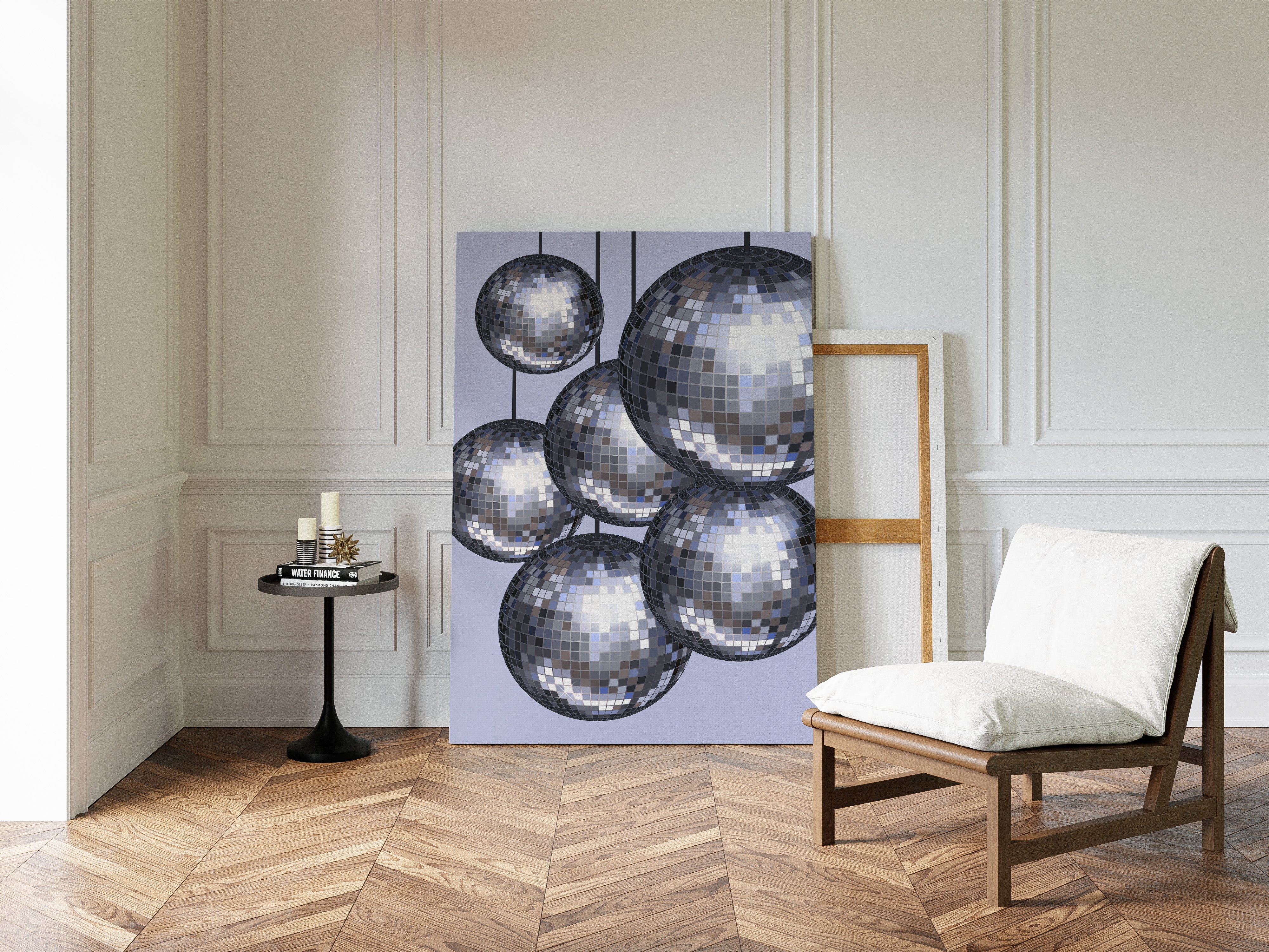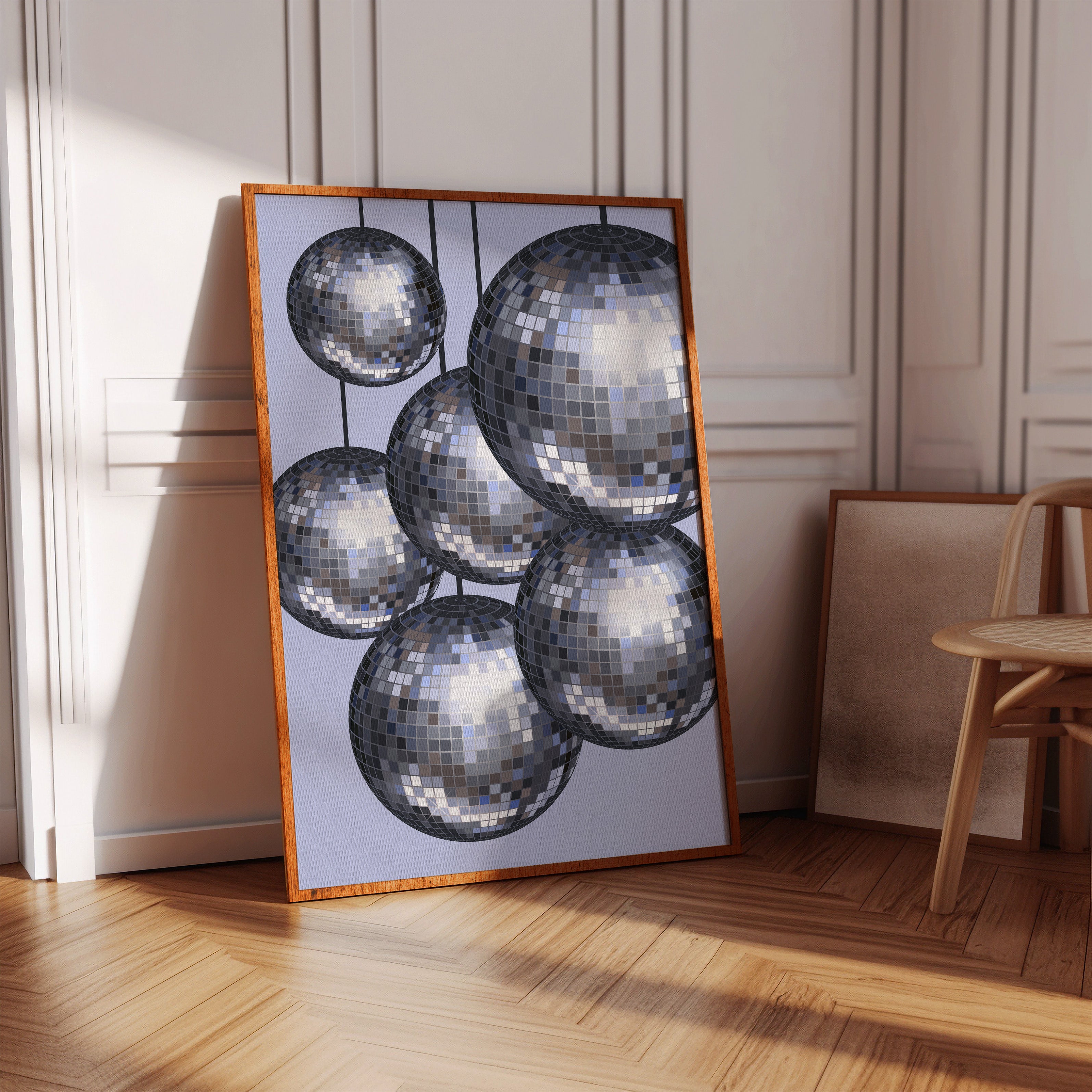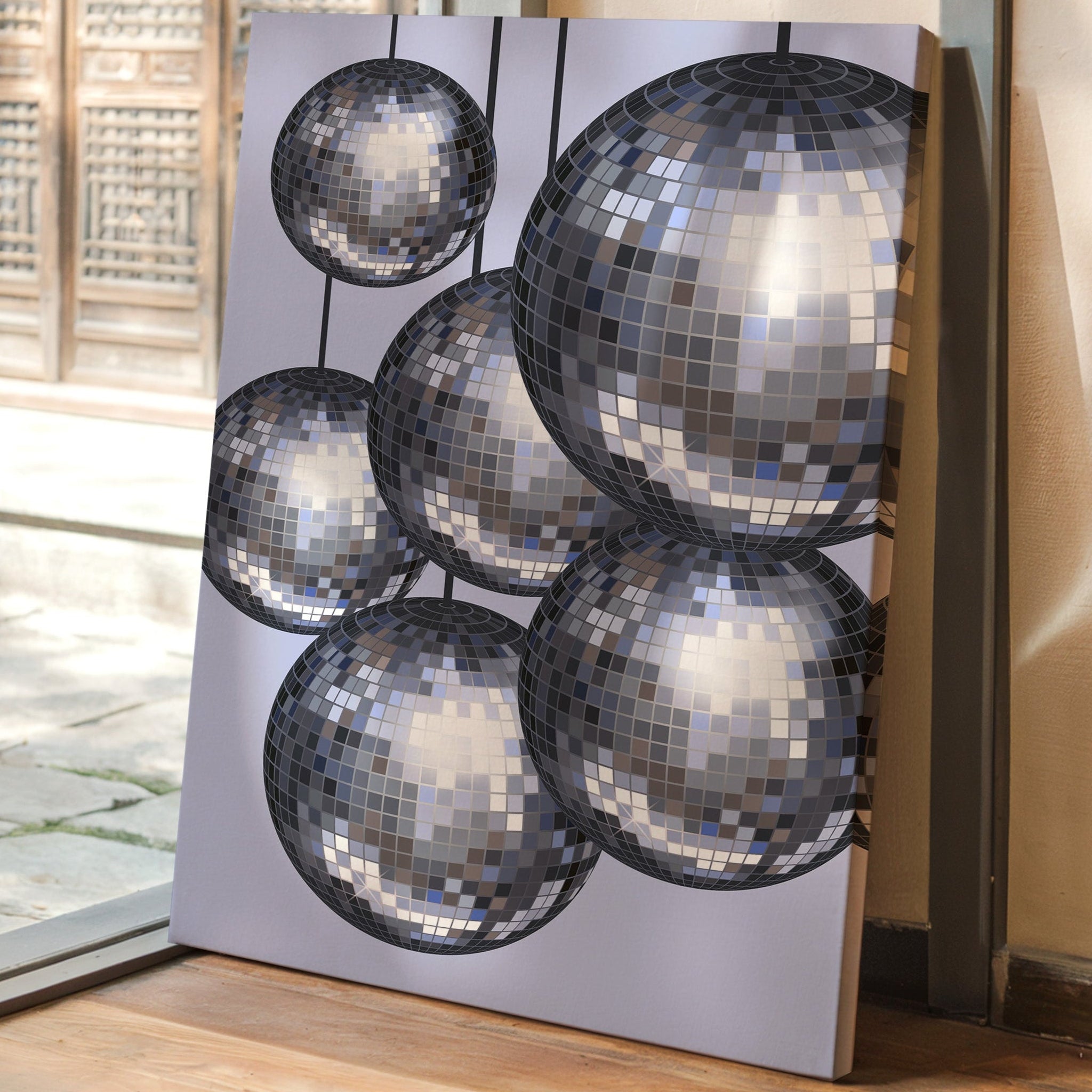 Suspended in twilight's embrace, mirror balls catch and scatter light like stars fallen to earth. This piece from our Contemporary collection captures the electric anticipation of nightlife in elegant suspension. Each faceted sphere reflects fragments of possibility, creating a constellation of metallic moments frozen in time. The cool silver tones play against a soft lavender backdrop, while geometric patterns create a mesmerizing dance of light and shadow. Perfect for adding glamour to a modern living space or bringing sophisticated energy to an entertainment area. This statement piece invites viewers to lose themselves in its infinite reflections, each tiny mirror telling its own story of nights yet to unfold.