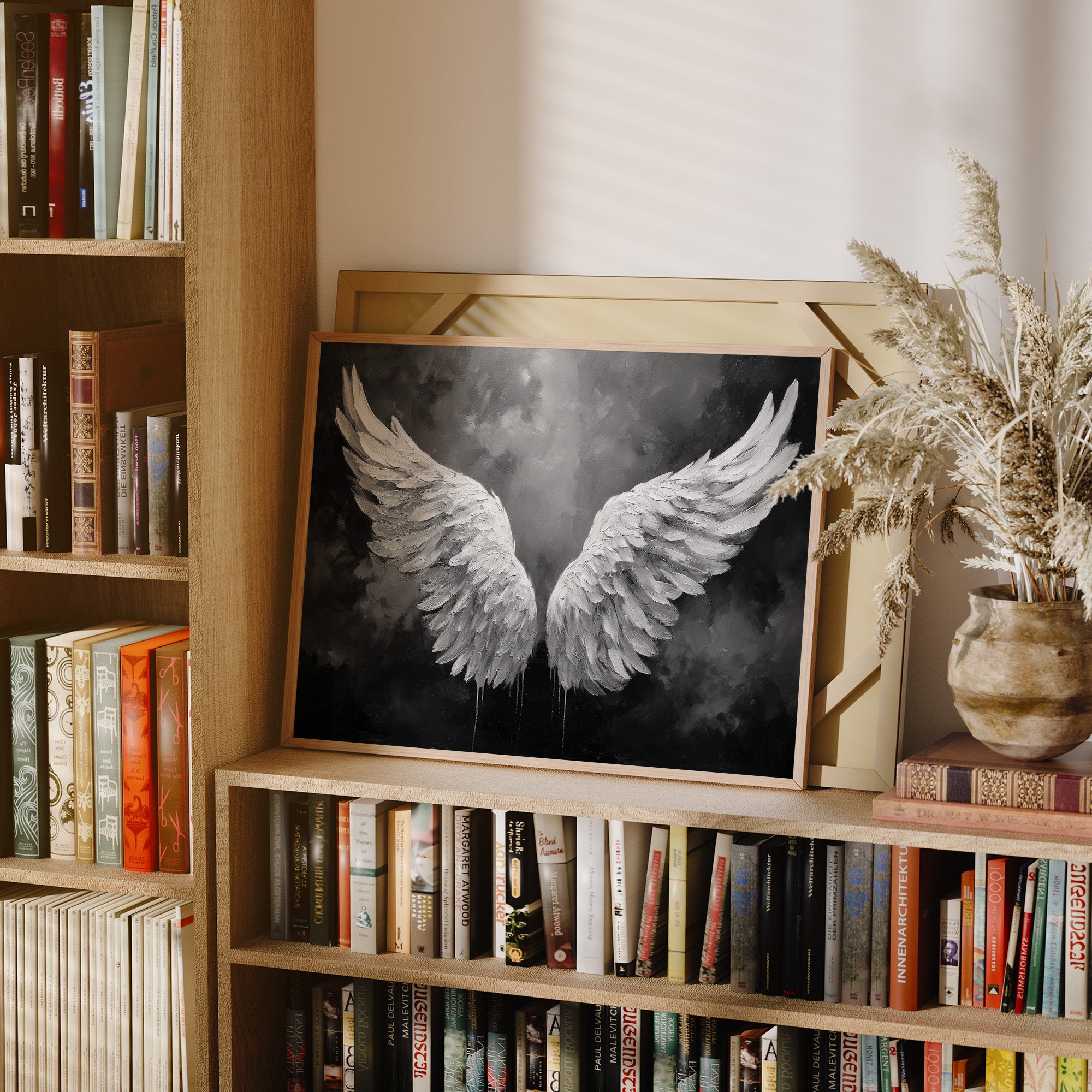 A monochromatic painting of ethereal wings floats against a turbulent dark sky, creating a moment of transcendent contrast. The delicate feathers, rendered in luminous white and silver tones, seem to capture light even within the moody atmosphere of swirling grays and blacks. This striking piece rests casually against a warm wooden bookshelf, complemented by dried pampas grass in an earthenware vessel, creating a thoughtful sanctuary of contemplation. Perfect for a reading nook, home office, or any space where you seek both inspiration and quiet reflection.