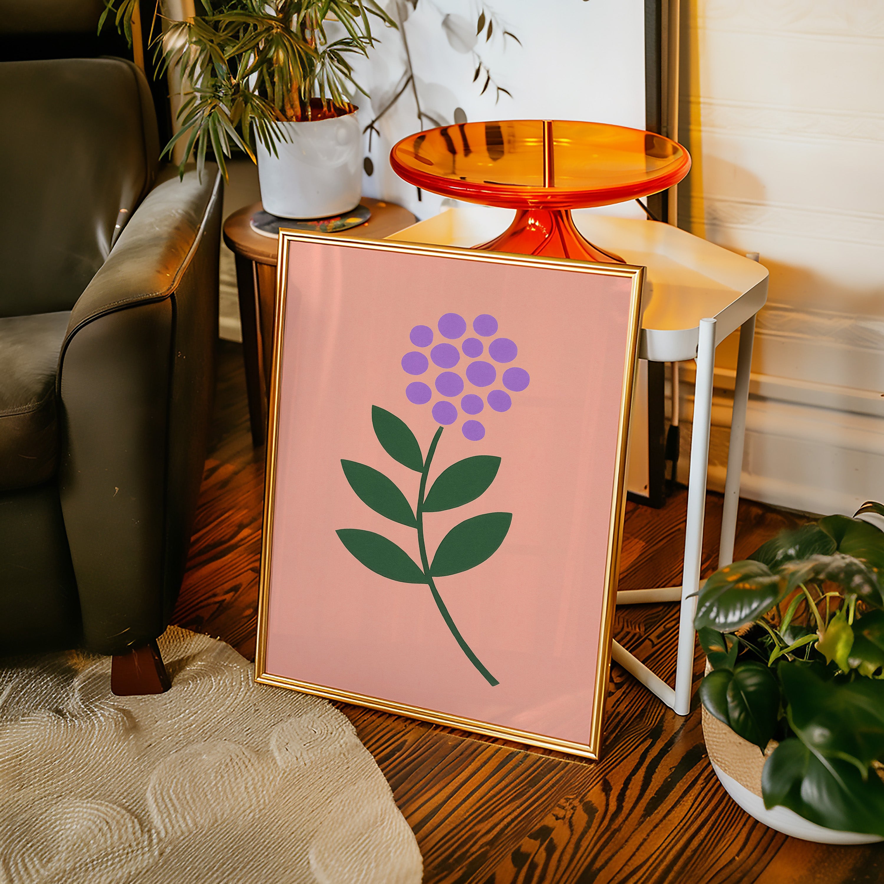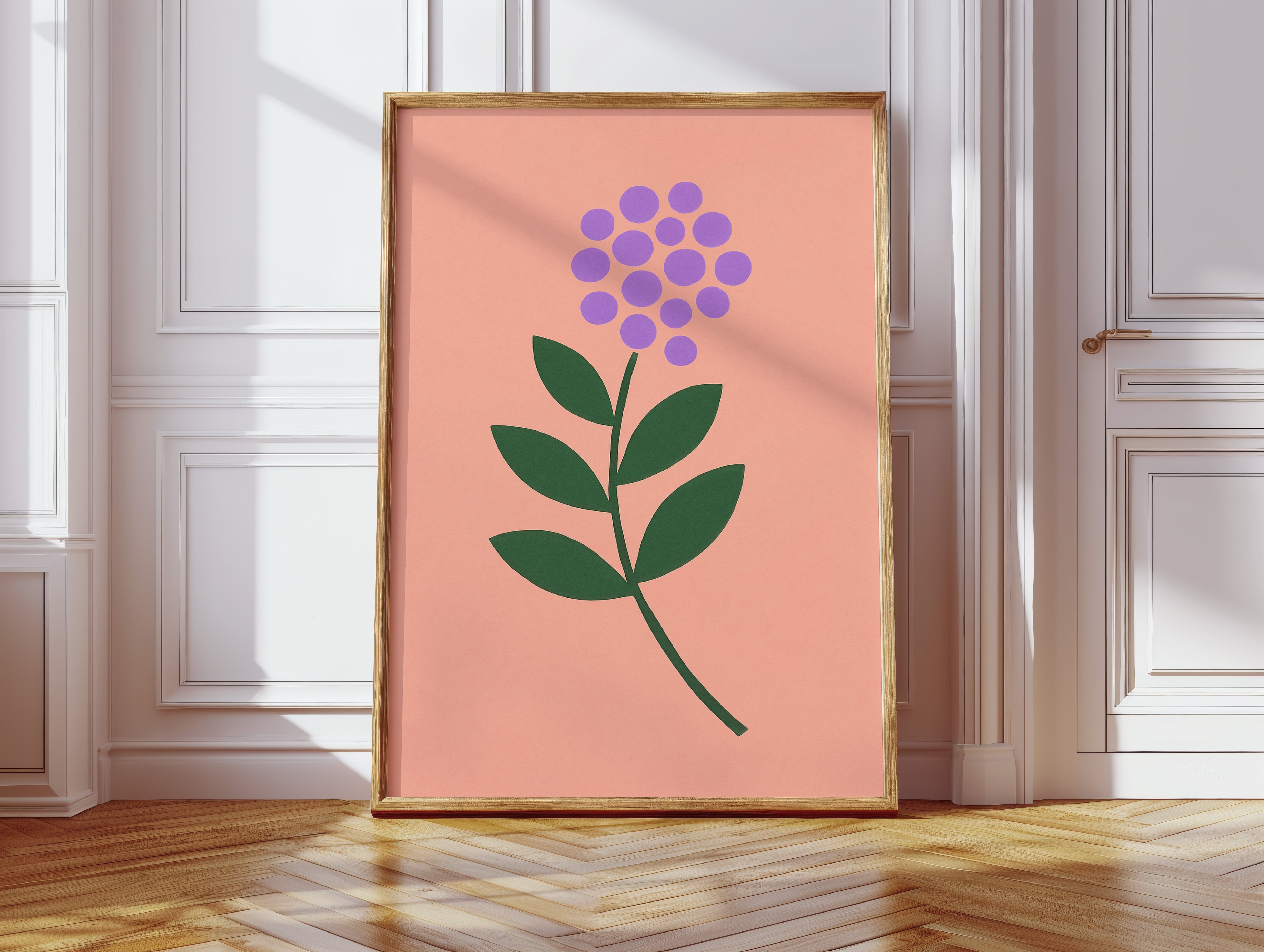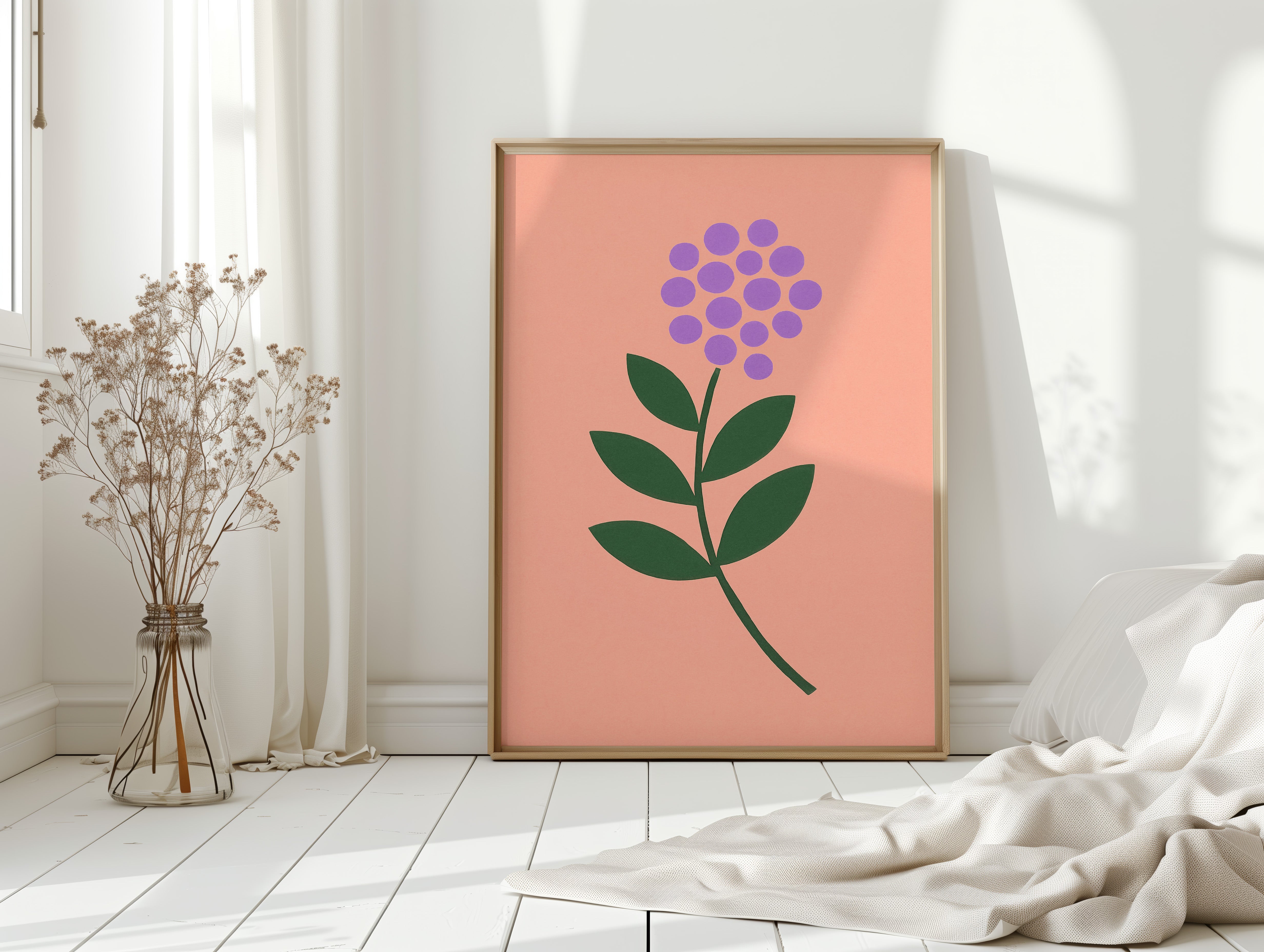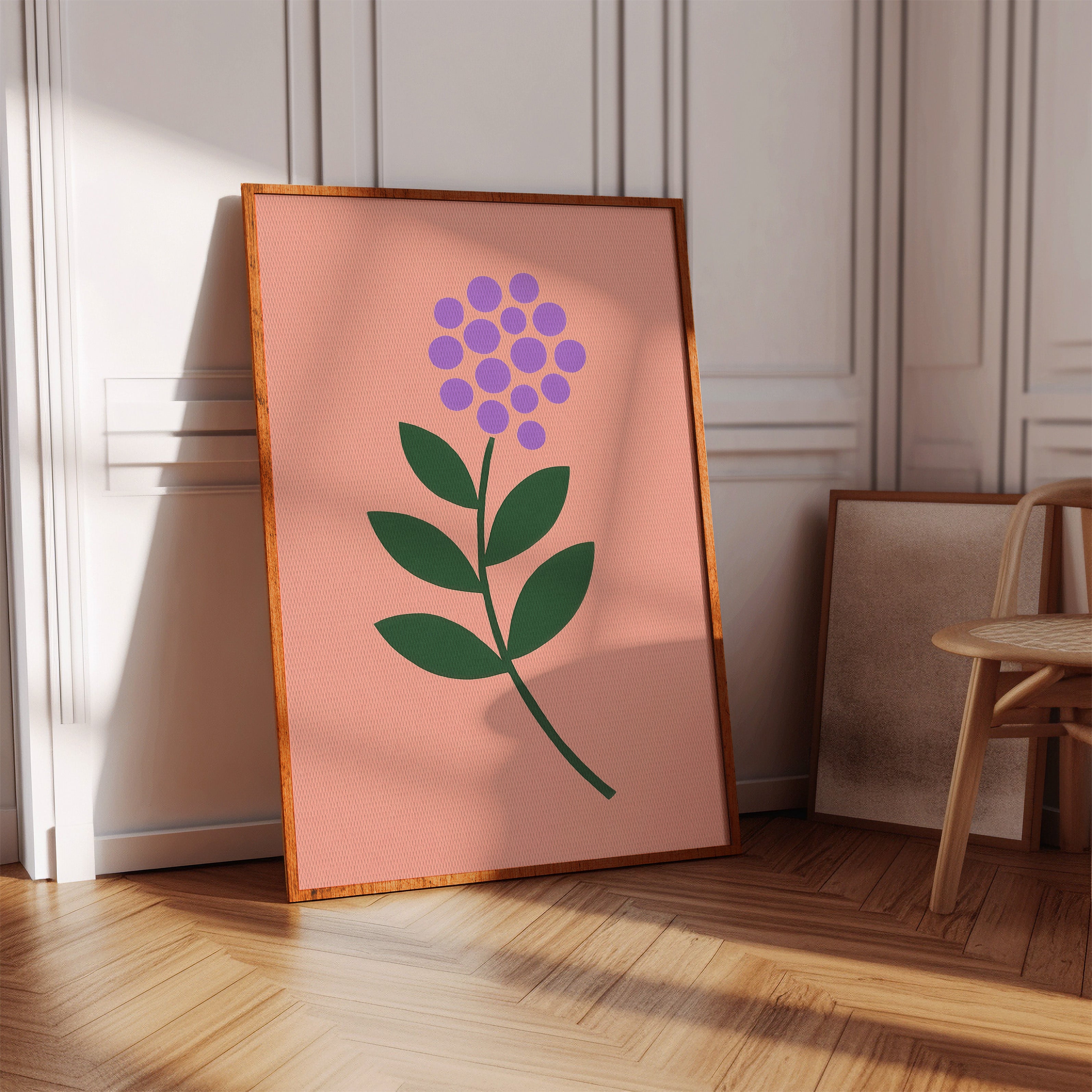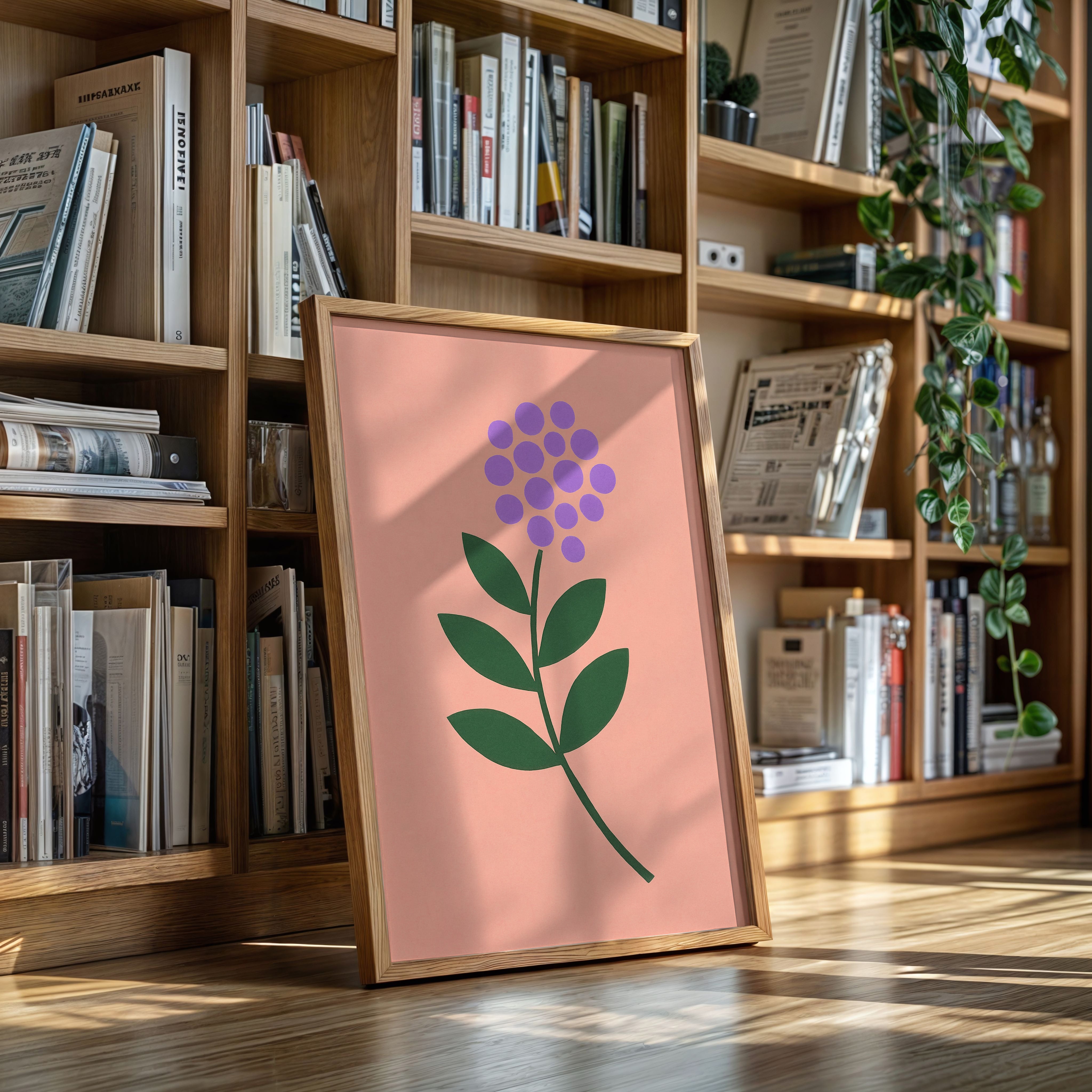 A minimalist botanical composition emerges against a soft coral backdrop, where purple circles cluster to form a delicate flower head. The stark simplicity of emerald leaves creates a bold architectural statement, while maintaining an air of playful sophistication. The intentional use of basic geometric shapes transforms a familiar natural form into something both modern and timeless. Perfect for bringing a touch of contemporary charm to a nursery, home office, or any space seeking a blend of whimsy and refined design.