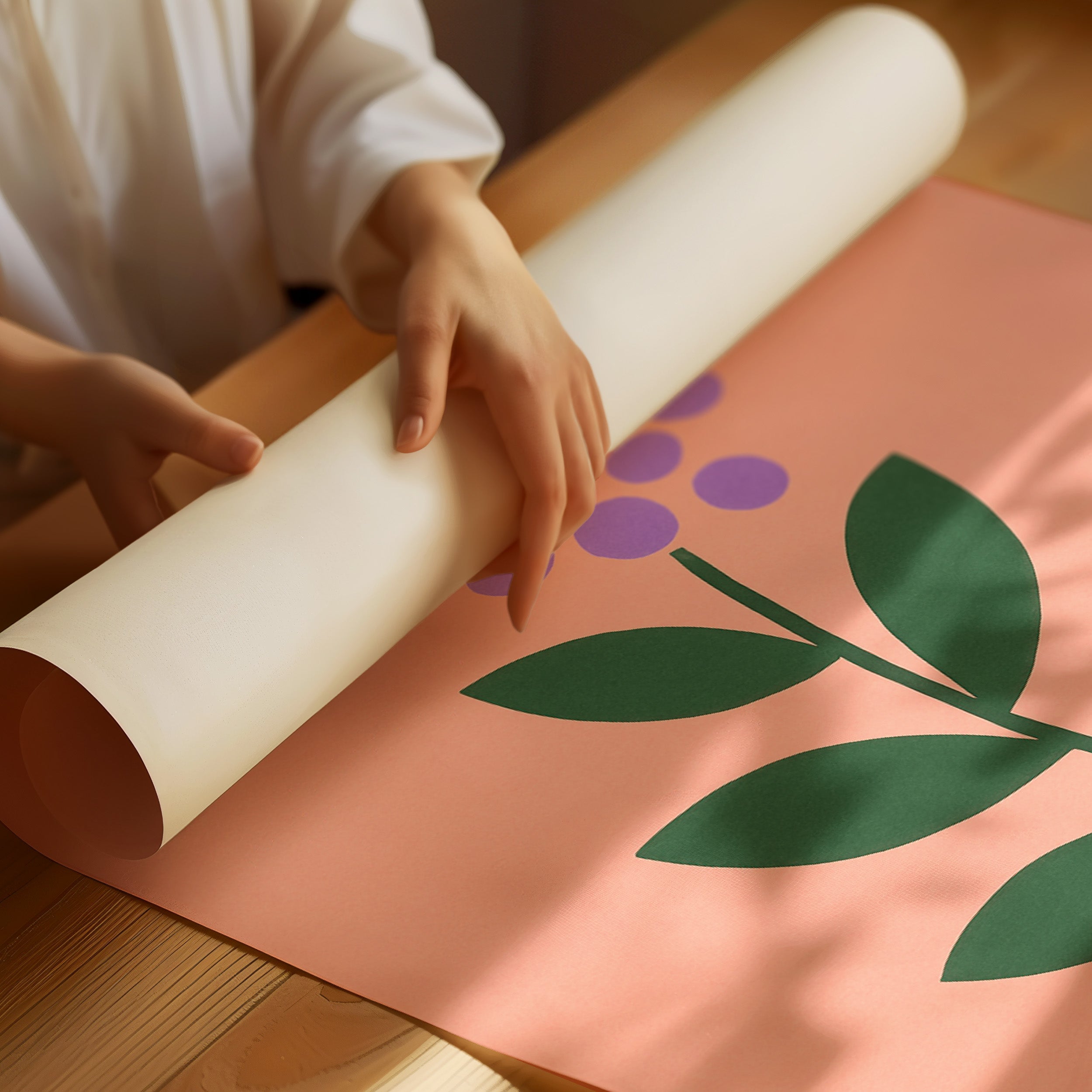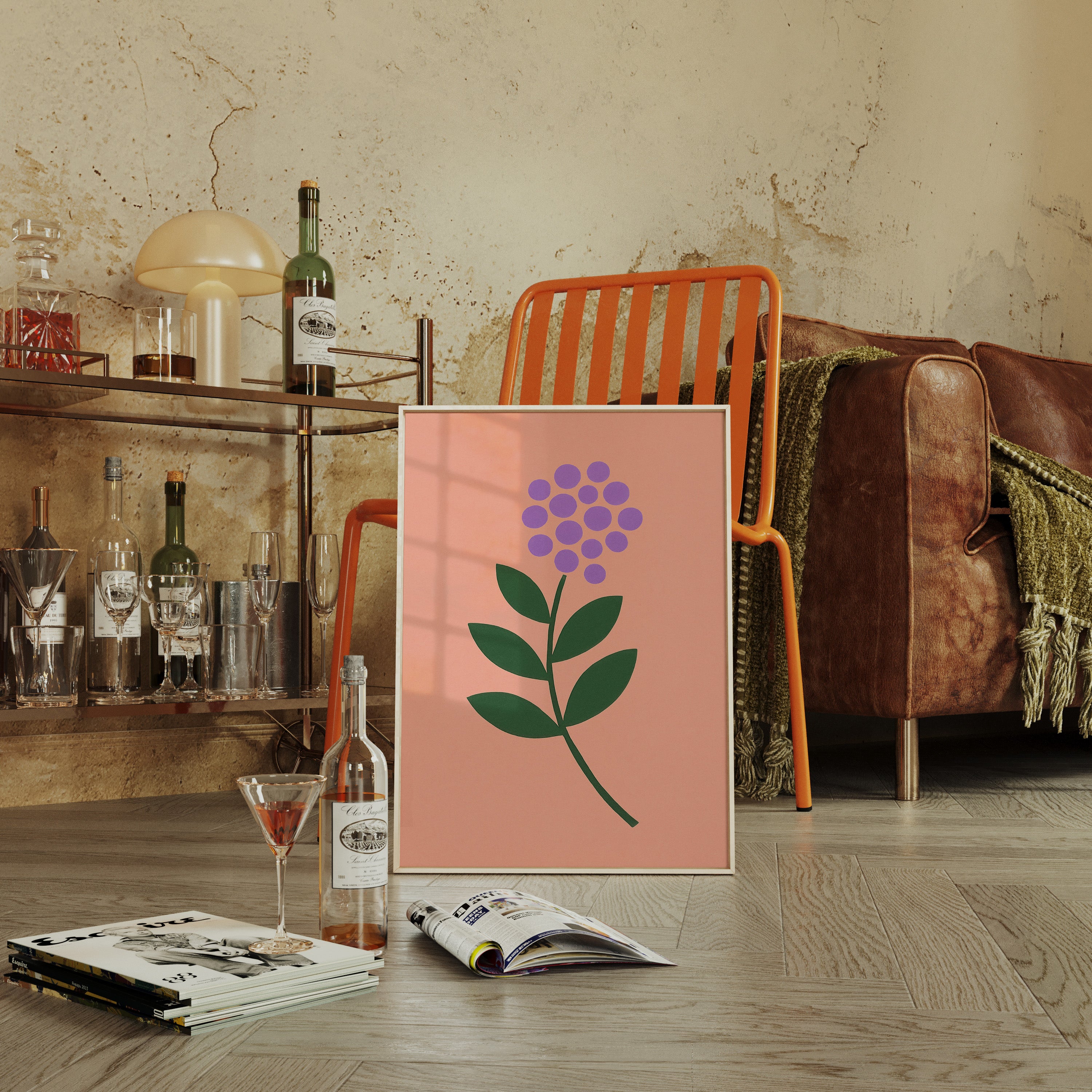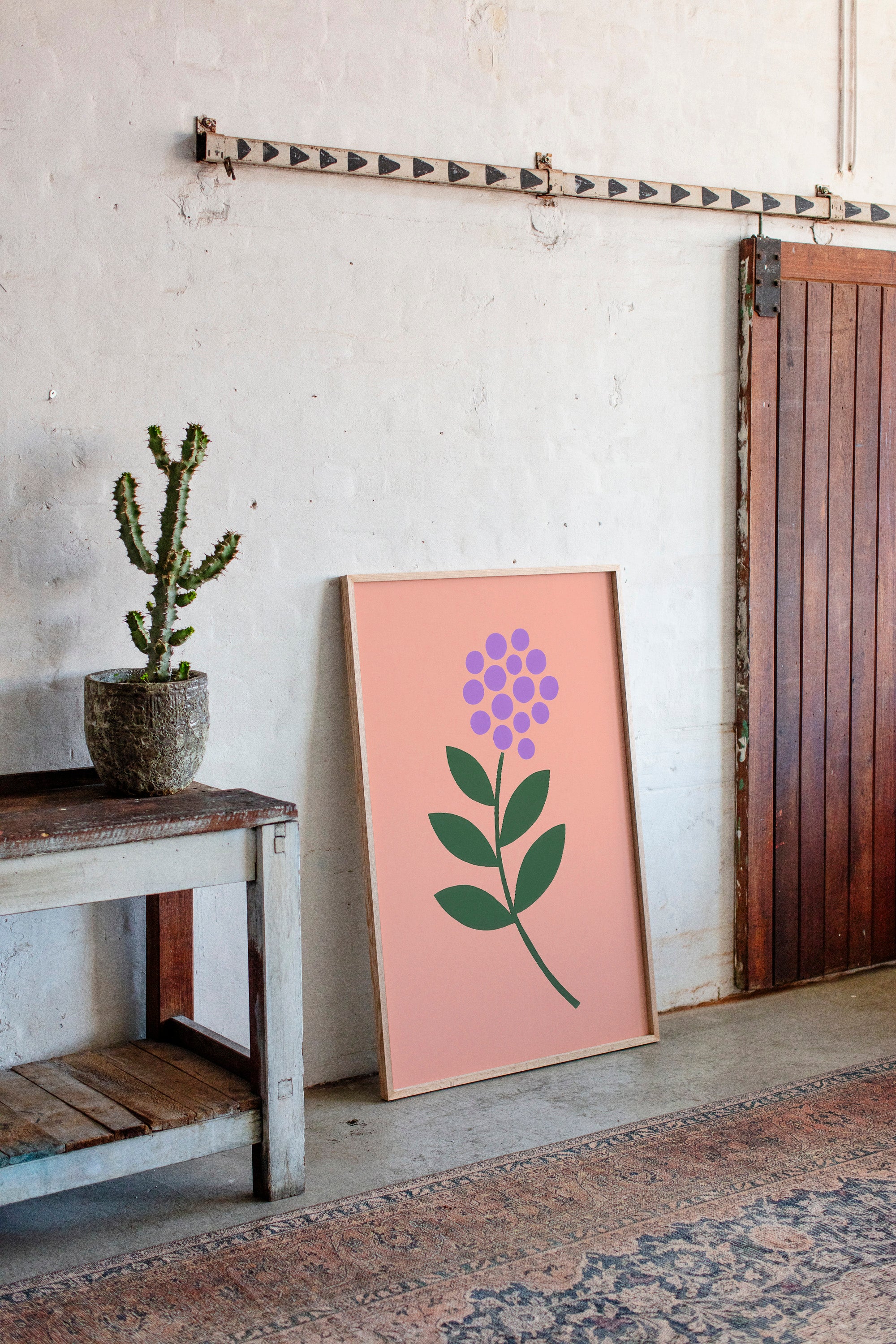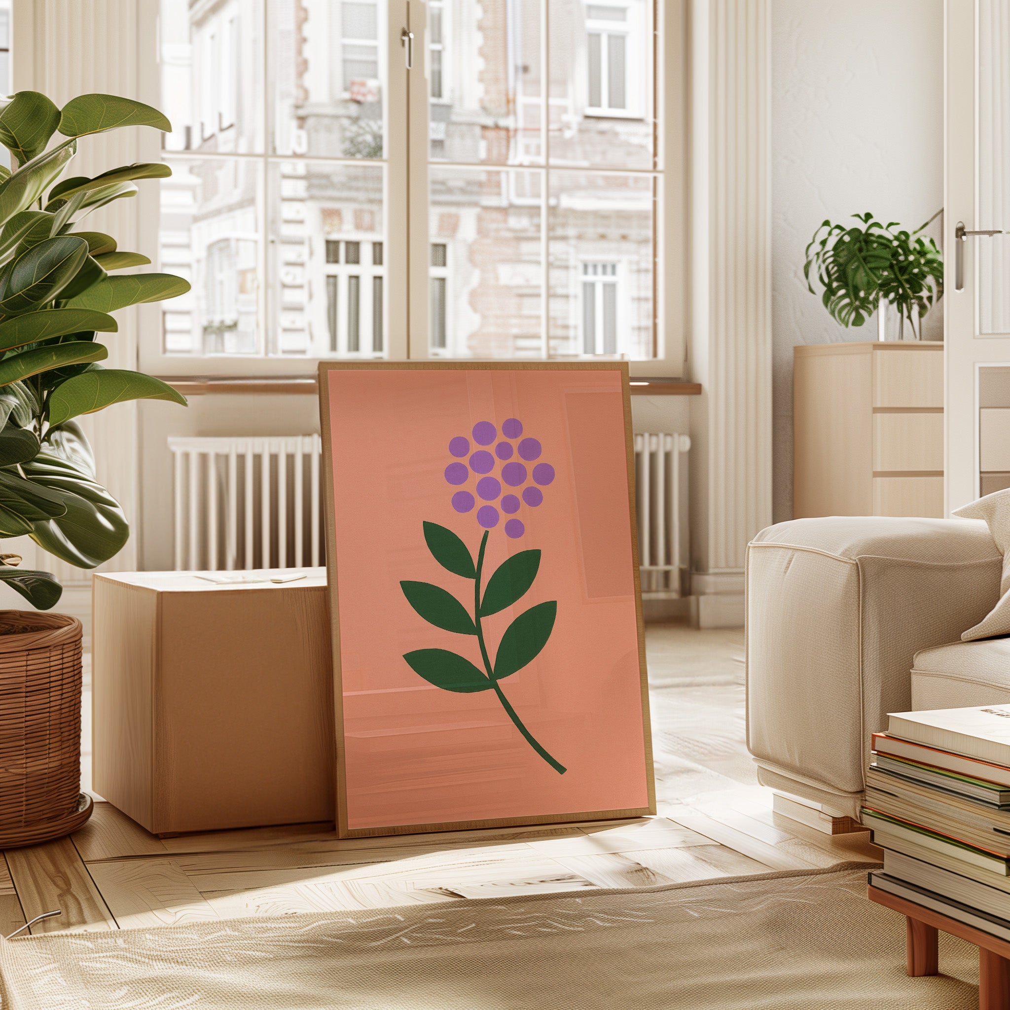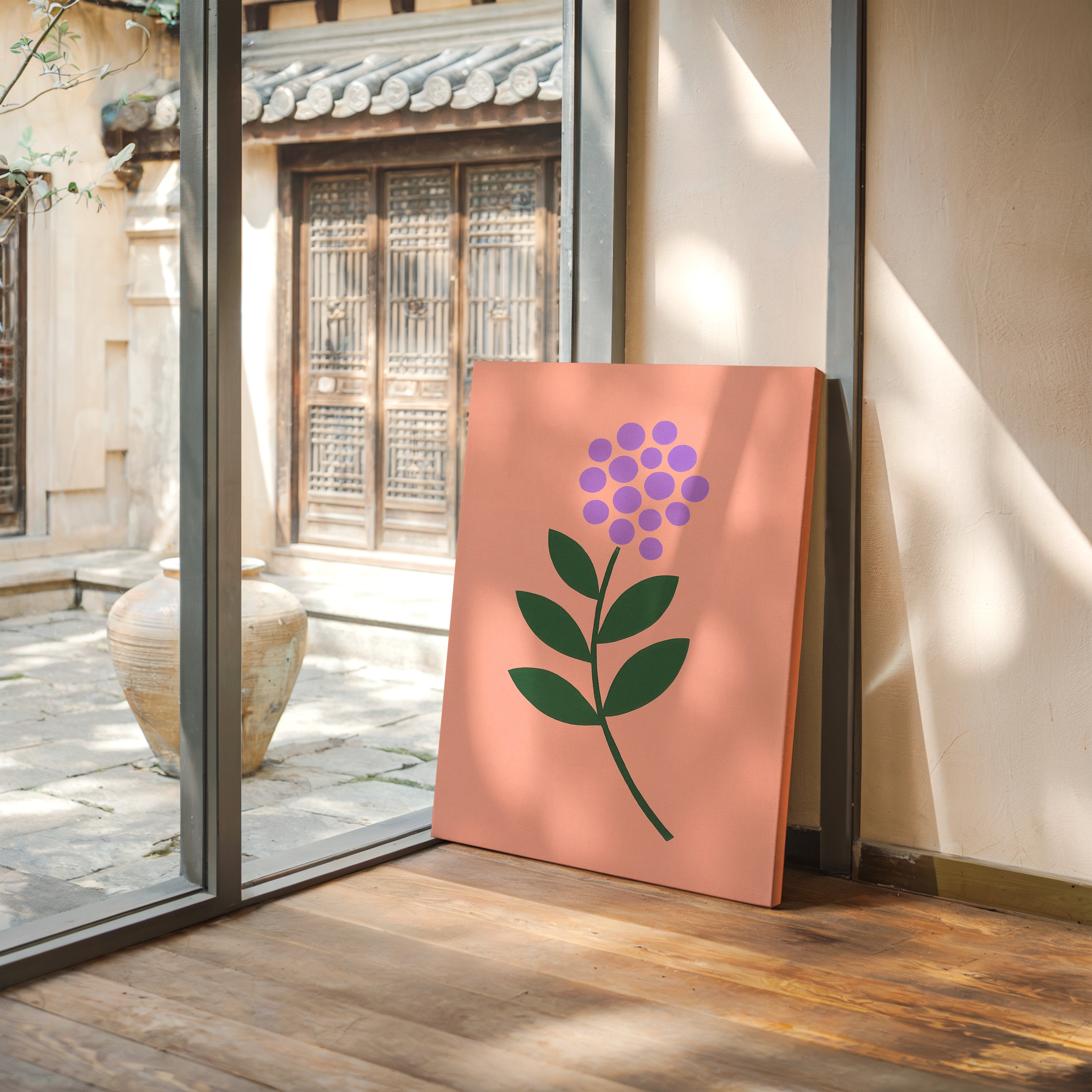 A minimalist botanical composition emerges against a soft coral backdrop, where purple circles cluster to form a delicate flower head. The stark simplicity of emerald leaves creates a bold architectural statement, while maintaining an air of playful sophistication. The intentional use of basic geometric shapes transforms a familiar natural form into something both modern and timeless. Perfect for bringing a touch of contemporary charm to a nursery, home office, or any space seeking a blend of whimsy and refined design.
