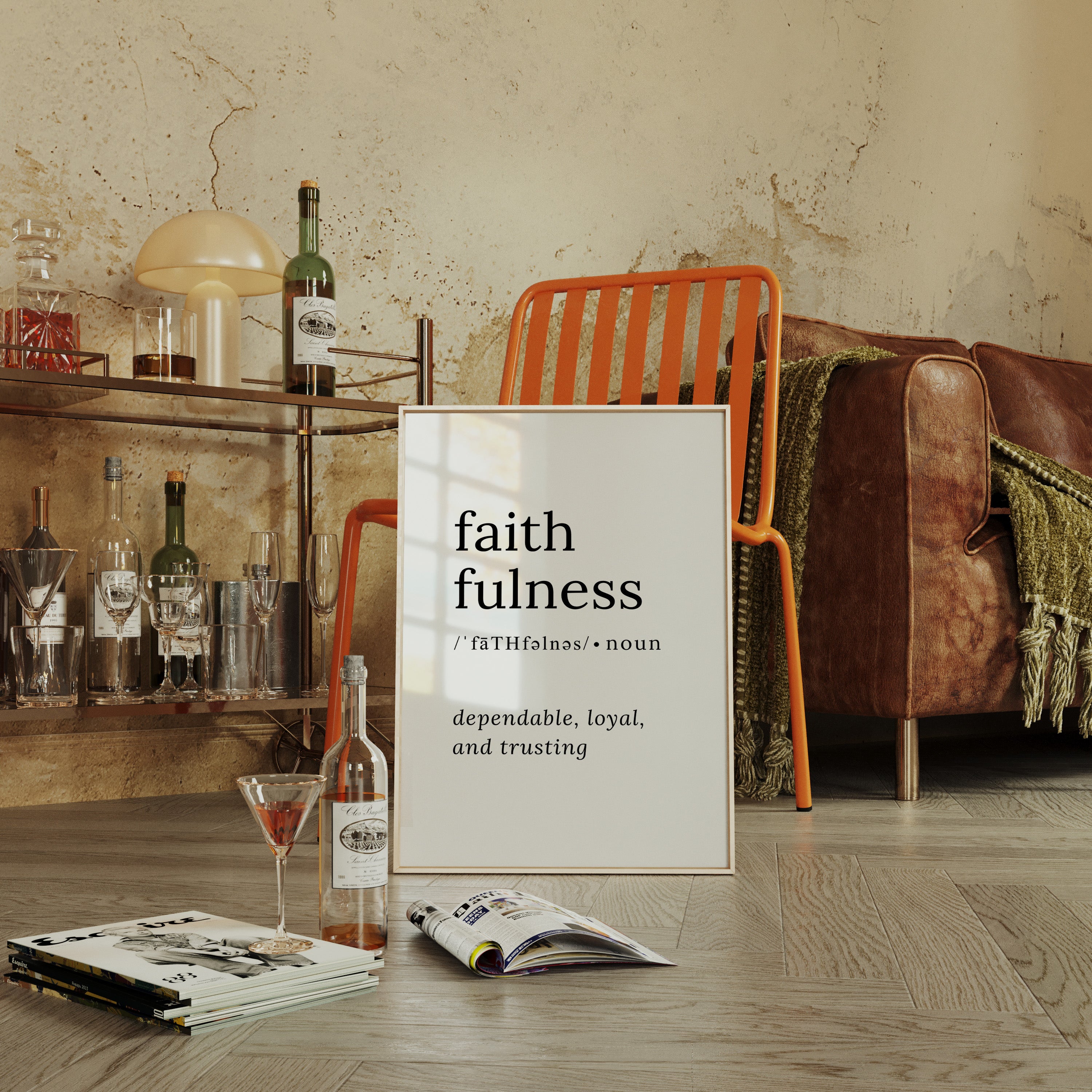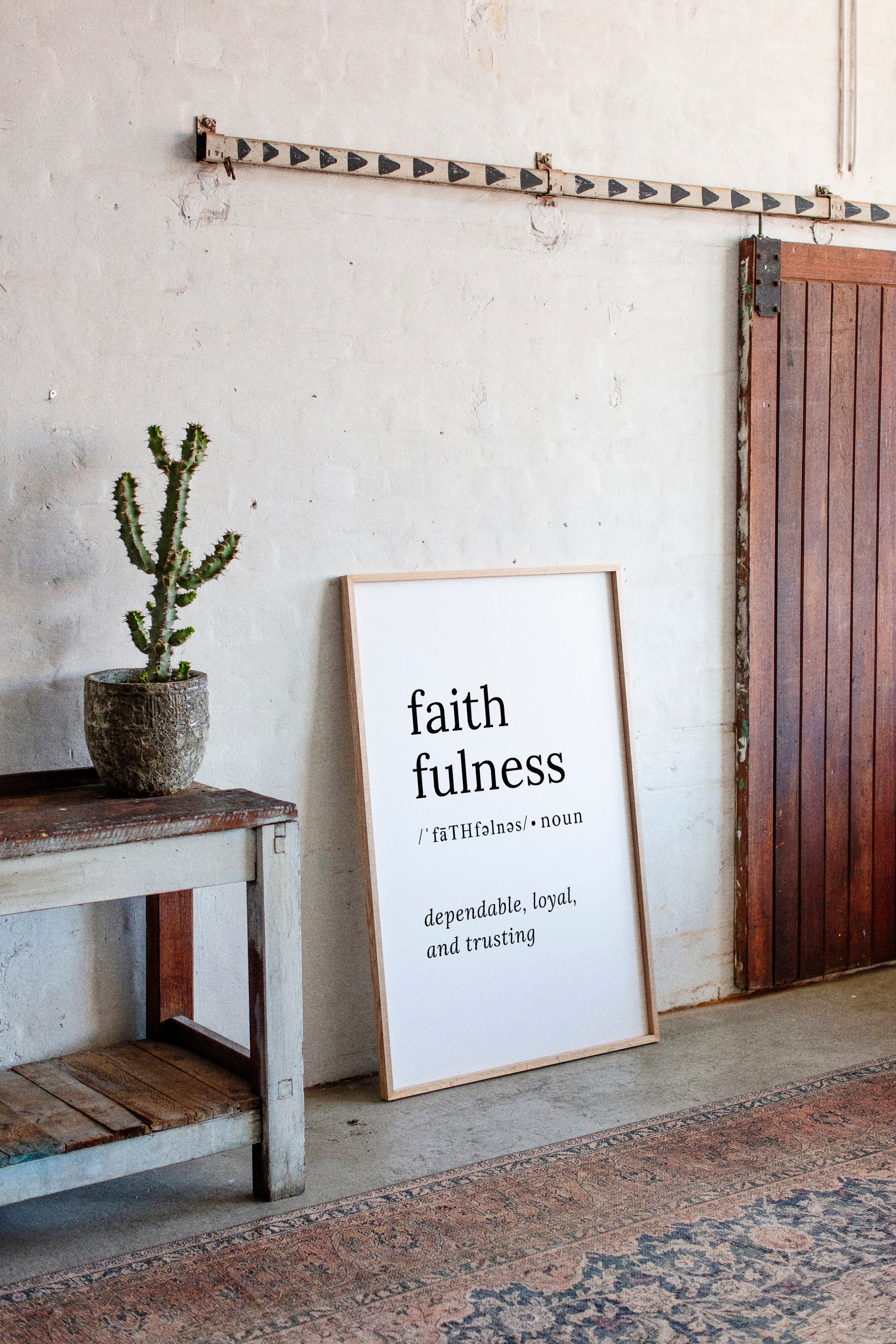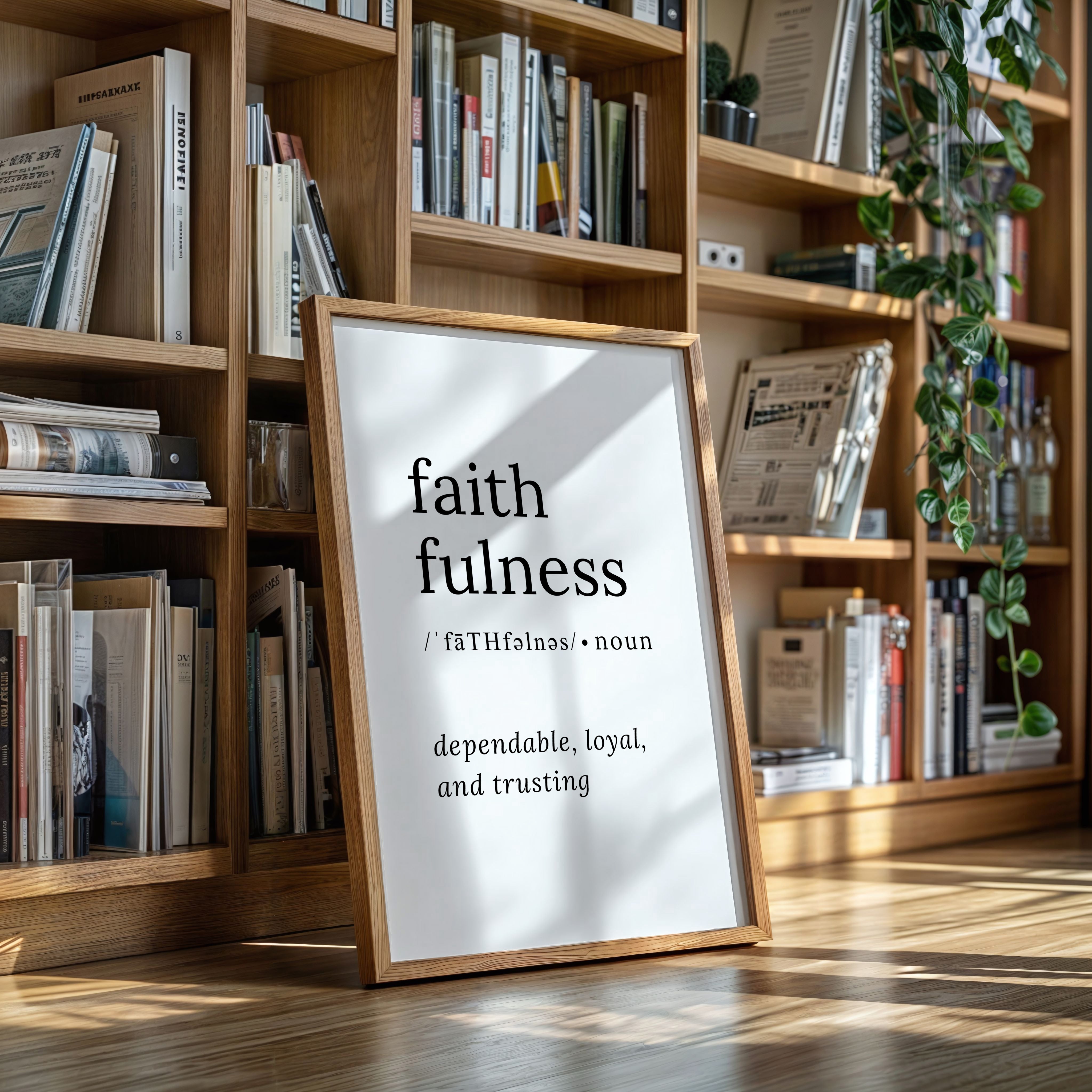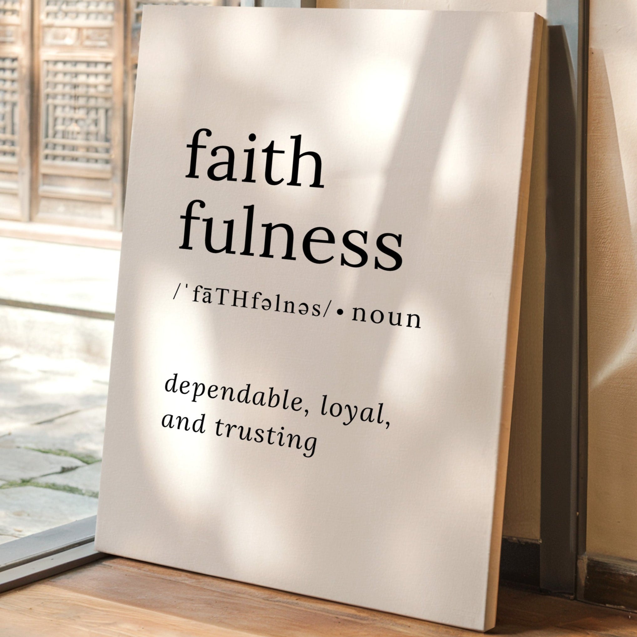 Black letters float against pristine white, carrying weight beyond their minimal form. This piece from our Contemporary collection exemplifies the power of typography as art. The definition unfolds like poetry on the page, each word carefully chosen and placed with intention - faith, faithfulness, pronunciation marks dancing beneath like musical notes. Perfect for a meditation room or personal study, where its message can serve as a daily reminder of life's foundational values. The stark contrast and clean lines create a moment of clarity in any space it graces.