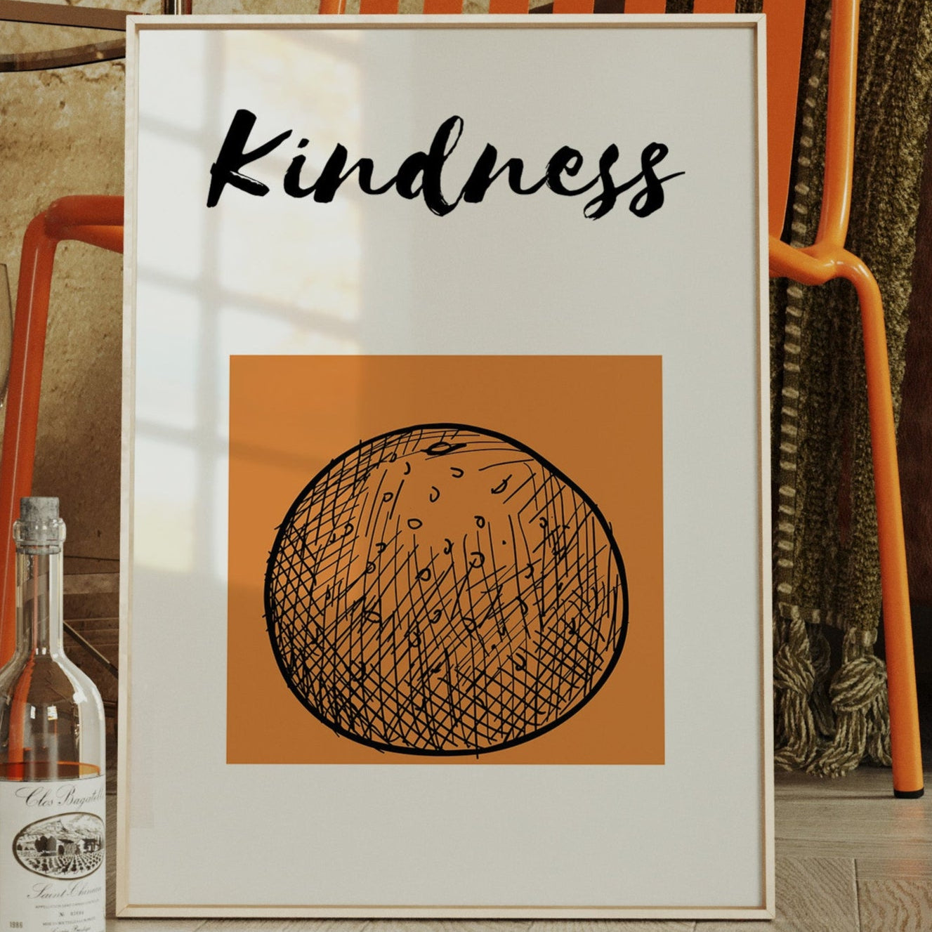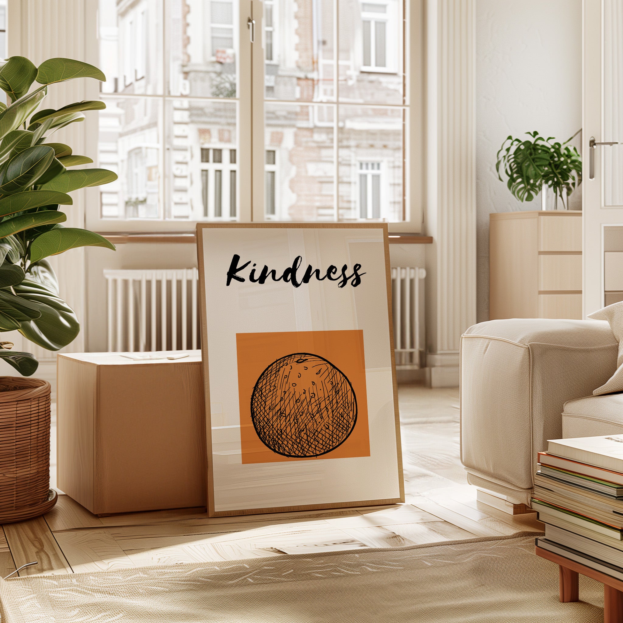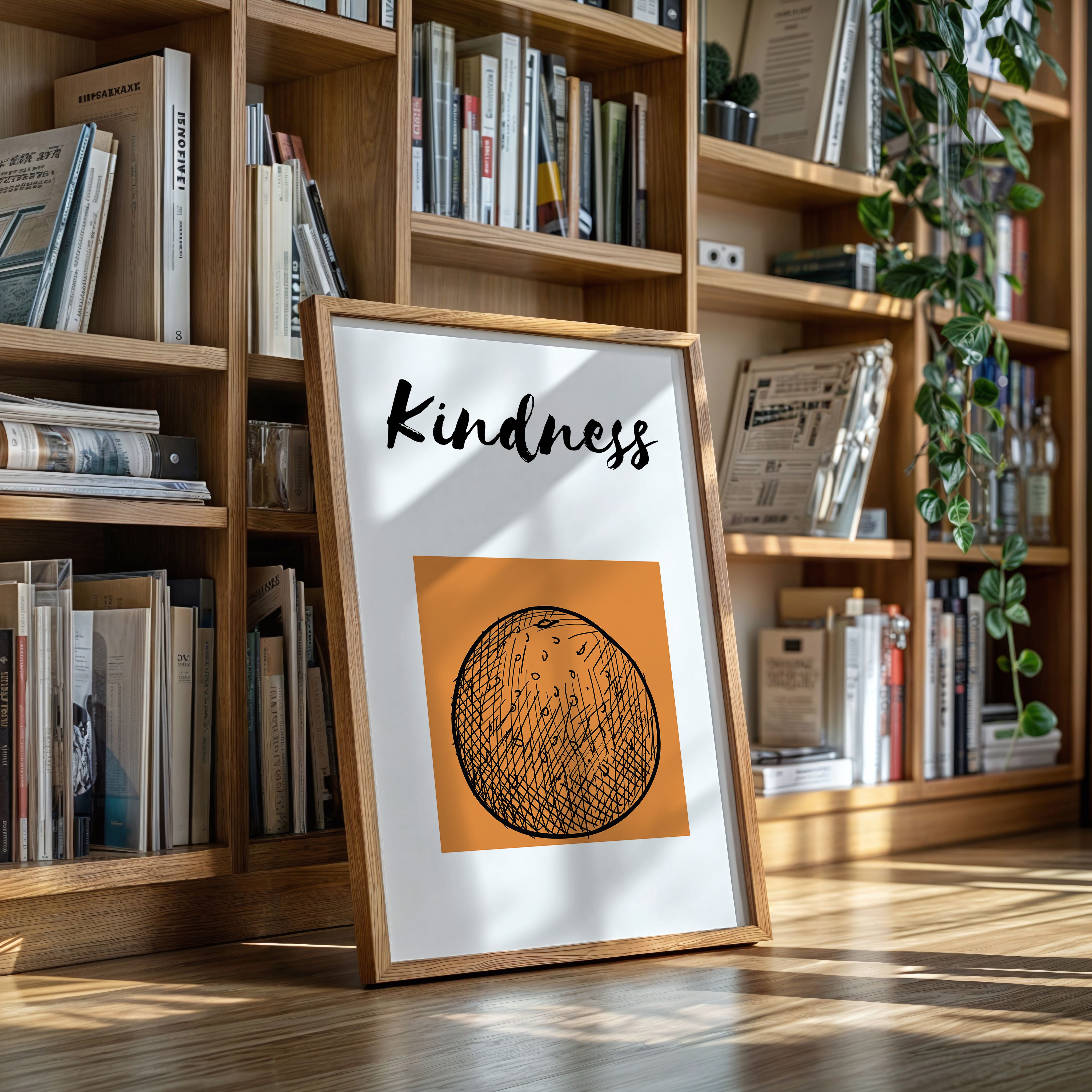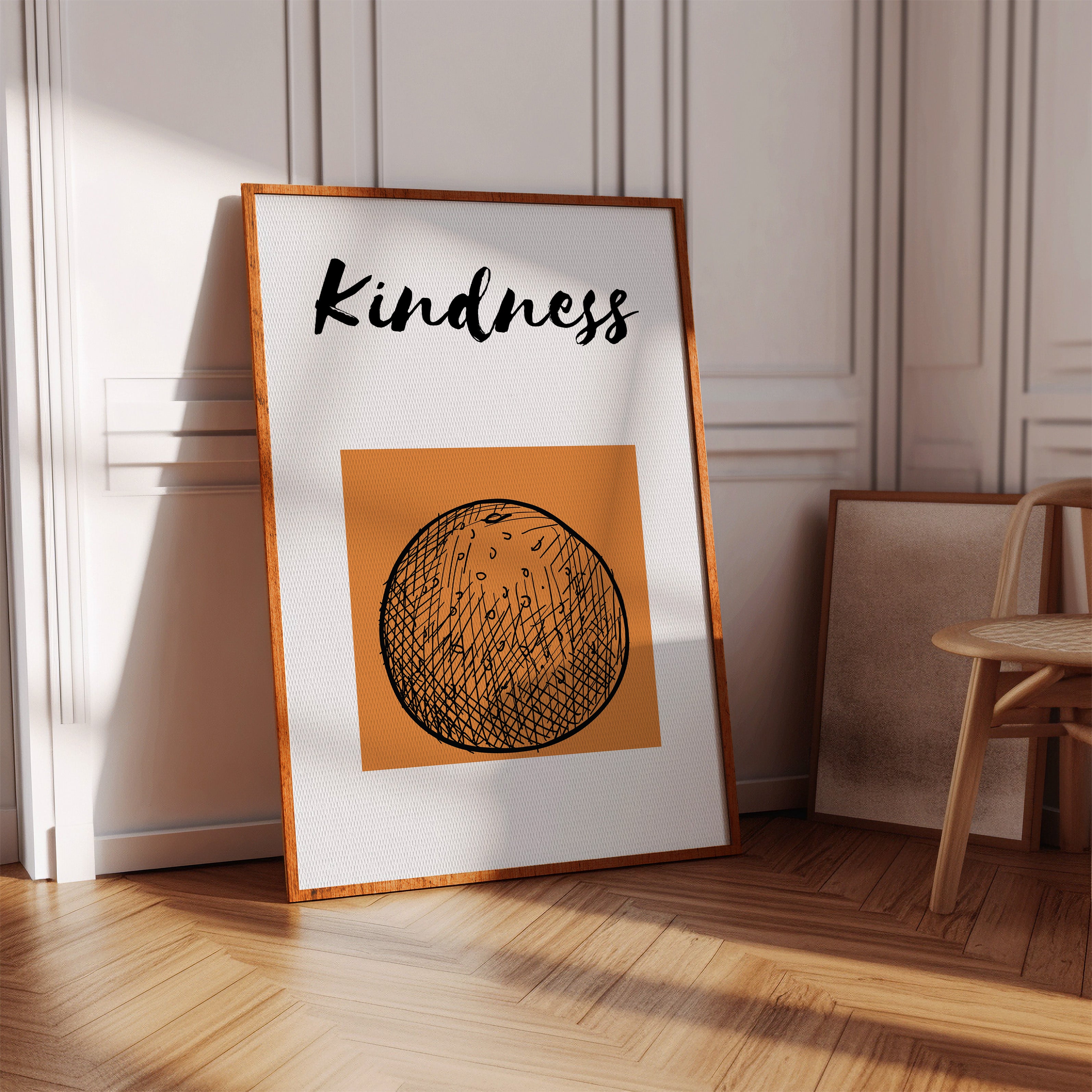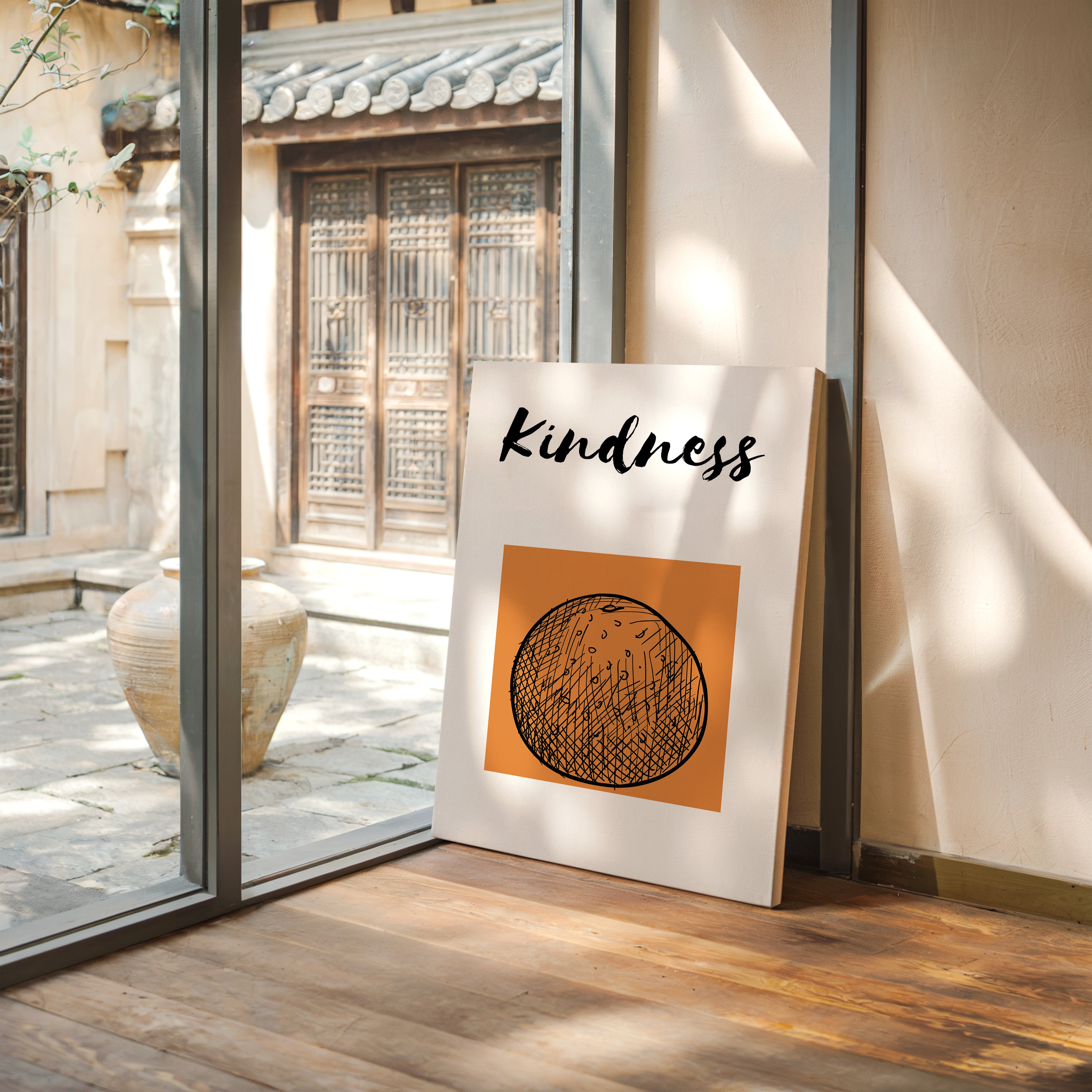 A single word carries the weight of a thousand gestures, bold and gentle against a warm terra cotta sky. This striking contemporary piece captures the essence of modern minimalist expression. The interplay of thick brushstrokes and delicate crosshatching creates a visual meditation on language and intention, while the circular motif below grounds the composition in perfect balance. This piece speaks volumes in any space where daily reminders of compassion matter most - from entryways to home offices. Let it serve as your daily touchstone for leading with heart.