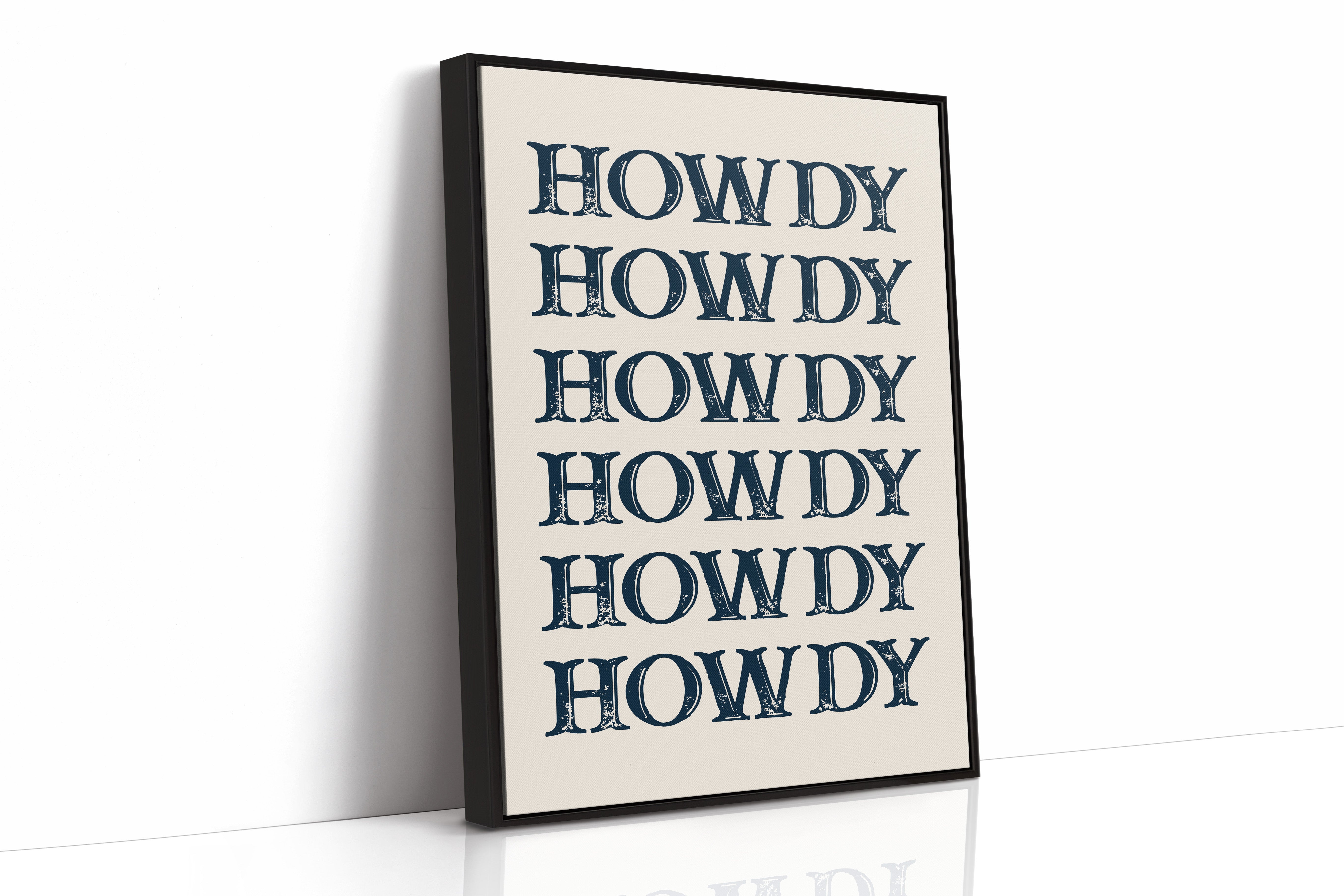 A friendly salutation ripples across the canvas in vintage navy letters, each 'HOWDY' carrying the warmth of a thousand Texas sunsets. The distressed typography speaks of dusty boots and weathered barn wood, while the repetitive pattern creates a mesmerizing rhythm like cattle calls across open plains. This modern take on classic Western charm pairs crisp design with subtle imperfections that whisper tales of frontier hospitality. Perfect for adding a touch of Southern welcome to an entryway, kitchen, or any space seeking a conversation starter with authentic country soul.