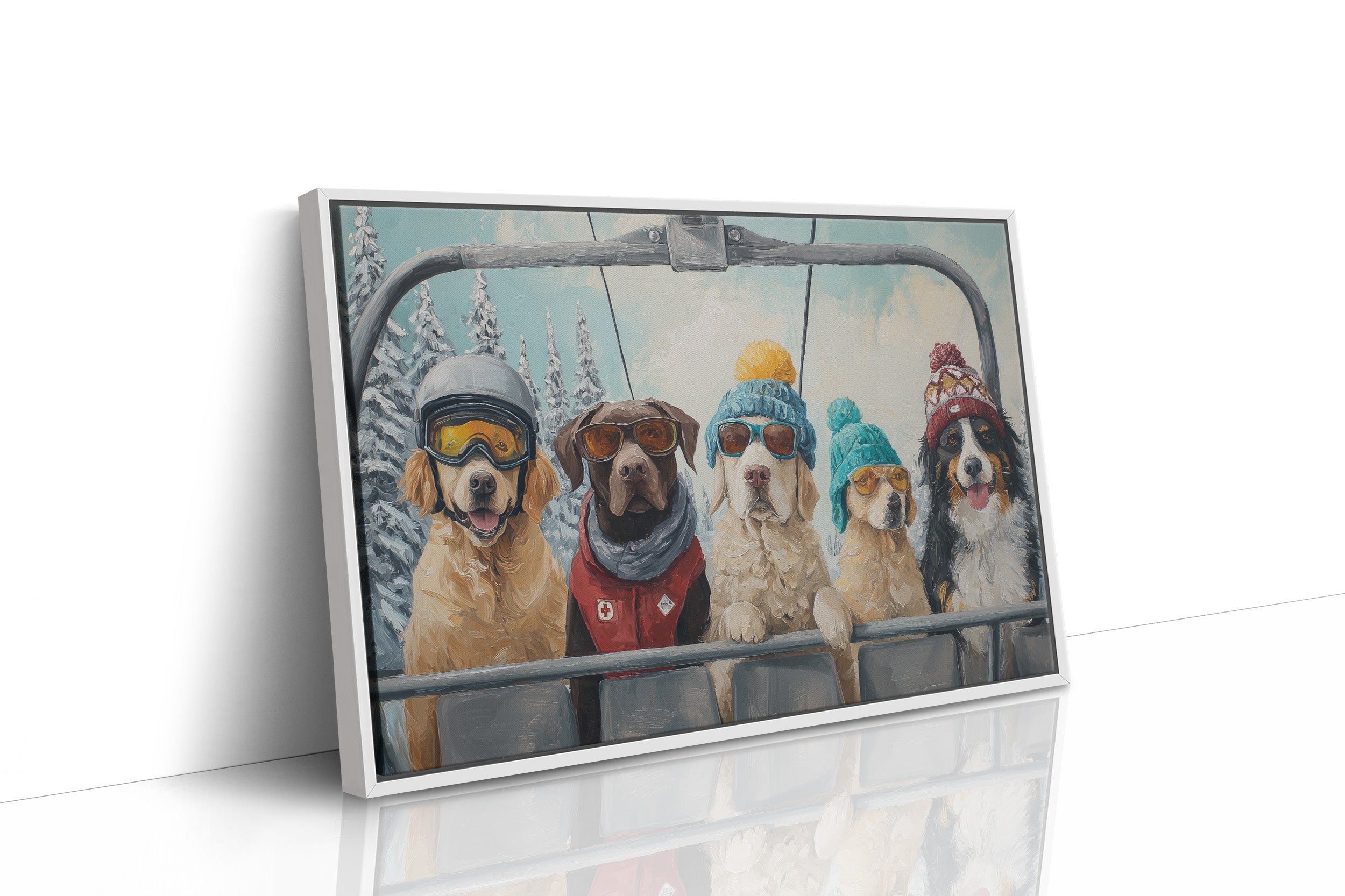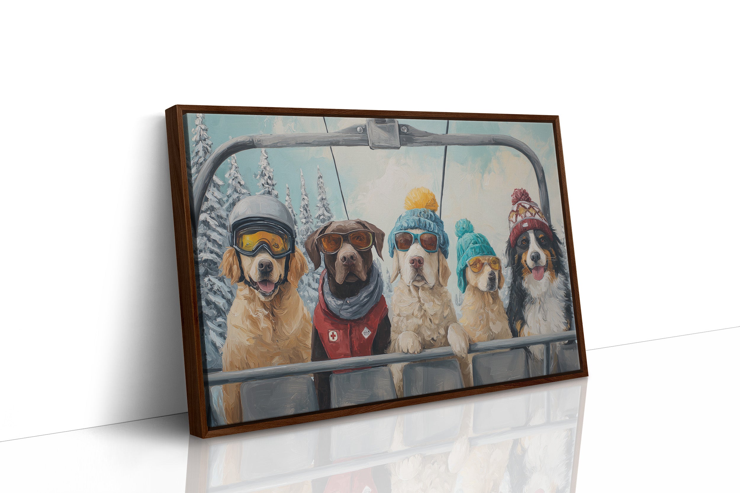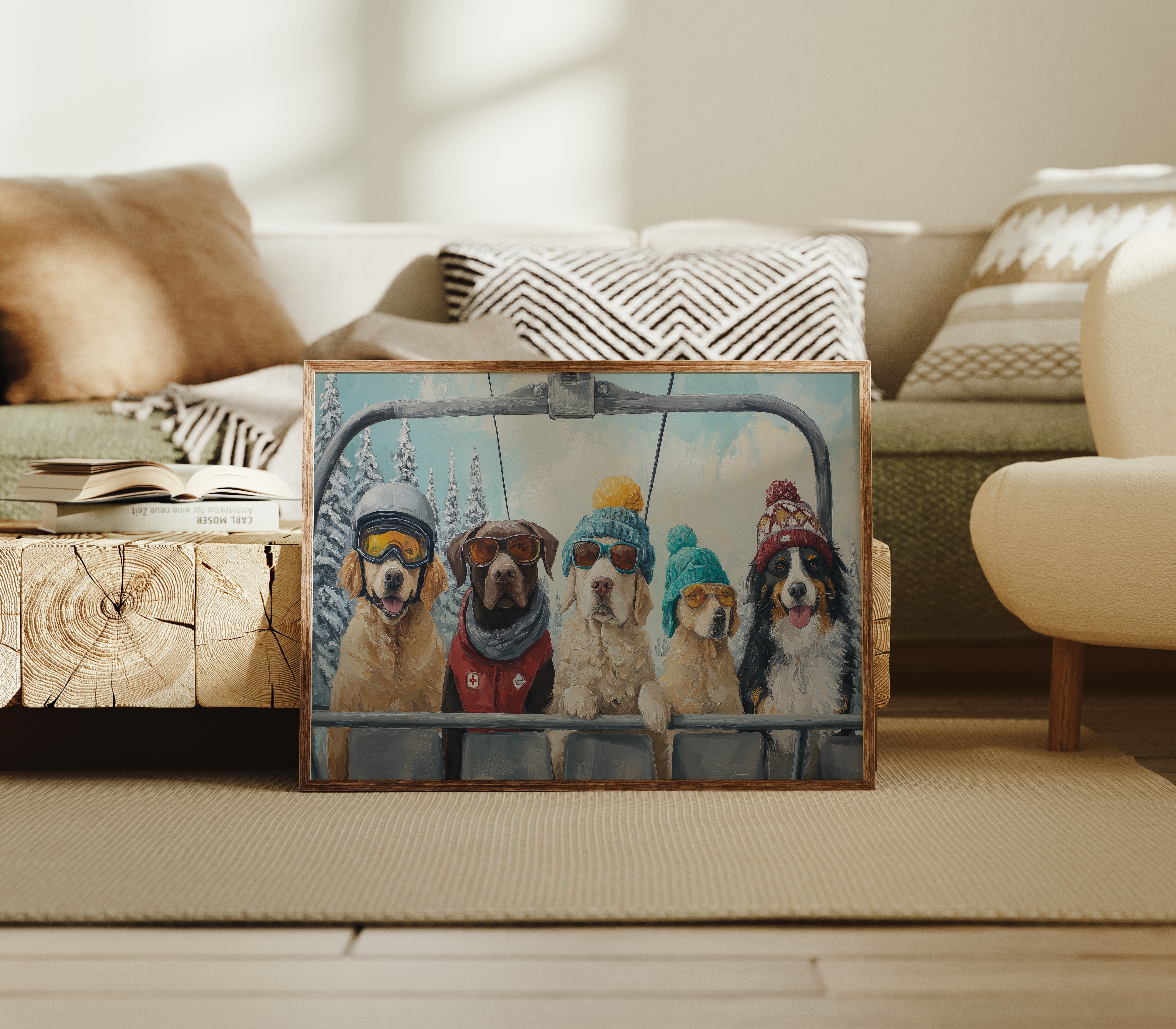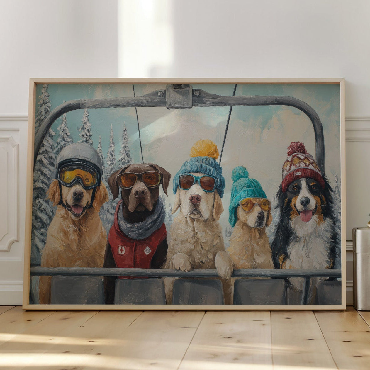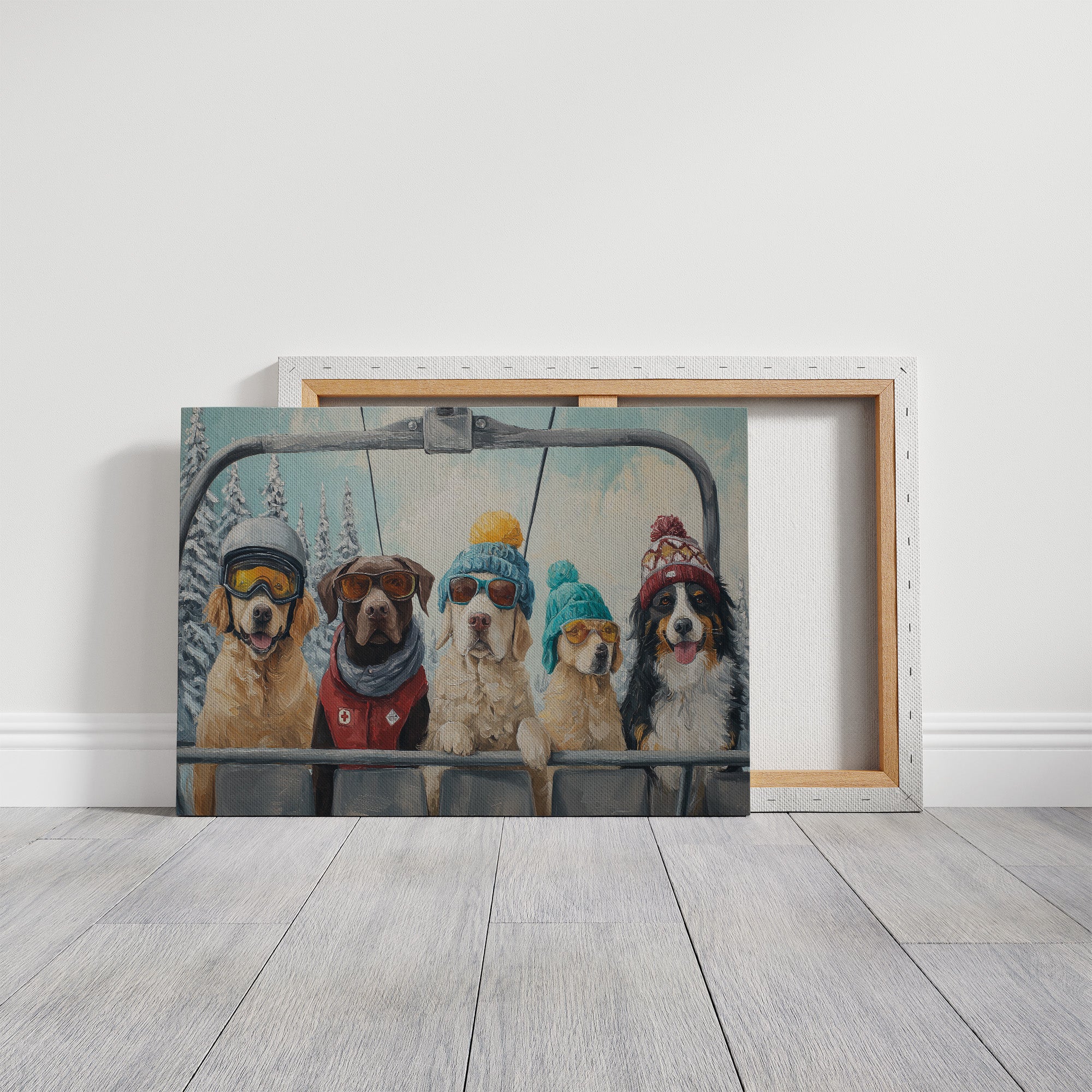 A cheerful scene unfolds as five dogs perch together on a ski lift, each sporting their own winter personality through colorful beanies, goggles, and scarves. The crisp mountain air seems to invigorate their spirits as they pose against a backdrop of snow-dusted evergreens and winter sky. Their expressions range from goofy grins to cool confidence, creating a playful narrative of friendship and adventure in the winter wonderland. This whimsical piece brings warmth and character to any space, perfectly balancing humor with artistic charm. Ideal for a family room, child's bedroom, or mountain cabin where it can spark joy and conversation.