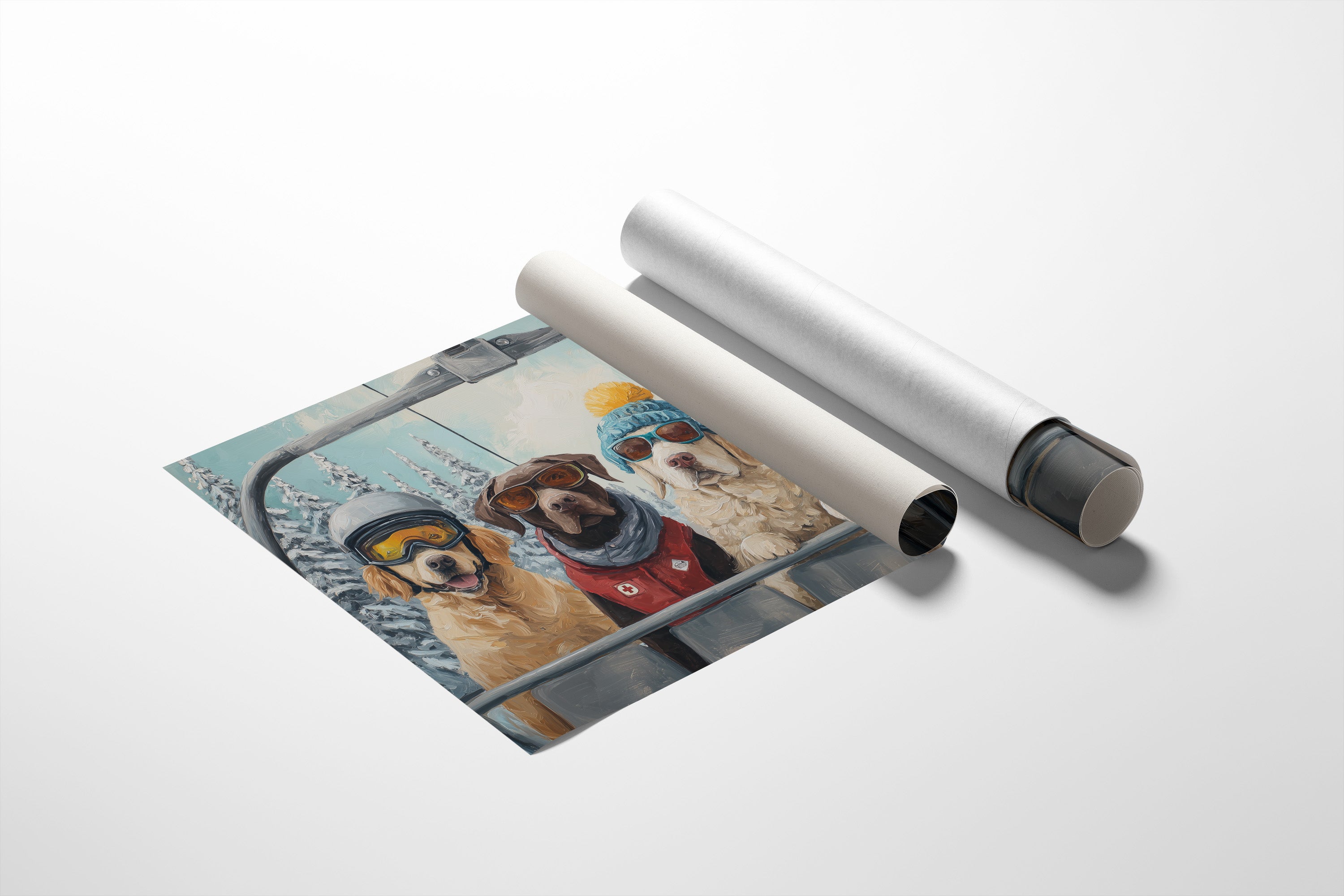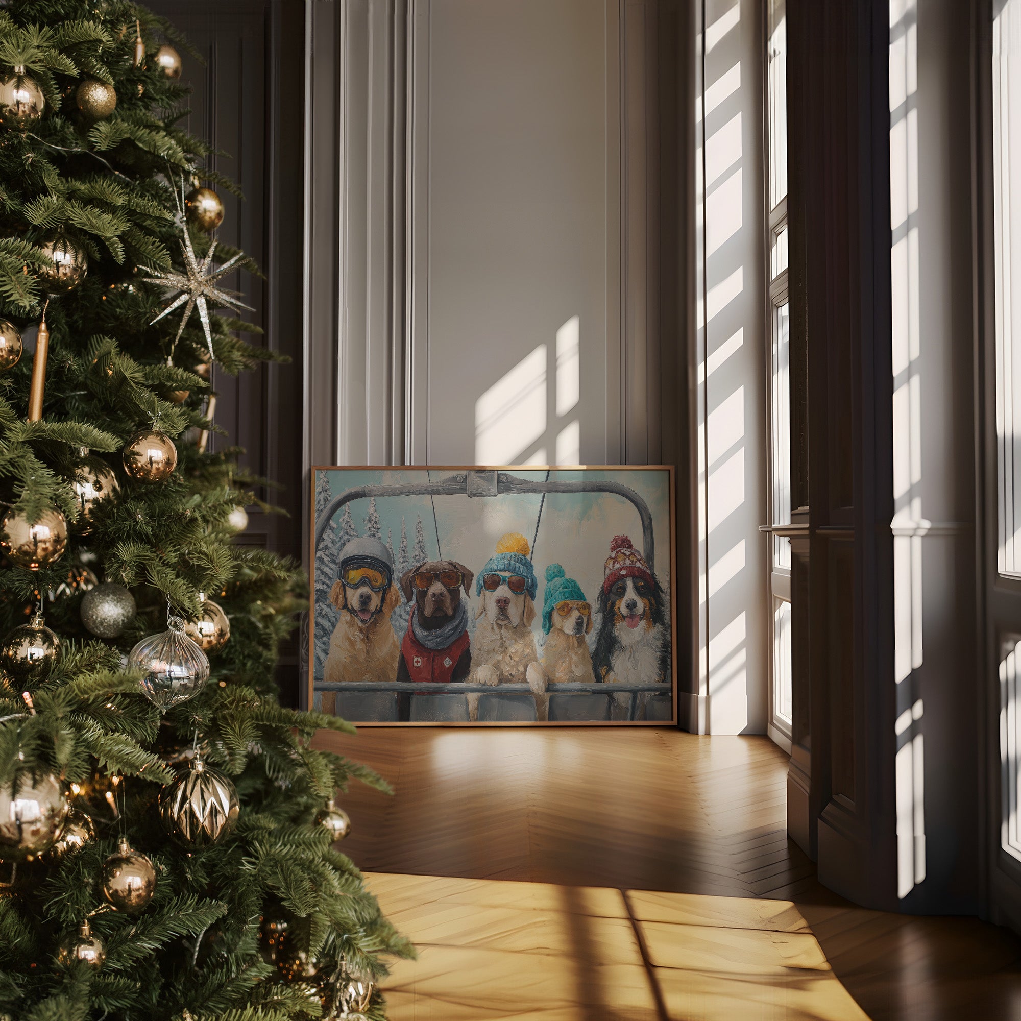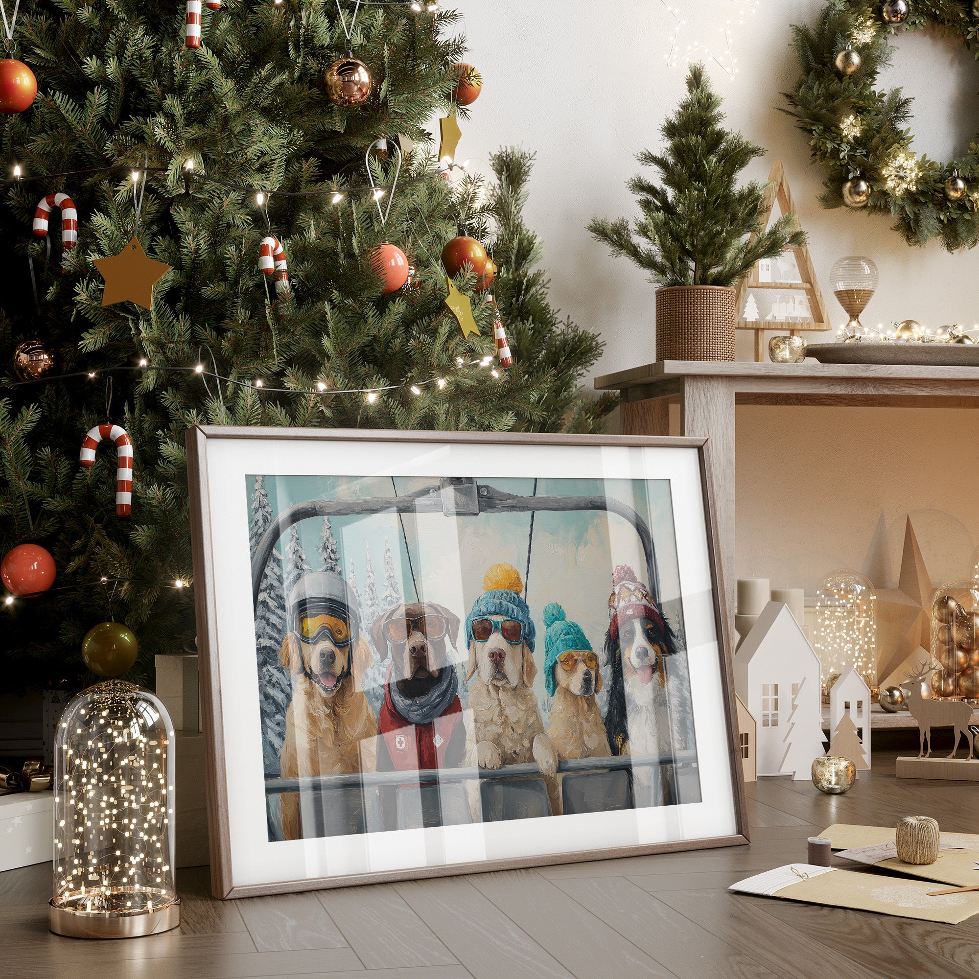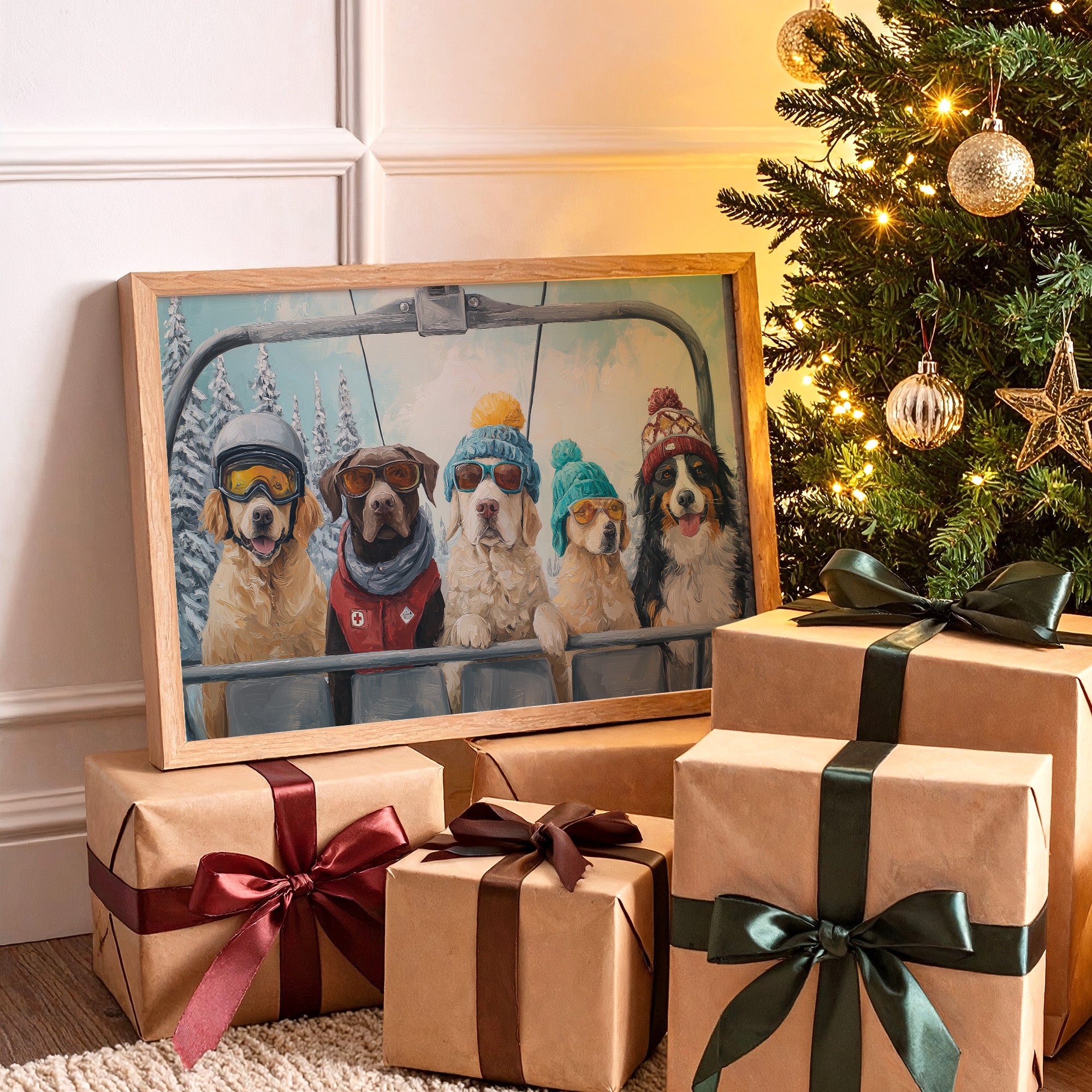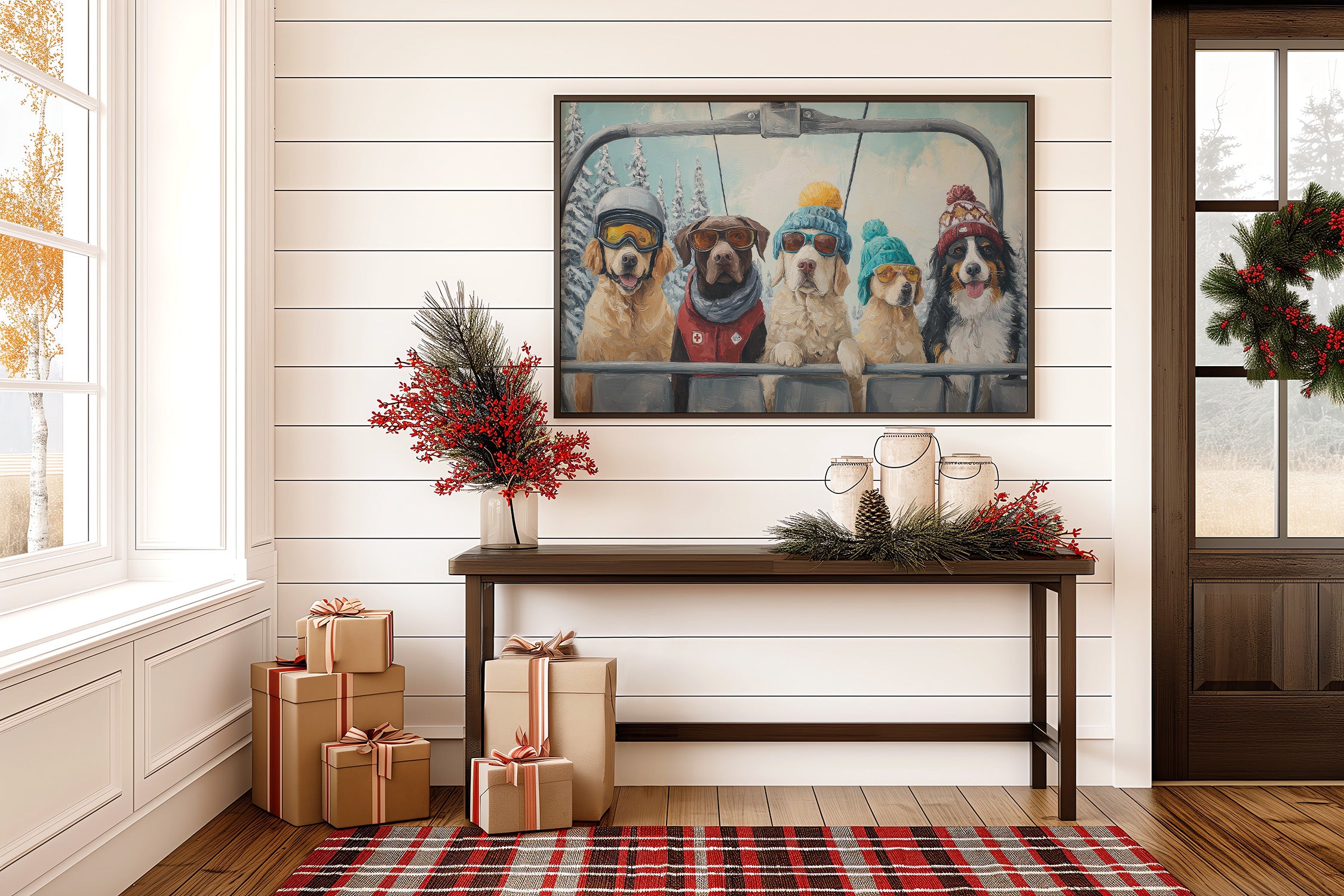 A cheerful scene unfolds as five dogs perch together on a ski lift, each sporting their own winter personality through colorful beanies, goggles, and scarves. The crisp mountain air seems to invigorate their spirits as they pose against a backdrop of snow-dusted evergreens and winter sky. Their expressions range from goofy grins to cool confidence, creating a playful narrative of friendship and adventure in the winter wonderland. This whimsical piece brings warmth and character to any space, perfectly balancing humor with artistic charm. Ideal for a family room, child's bedroom, or mountain cabin where it can spark joy and conversation.