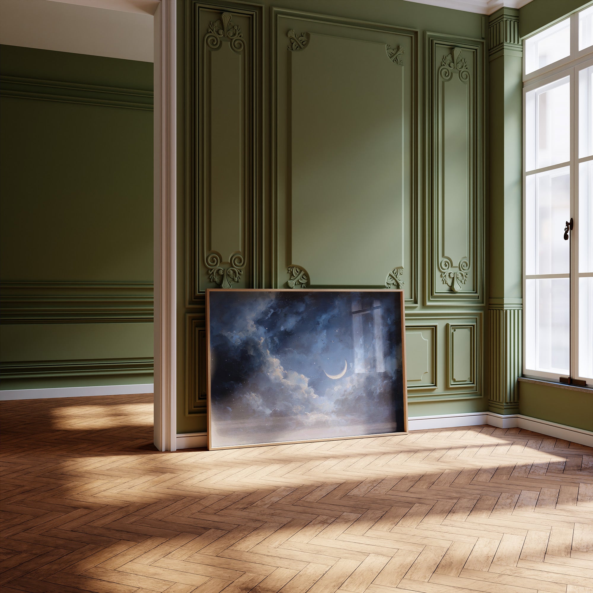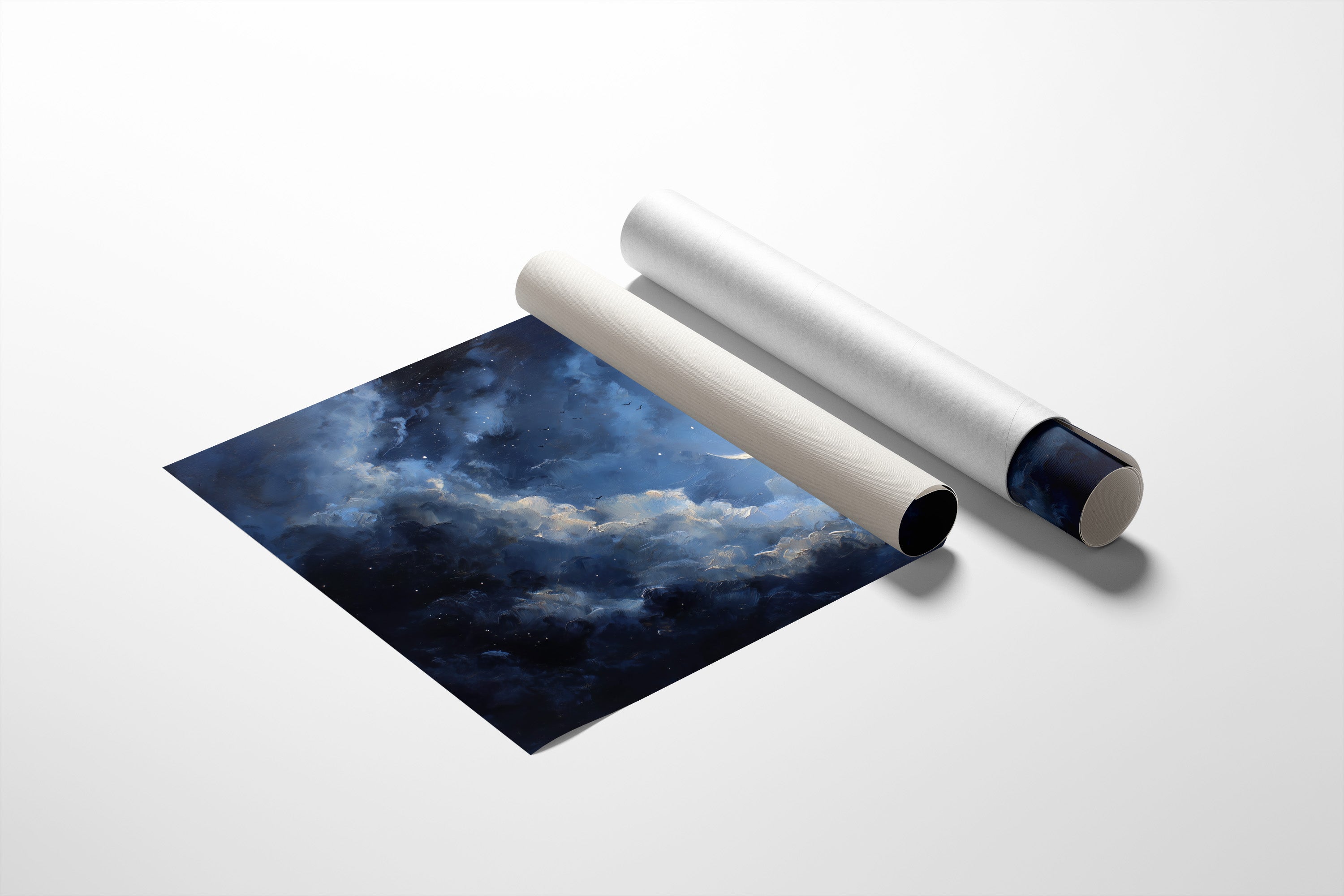 A delicate crescent moon peeks through a tumultuous sky of deep blues and midnight hues. The celestial painting captures that fleeting moment when light breaks through darkness, with billowing clouds swirling around the glowing lunar slice. The dramatic contrast between the illuminated moon and the moody atmosphere creates a contemplative scene that speaks to both solitude and hope.