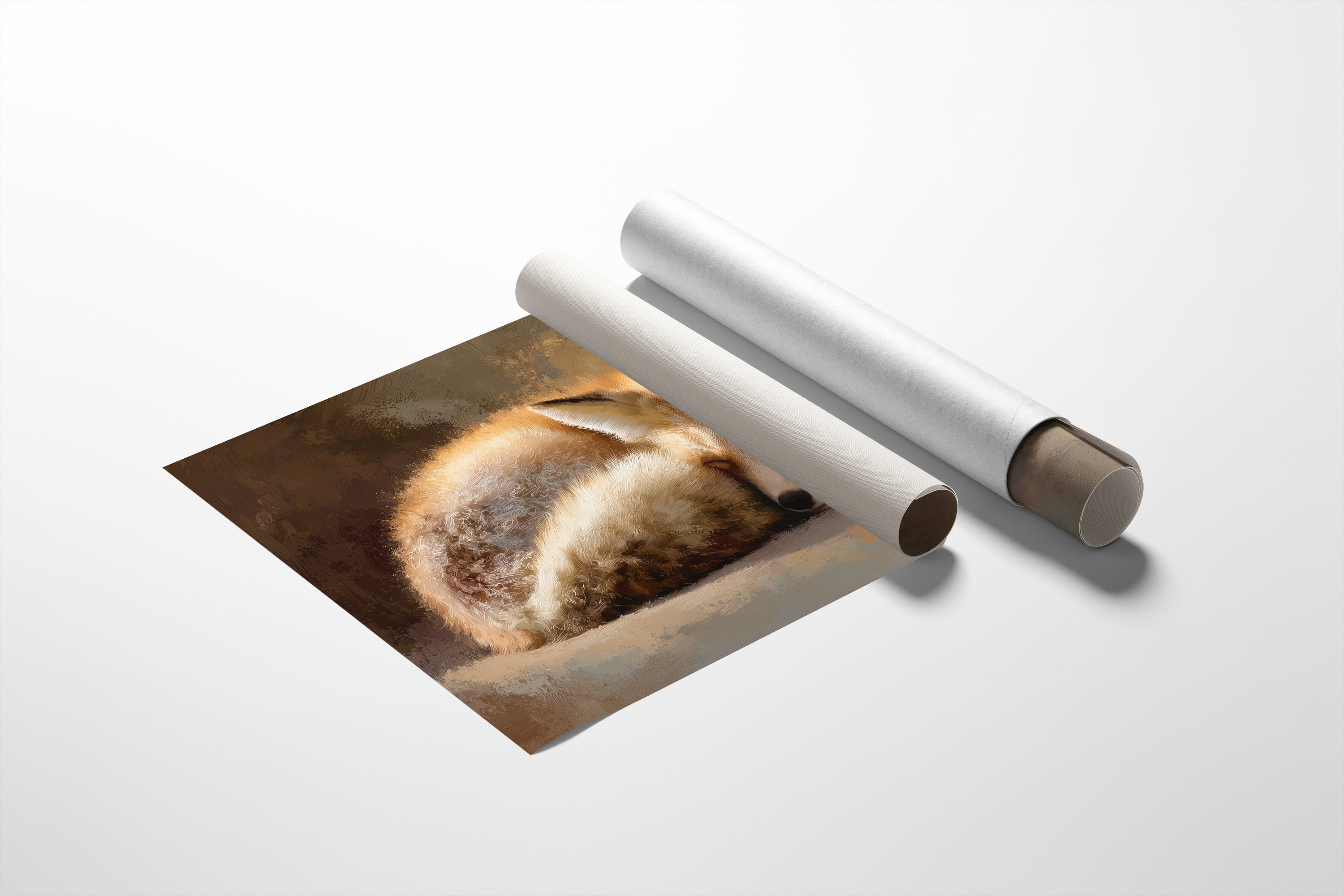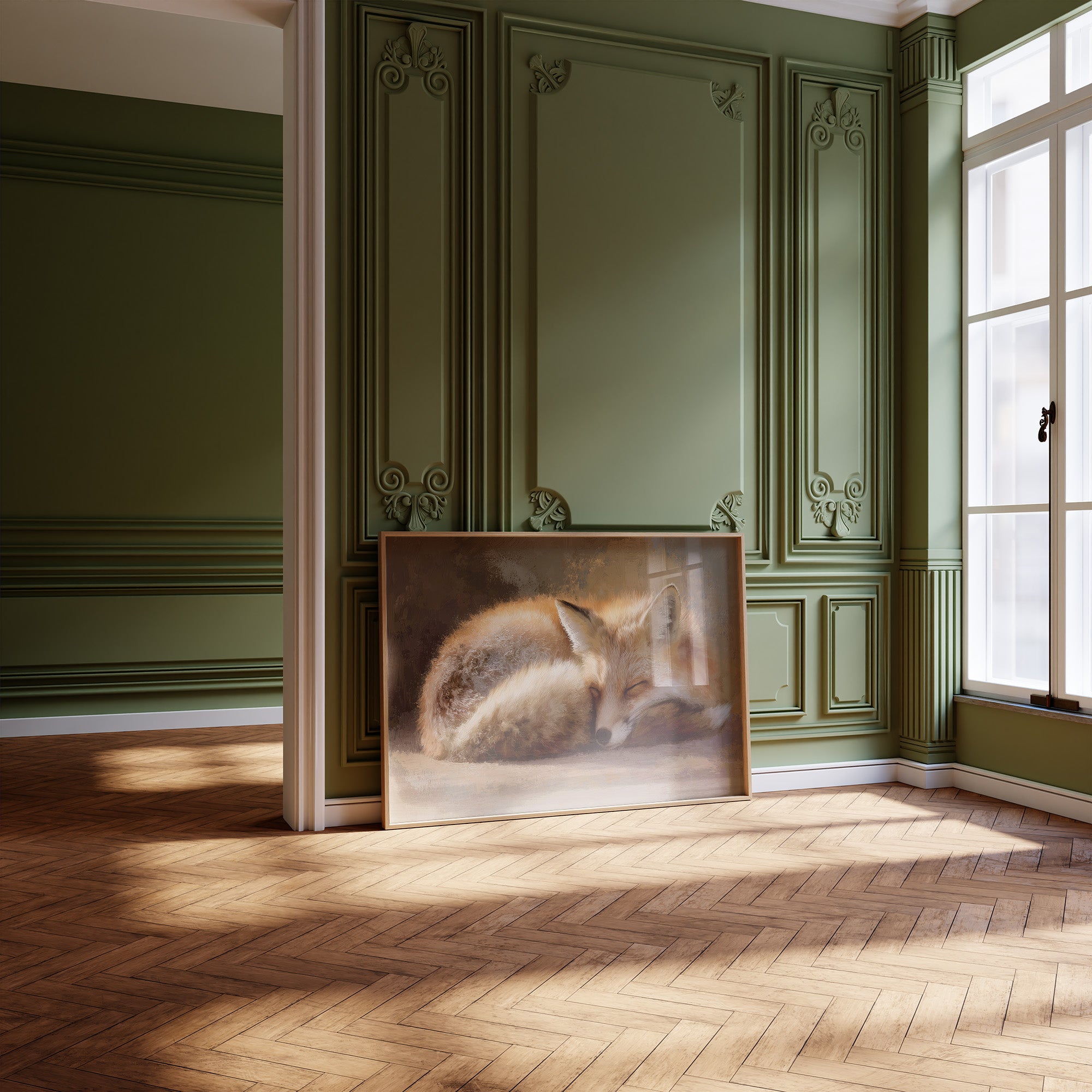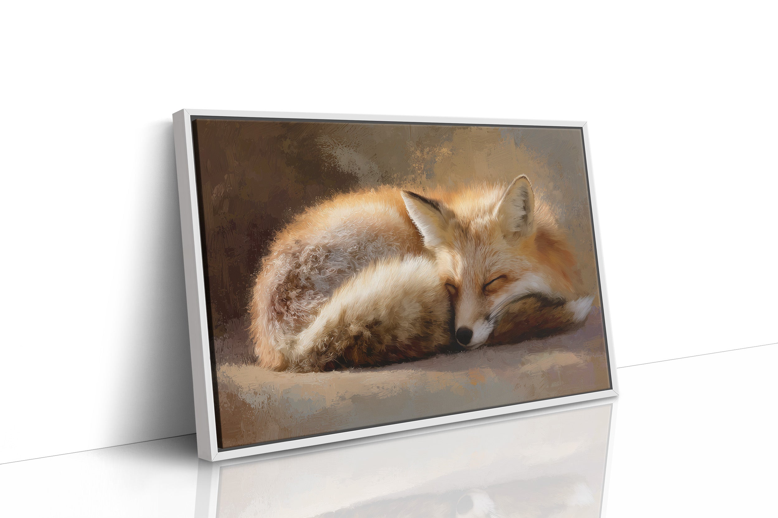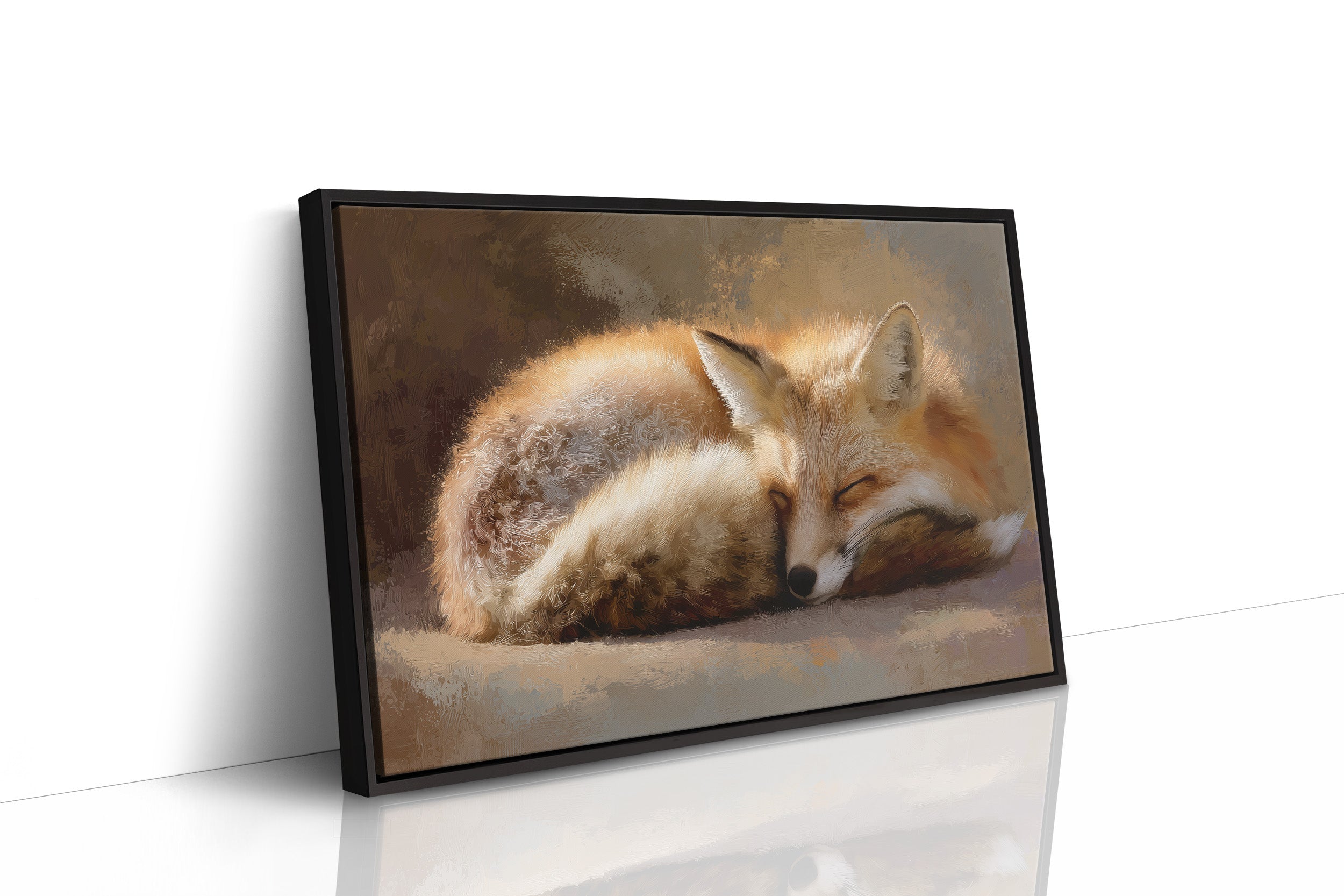 A russet fox curls into itself, caught in peaceful repose within an elegant frame. Golden fur catches imaginary light against a soft backdrop of amber and earth tones, the creature's gentle presence a contrast to the scholarly surroundings. Behind the framed artwork, wooden shelves stretch upward, lined with leather-bound volumes and cloth spines in cream, burgundy, and navy a bibliophile's sanctuary. This contemplative piece brings natural serenity to a home office, reading nook, or any space where thoughtful moments are cherished.