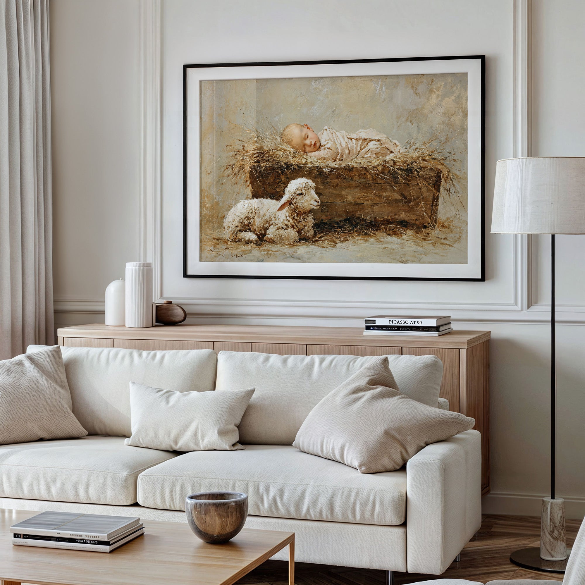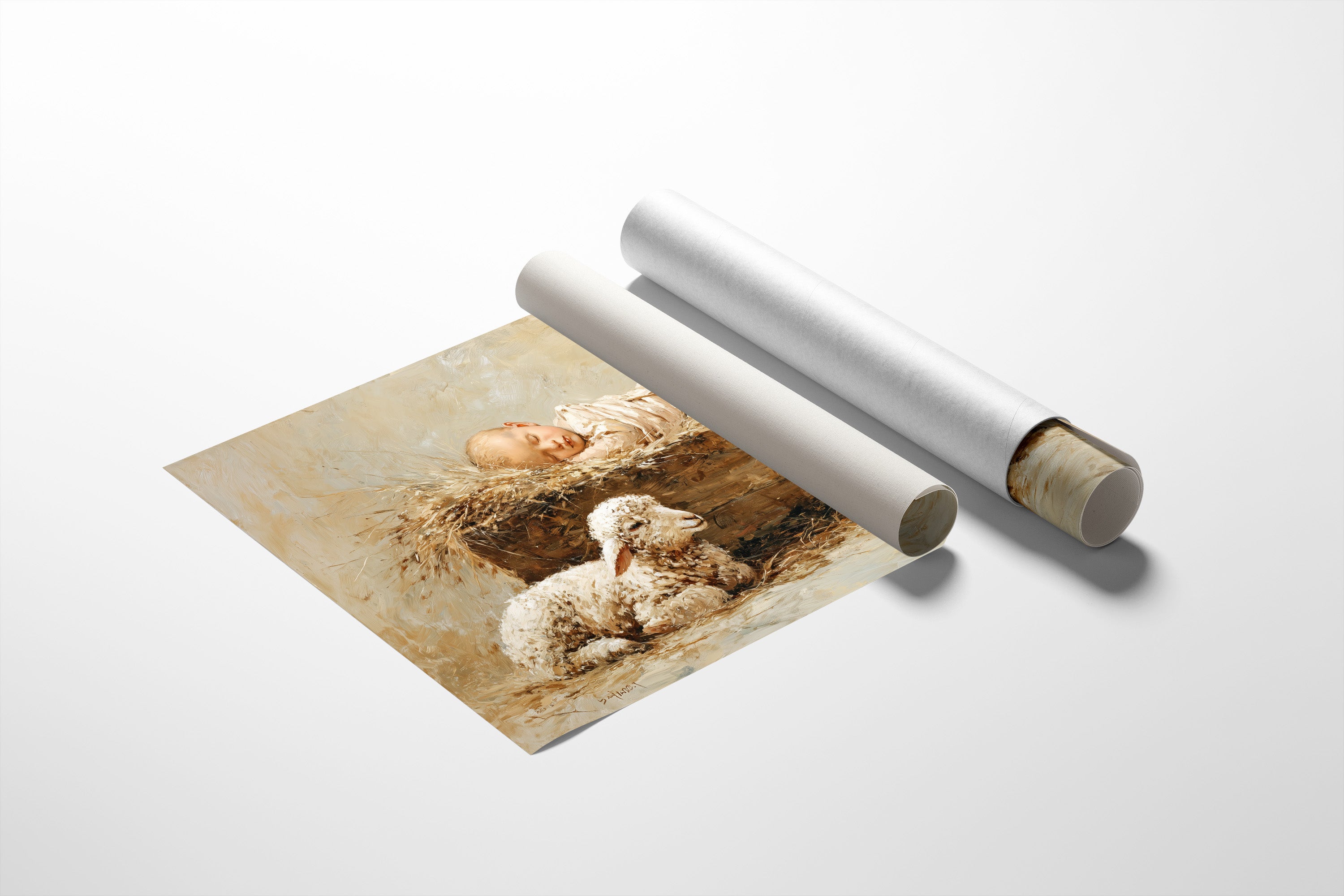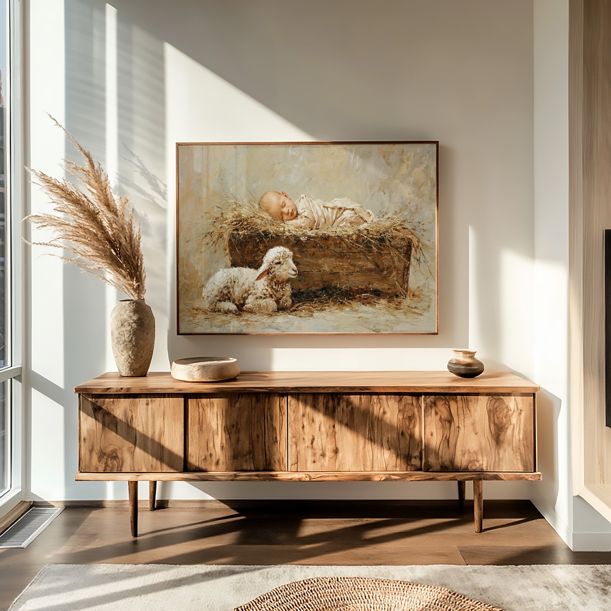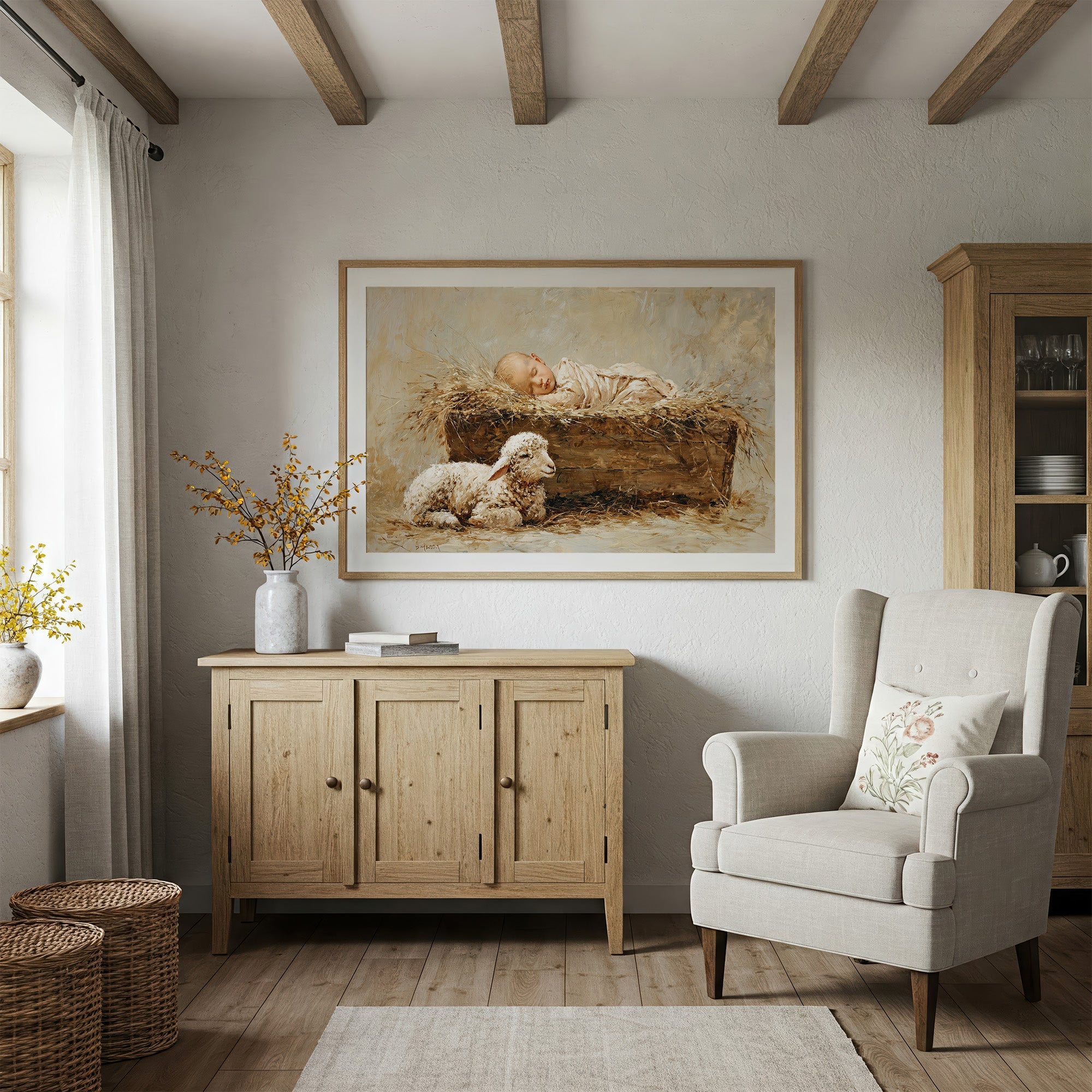 Warmth radiates from this tender scene where innocence rests in rustic simplicity. A sleeping infant nestles in a bed of golden hay, watched over by a gentle lamb below, their peaceful communion captured in soft, ethereal brushstrokes. The artist's muted palette of creams, golds, and earthy browns creates a timeless quality, evoking the quiet sanctity of new life and ancient bonds between humanity and nature. This evocative piece brings serenity to a nursery, reading nook, or living space where contemplative beauty is treasured.