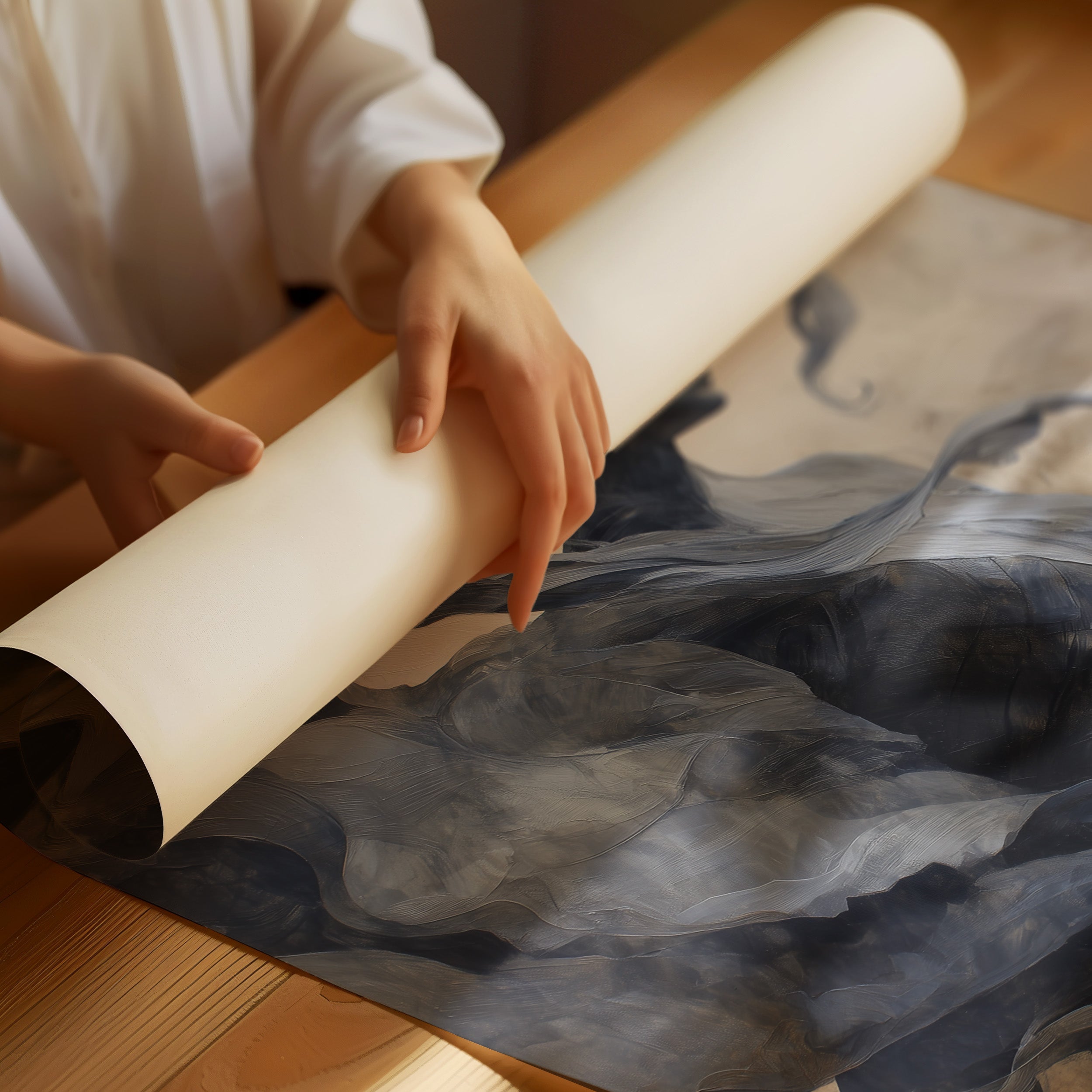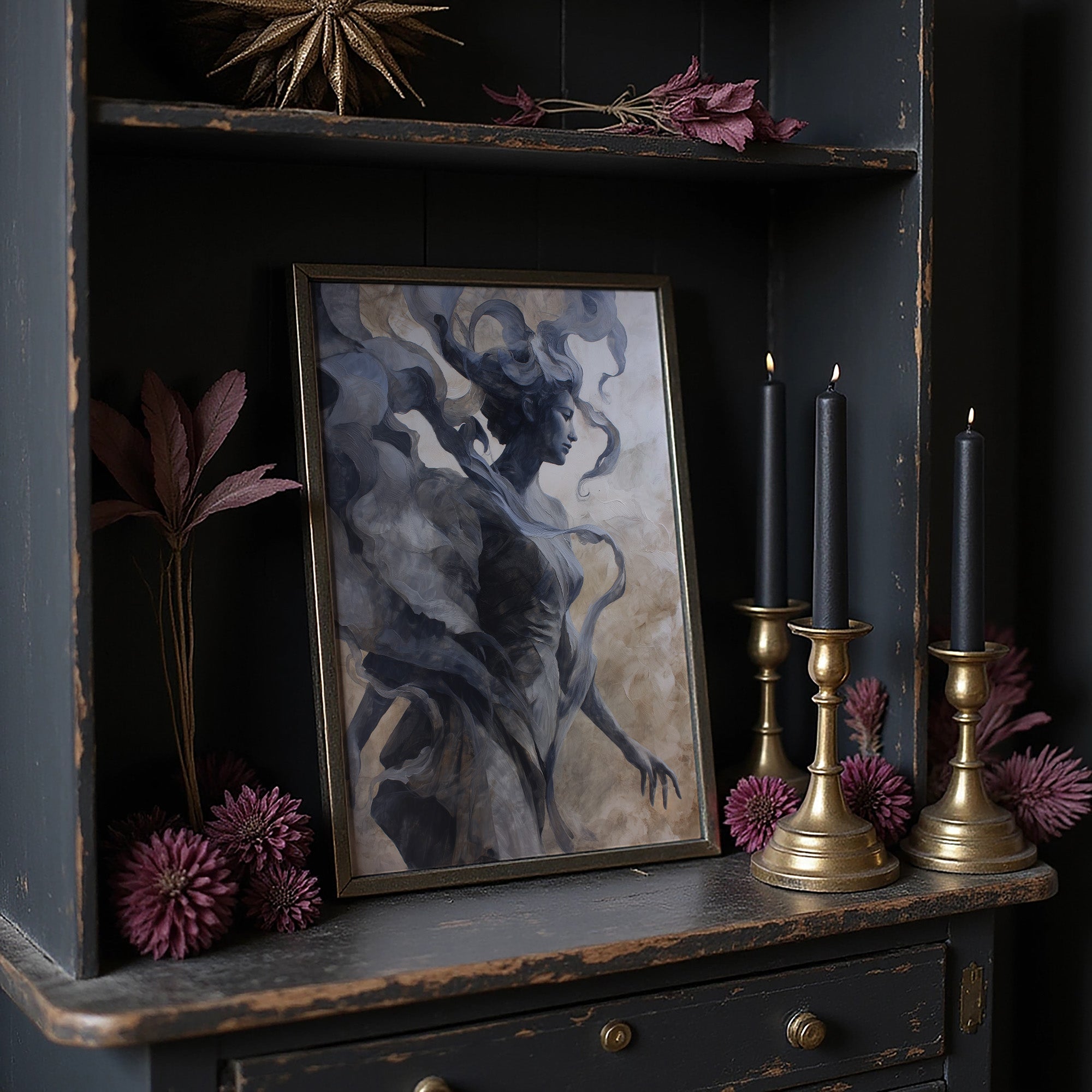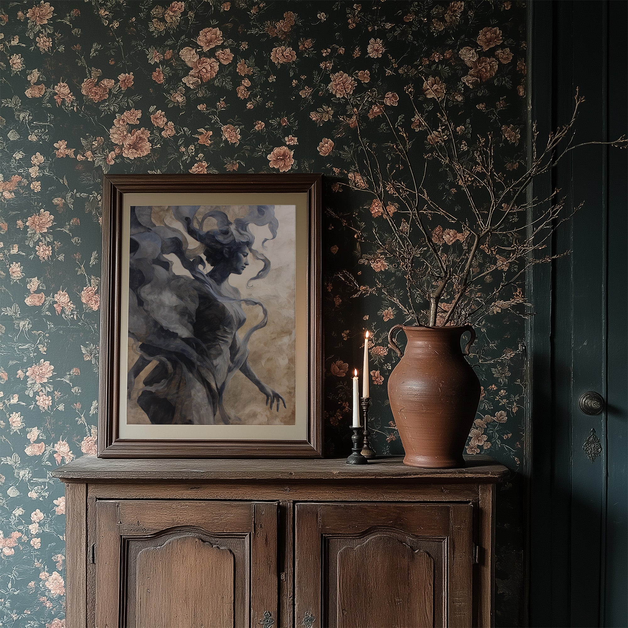 Ethereal wisps of indigo and charcoal curl around a figure caught in graceful motion. The haunting silhouette emerges from smoky tendrils, suspended between materiality and illusion on a backdrop of soft cream. Delicate brushstrokes create a dance of opacity and transparency, where the figure both dissolves and defines itself through flowing lines and shadowy contours. This striking piece adds sophisticated drama to a modern living space, creating a focal point that invites contemplation against dark walls.