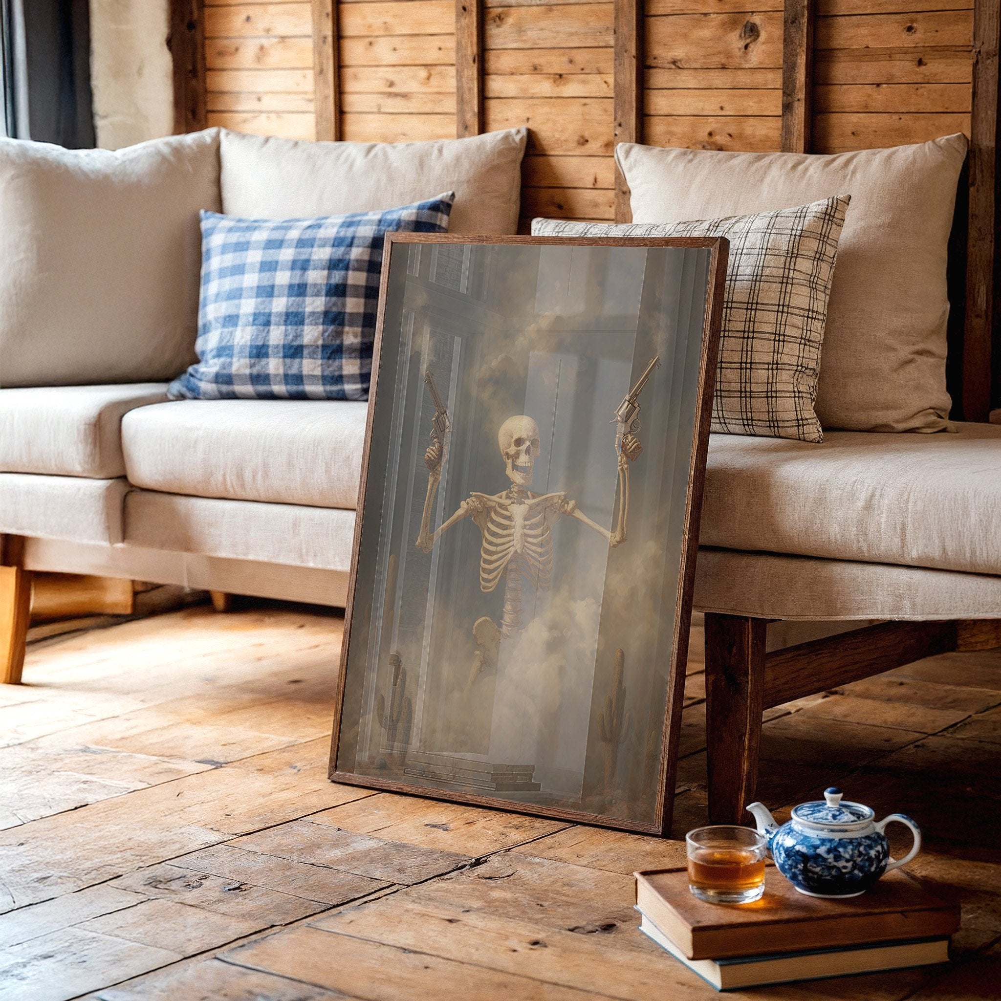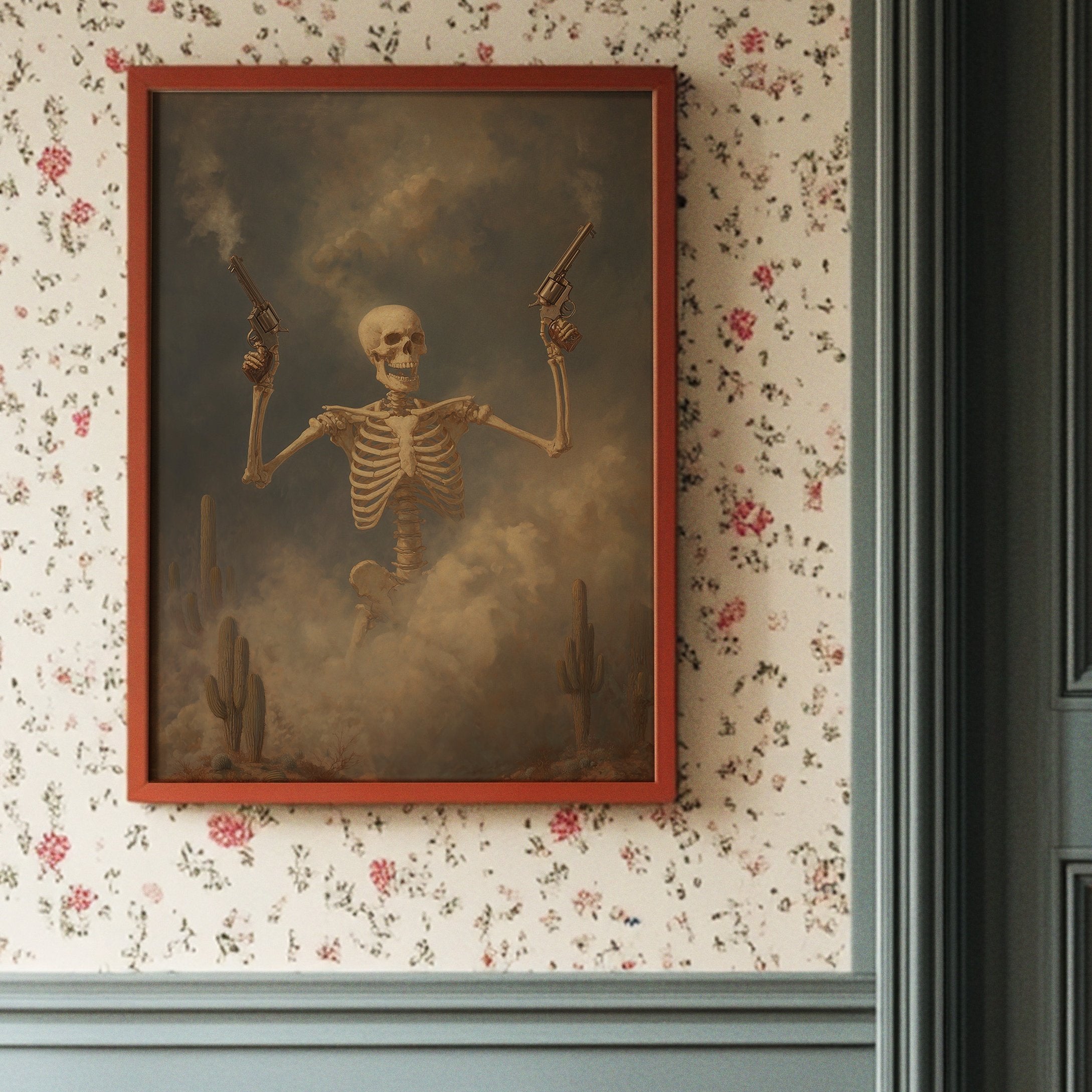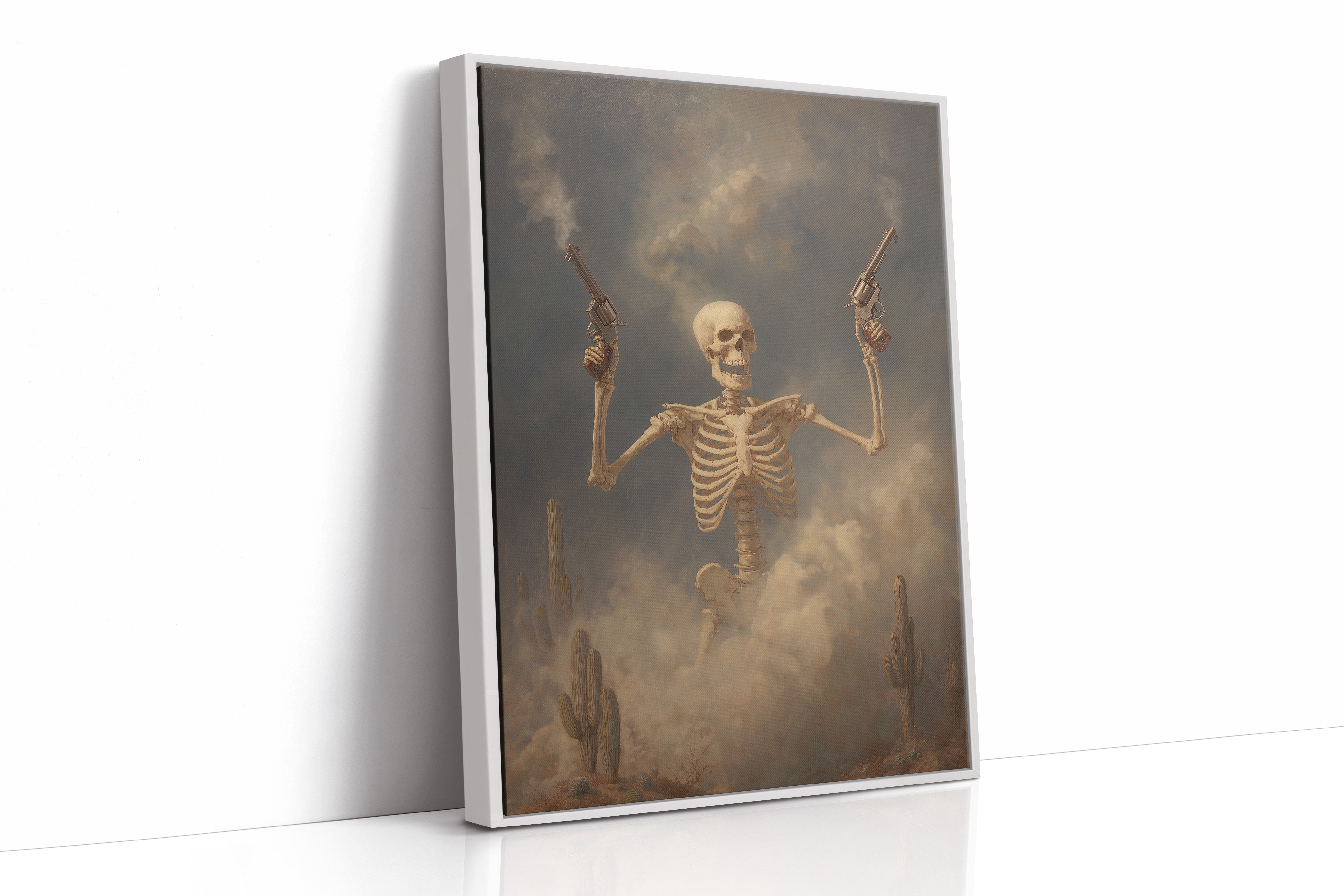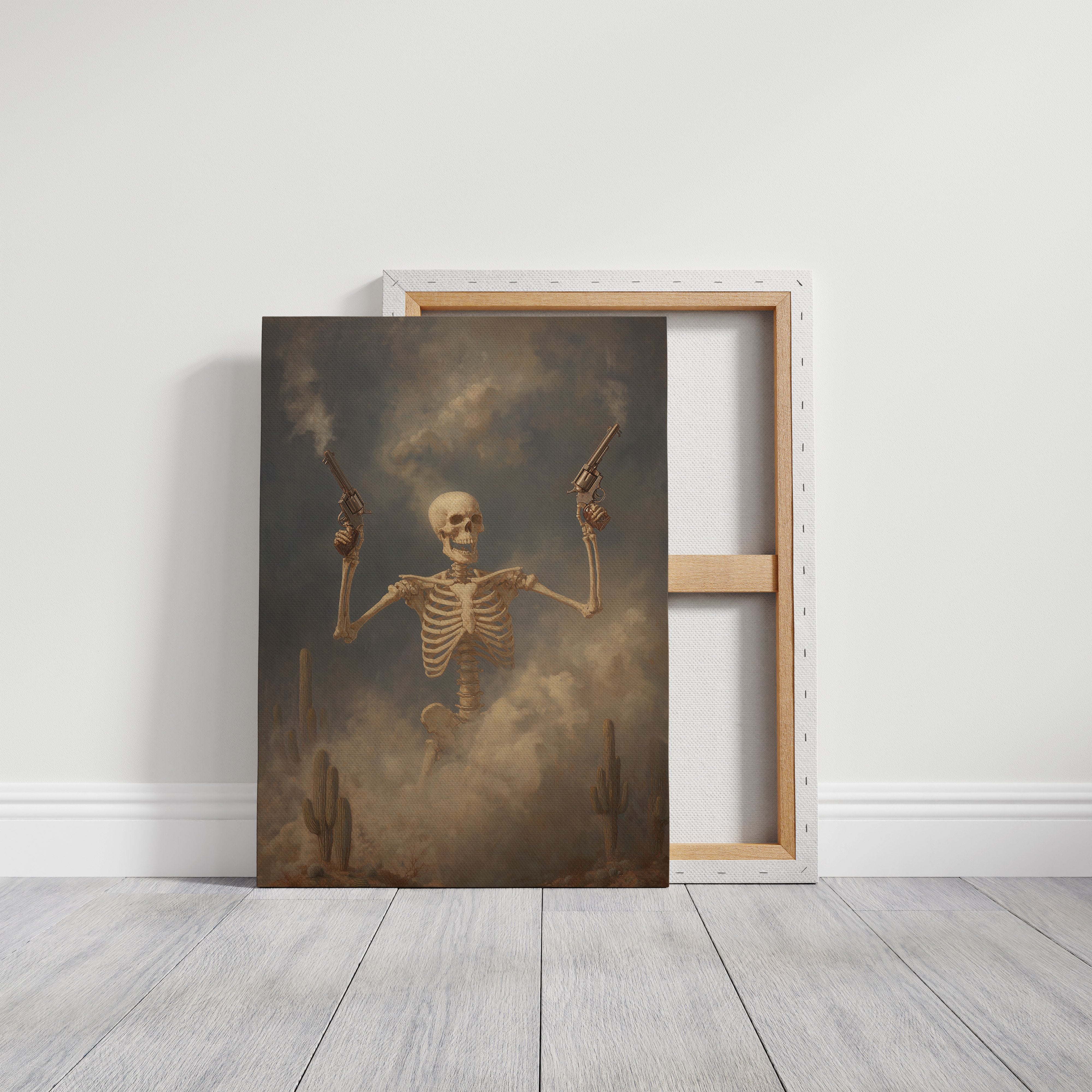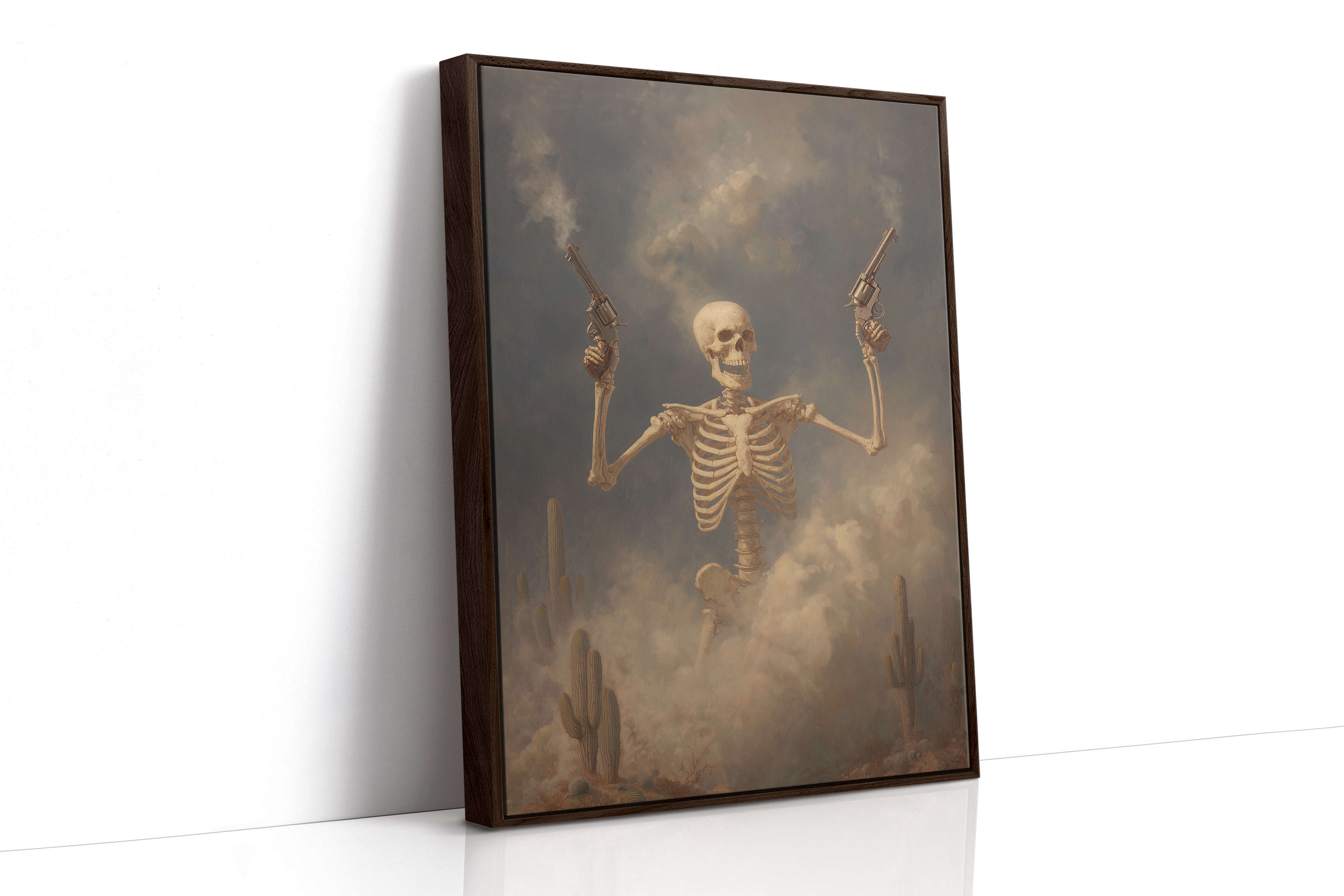 Dust hangs in the air like ancient memories as this skeletal gunslinger emerges from the fog of time. The sepia-toned scene captures death's defiance, pistols raised against a stormy desert sky while cacti stand as silent witnesses to this macabre standoff. The weathered bones tell stories of wild frontier justice, creating a hauntingly beautiful tension between mortality and the untamed spirit of the West.