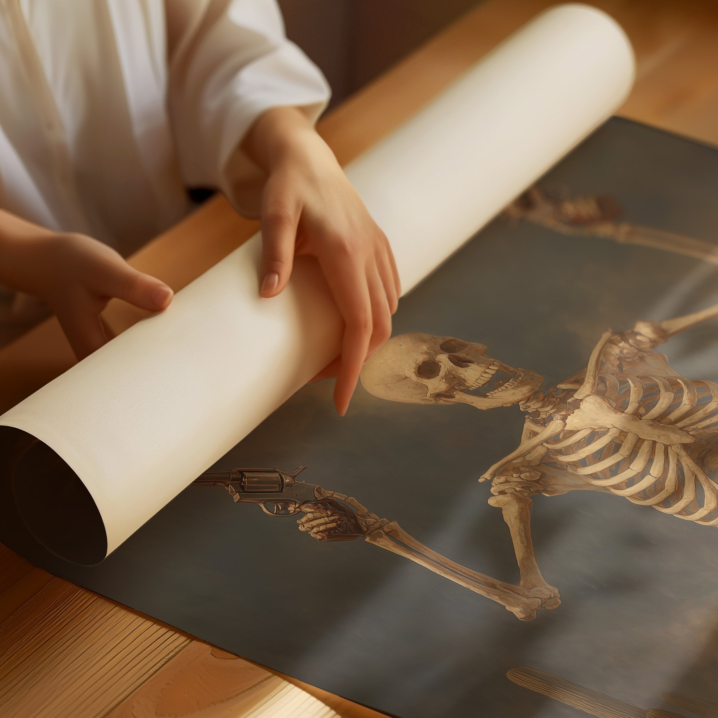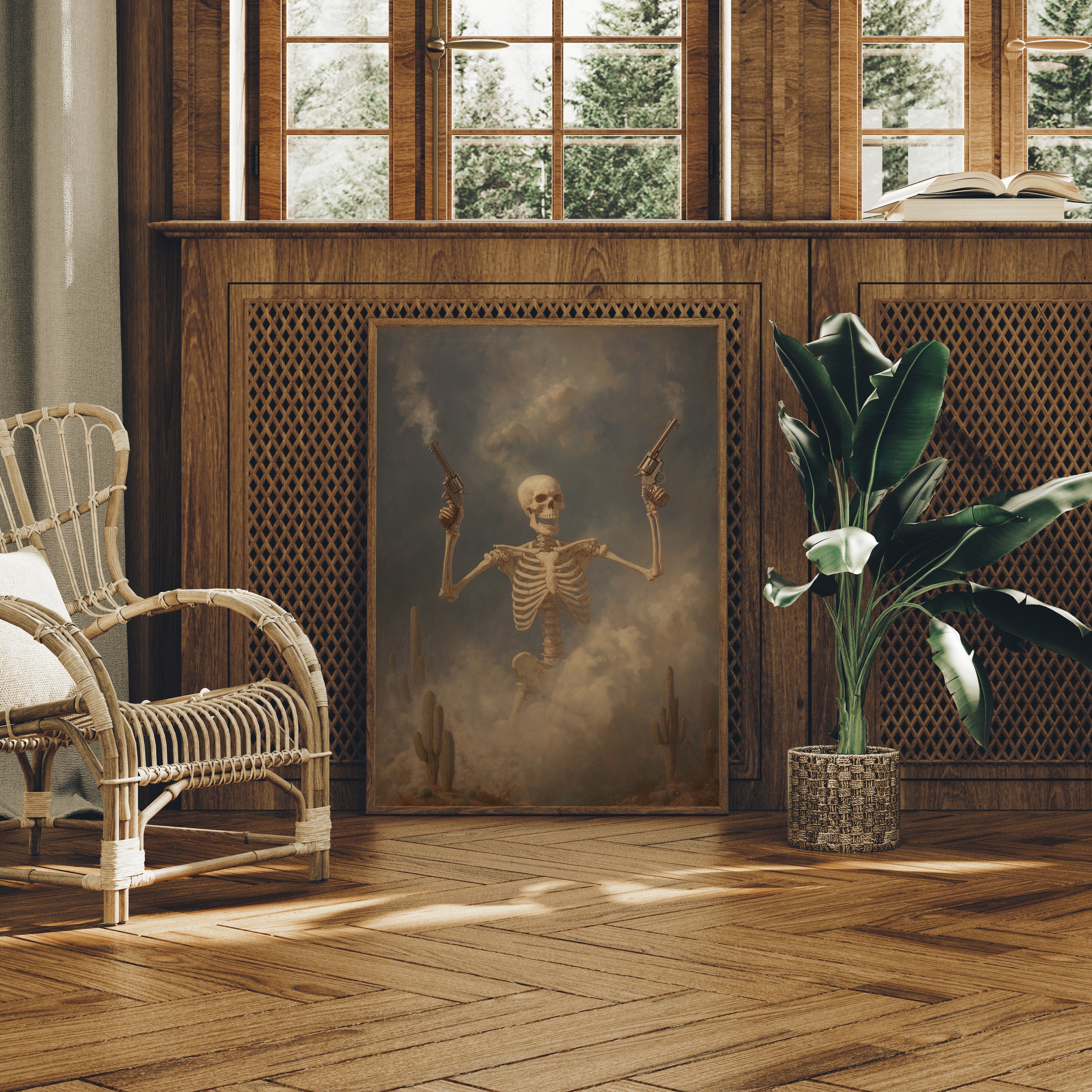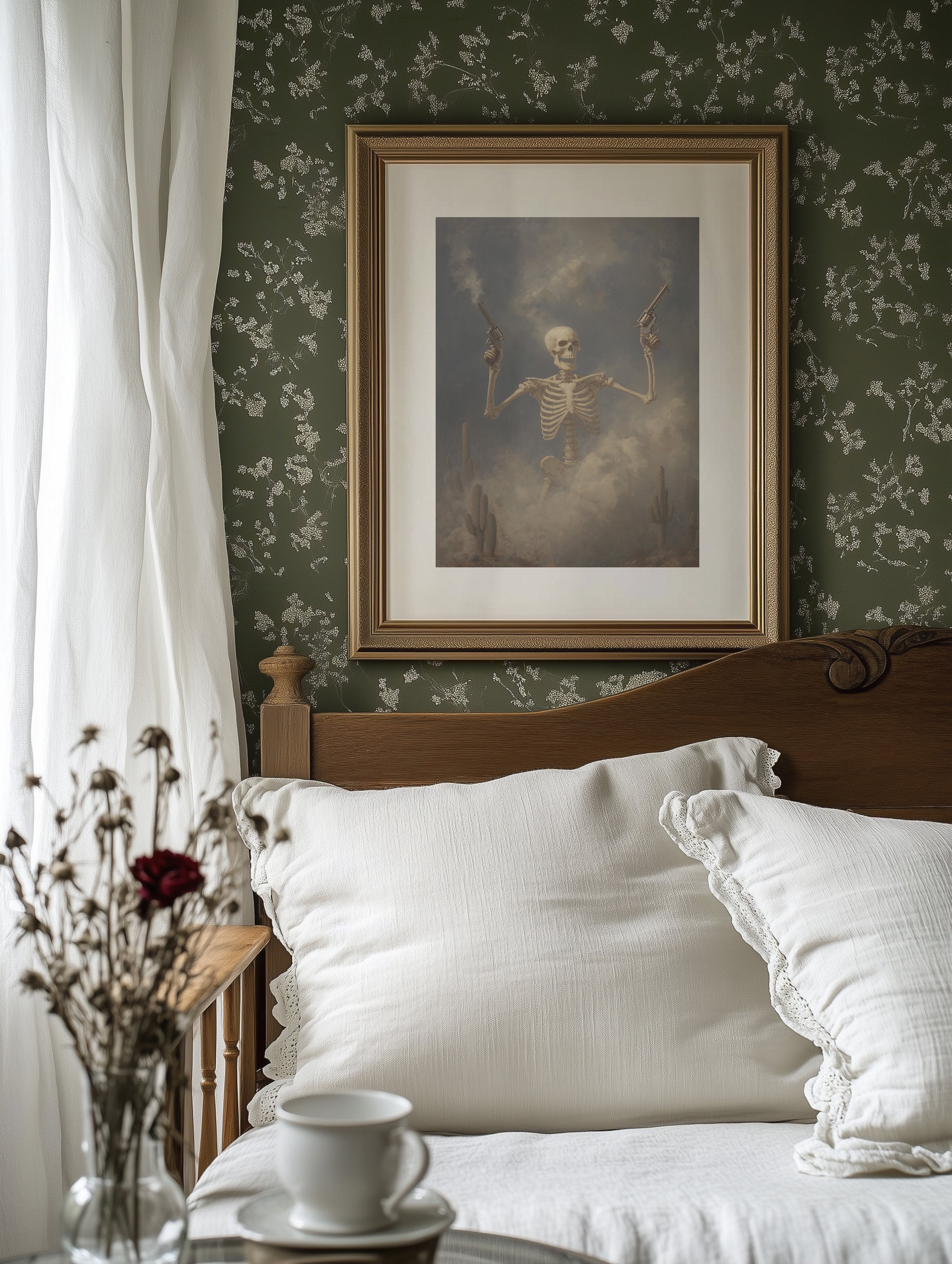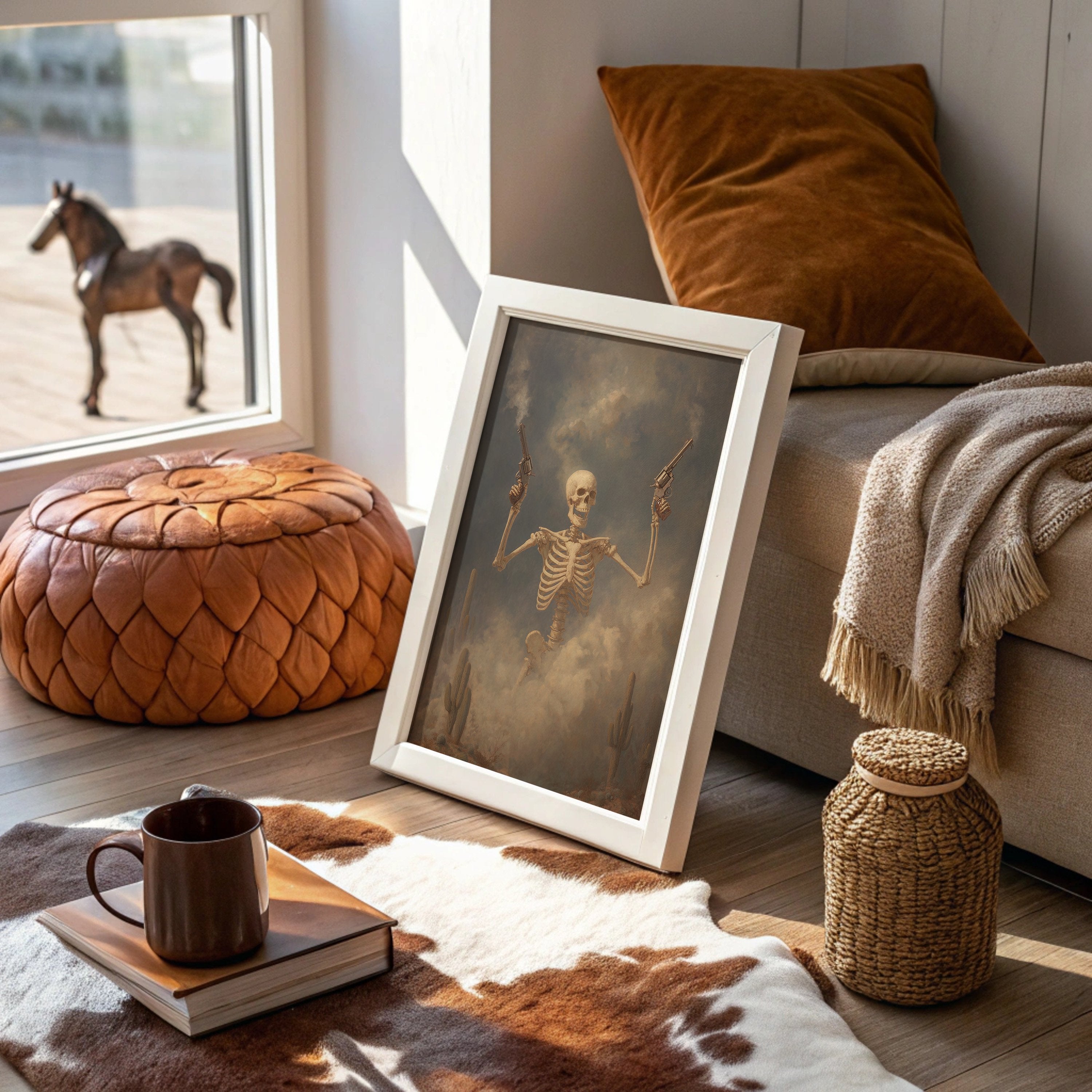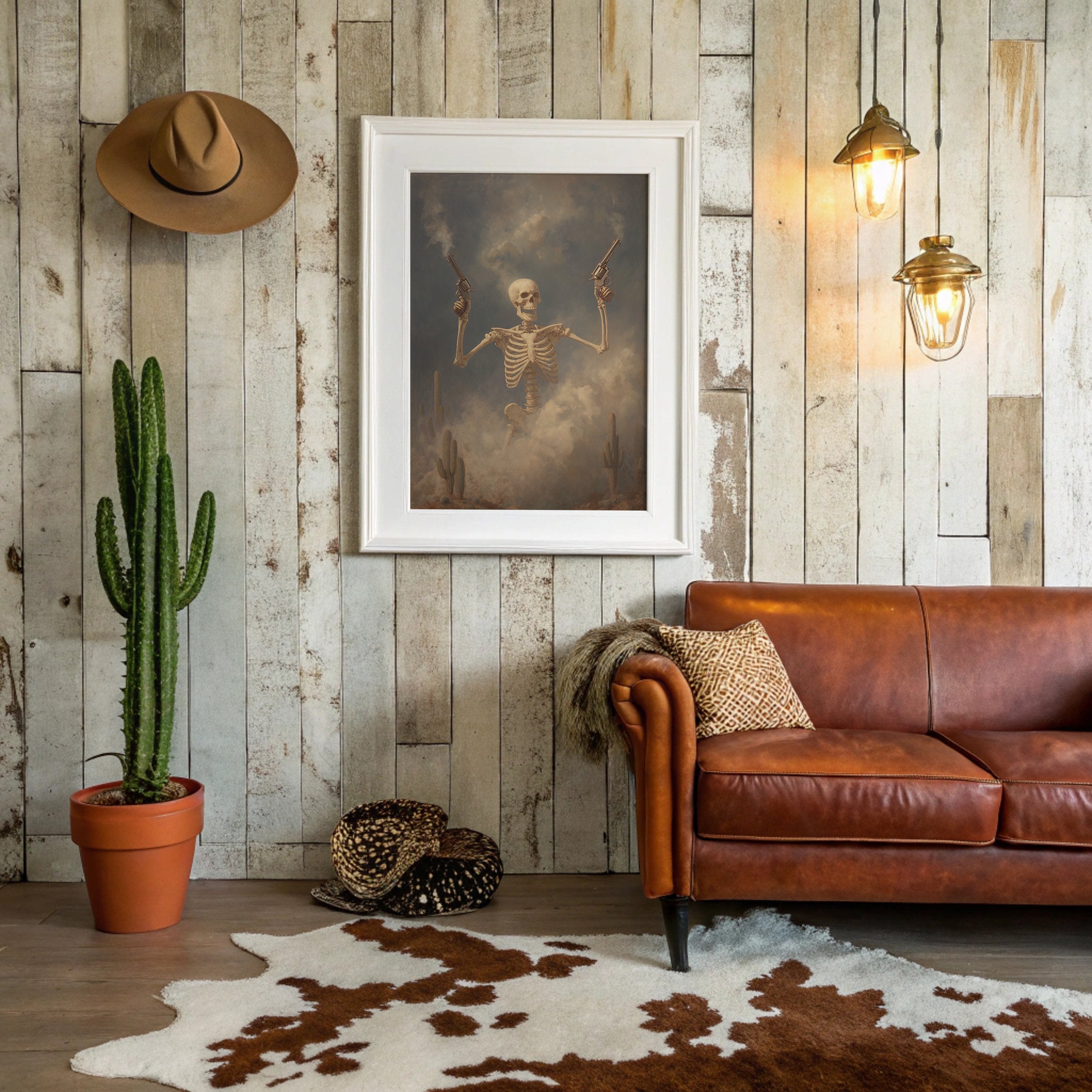 Dust hangs in the air like ancient memories as this skeletal gunslinger emerges from the fog of time. The sepia-toned scene captures death's defiance, pistols raised against a stormy desert sky while cacti stand as silent witnesses to this macabre standoff. The weathered bones tell stories of wild frontier justice, creating a hauntingly beautiful tension between mortality and the untamed spirit of the West.