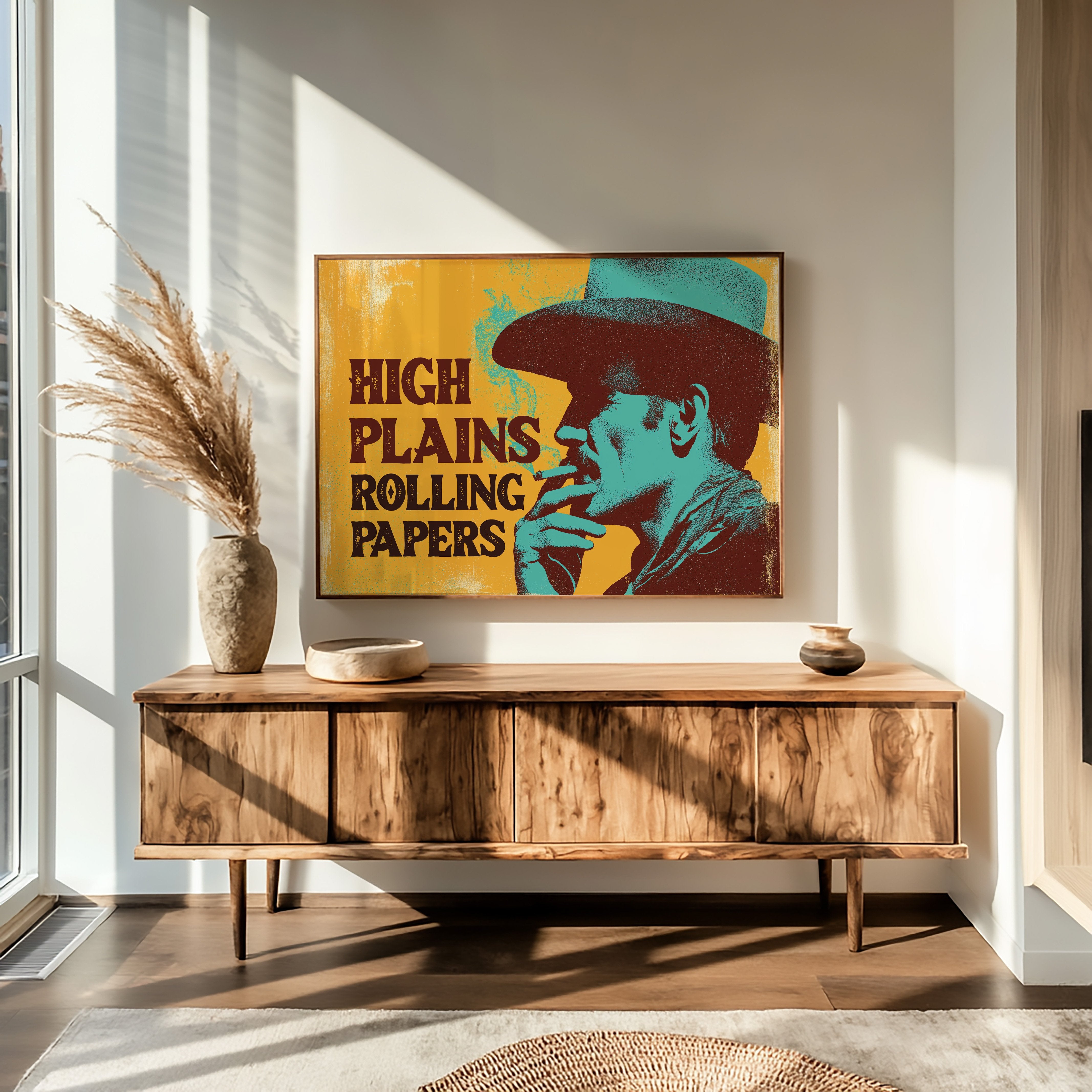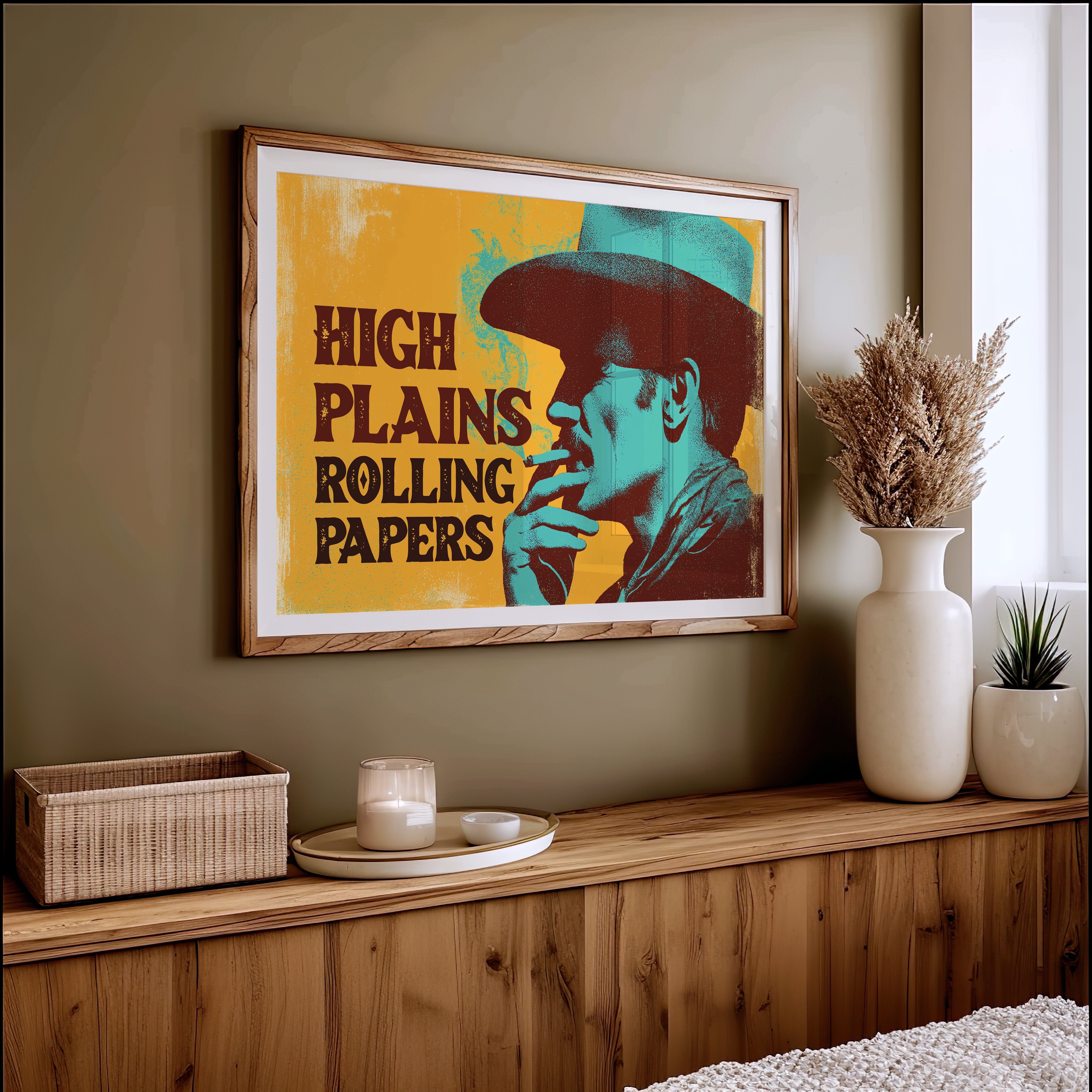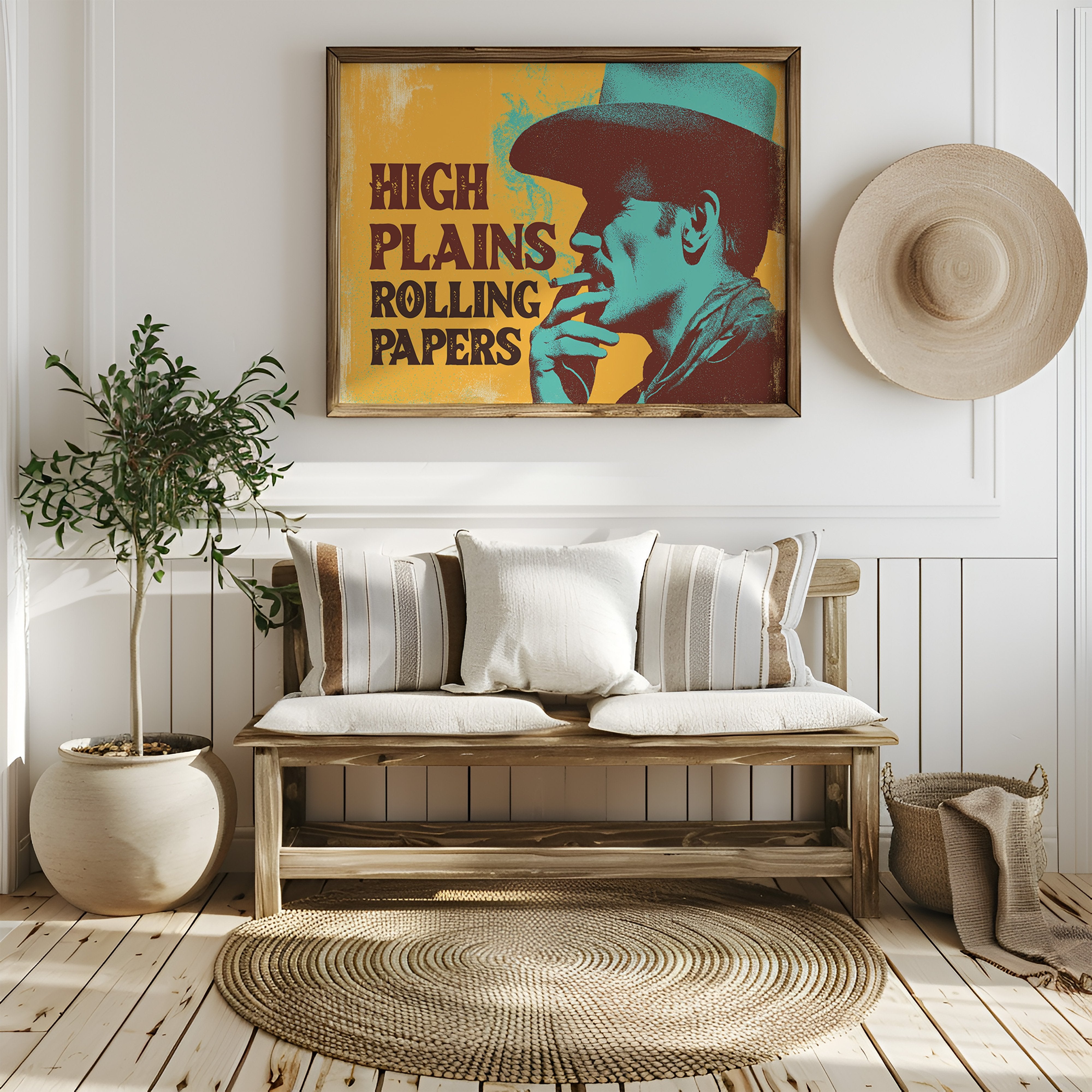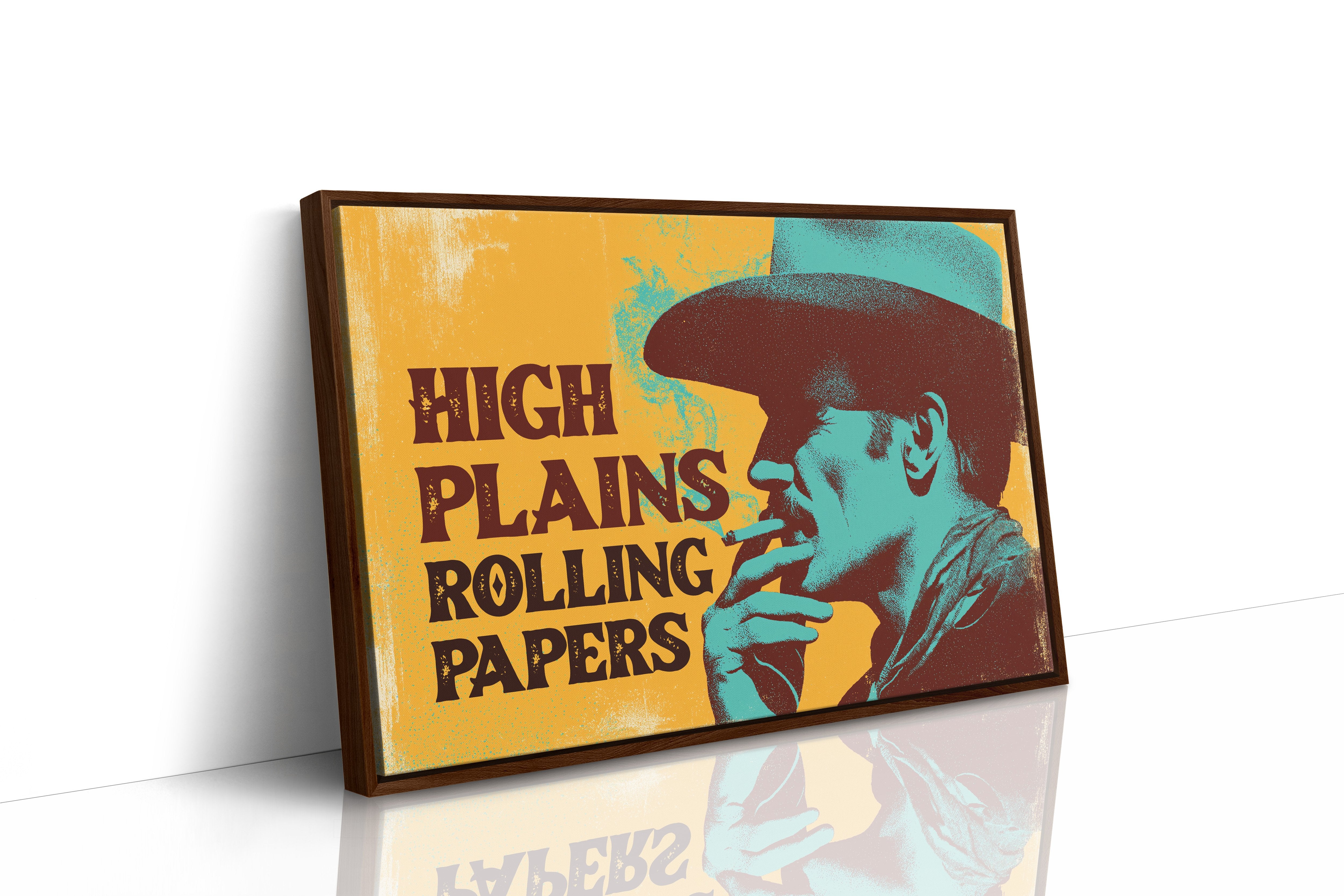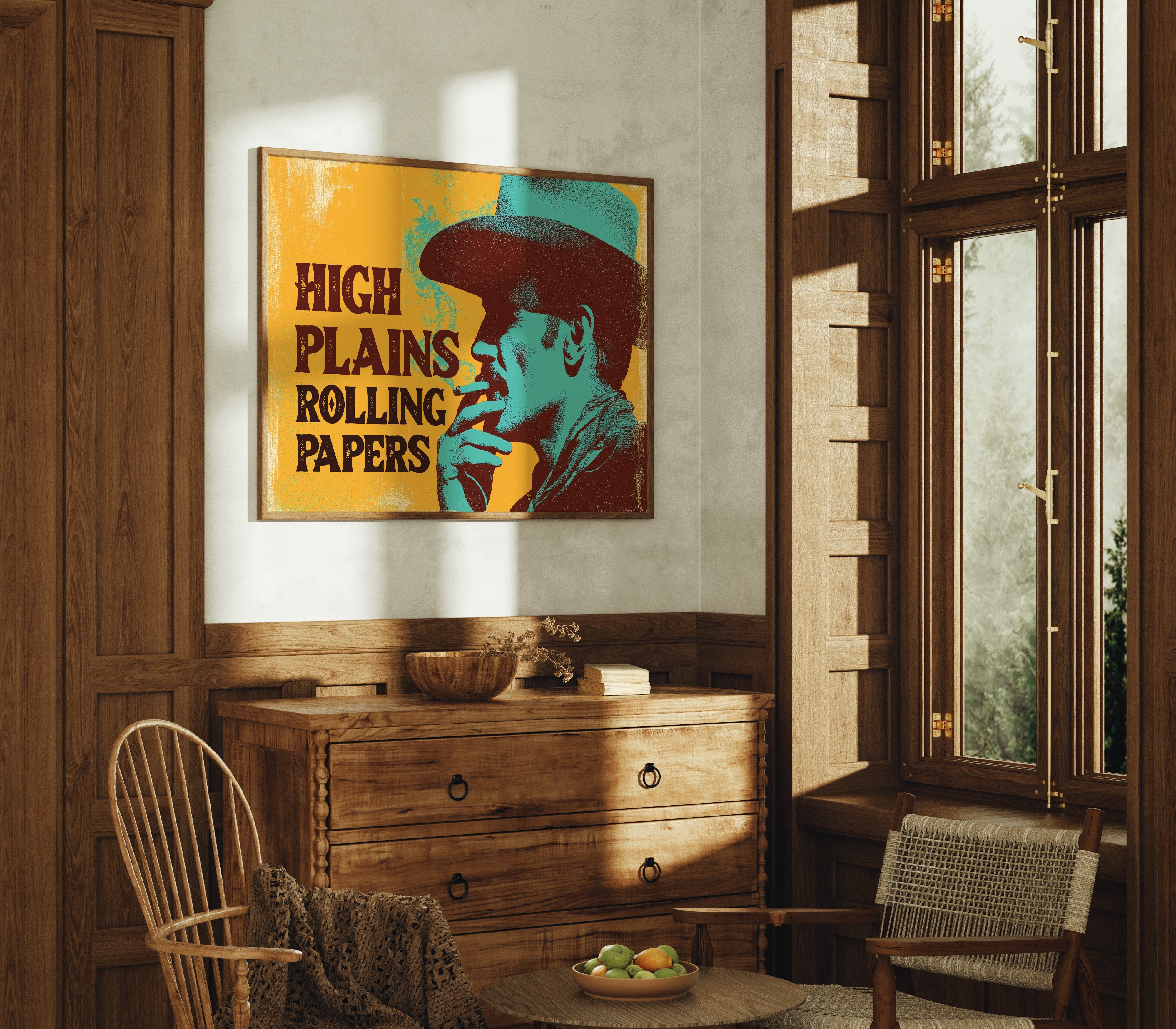 The amber glow of nostalgia meets bold turquoise in this striking portrait of frontier rebellion. A contemplative figure exhales beneath the brim of a wide cowboy hat, captured in a moment of quiet defiance against the vivid backdrop of typographic western heritage. The contrasting colors create a contemporary take on classic Americana, where tradition meets artistic rebellion.