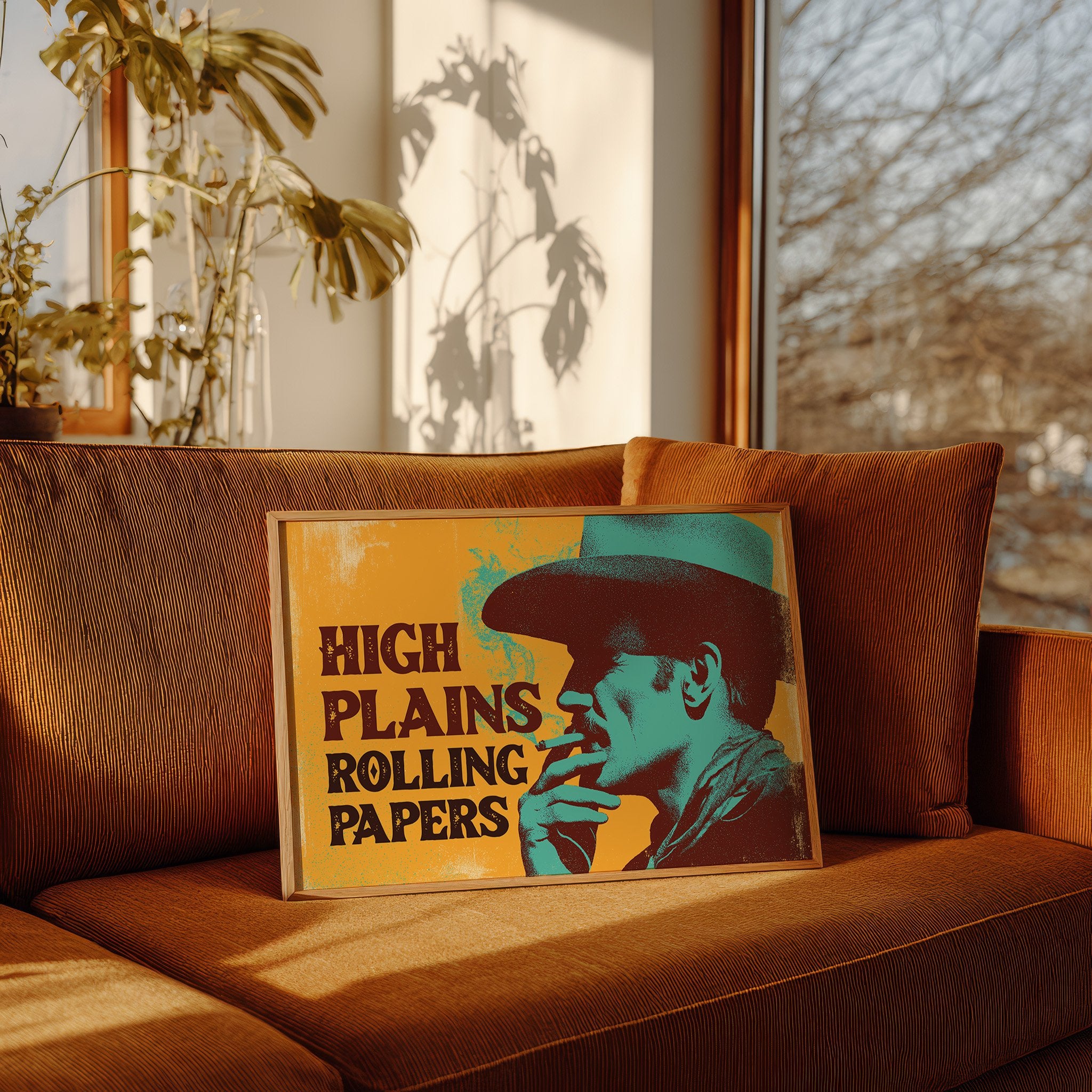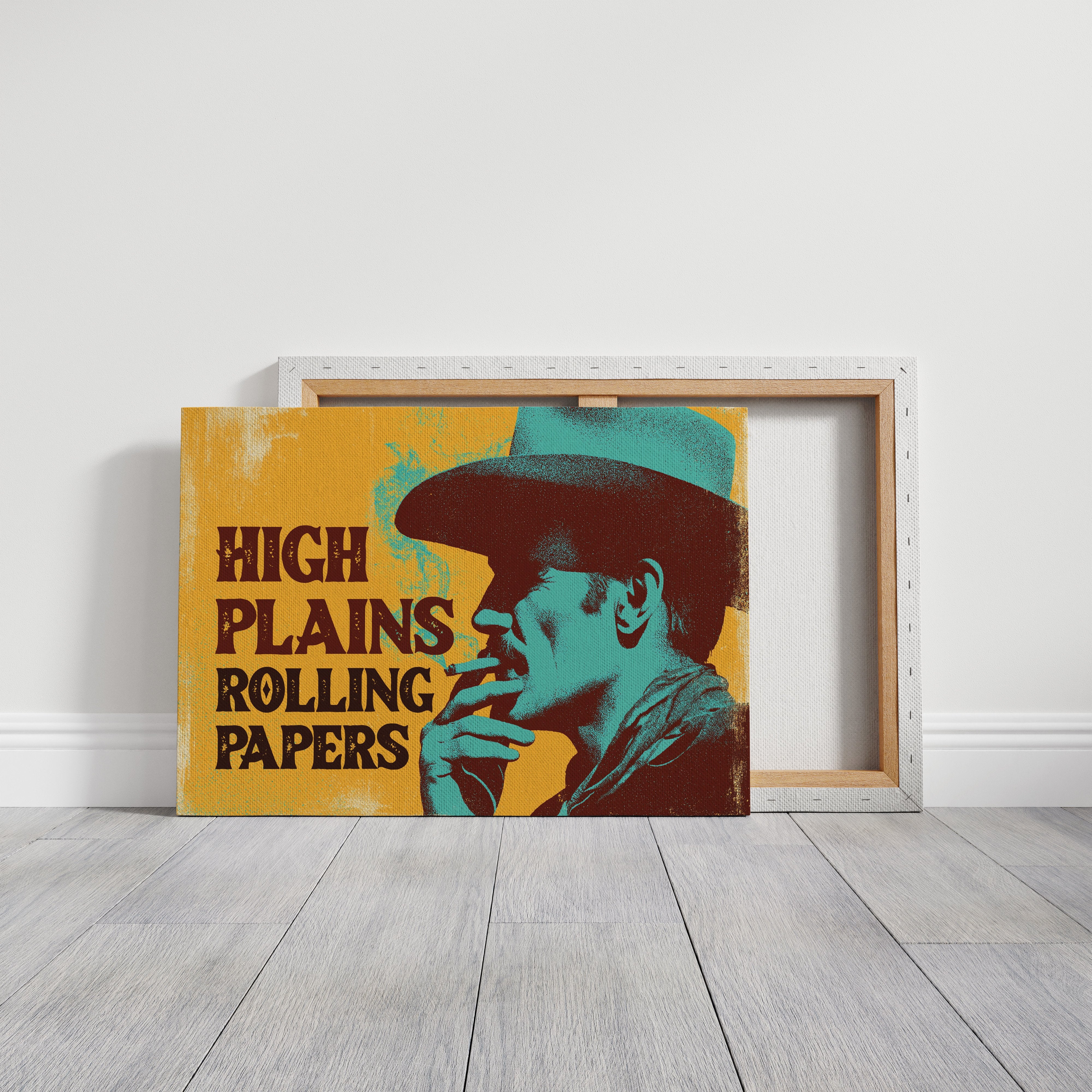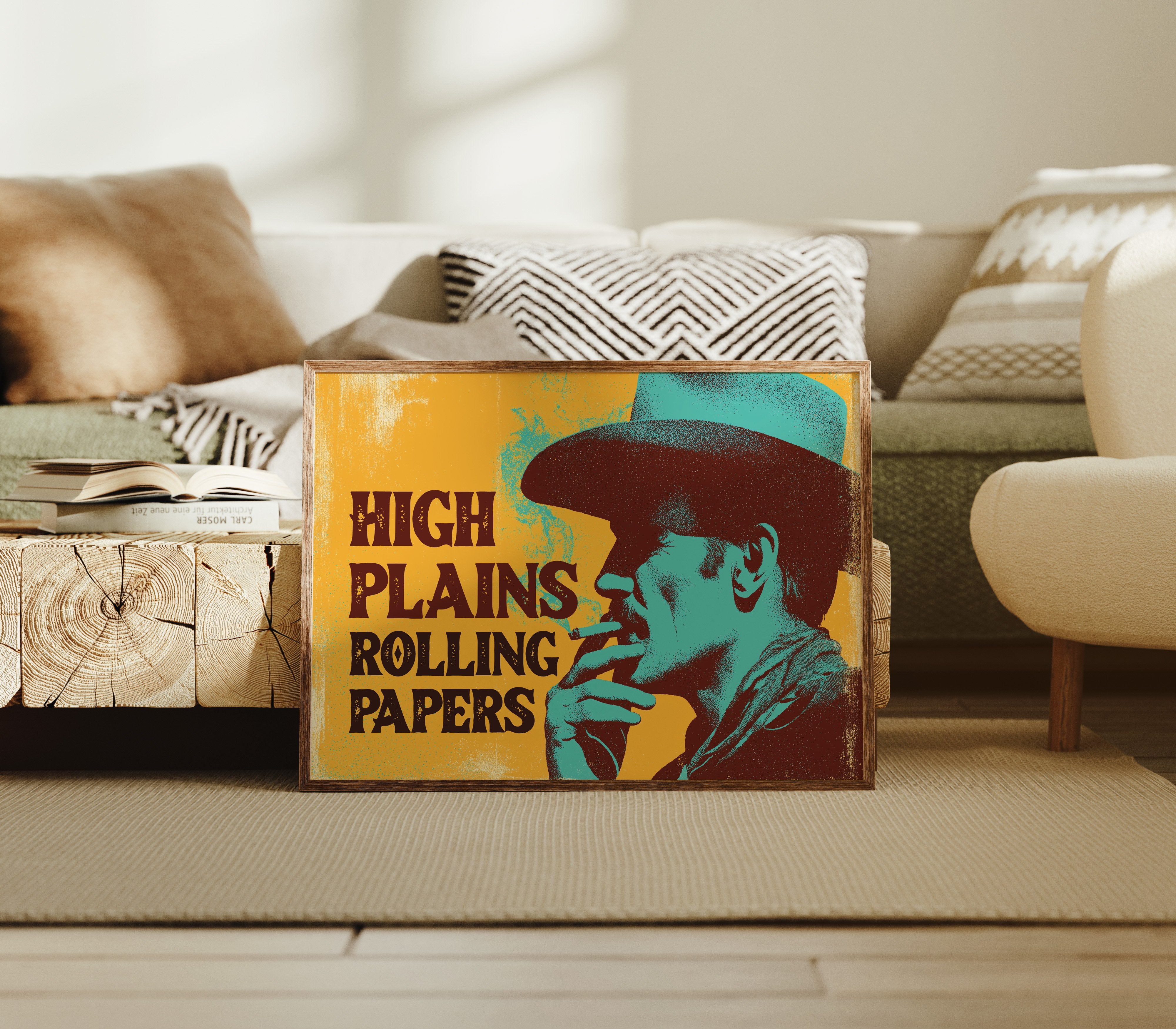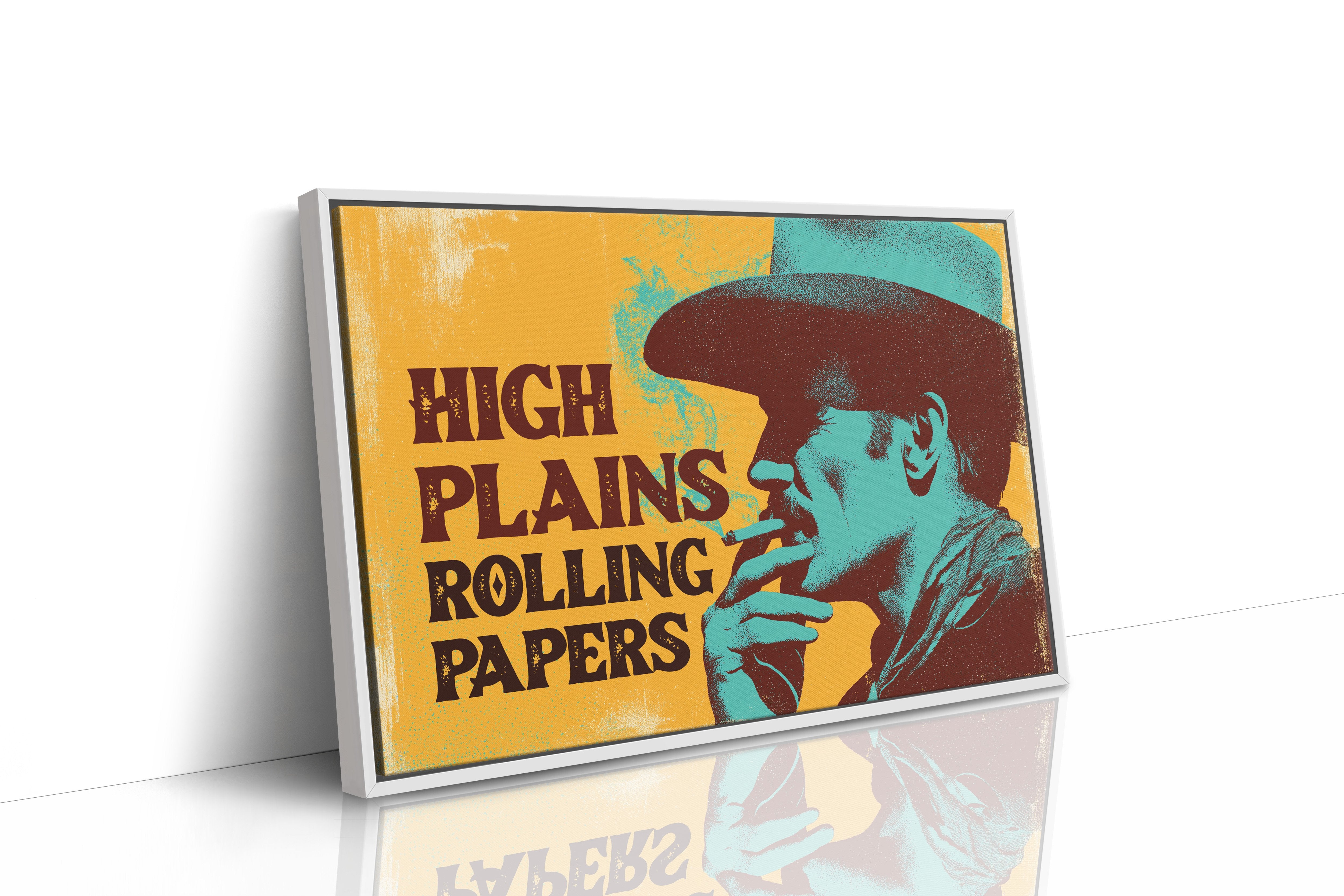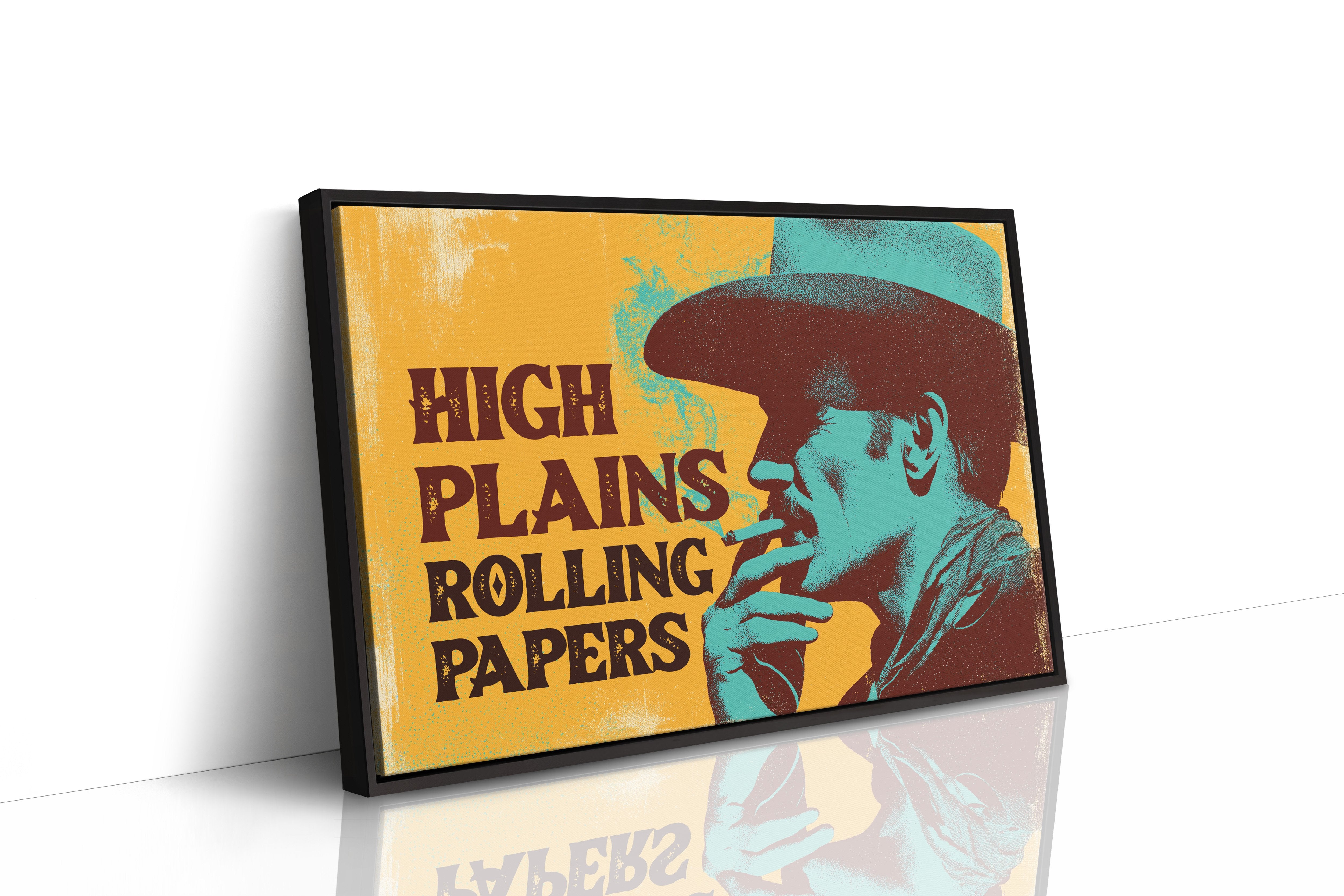 The amber glow of nostalgia meets bold turquoise in this striking portrait of frontier rebellion. A contemplative figure exhales beneath the brim of a wide cowboy hat, captured in a moment of quiet defiance against the vivid backdrop of typographic western heritage. The contrasting colors create a contemporary take on classic Americana, where tradition meets artistic rebellion.
