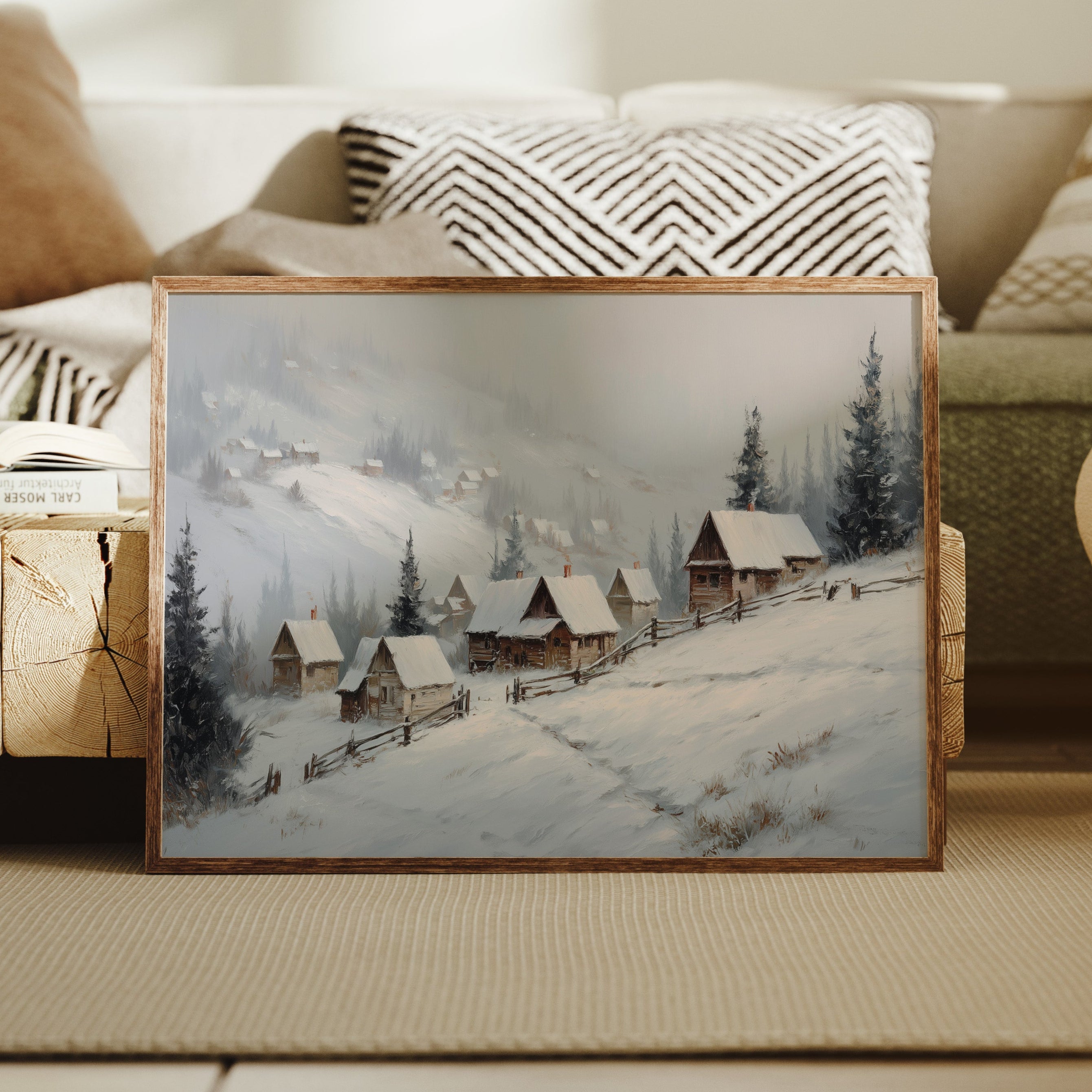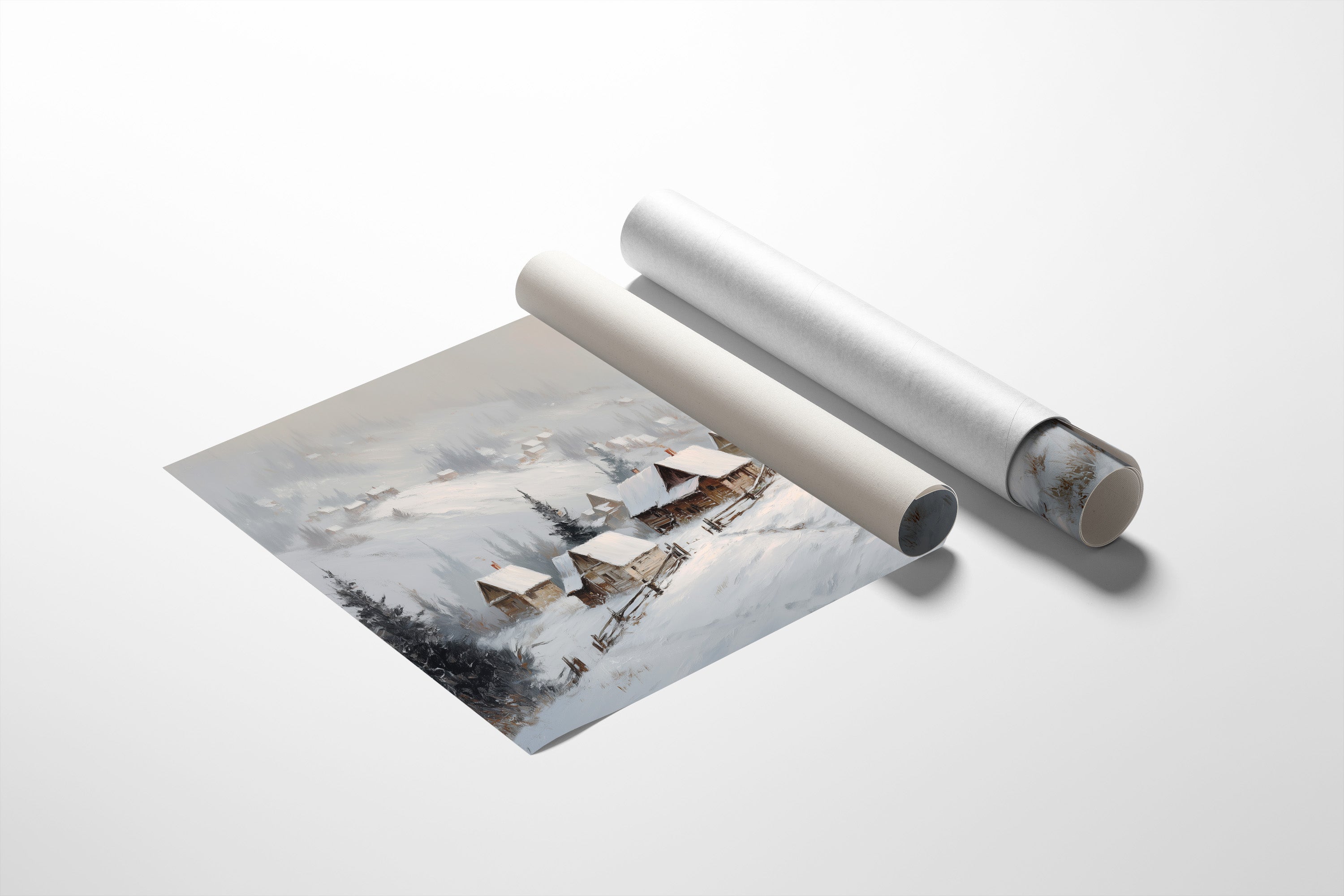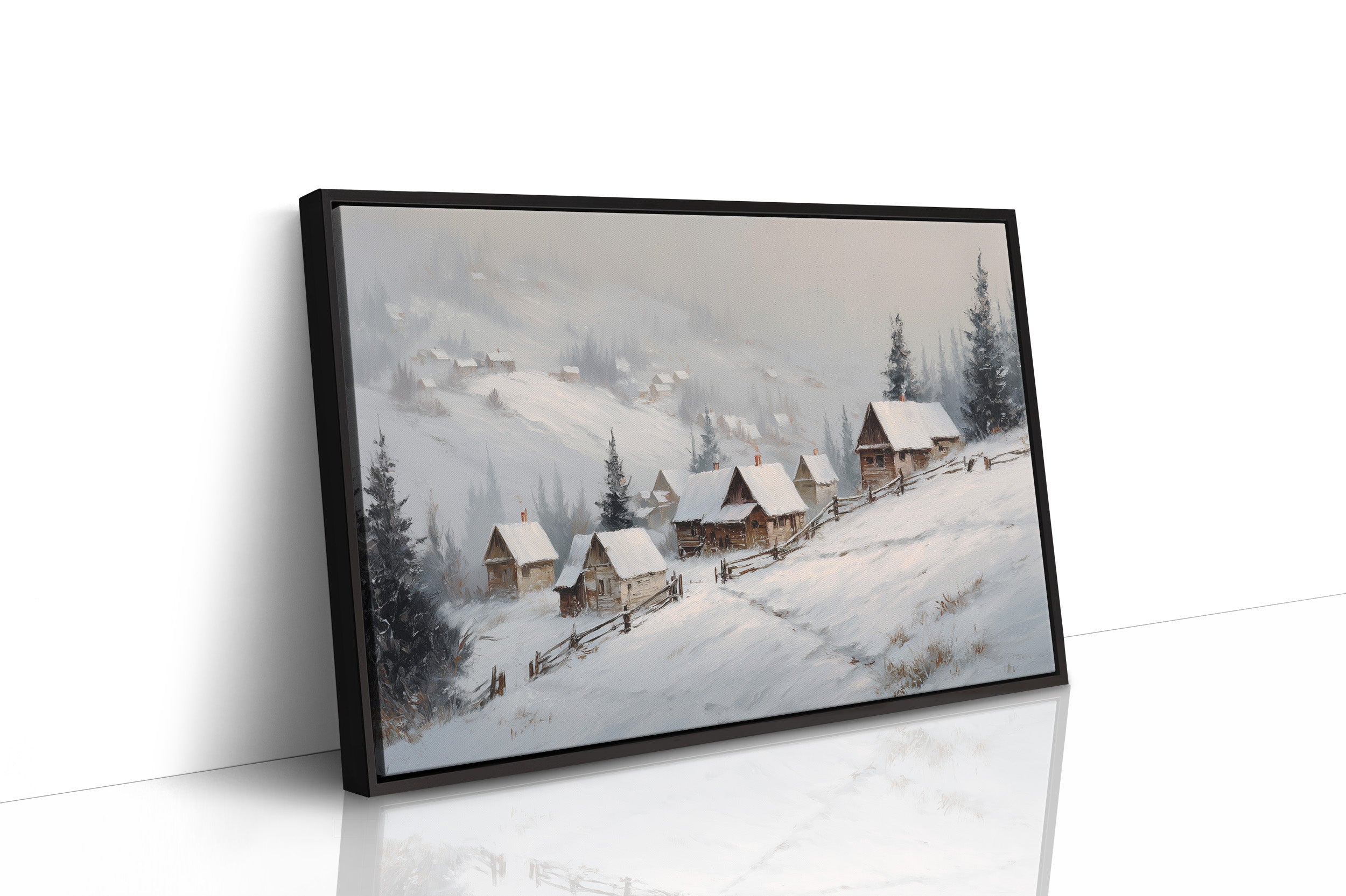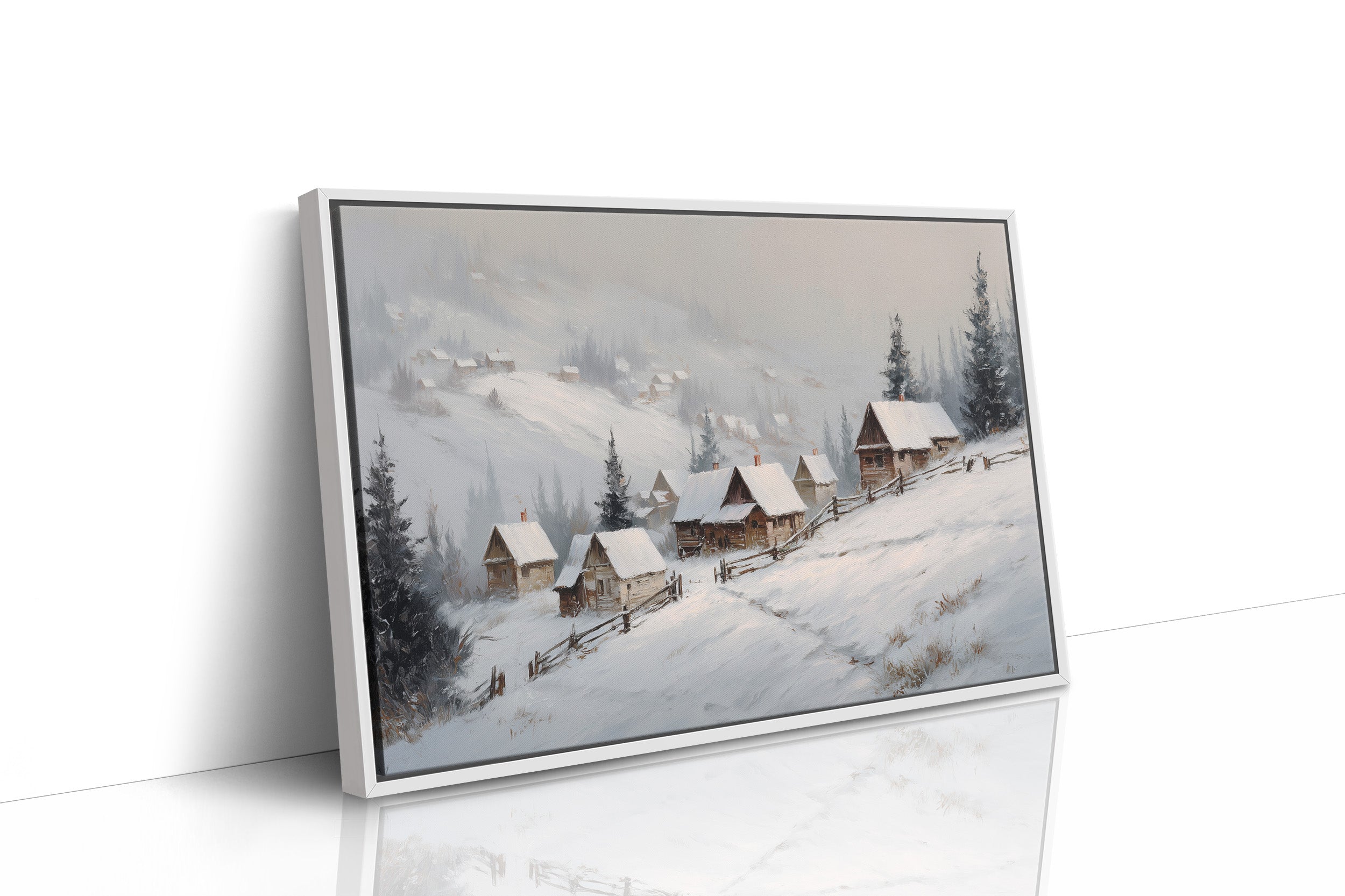Gentle snowflakes dust a winding path through sleepy mountain cabins, each one a refuge from winter's quiet storm. Muted grays and whites create a peaceful dialogue with evergreen sentinels standing guard along the hillside, while smoke wisps from chimneys tell stories of warmth within. The composition captures that perfect moment when nature holds its breath, snow settling softly on weathered wooden roofs and split-rail fences. This serene winter scene would bring a touch of seasonal magic to a reading nook or create a peaceful focal point above a fireplace mantel.