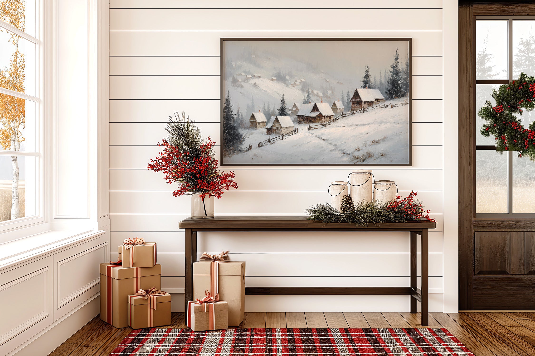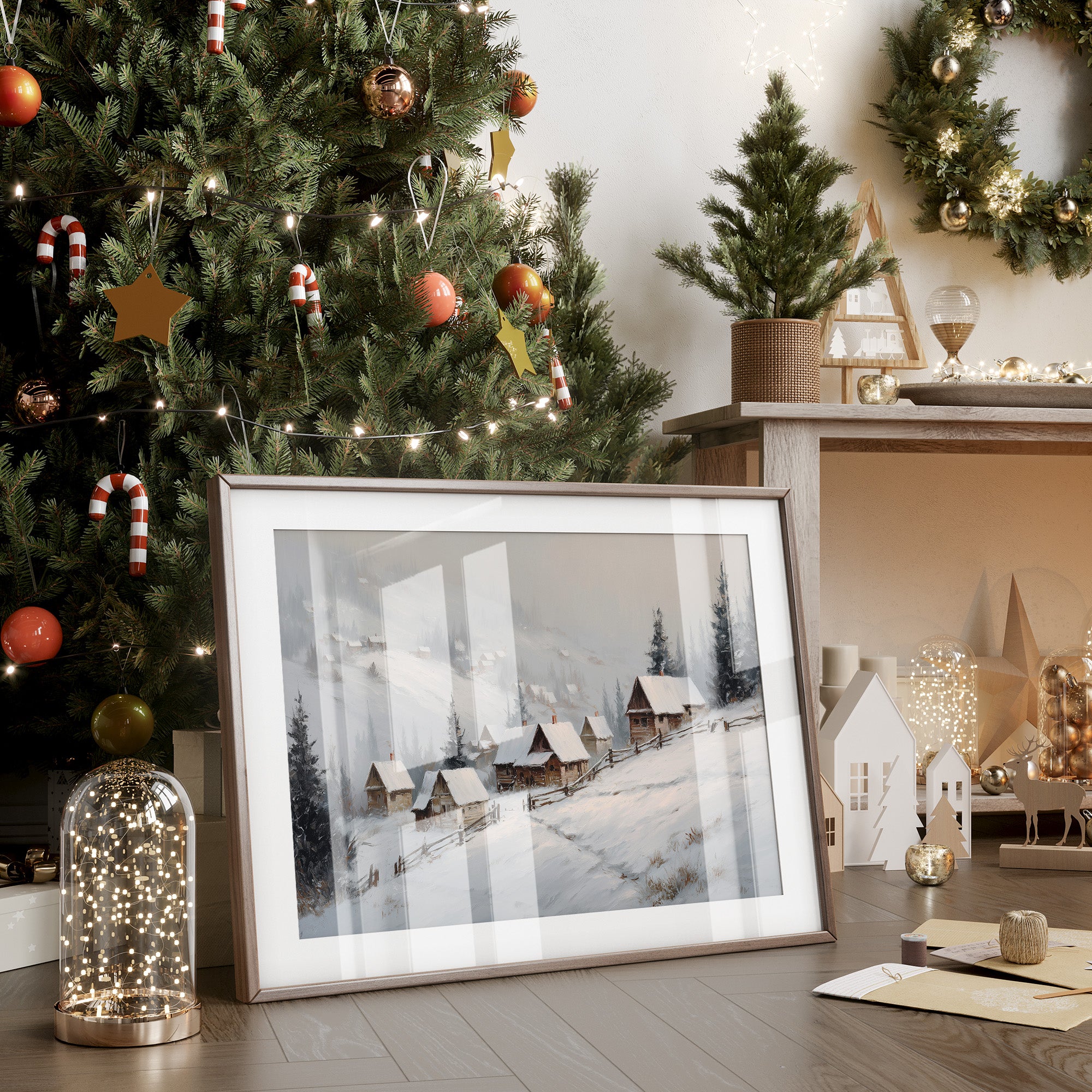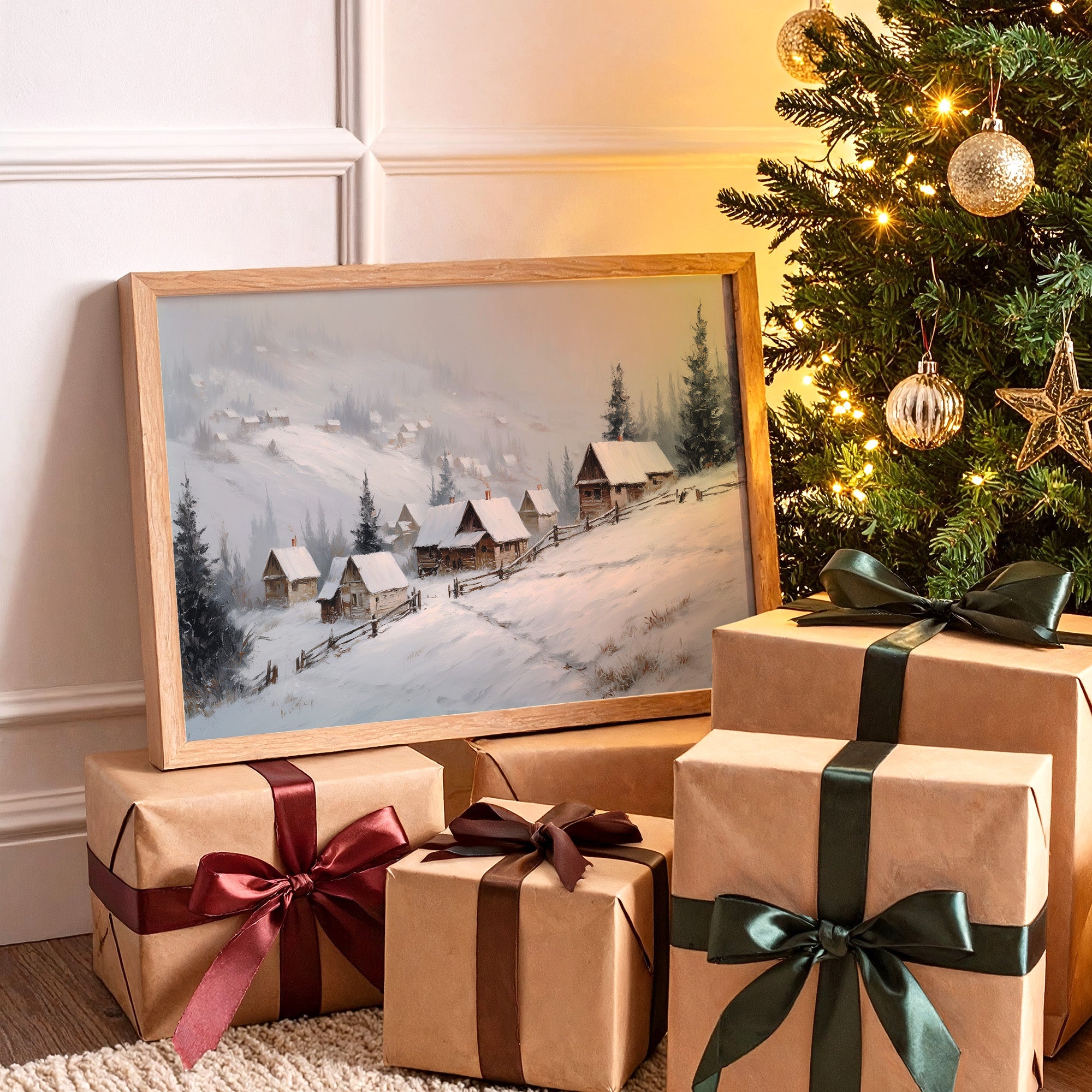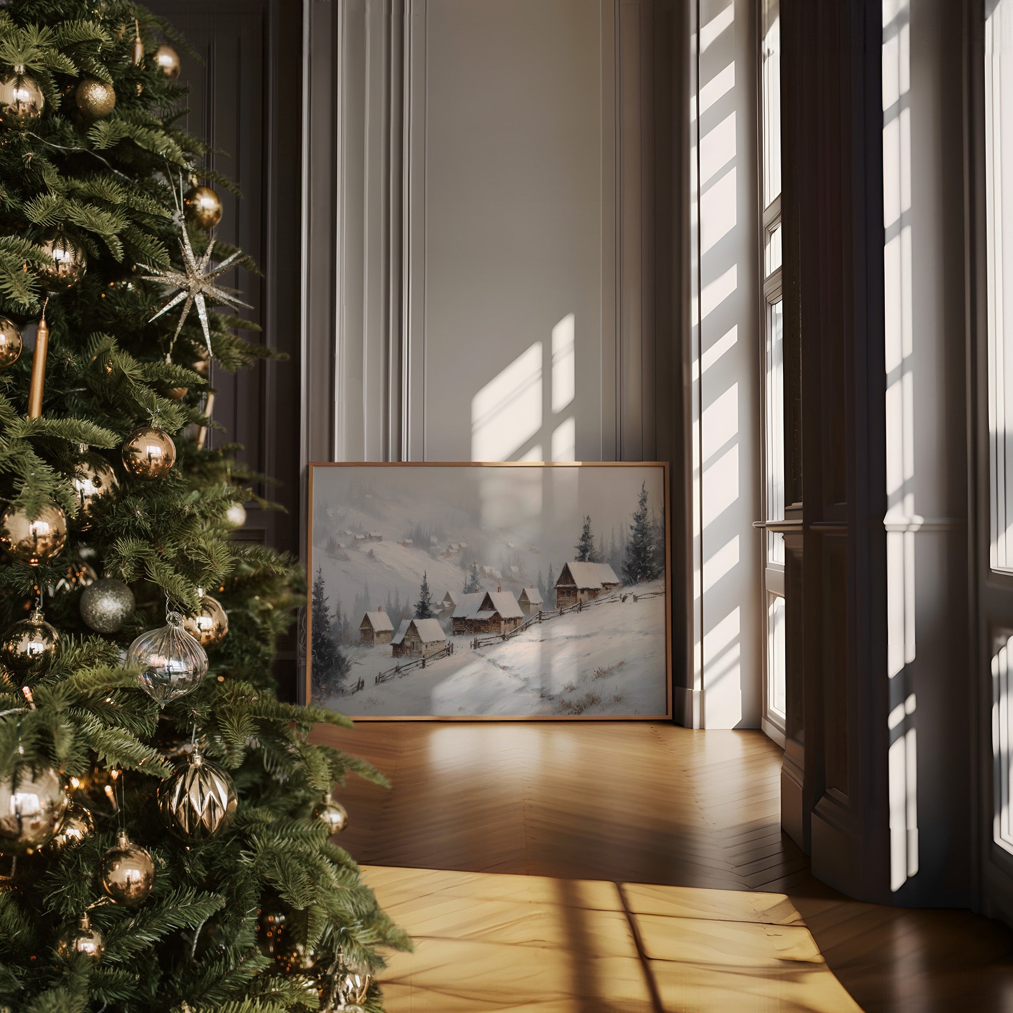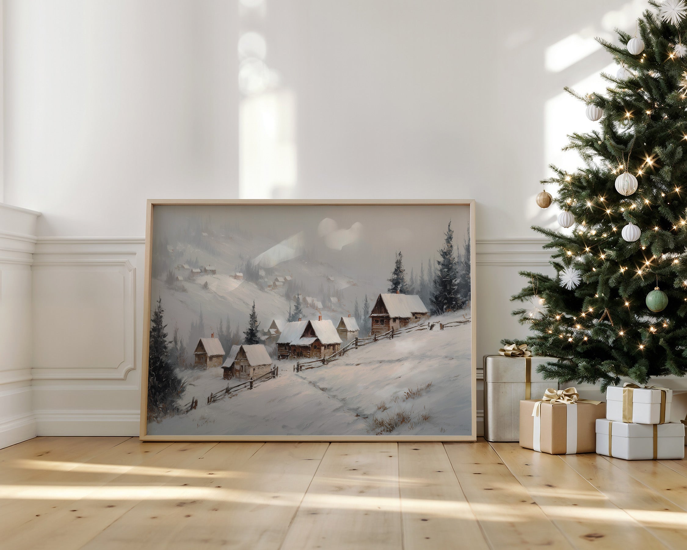 Gentle snowflakes dust a winding path through sleepy mountain cabins, each one a refuge from winter's quiet storm. Muted grays and whites create a peaceful dialogue with evergreen sentinels standing guard along the hillside, while smoke wisps from chimneys tell stories of warmth within. The composition captures that perfect moment when nature holds its breath, snow settling softly on weathered wooden roofs and split-rail fences. This serene winter scene would bring a touch of seasonal magic to a reading nook or create a peaceful focal point above a fireplace mantel.